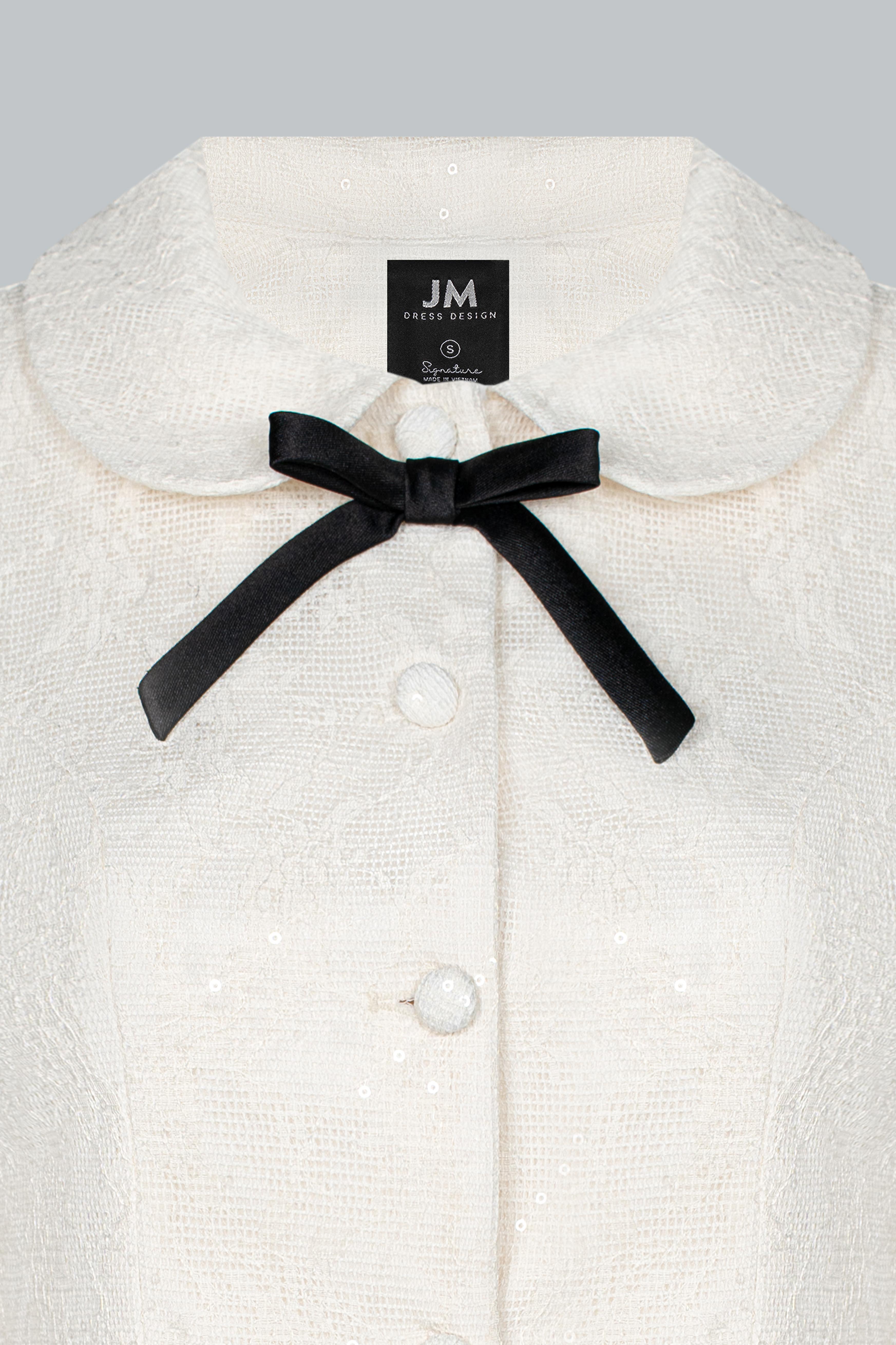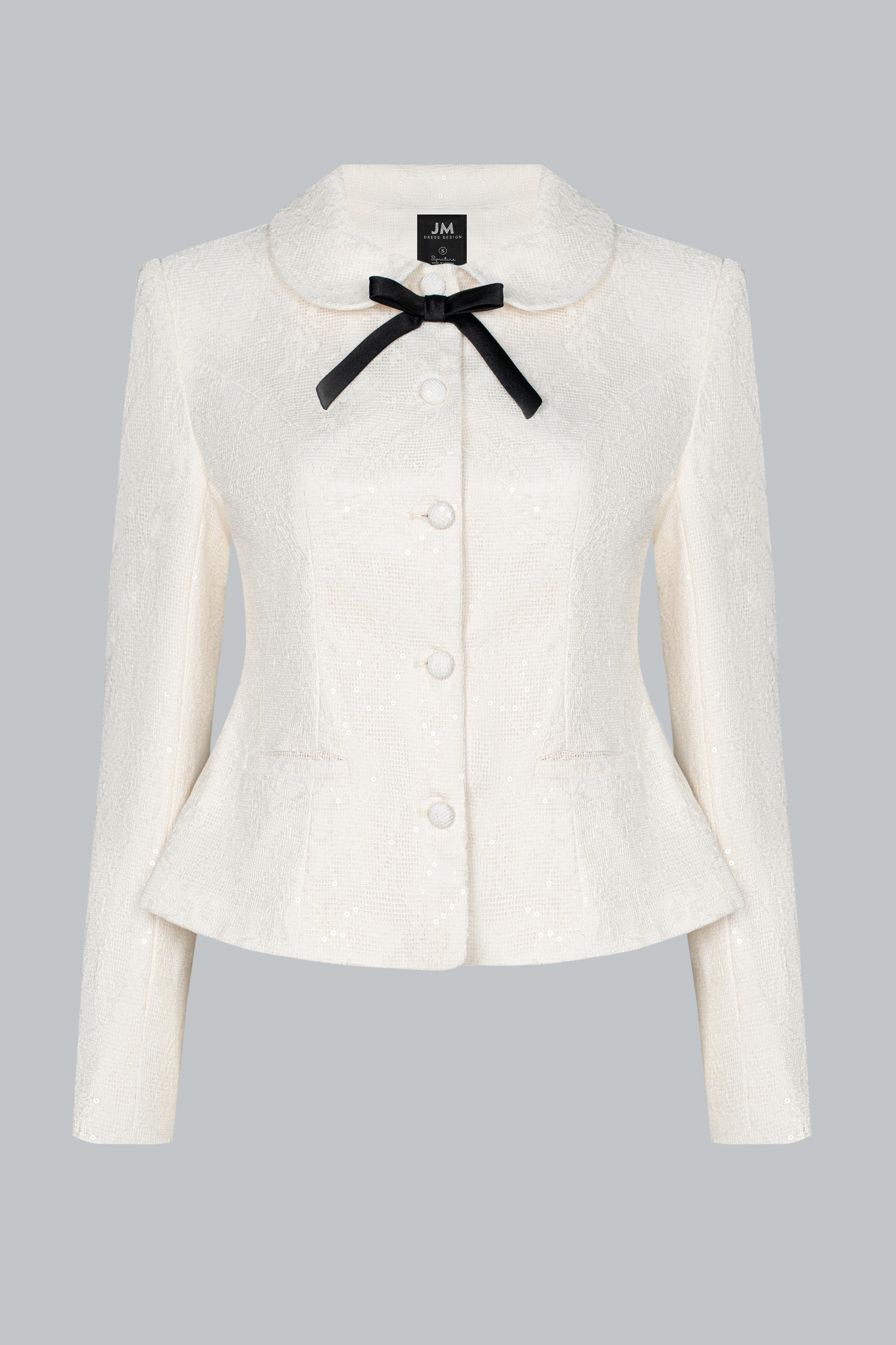 Áo blazer dáng ngắn, ôm nhẹ ở eo để tôn dáng nhưng vẫn giữ sự thanh lịch. Cổ Peter Pan mềm mại, mang không khí cổ điển. Hàng khuy tròn đồng màu tạo sự tinh tế, tối giản. Nổi bật nhất là chi tiết nơ đen nhỏ ở cổ – điểm nhấn nữ tính, gợi phong thái quý cô Parisian tiểu thư.