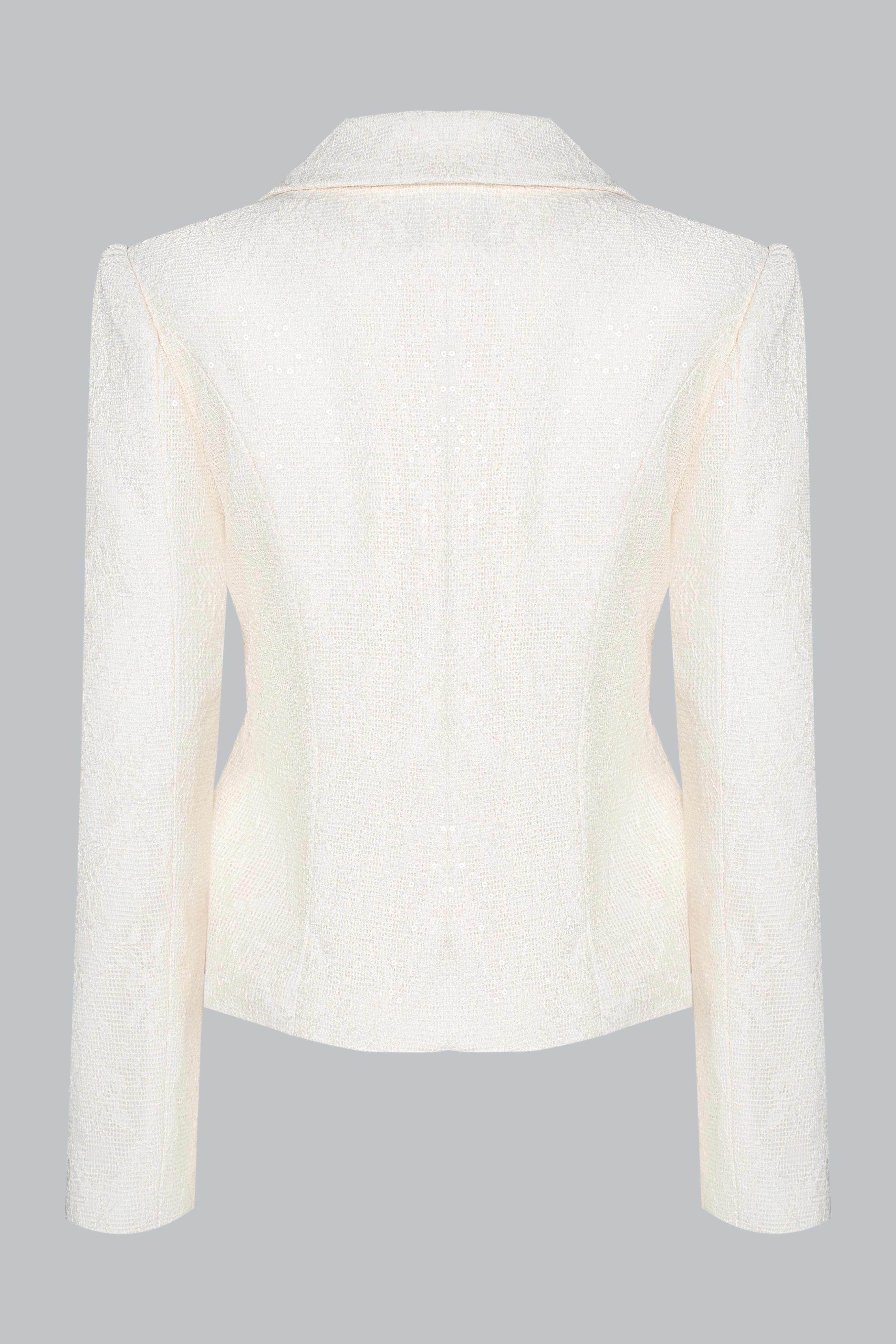 Sản phẩm sử dụng vải ren ánh nhẹ, bề mặt có độ óng tinh tế, dày dặn vừa phải, phù hợp mùa thu đông. Chất liệu thường dùng cho high-fashion cổ điển, giúp áo blazer vừa giữ được form, vừa toát lên sự sang trọng lãng mạn.