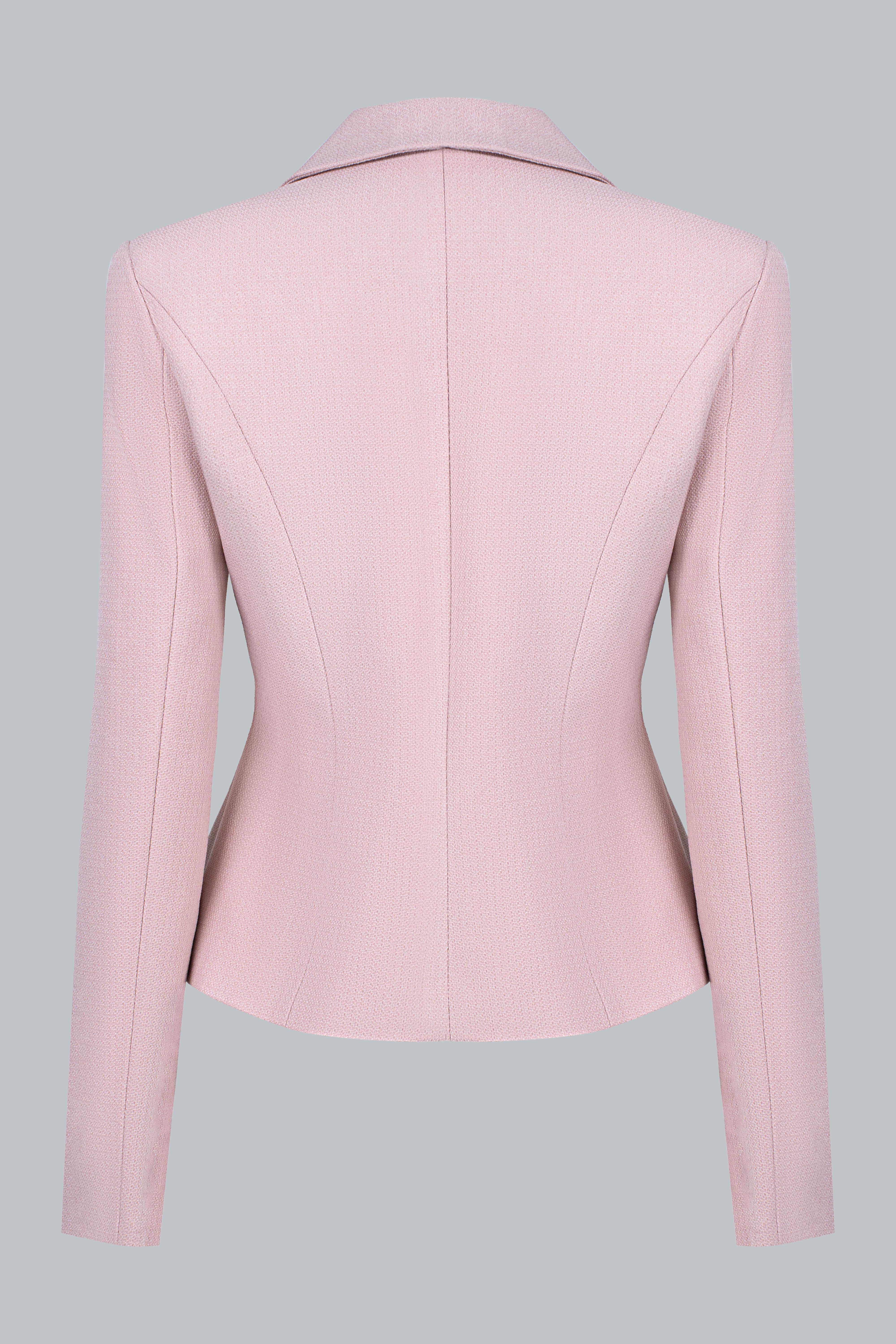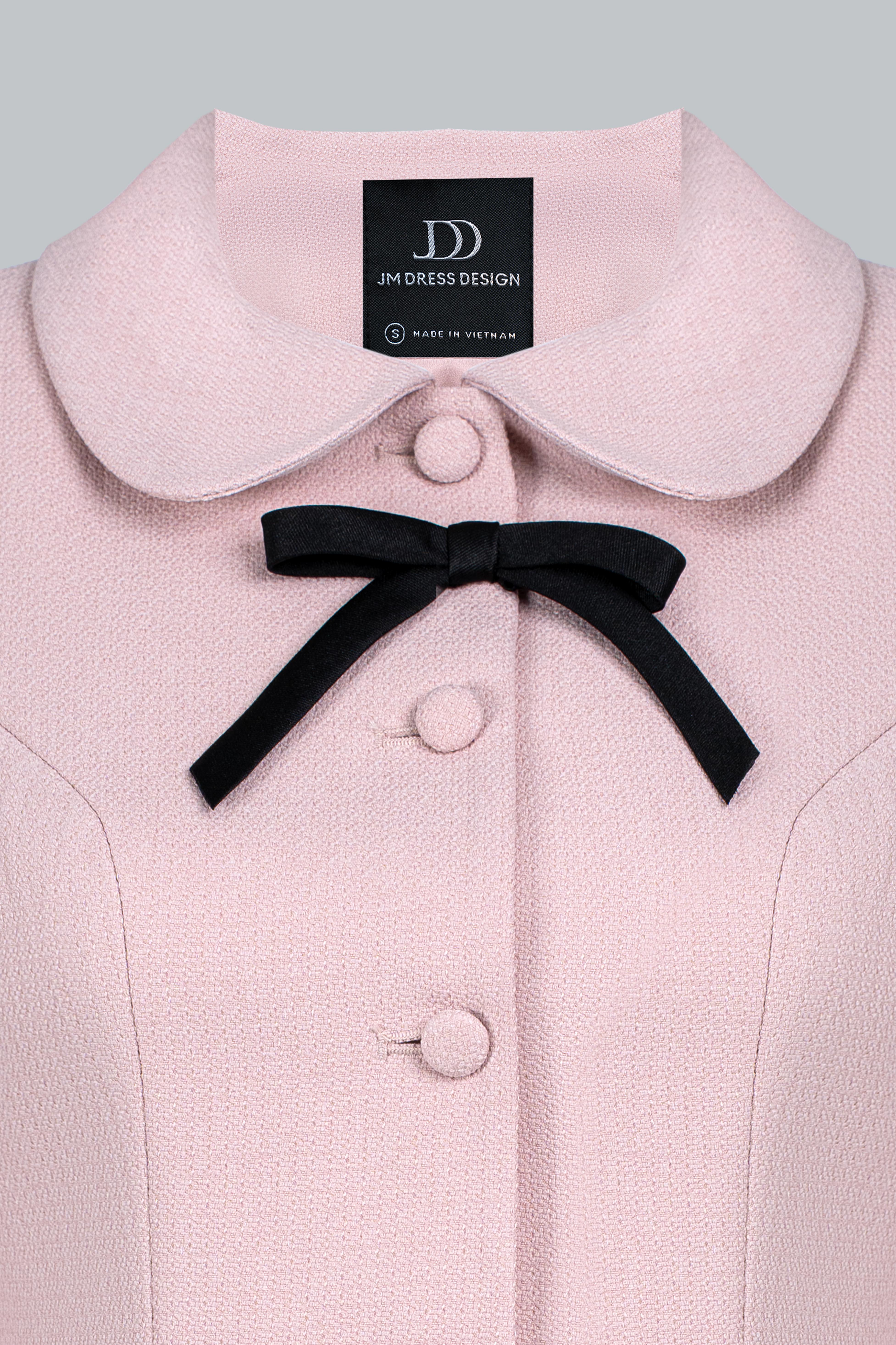 Áo blazer dáng ngắn, ôm nhẹ ở eo để tôn dáng nhưng vẫn giữ sự thanh lịch. Cổ Peter Pan mềm mại, mang không khí cổ điển. Hàng khuy tròn đồng màu tạo sự tinh tế, tối giản. Nổi bật nhất là chi tiết nơ đen nhỏ ở cổ – điểm nhấn nữ tính, gợi phong thái quý cô Parisian tiểu thư.