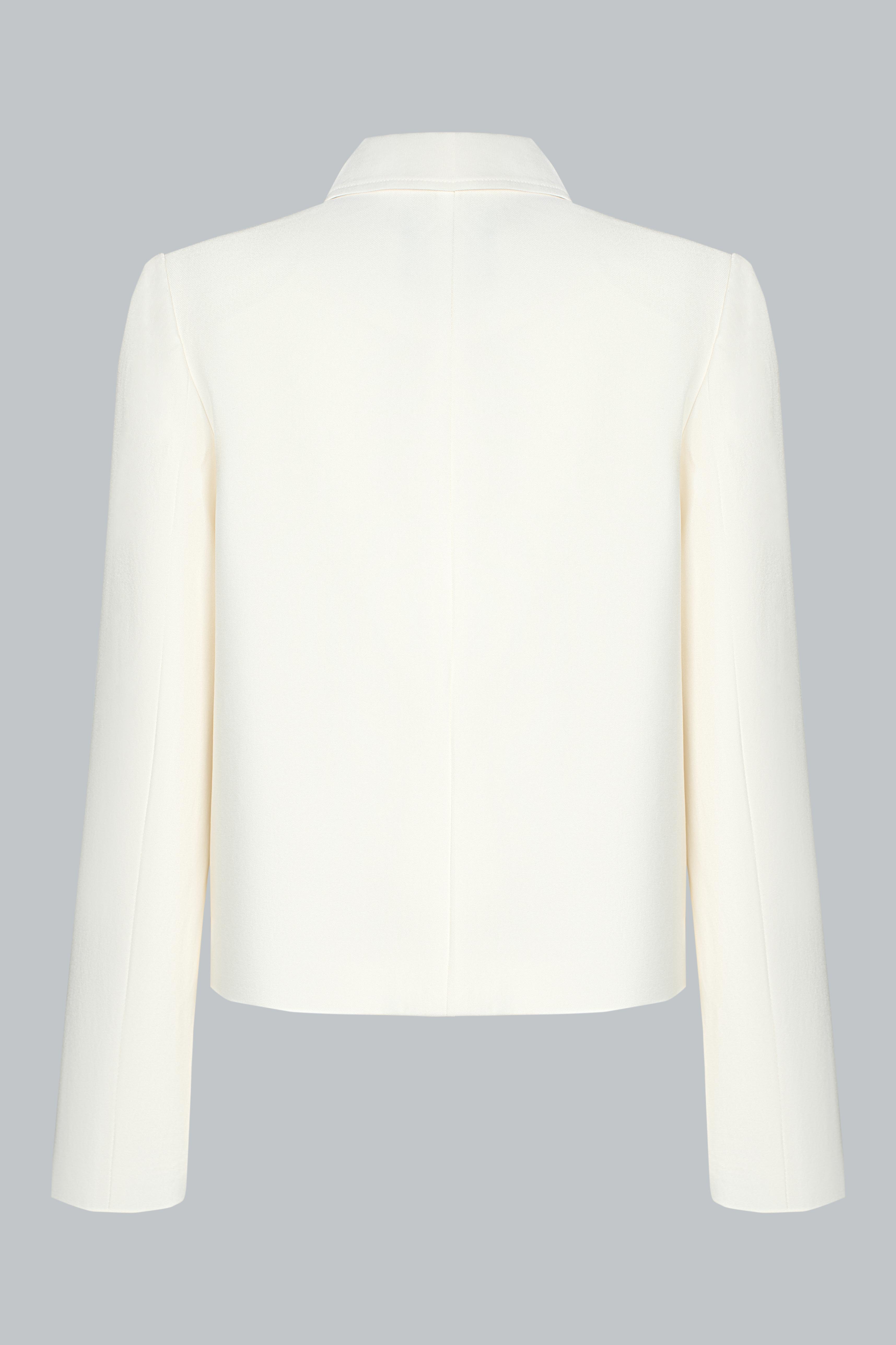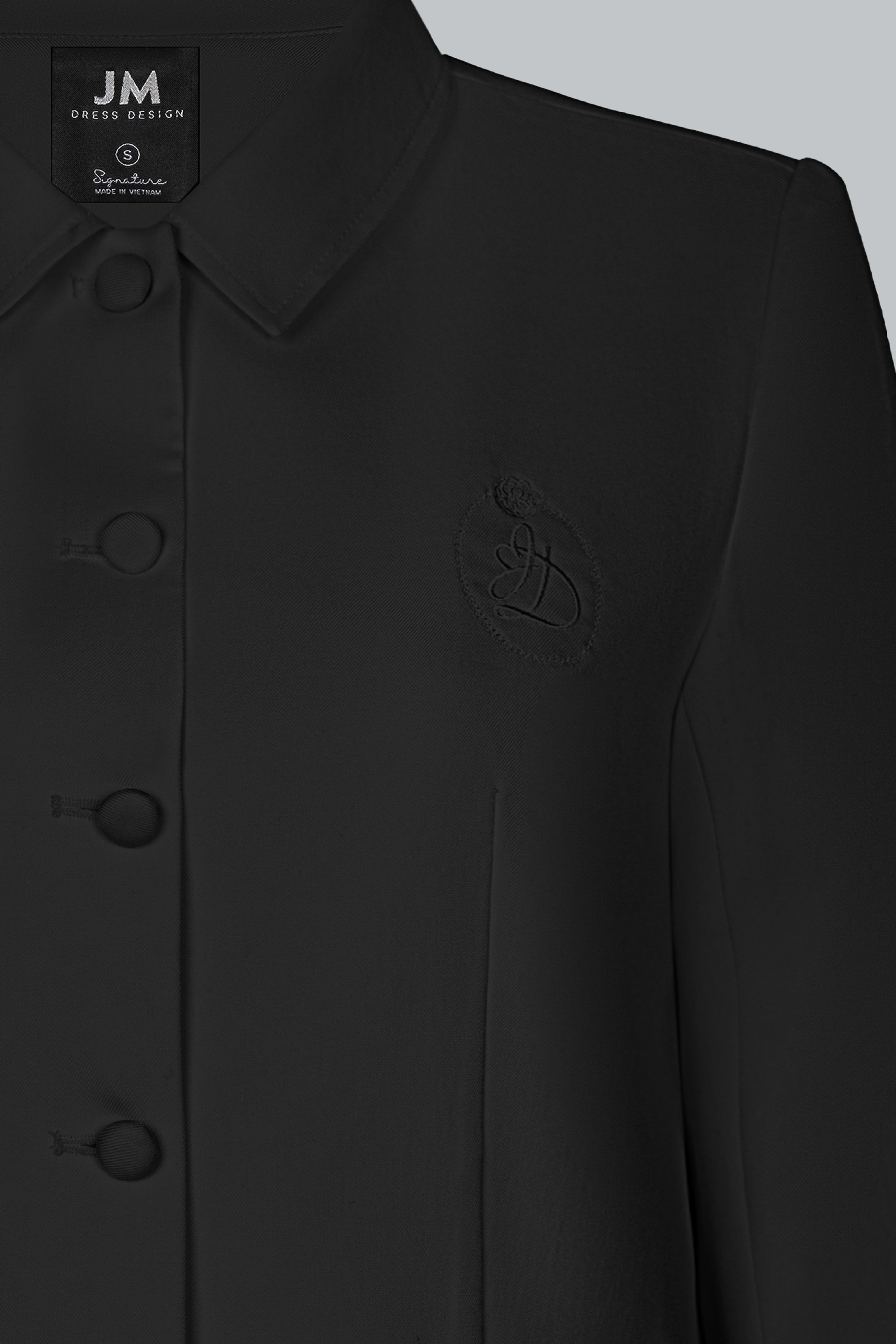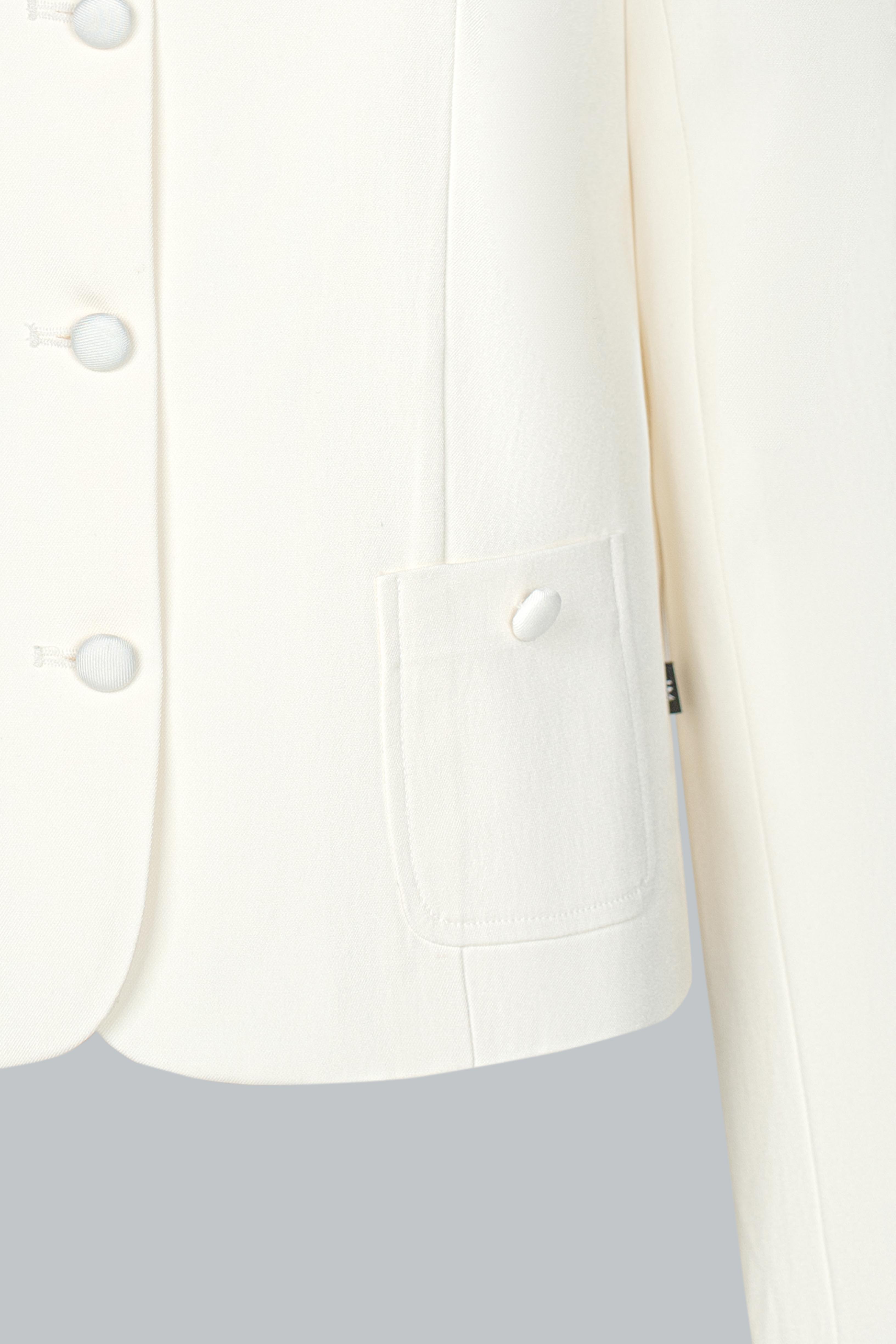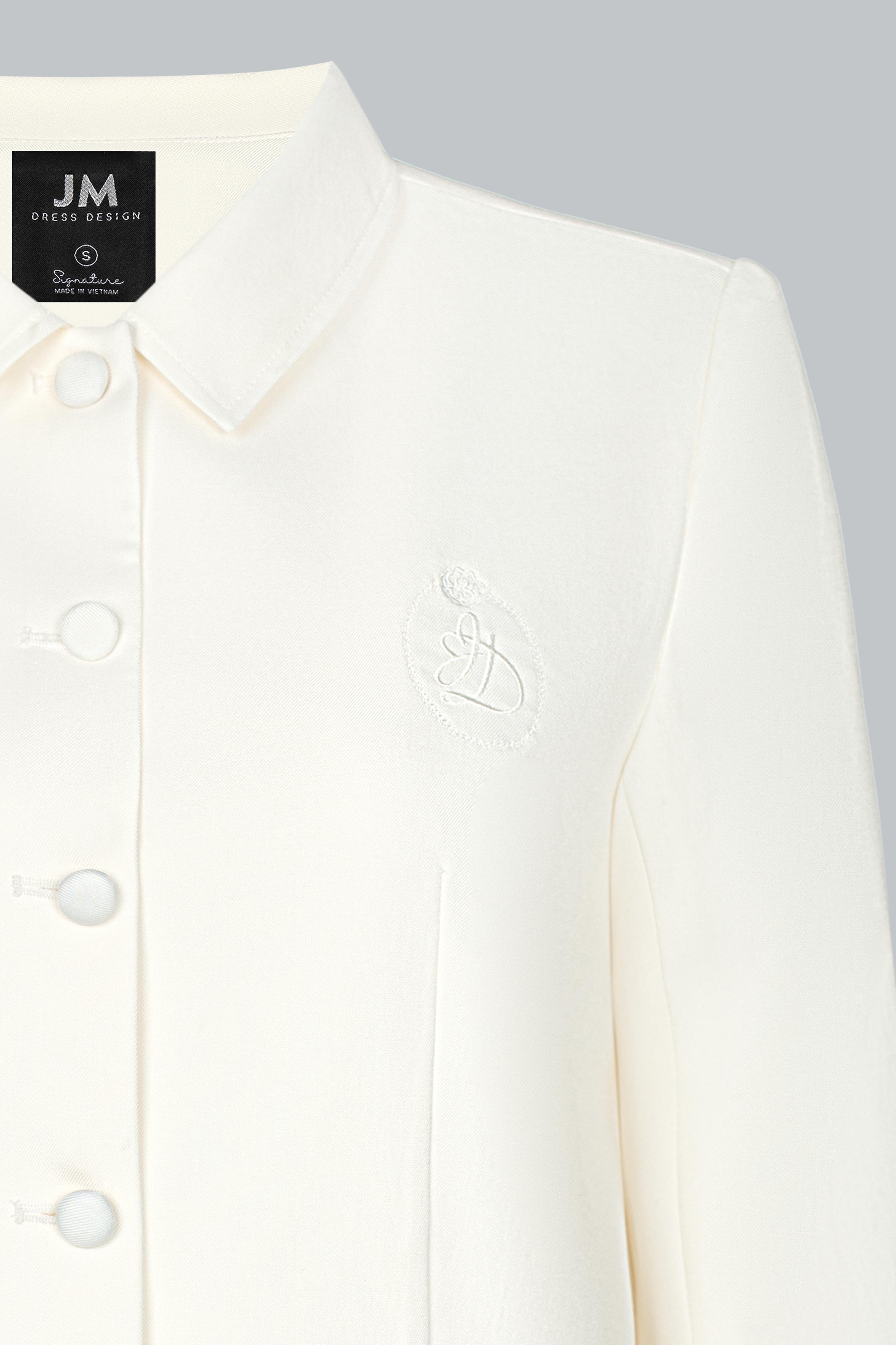 Blazer dáng cropped, độ dài ngang hông trên, tạo tỷ lệ trẻ trung và tôn dáng. Cổ tròn mềm mại khác biệt so với cổ nhọn truyền thống, đem lại nét nữ tính tinh tế. Phía trước có hai túi nắp nhỏ gọn, cùng khuy áo lớn tối giản, giúp tổng thể trở nên thanh thoát và dễ phối trong nhiều phong cách.