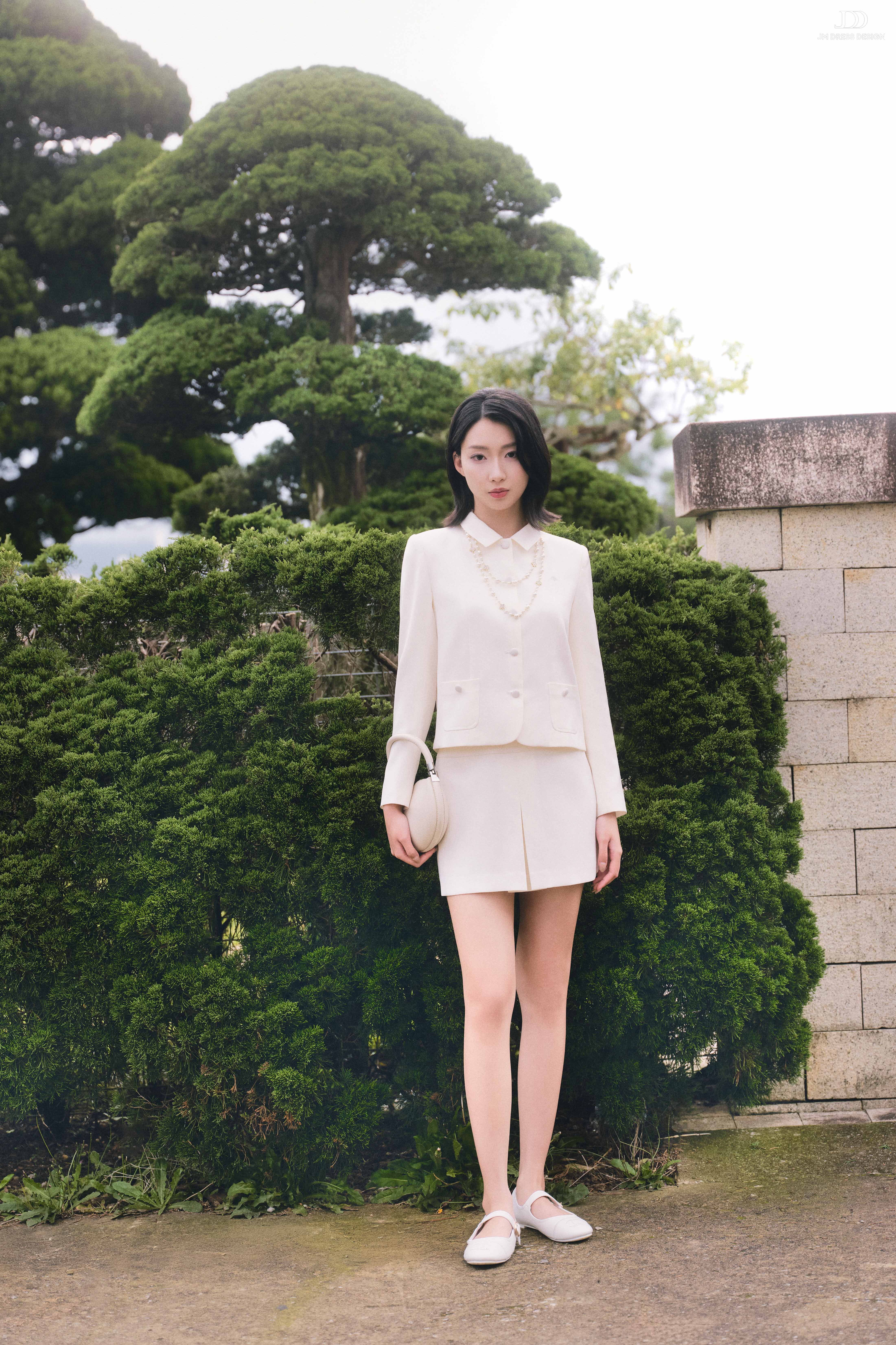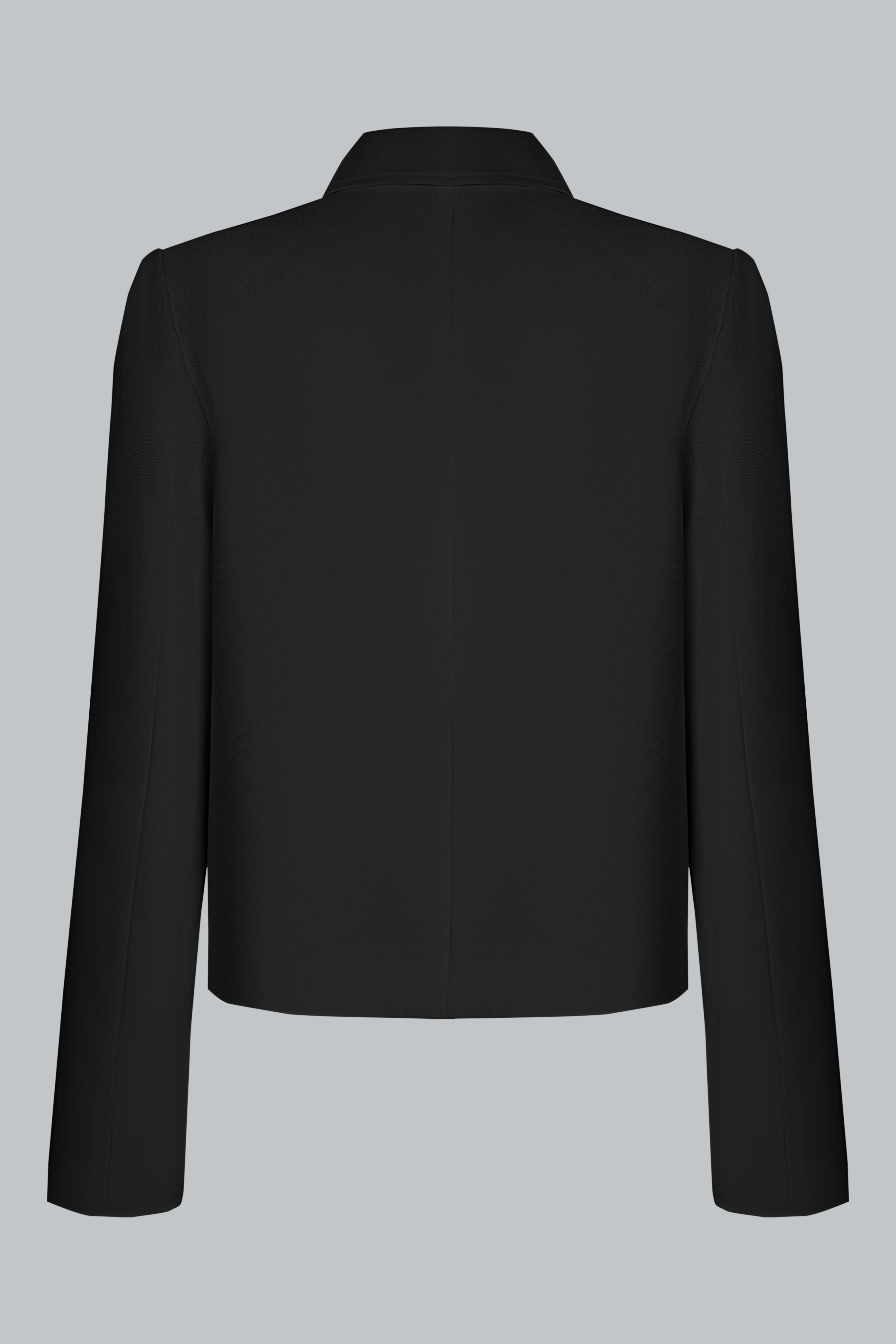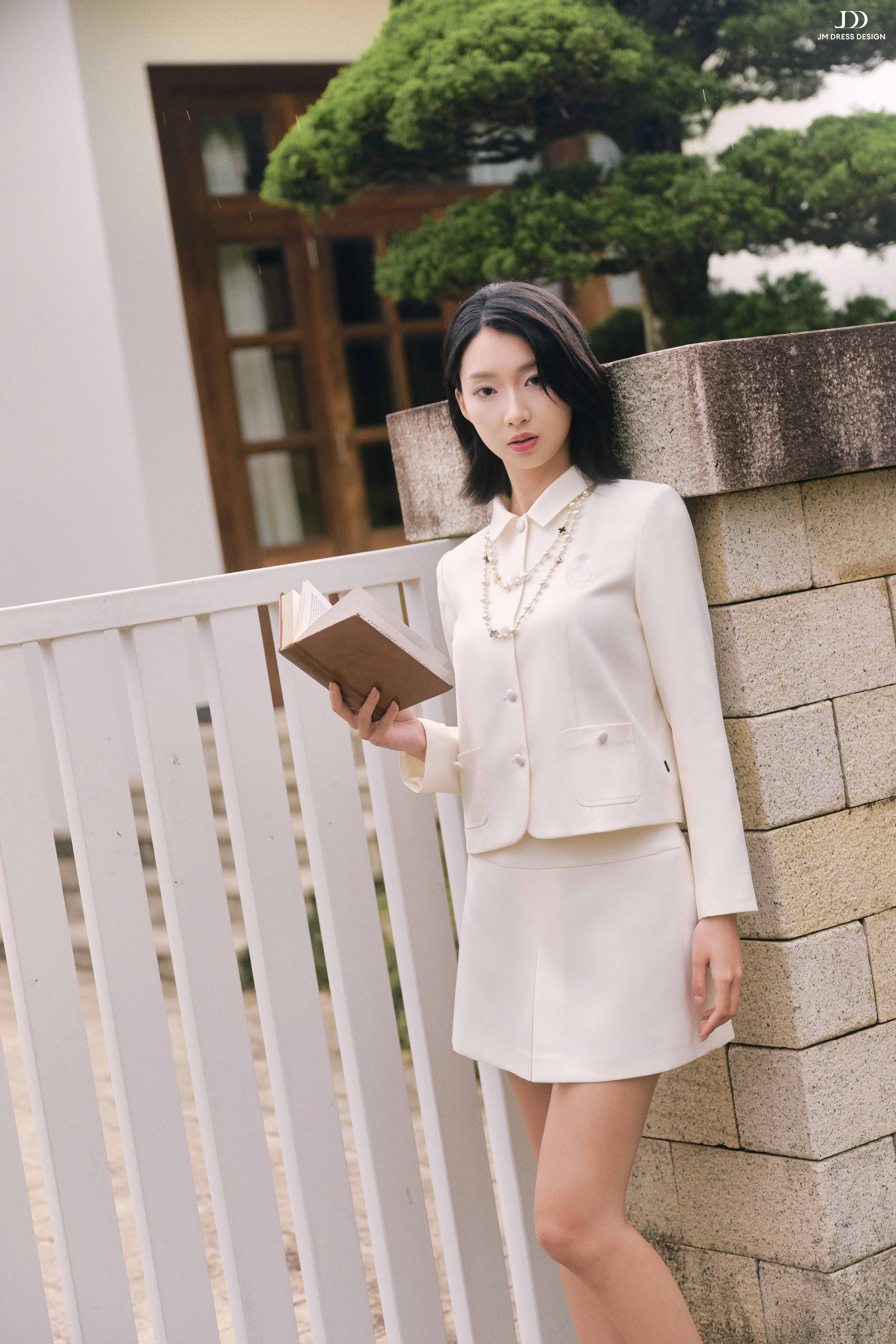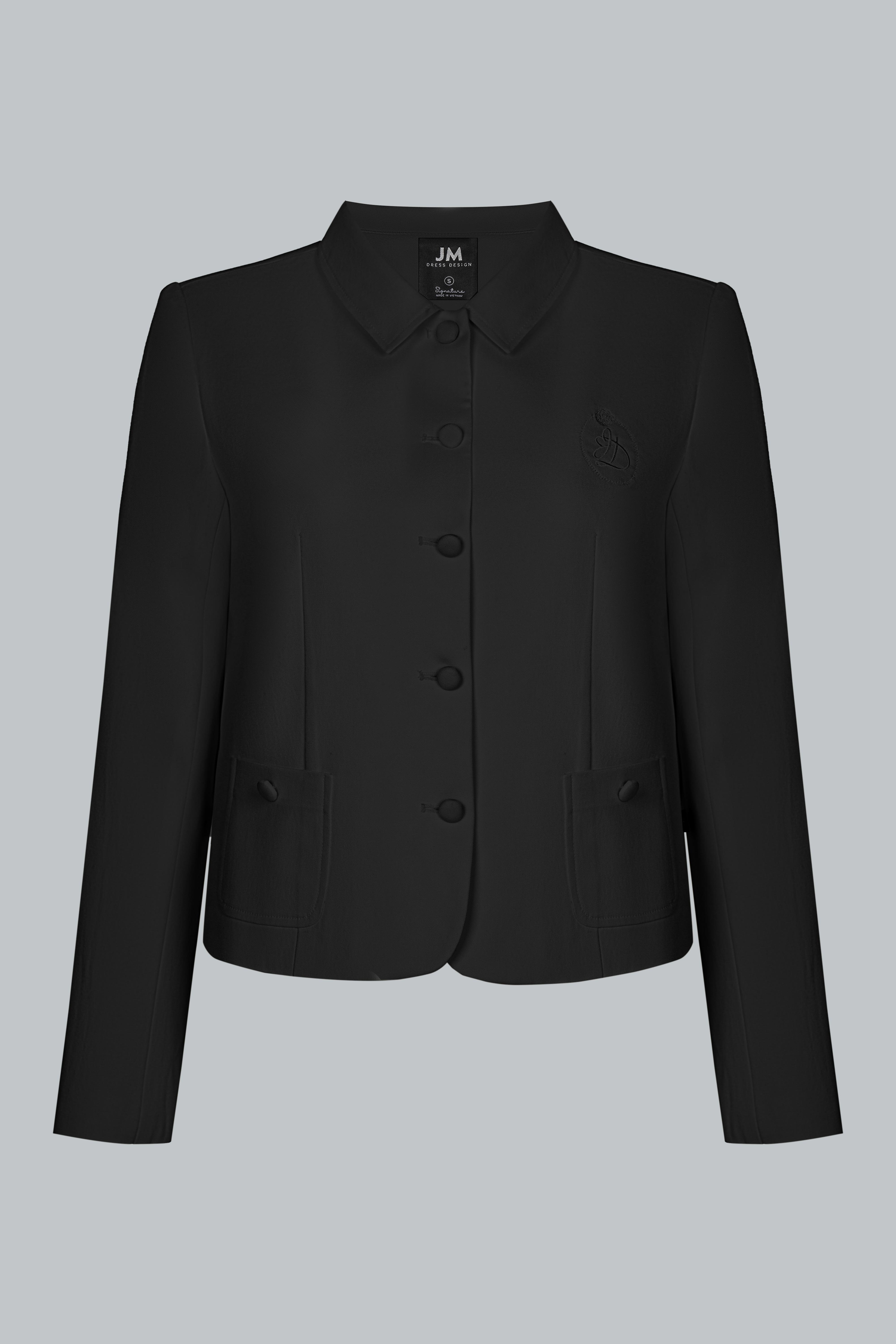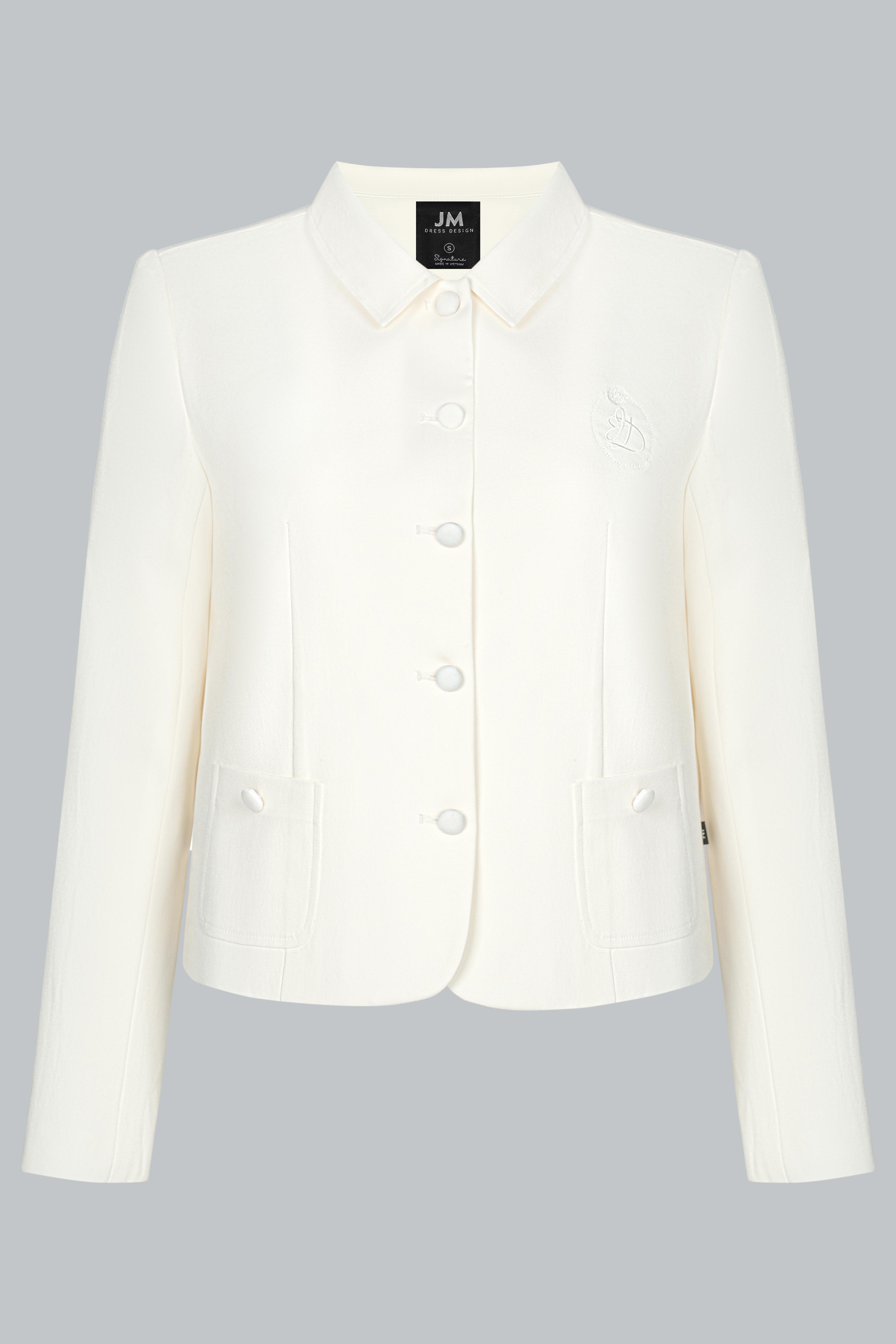 Blazer dáng cropped, độ dài ngang hông trên, tạo tỷ lệ trẻ trung và tôn dáng. Cổ tròn mềm mại khác biệt so với cổ nhọn truyền thống, đem lại nét nữ tính tinh tế. Phía trước có hai túi nắp nhỏ gọn, cùng khuy áo lớn tối giản, giúp tổng thể trở nên thanh thoát và dễ phối trong nhiều phong cách.
