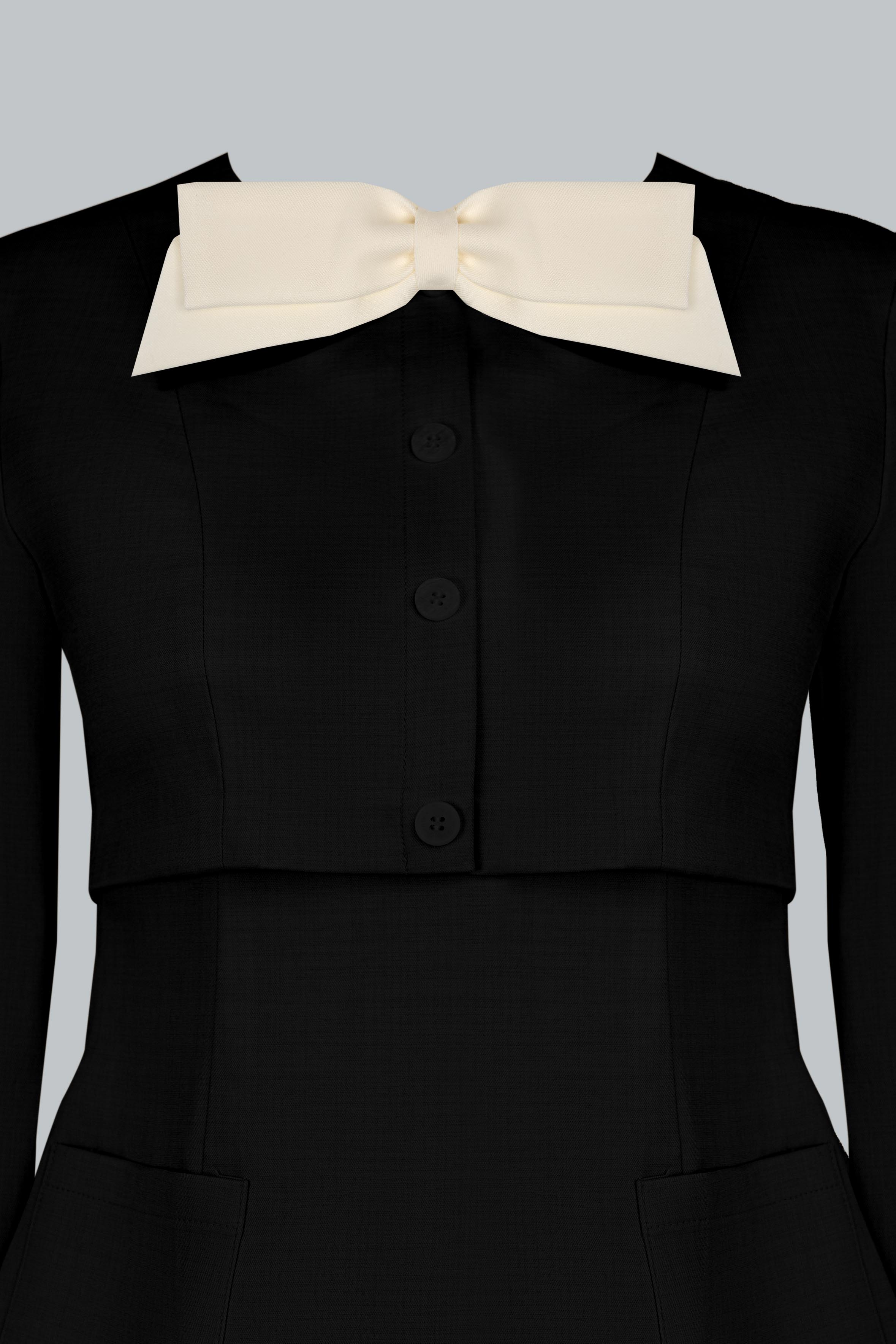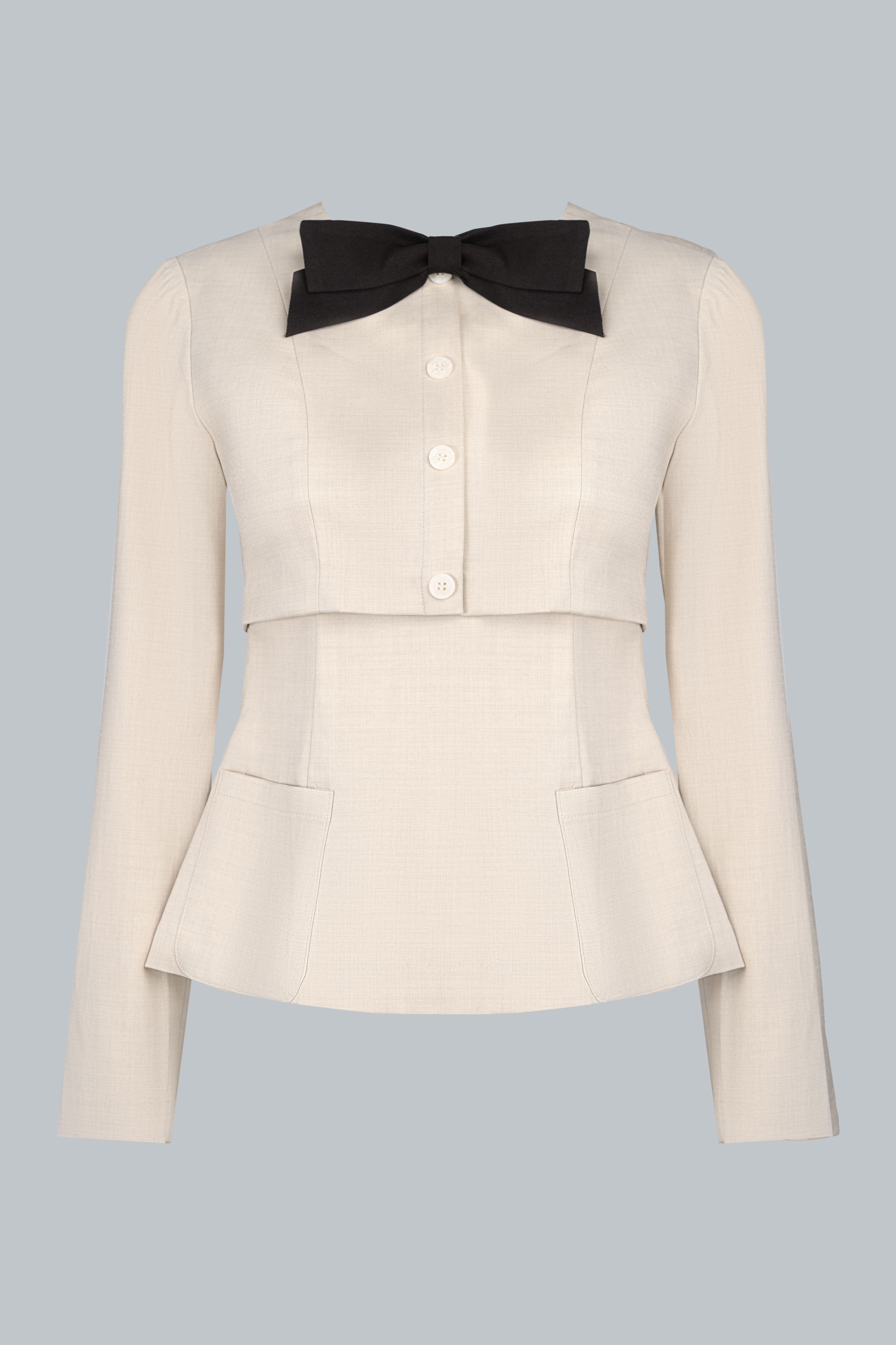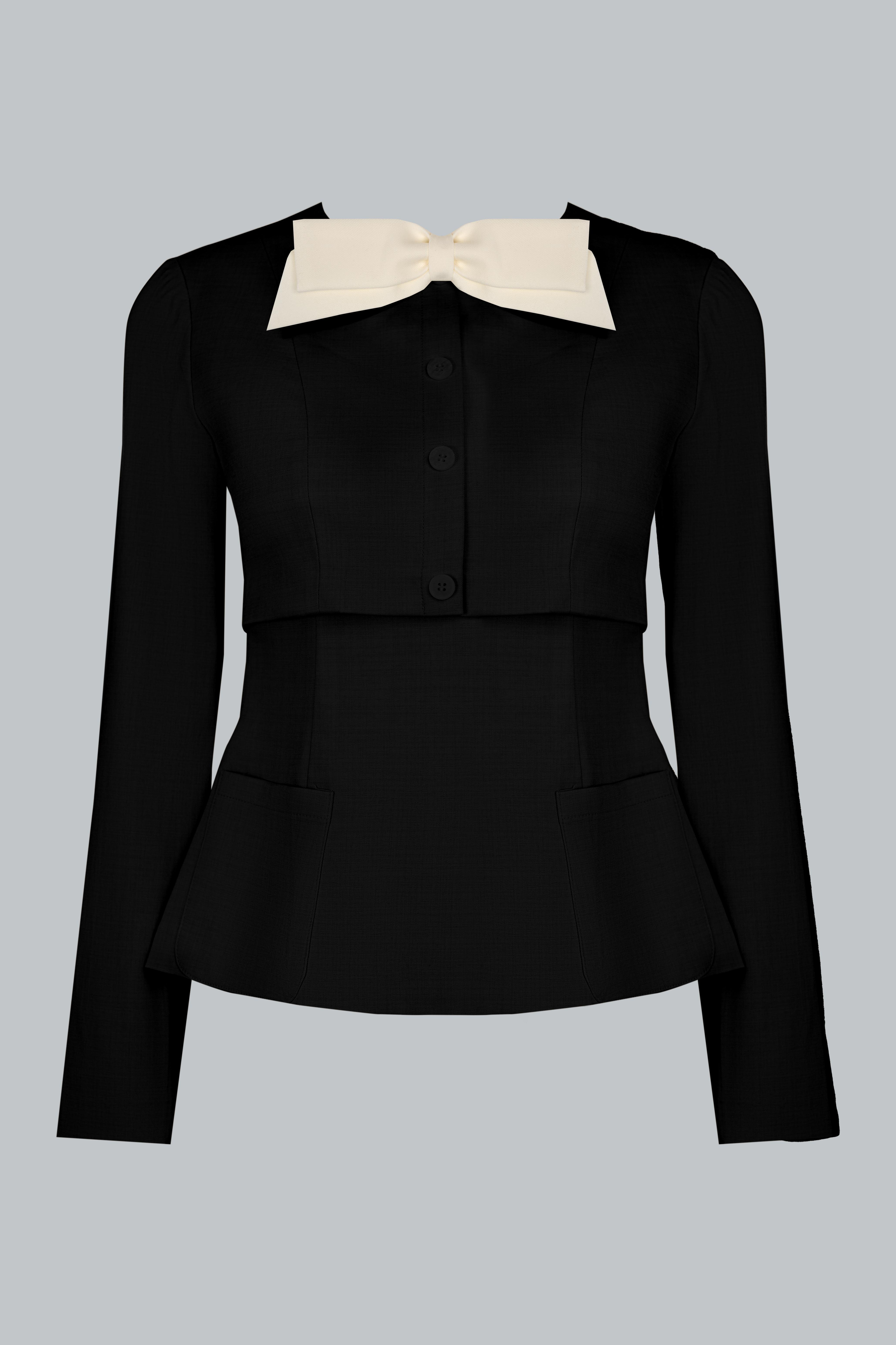 Phom áo ôm nhẹ, tạo hiệu ứng vòng eo đồng hồ cát đầy tinh tế. Cổ tròn phối nơ đen to bản mang đến điểm nhấn tương phản nổi bật, vừa thanh lịch vừa mang hơi thở retro. Hàng khuy trắng được bố trí tinh gọn dọc thân trước, kết hợp túi ốp hai bên giúp cân bằng thị giác và tạo cảm giác hài hòa cho tổng thể. Dáng peplum nhẹ giúp vòng eo thon gọn và tạo độ cân đối khi phối cùng chân váy dài.