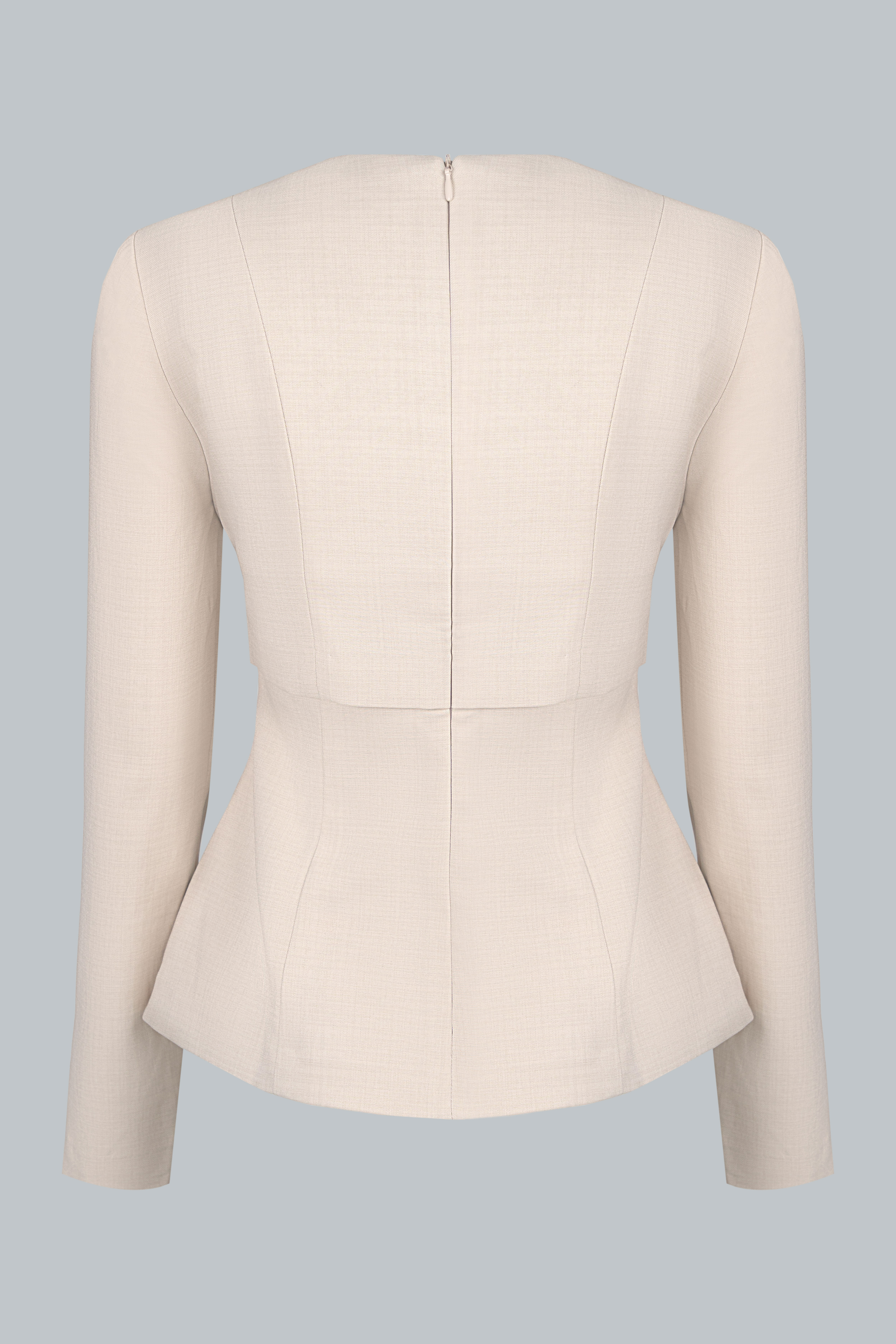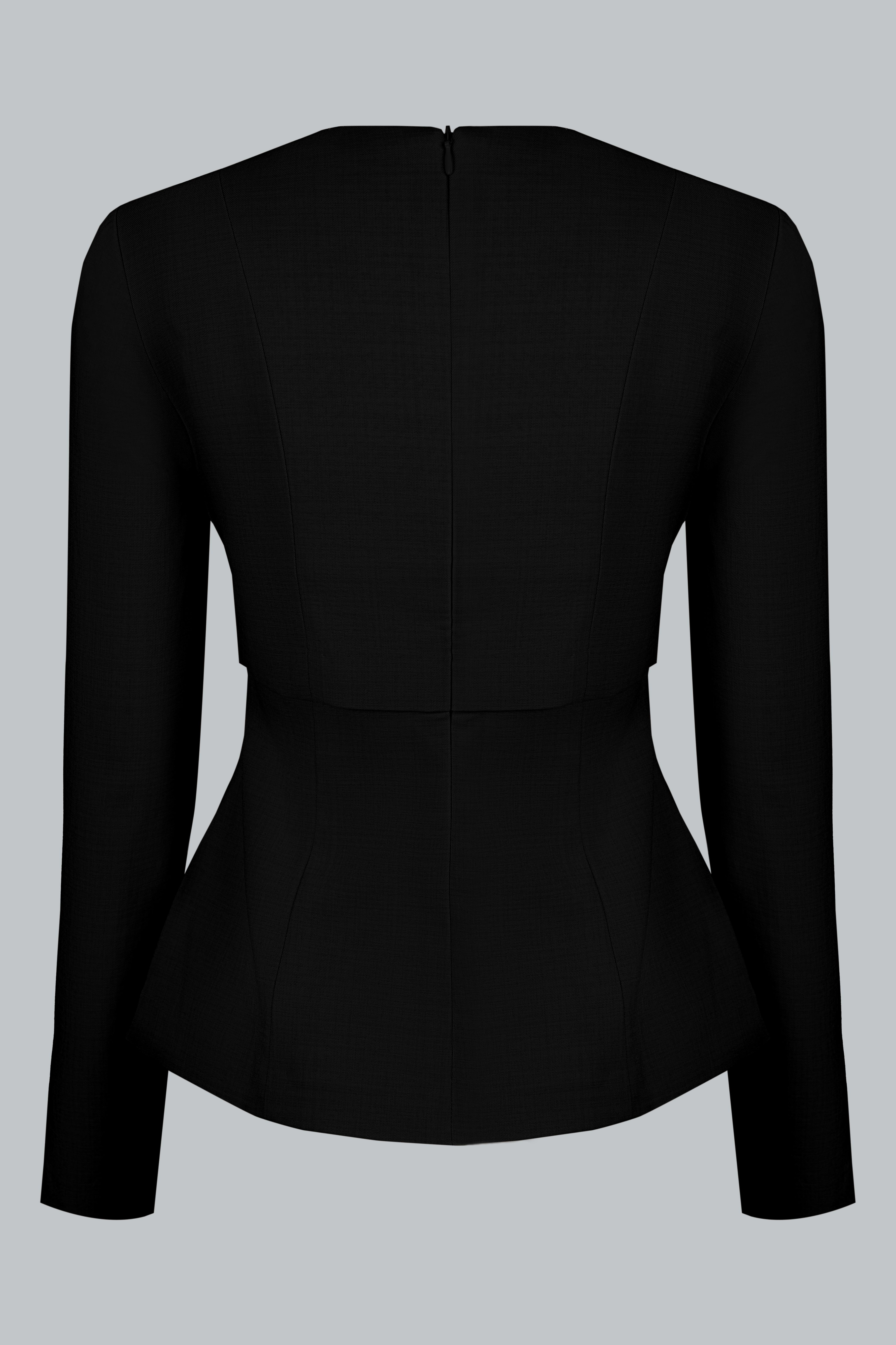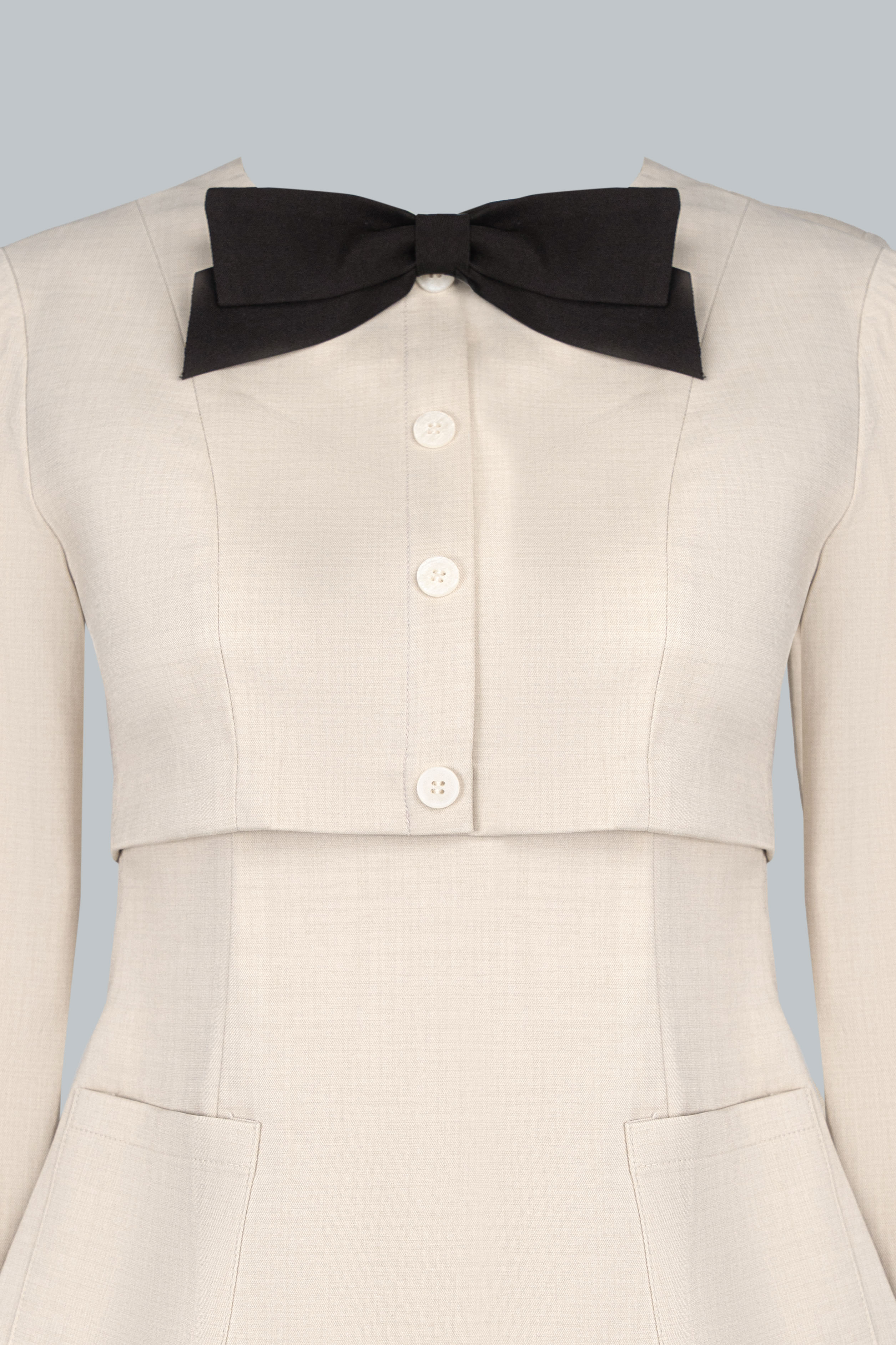 Phom áo ôm nhẹ, tạo hiệu ứng vòng eo đồng hồ cát đầy tinh tế. Cổ tròn phối nơ đen to bản mang đến điểm nhấn tương phản nổi bật, vừa thanh lịch vừa mang hơi thở retro. Hàng khuy trắng được bố trí tinh gọn dọc thân trước, kết hợp túi ốp hai bên giúp cân bằng thị giác và tạo cảm giác hài hòa cho tổng thể. Dáng peplum nhẹ giúp vòng eo thon gọn và tạo độ cân đối khi phối cùng chân váy dài.