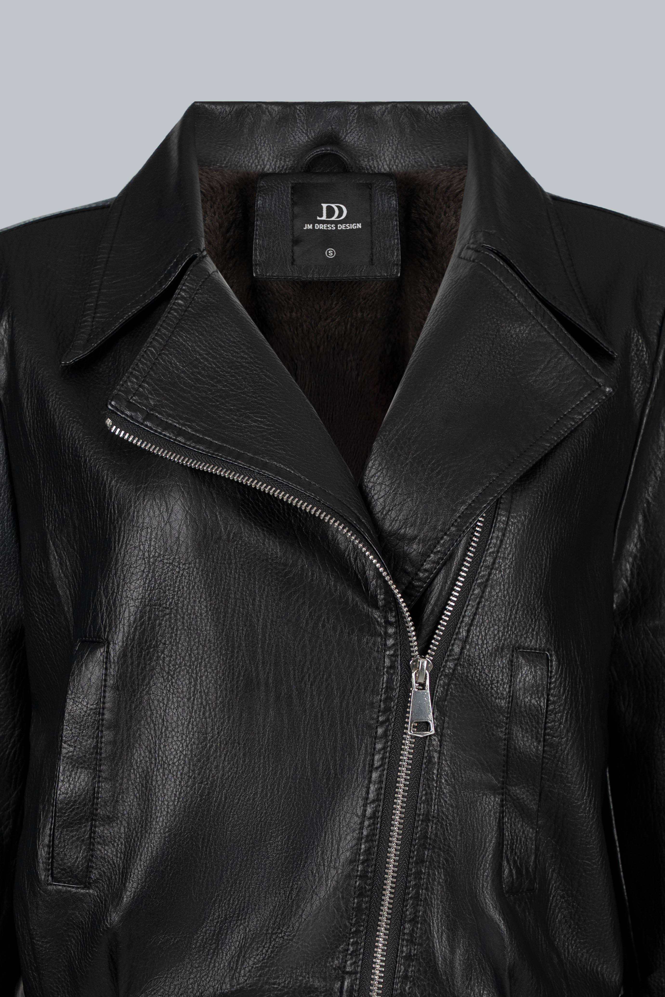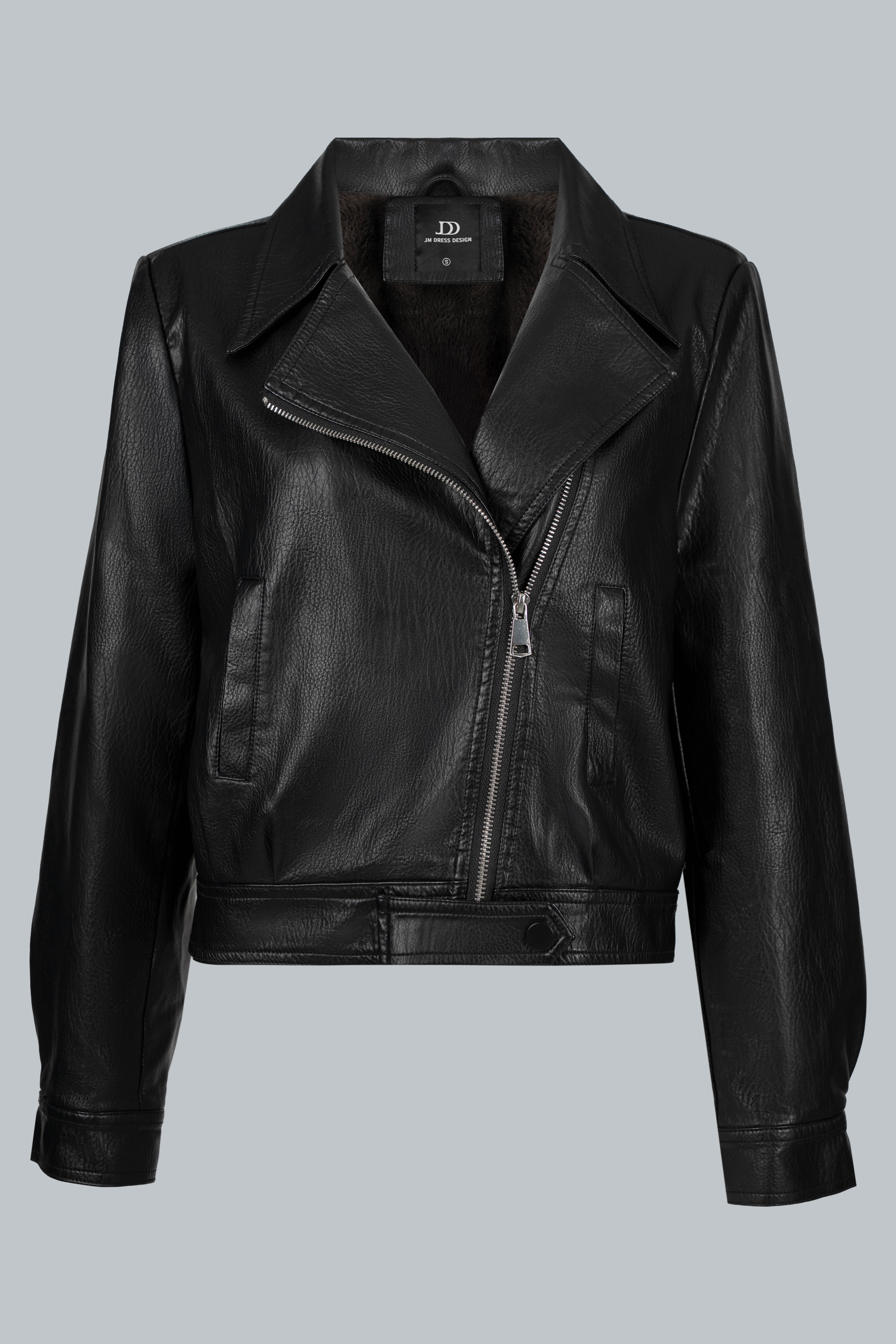 Áo khoác da dáng biker với phom đứng, tạo cảm giác gọn gàng và sắc nét khi mặc.