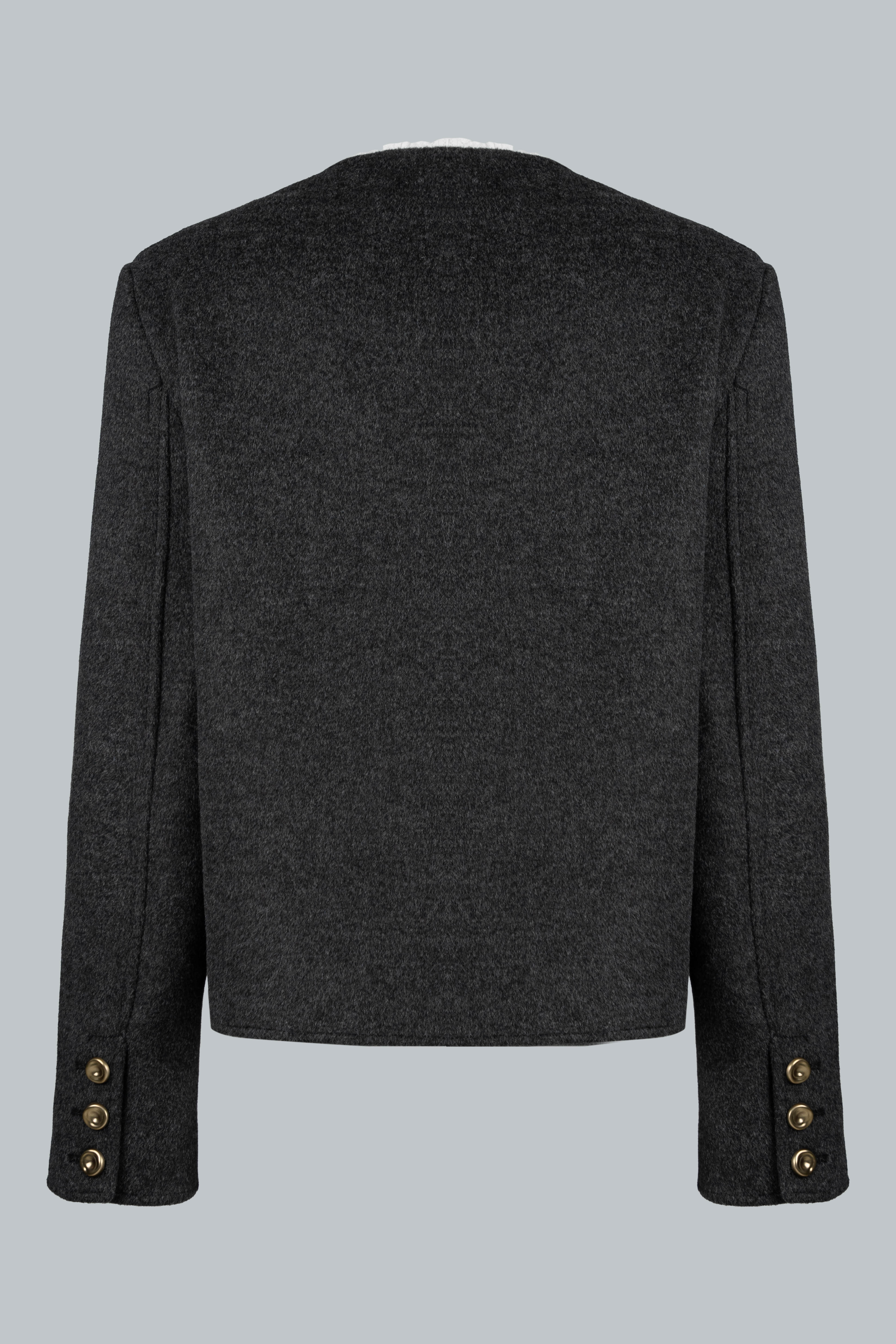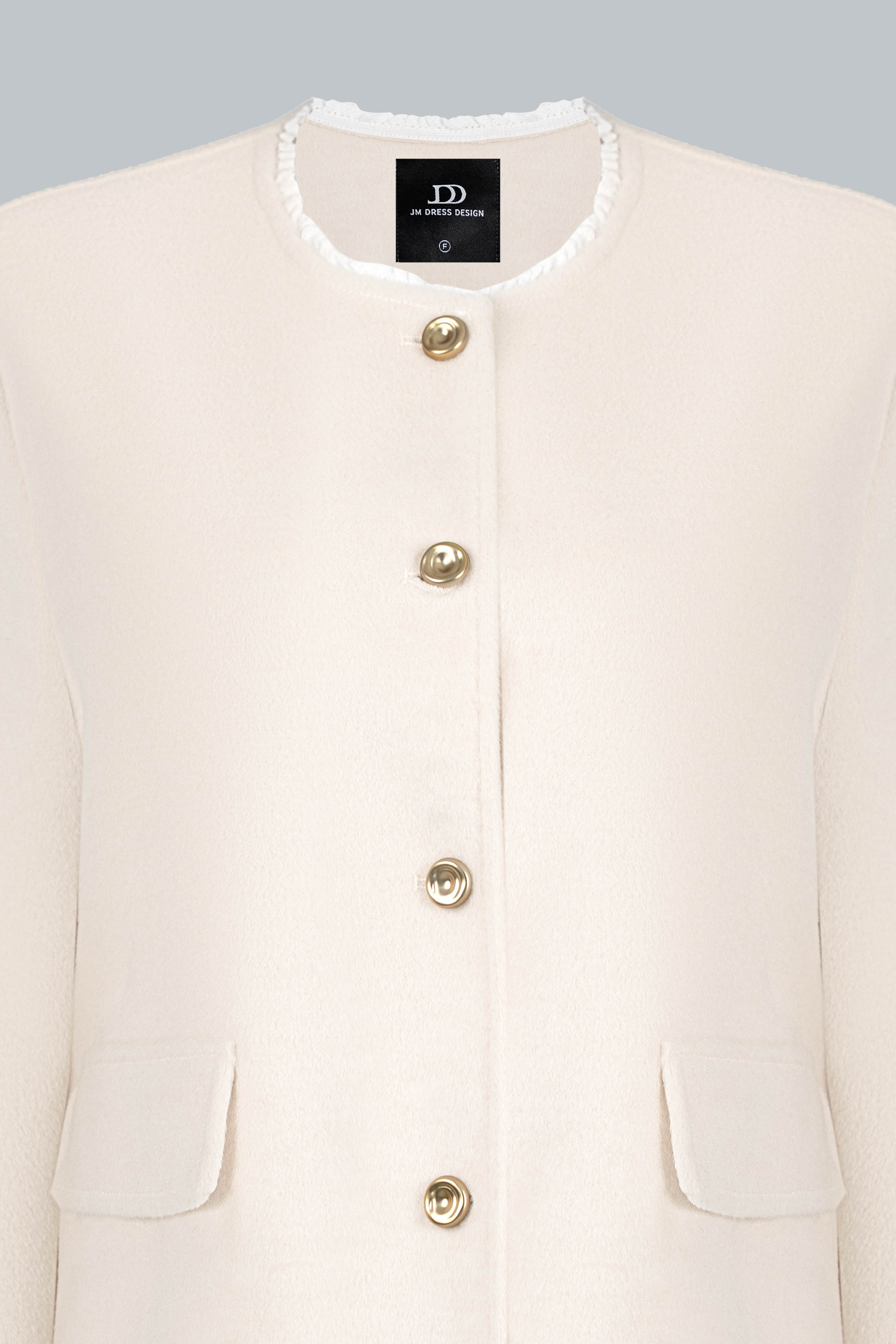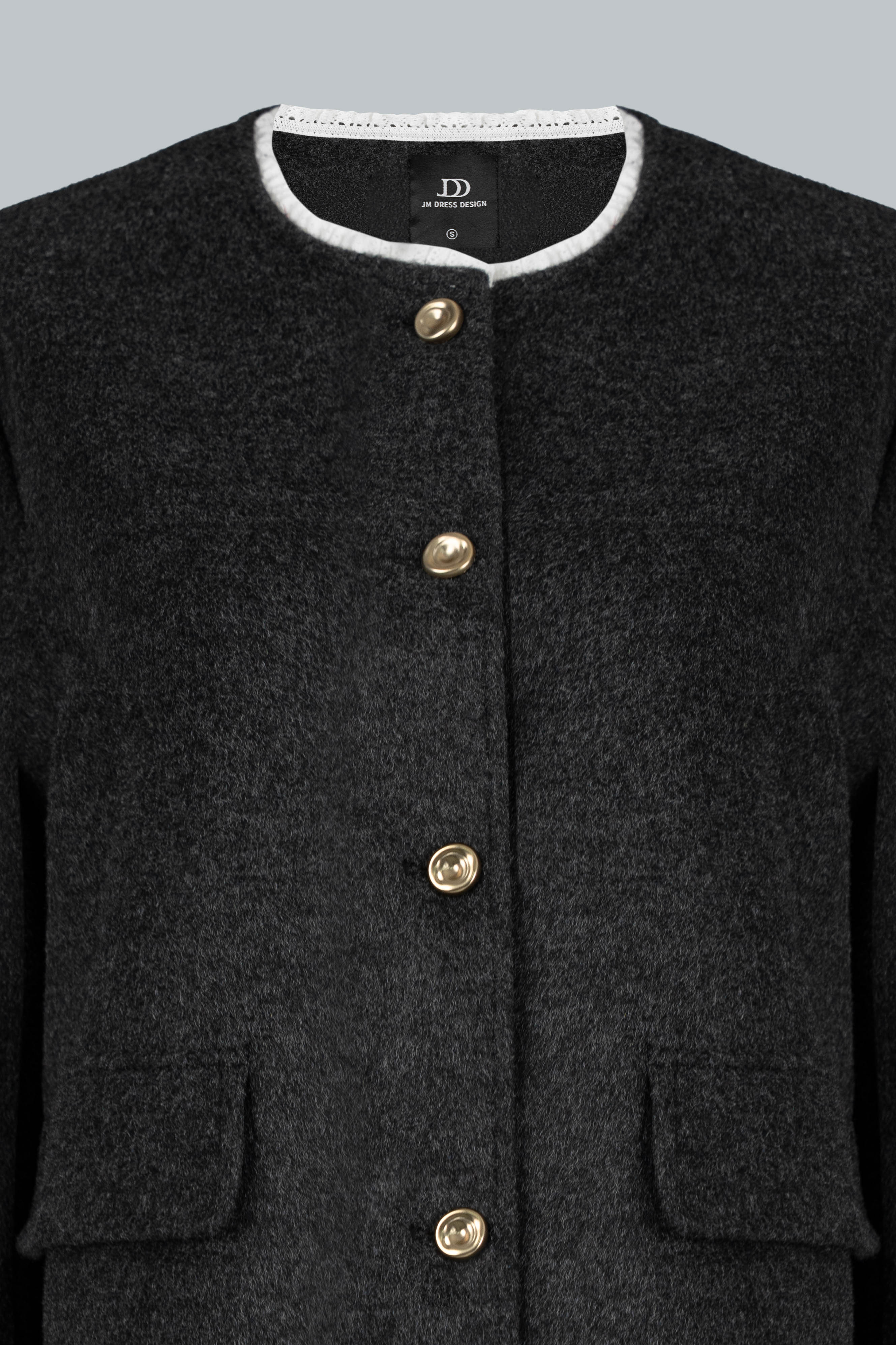 Chất dạ có độ dày vừa phải, giữ ấm tốt nhưng vẫn mềm, không cứng; đường may khâu tay tinh tế, viền gập gọn giúp áo đứng phom mà không nặng nề.