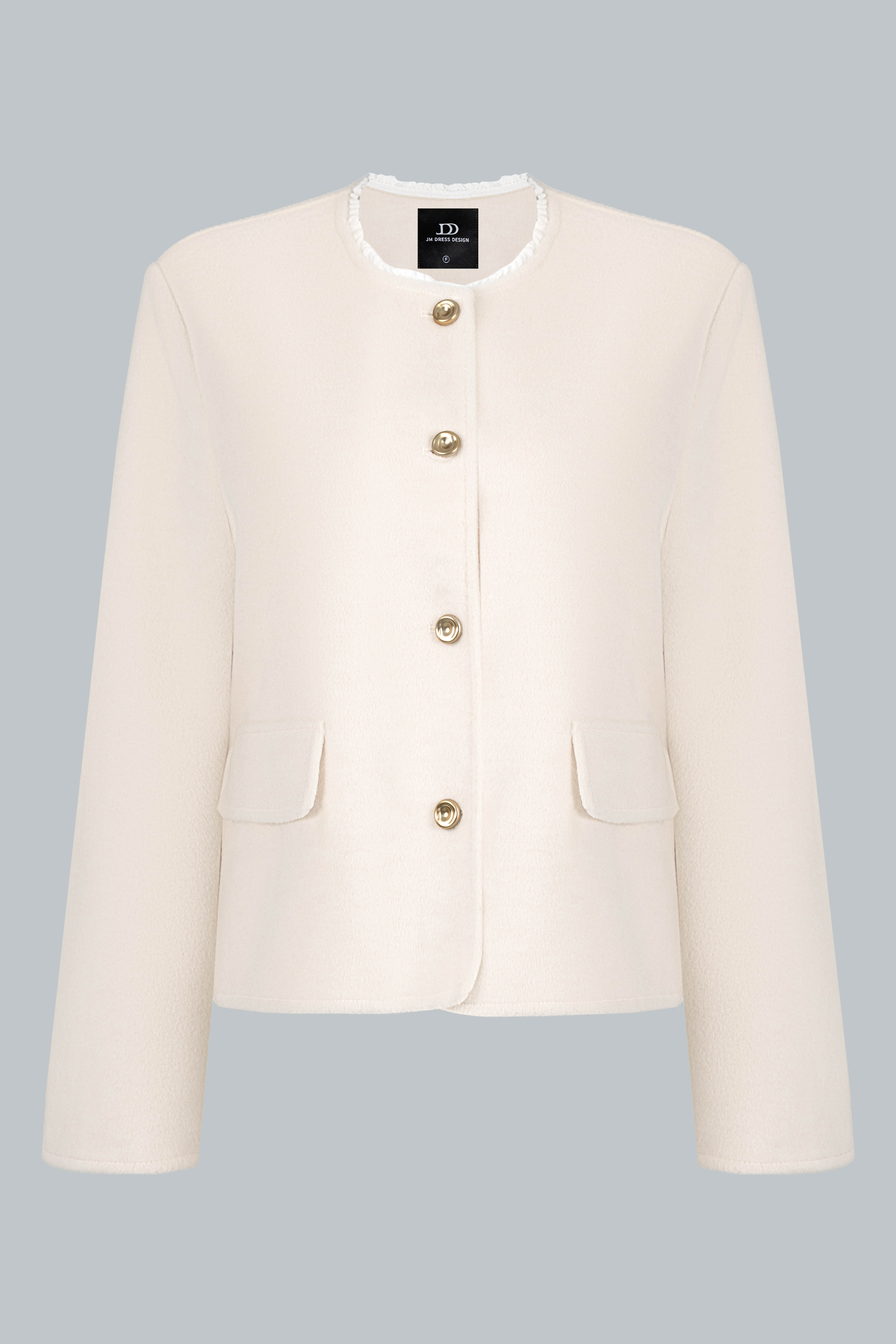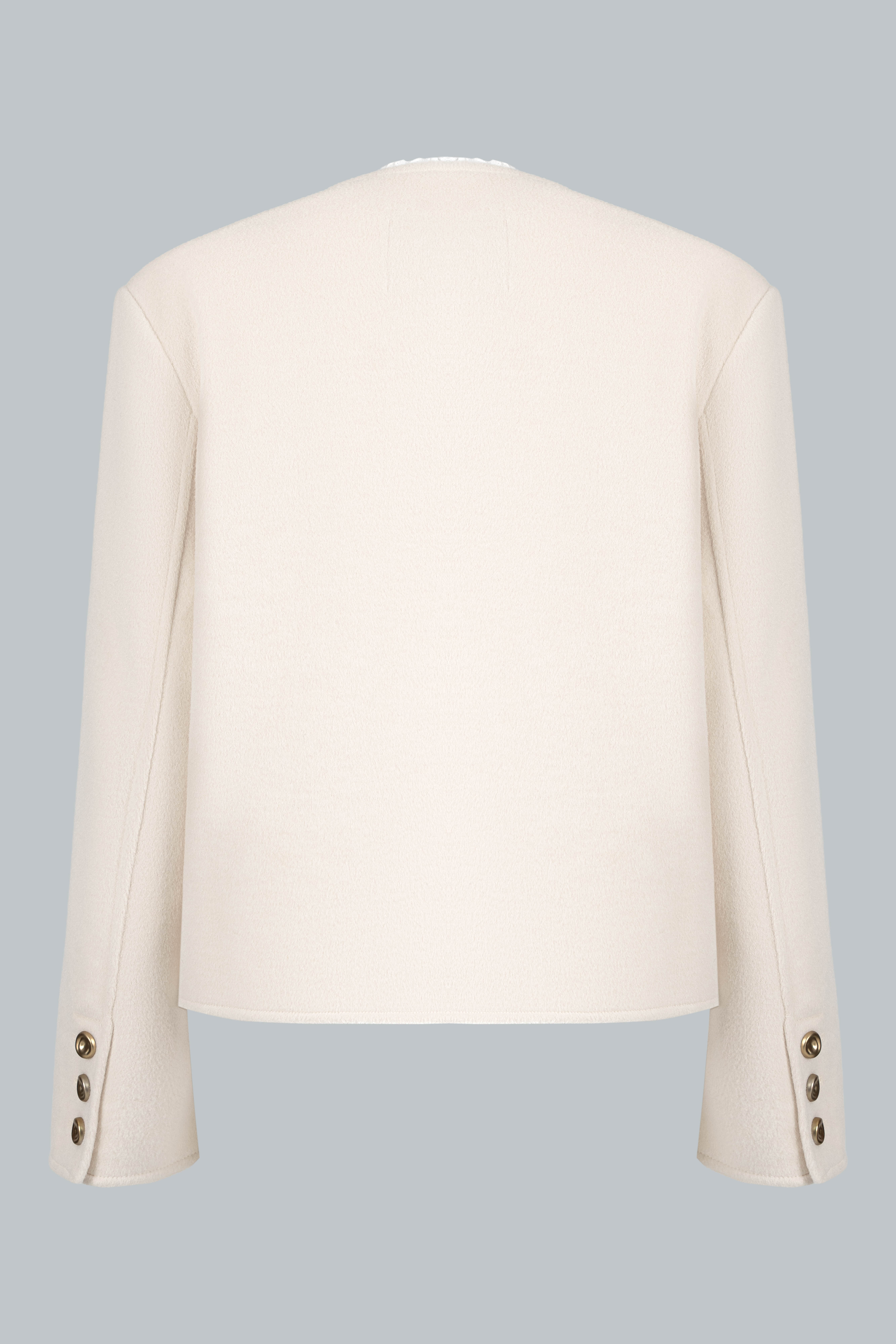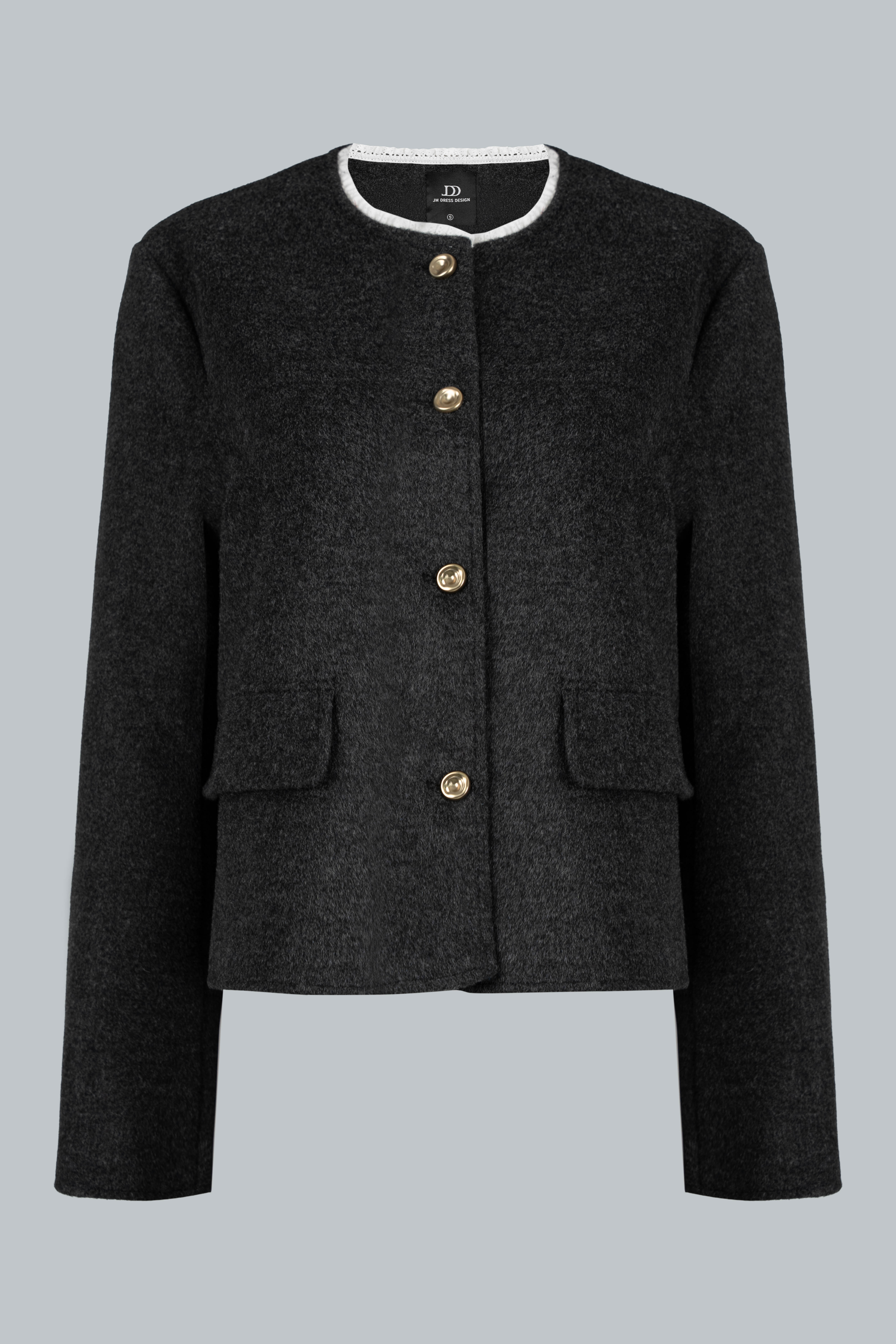 Chất dạ có độ dày vừa phải, giữ ấm tốt nhưng vẫn mềm, không cứng; đường may khâu tay tinh tế, viền gập gọn giúp áo đứng phom mà không nặng nề.