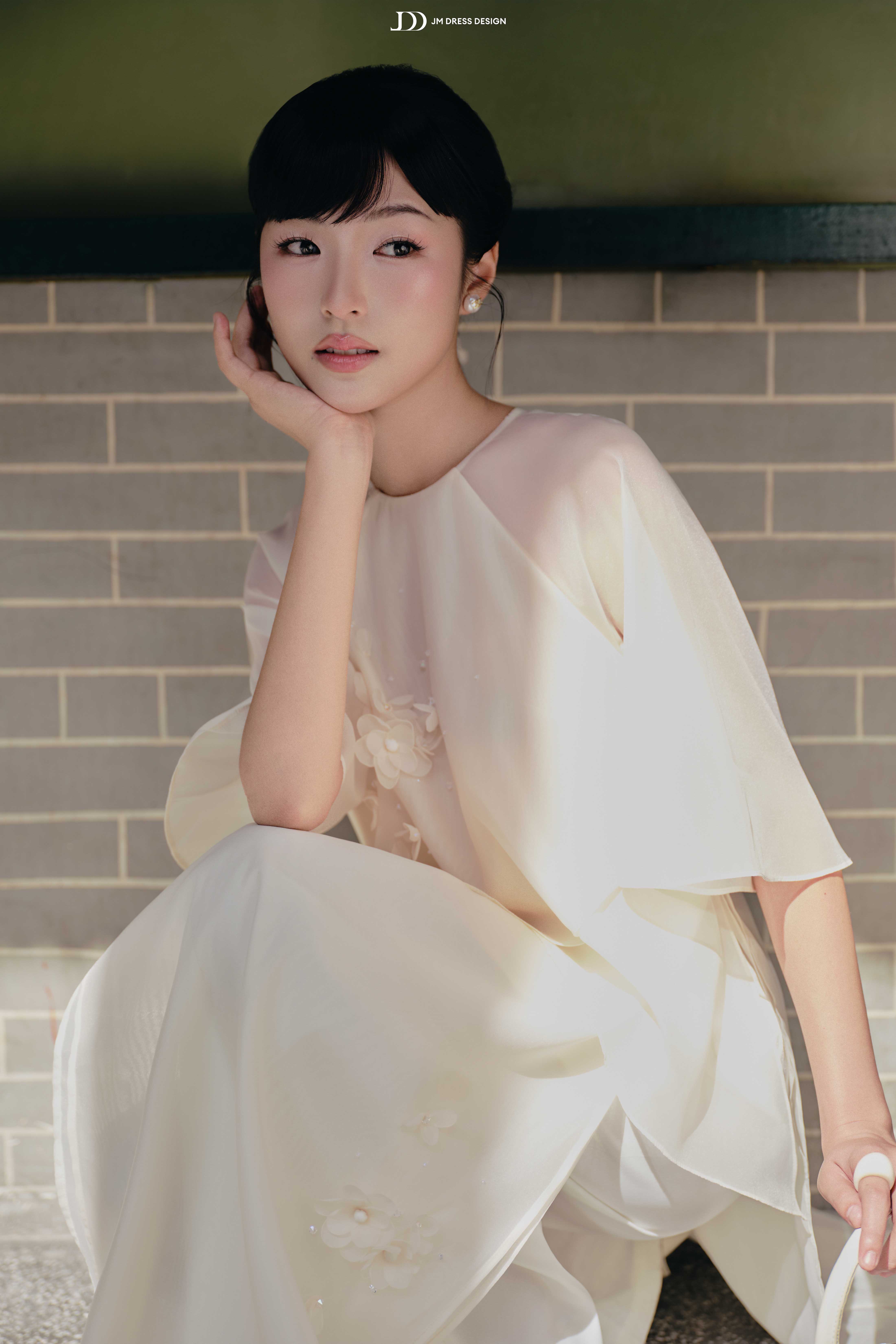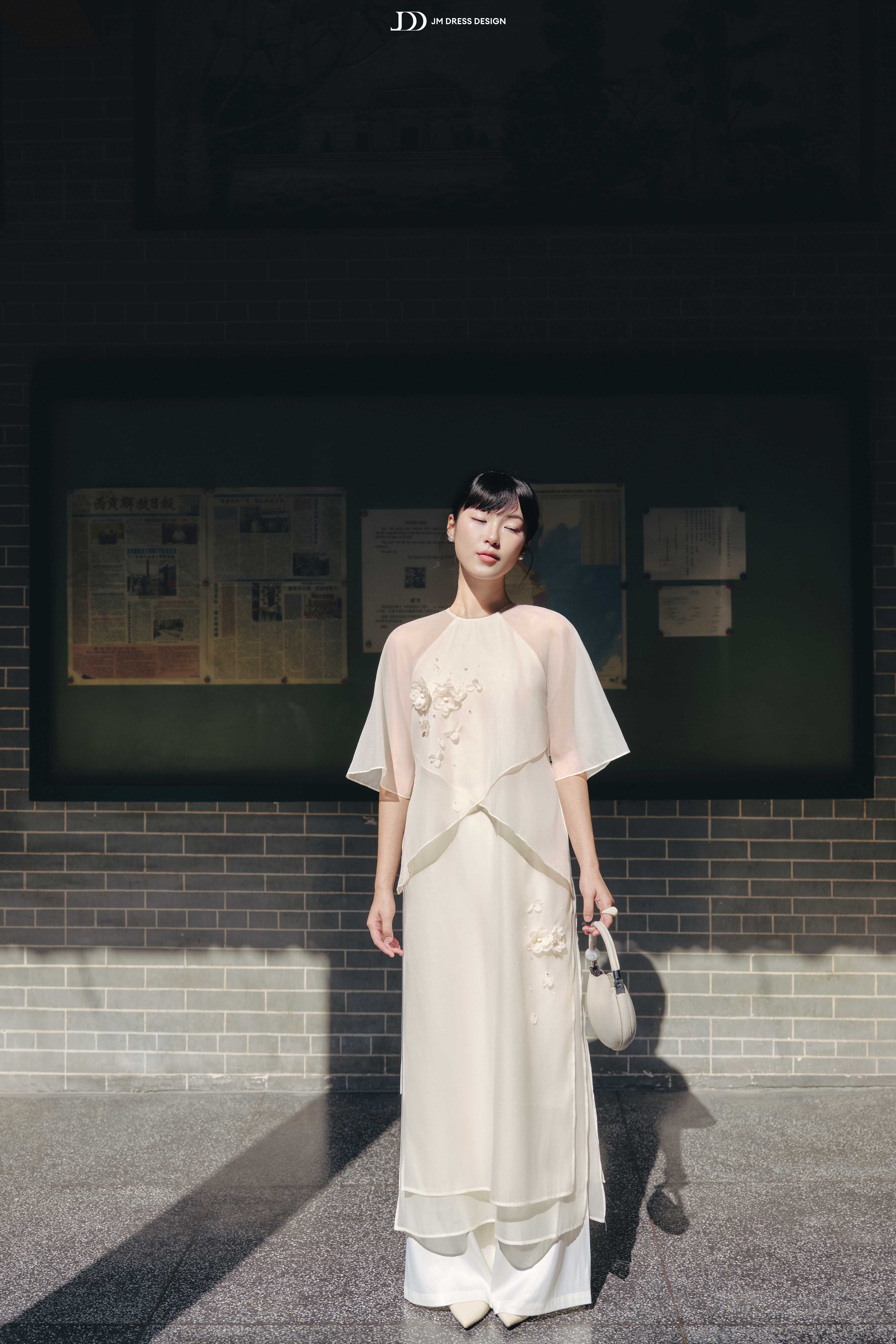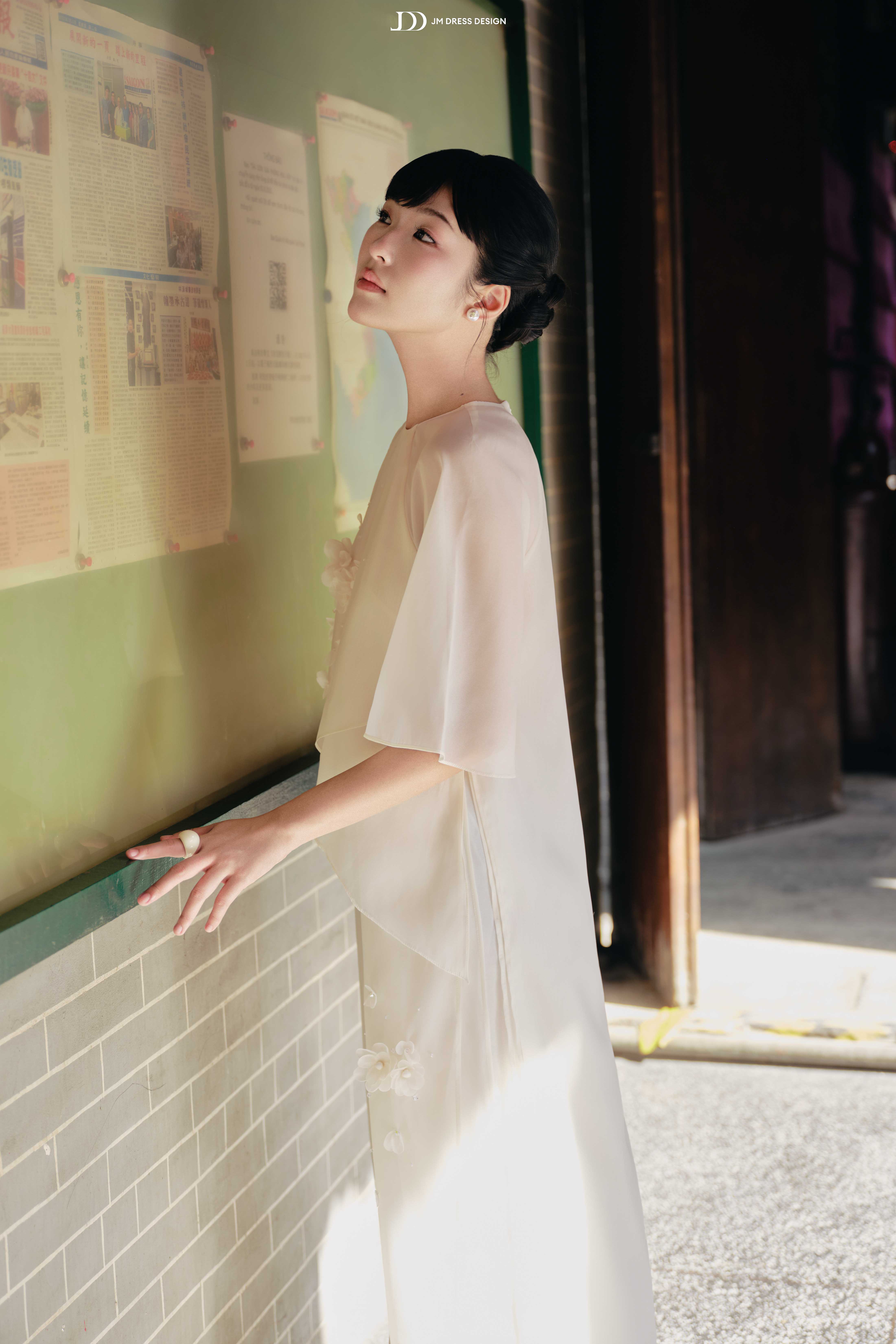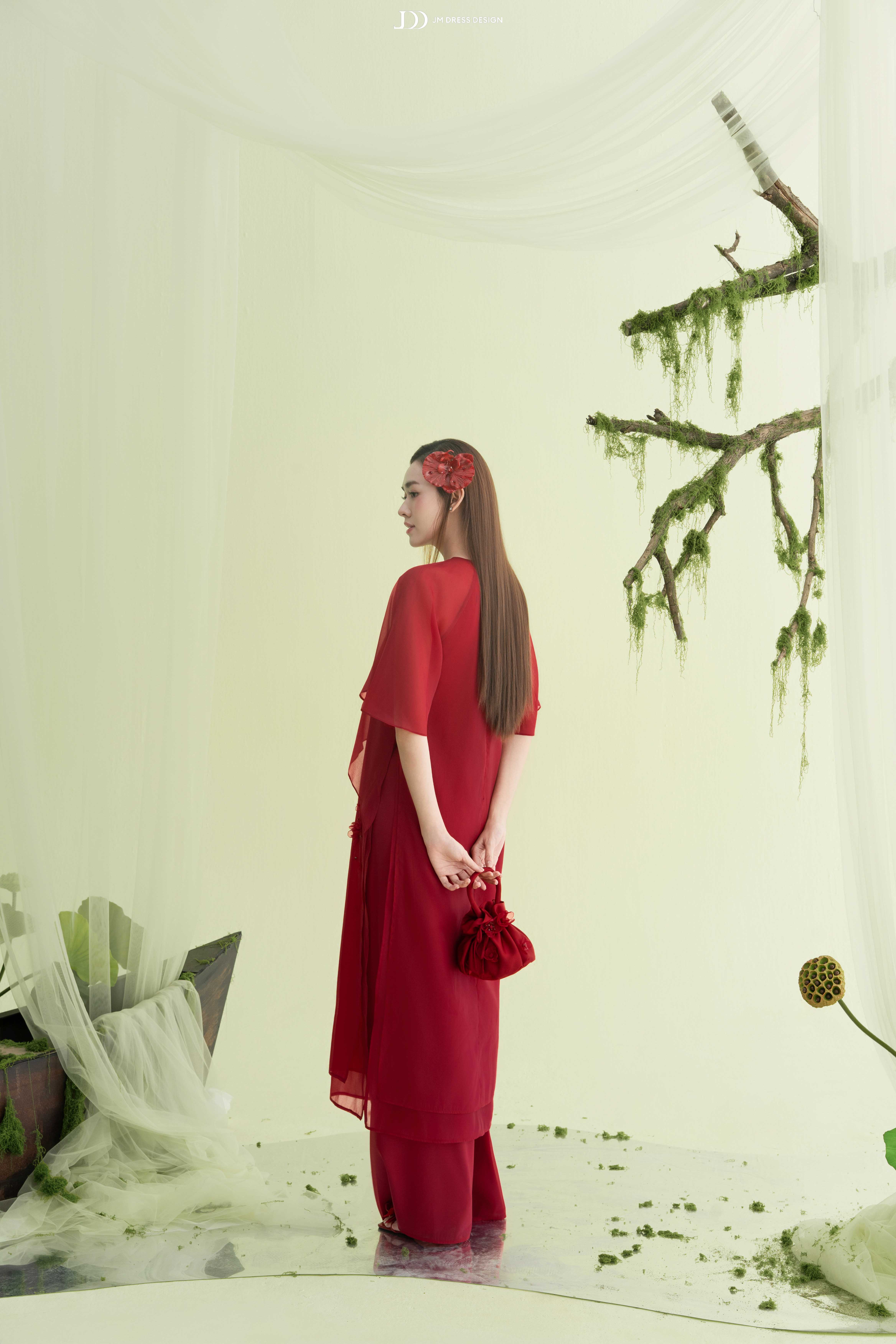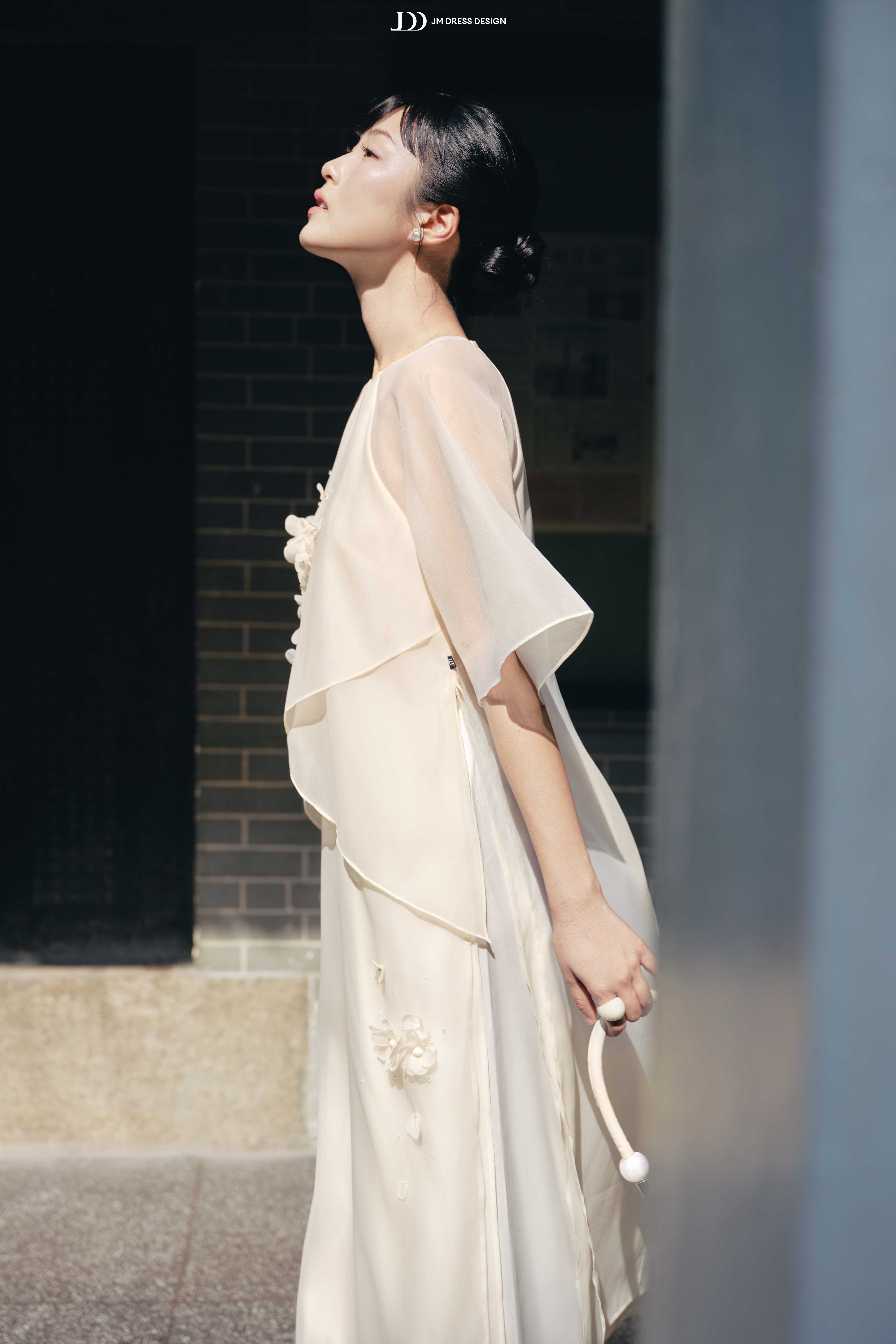 Áo được tạo nên từ tơ mỏng trong phối voan cao cấp, chất vải có độ rủ nhẹ, bắt sáng mềm, khiến tà áo như được phủ một lớp ánh mờ dịu, tôn lên đường nét người mặc mà vẫn kín đáo.