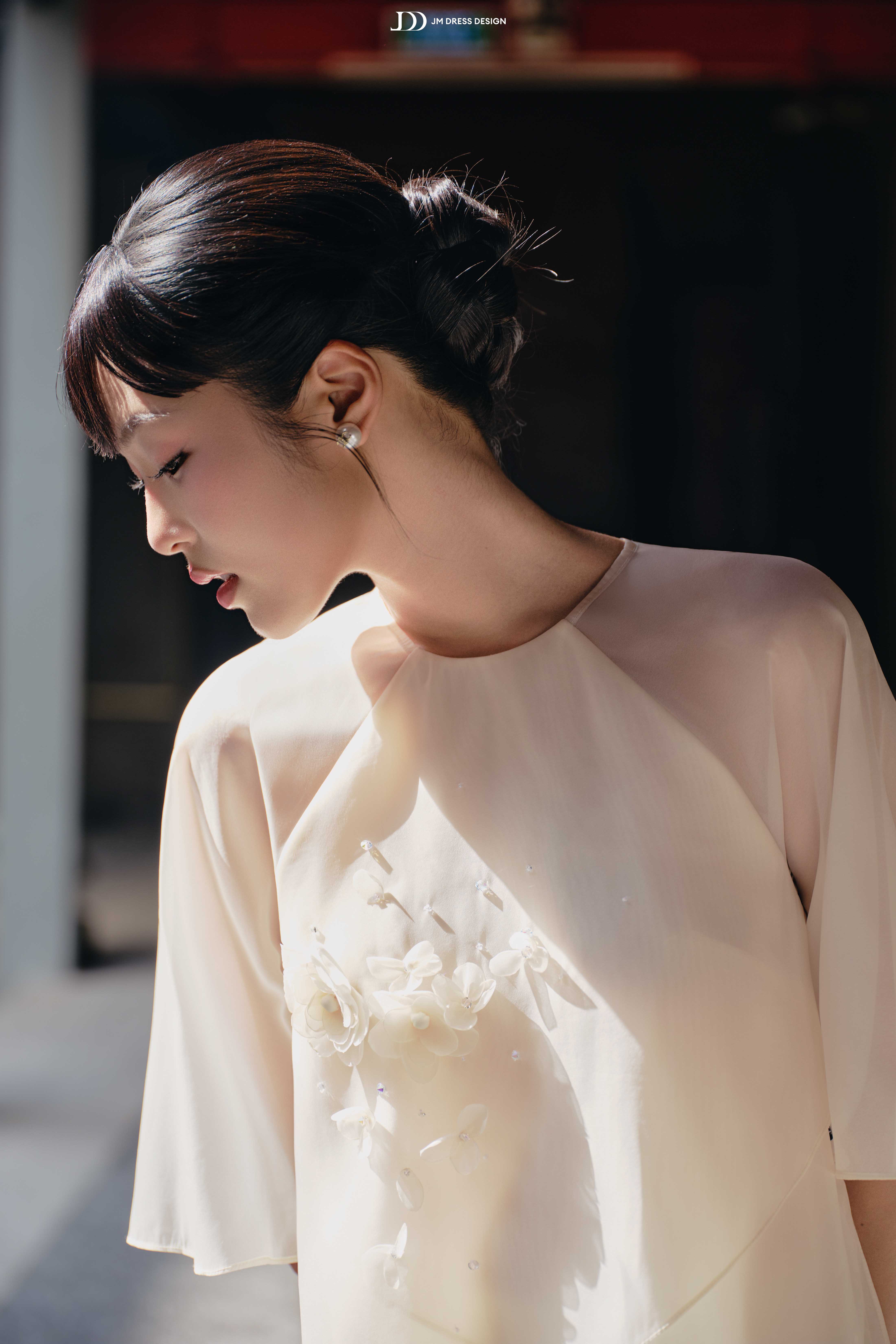 “Thanh Đan” được thiết kế theo phom ôm nhẹ phần thân trên, buông suông mềm về phía dưới, giúp dáng hình thanh thoát mà vẫn giữ nét đoan trang cổ điển.