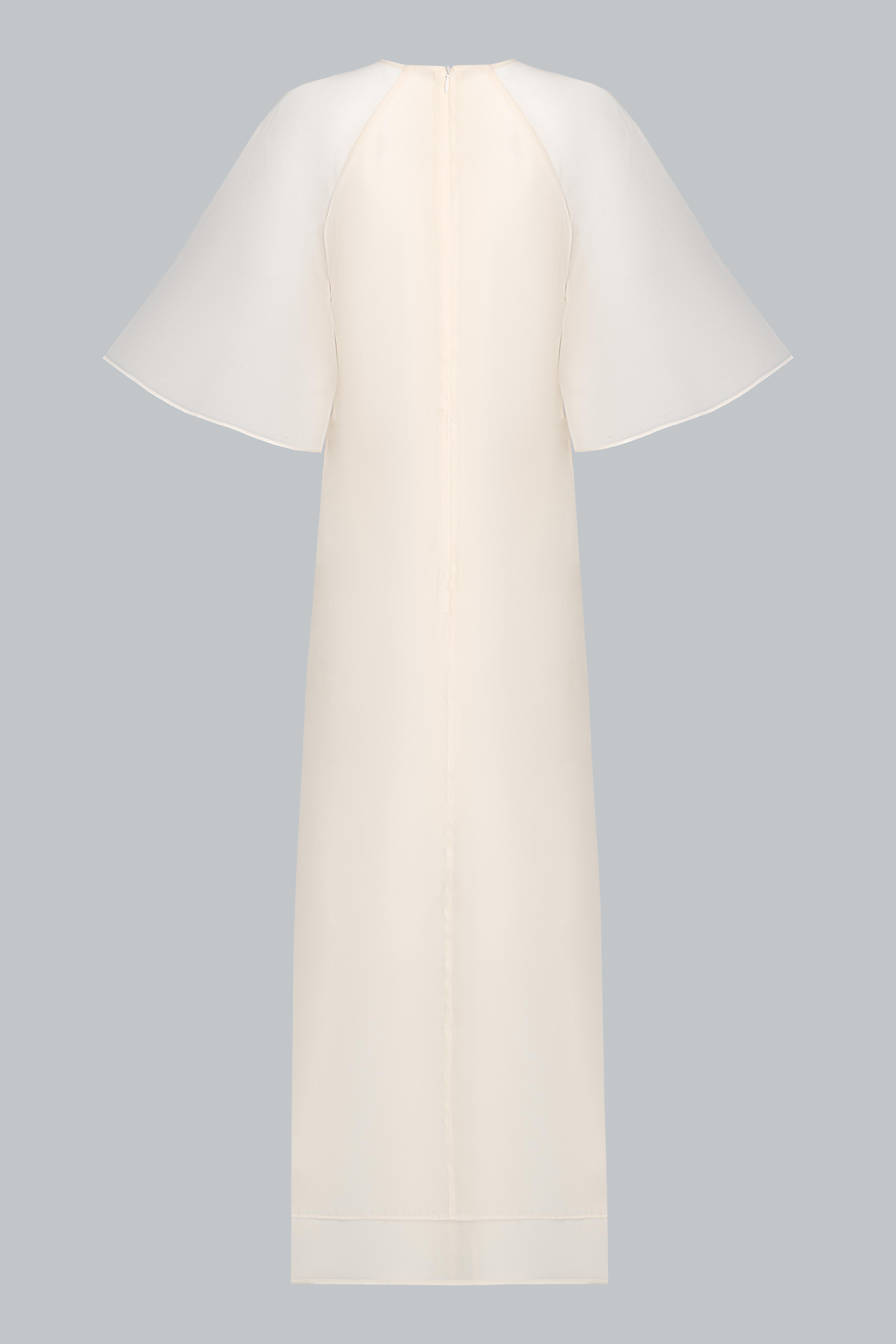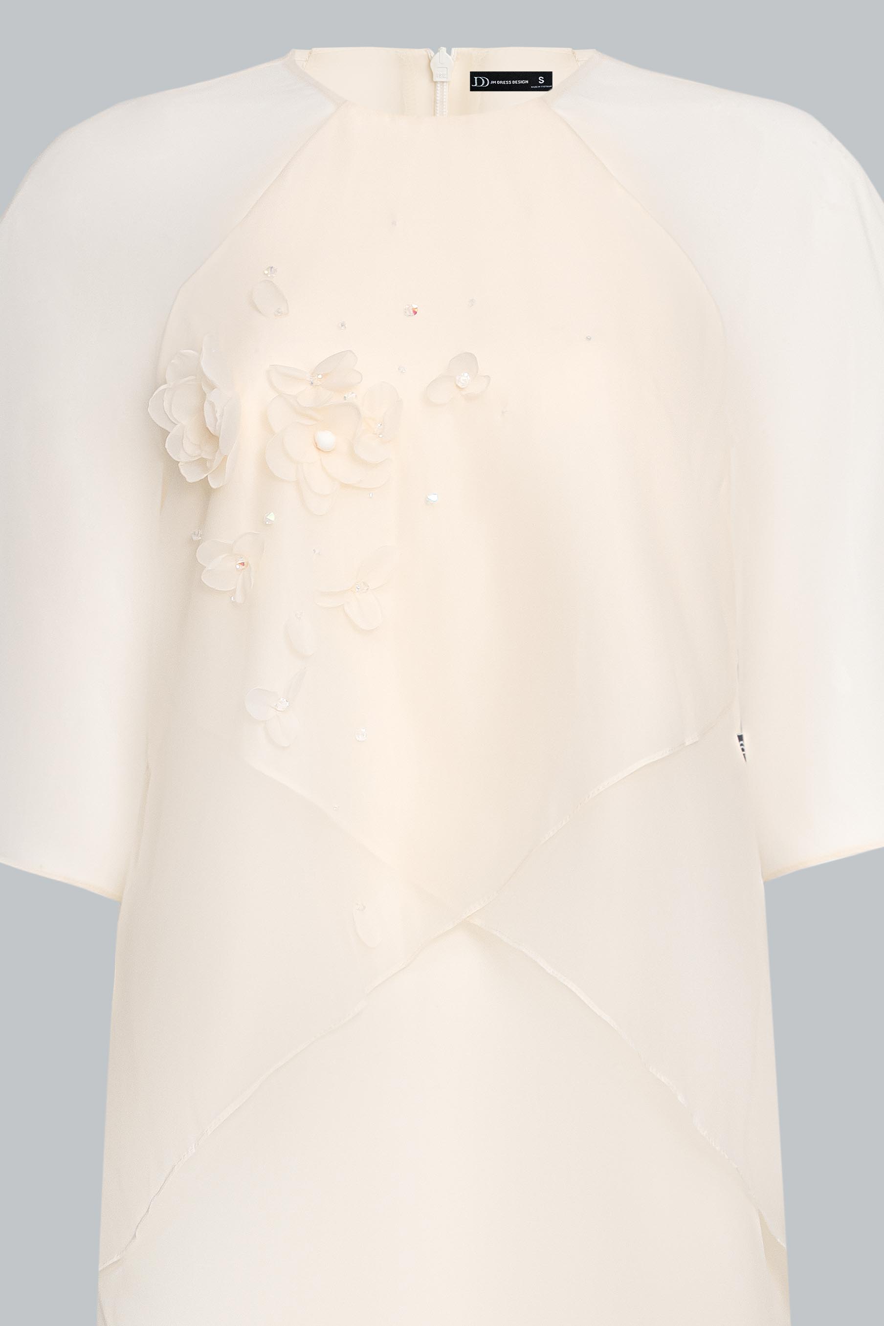 Điểm nhấn nằm ở phần thân trên xử lý xếp tầng voan trong, tạo hiệu ứng thị giác tinh tế – vừa mang hơi thở nghệ thuật, vừa gợi sự dịu mềm trong từng chuyển động.