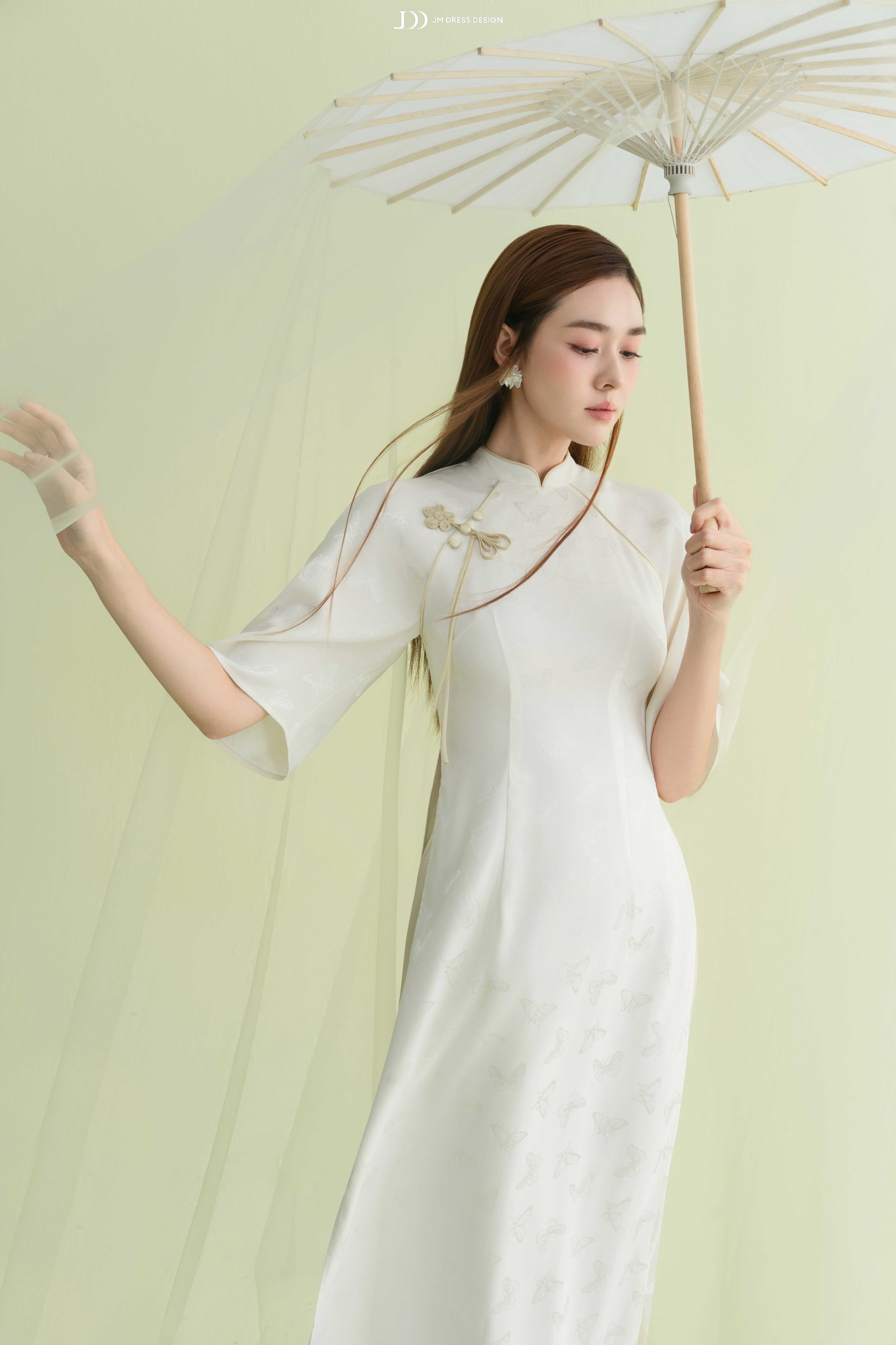 Chất vải bắt sáng khéo léo khiến tà áo thay đổi sắc độ tùy theo ánh nhìn – khi thì trong trẻo, khi lại ấm áp, như phản chiếu từng cung bậc cảm xúc của người phụ nữ.