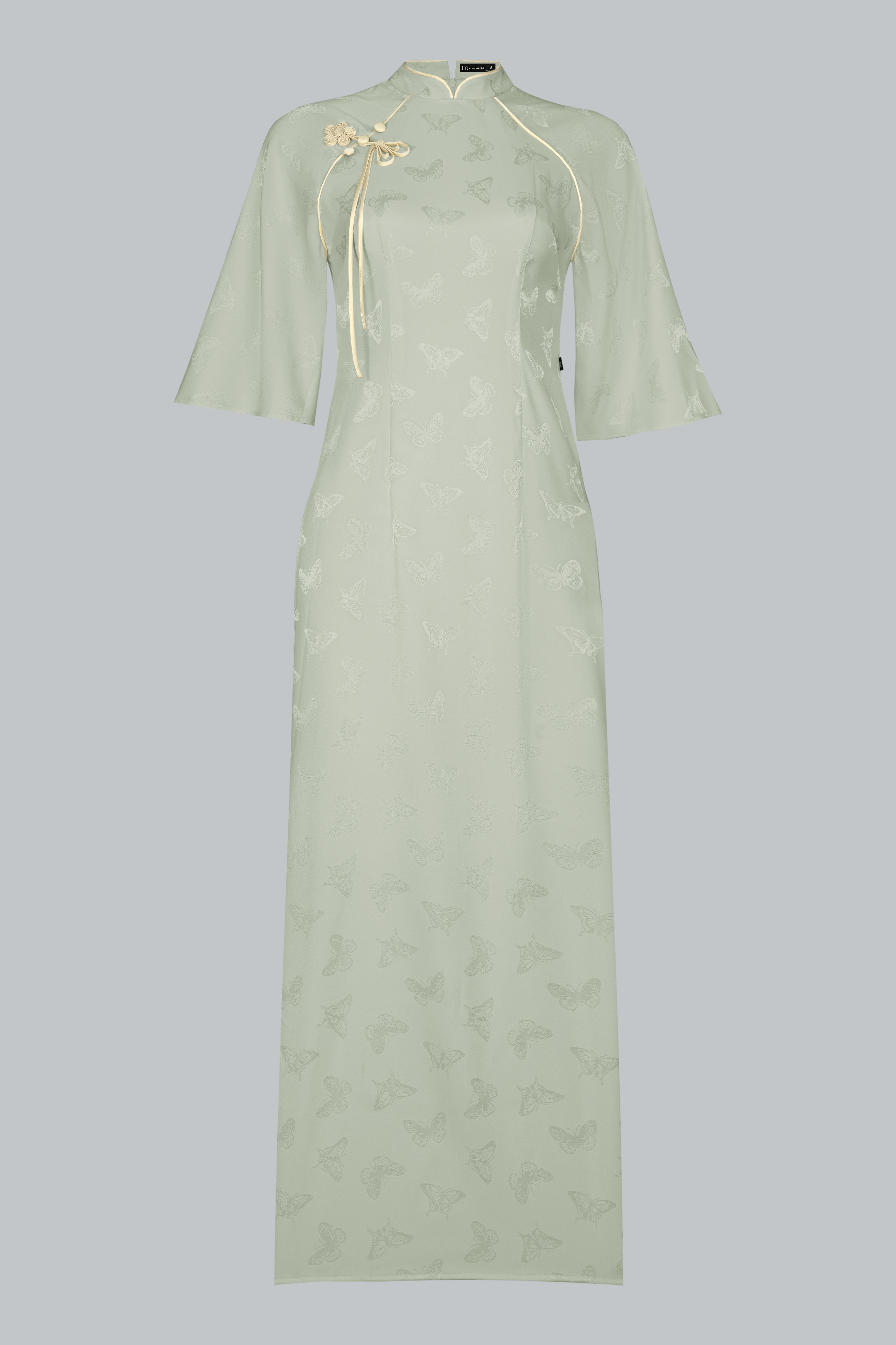 “Thanh Yên” được thiết kế theo phom suông nhẹ, tà dài chạm gần mắt cá, giữ nguyên dáng áo truyền thống nhưng tinh giản để phù hợp với nhịp sống hiện đại.