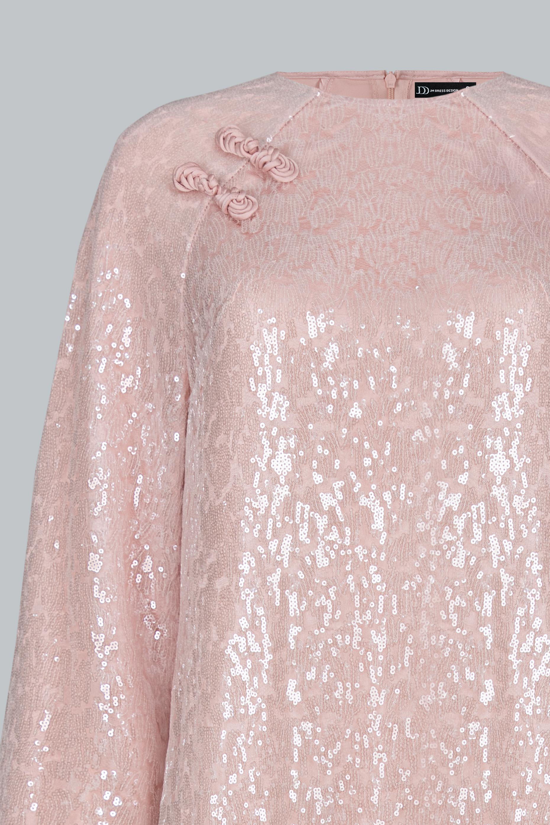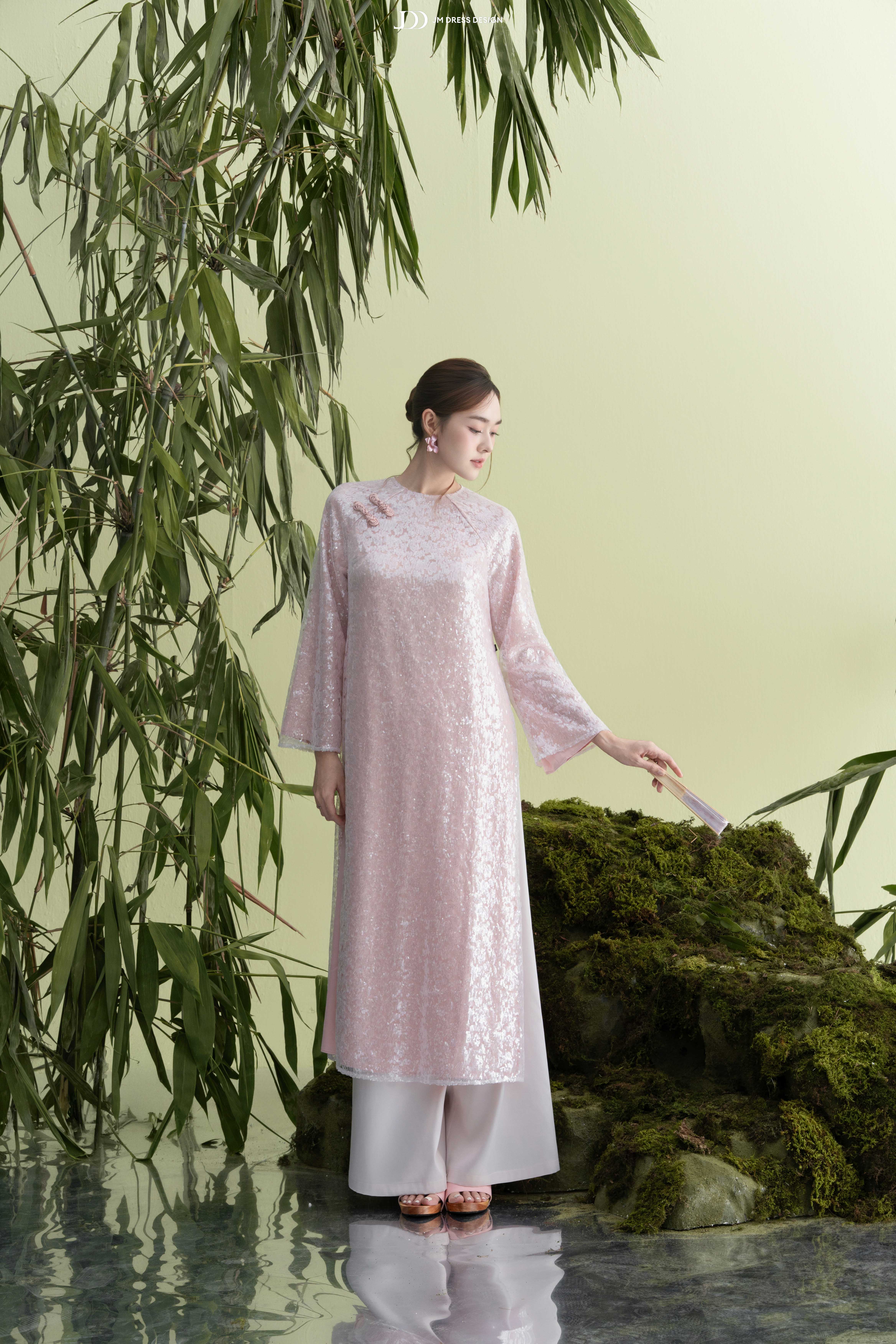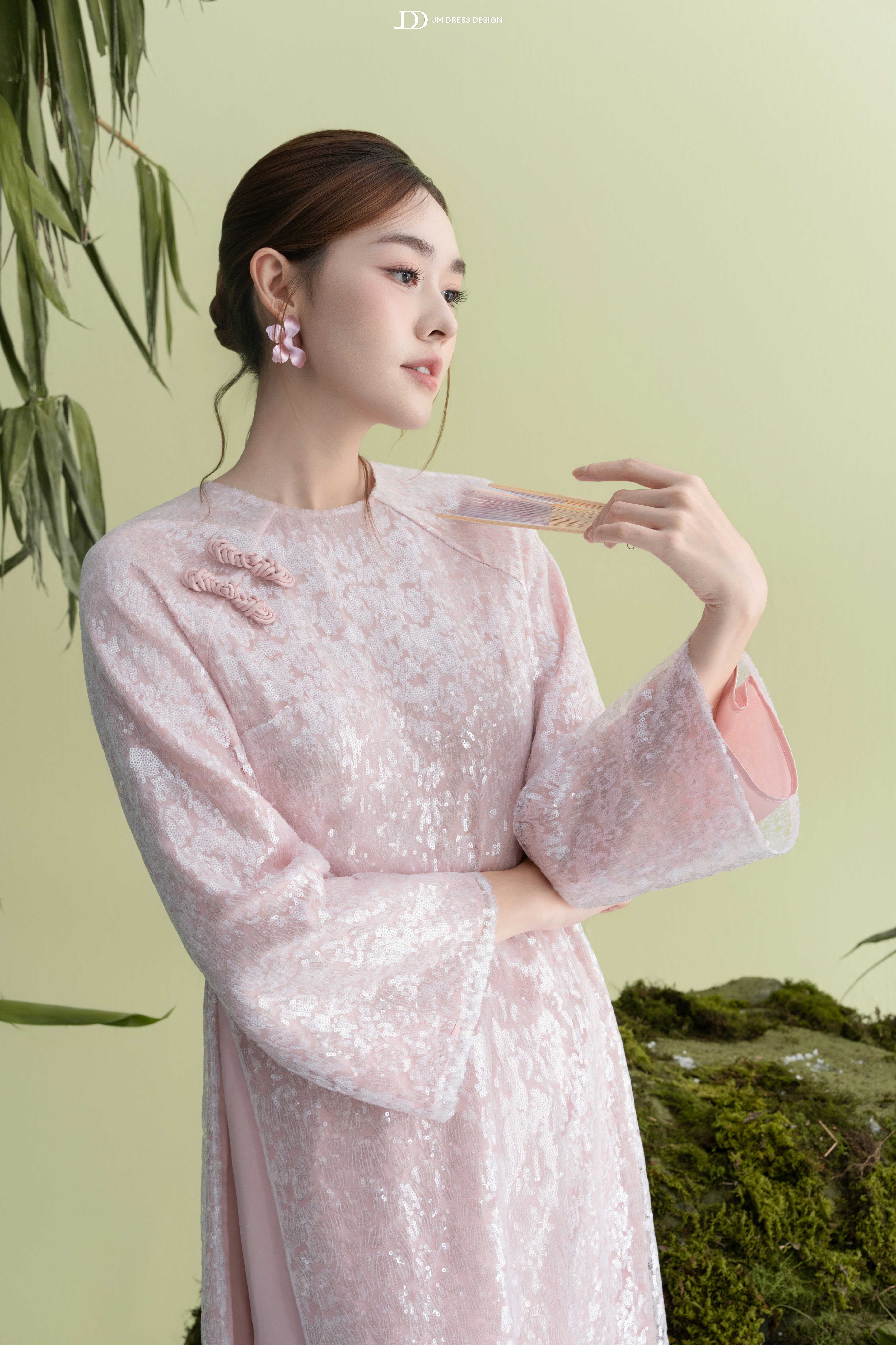Áo sử dụng ren sequin ánh hồng pastel trên nền poly cao cấp, tạo hiệu ứng bắt sáng tinh tế.
