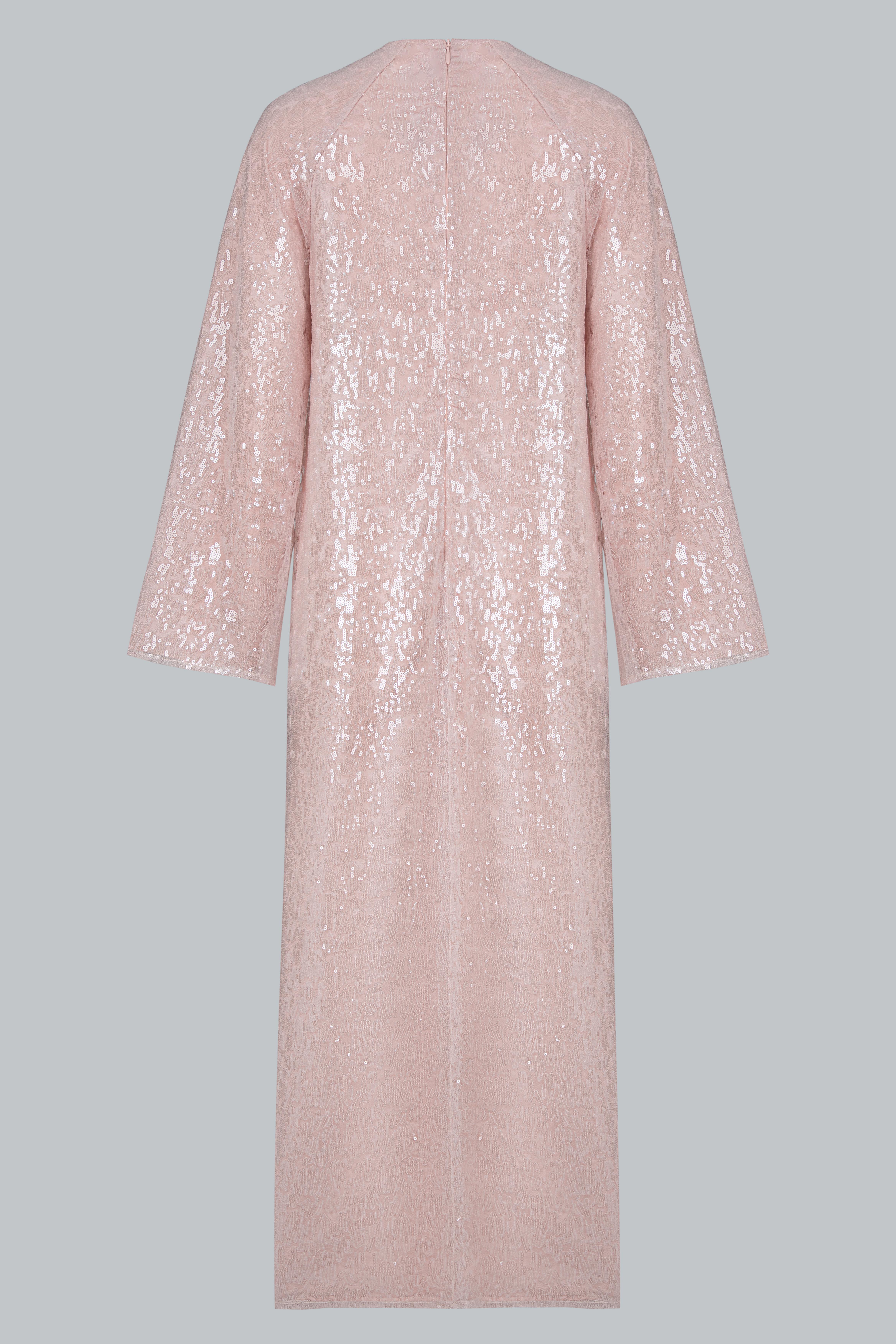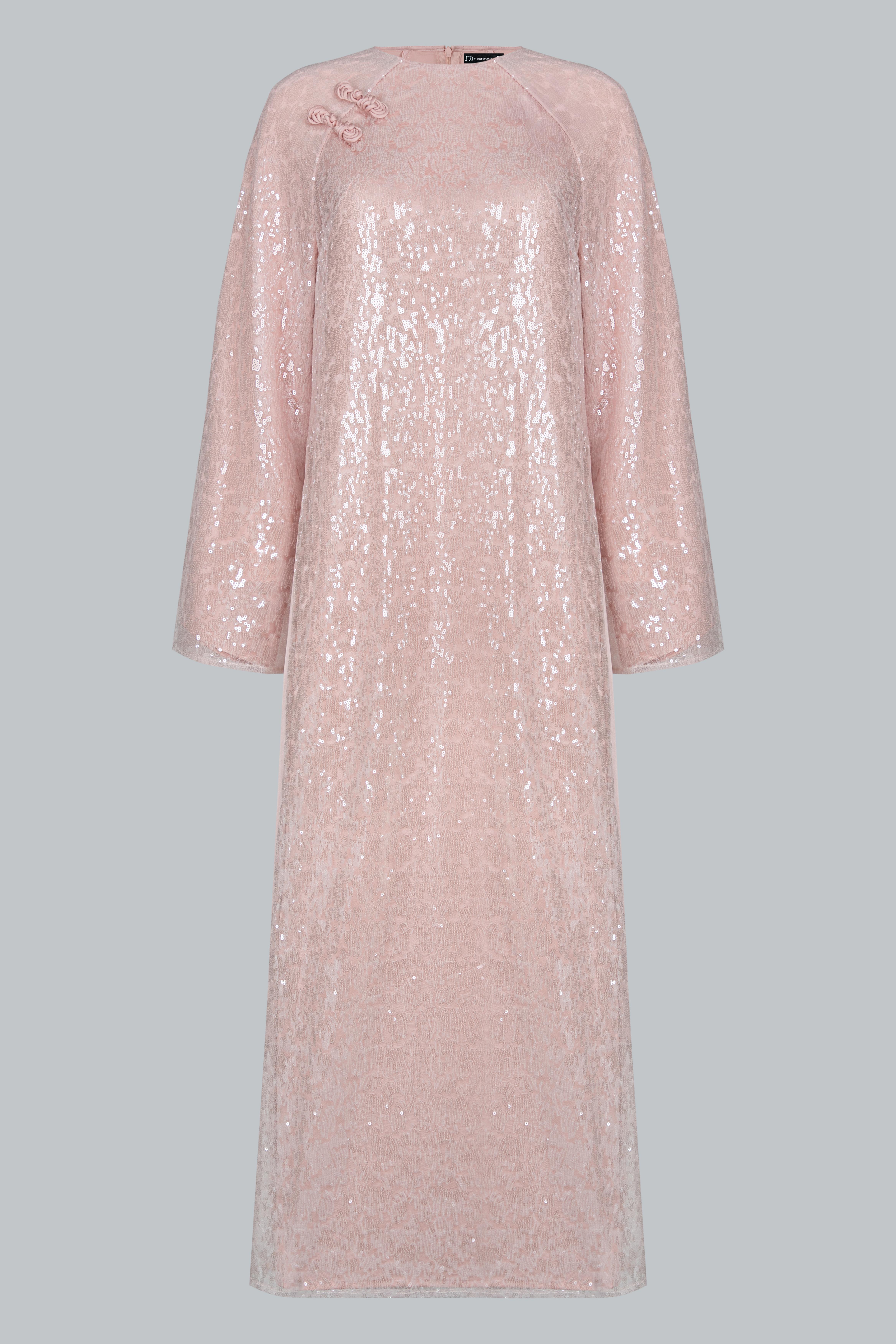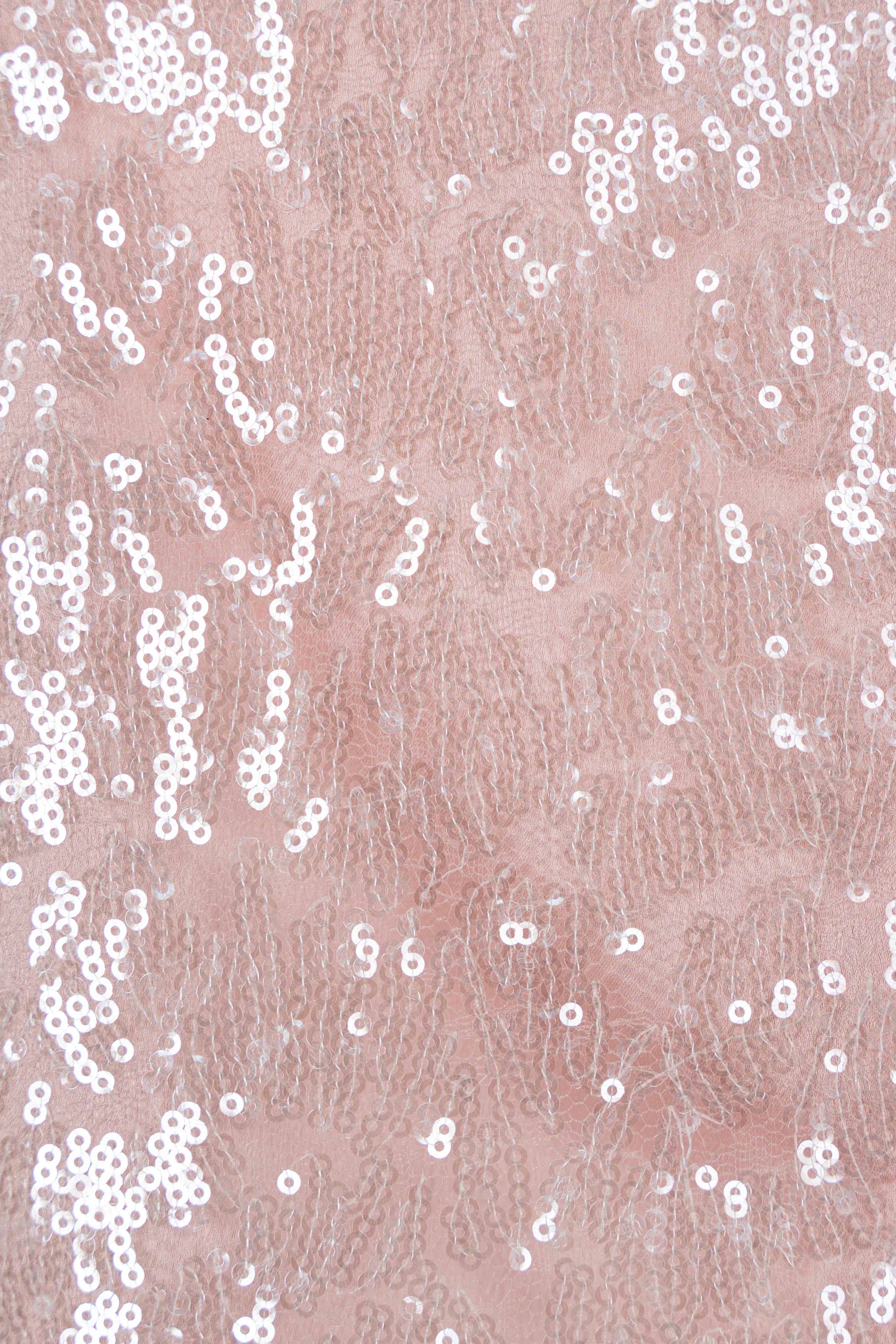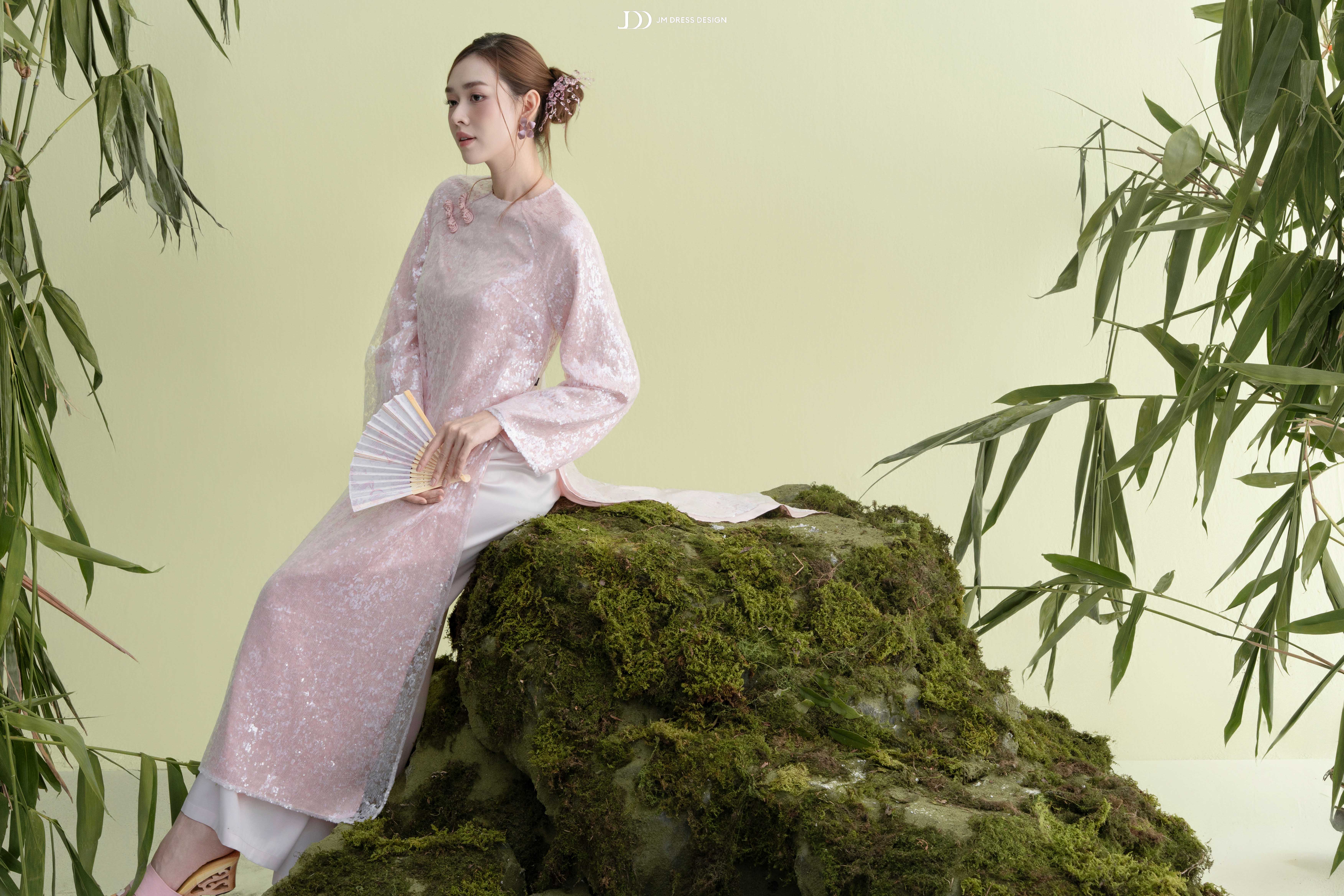 Áo sử dụng ren sequin ánh hồng pastel trên nền poly cao cấp, tạo hiệu ứng bắt sáng tinh tế.