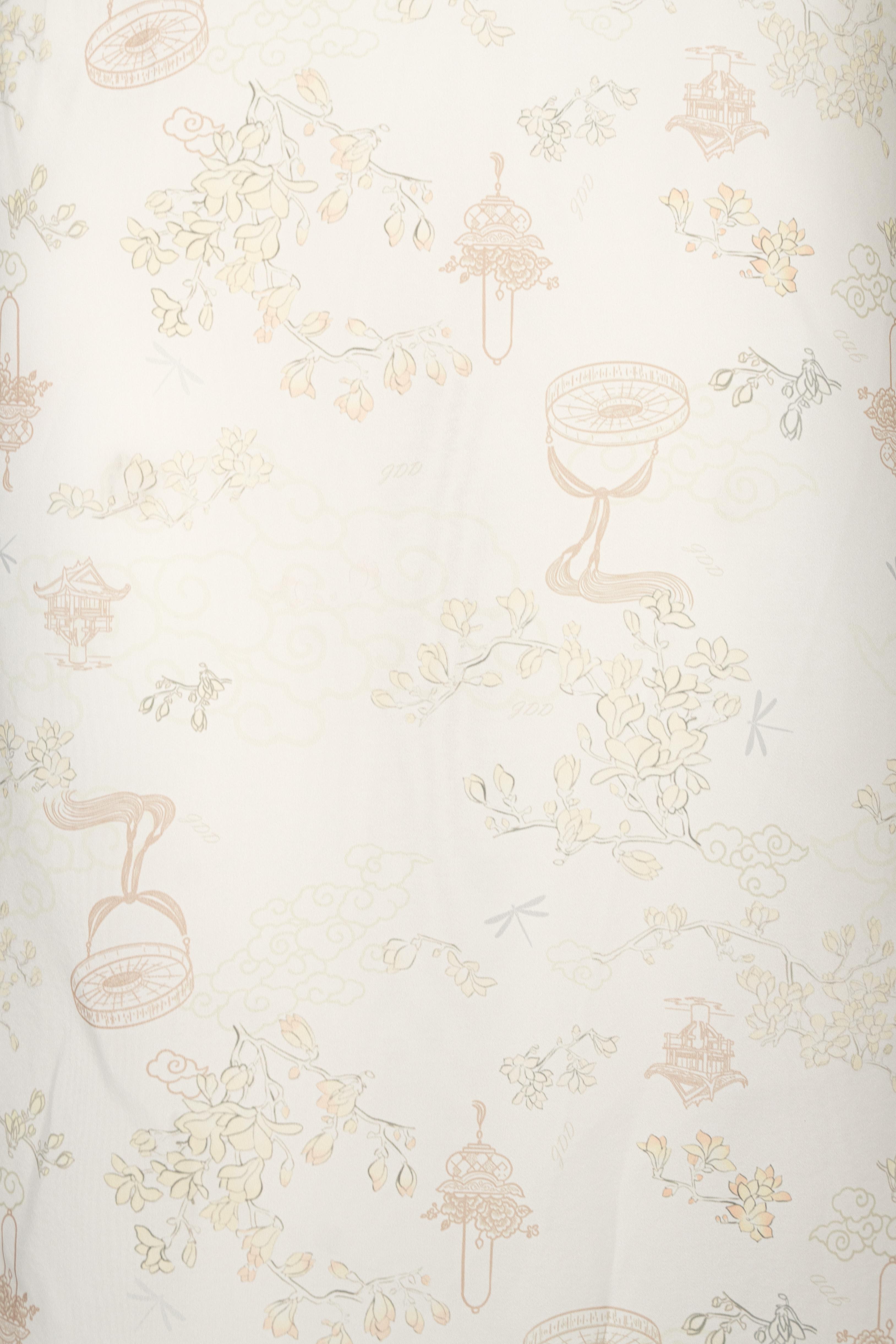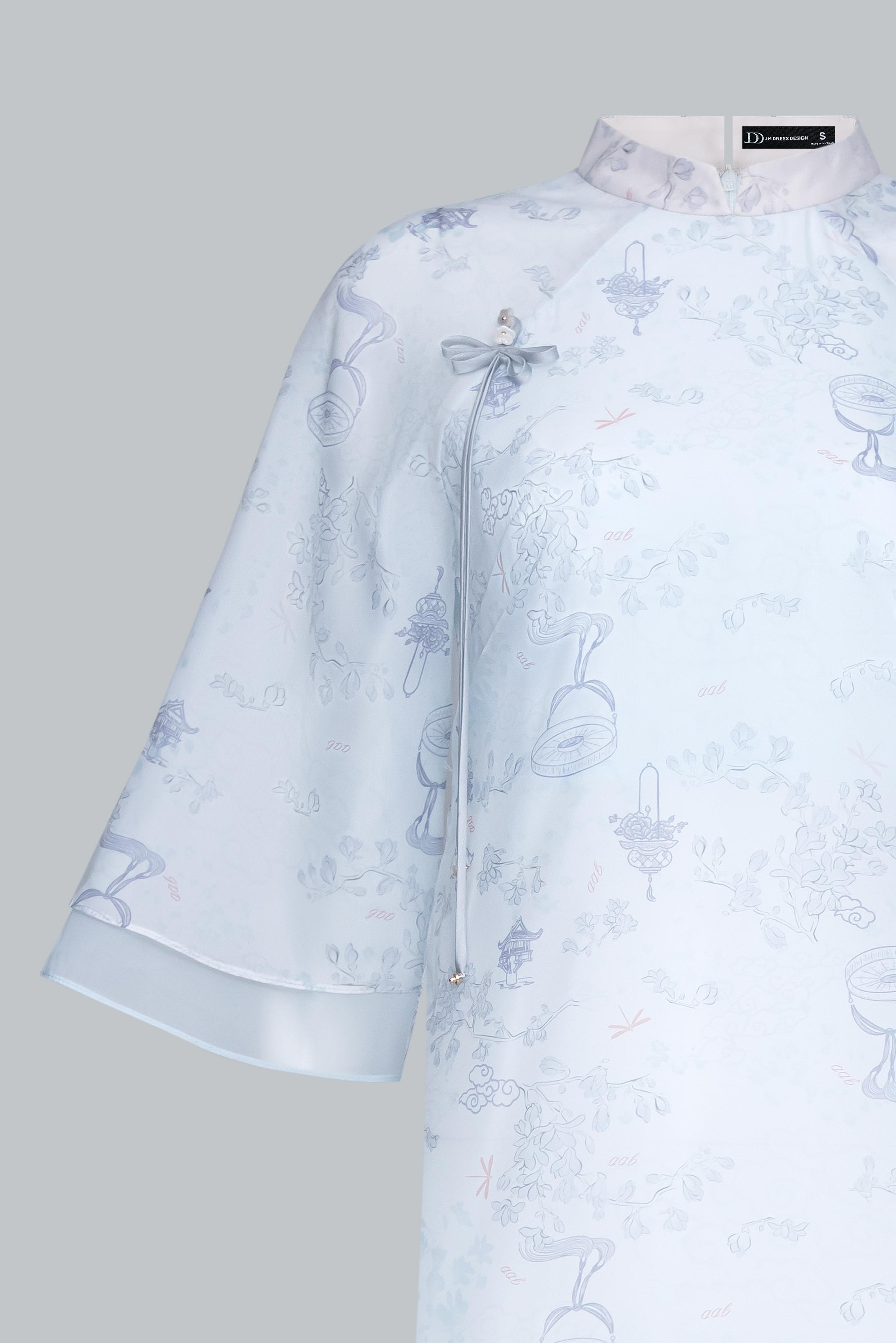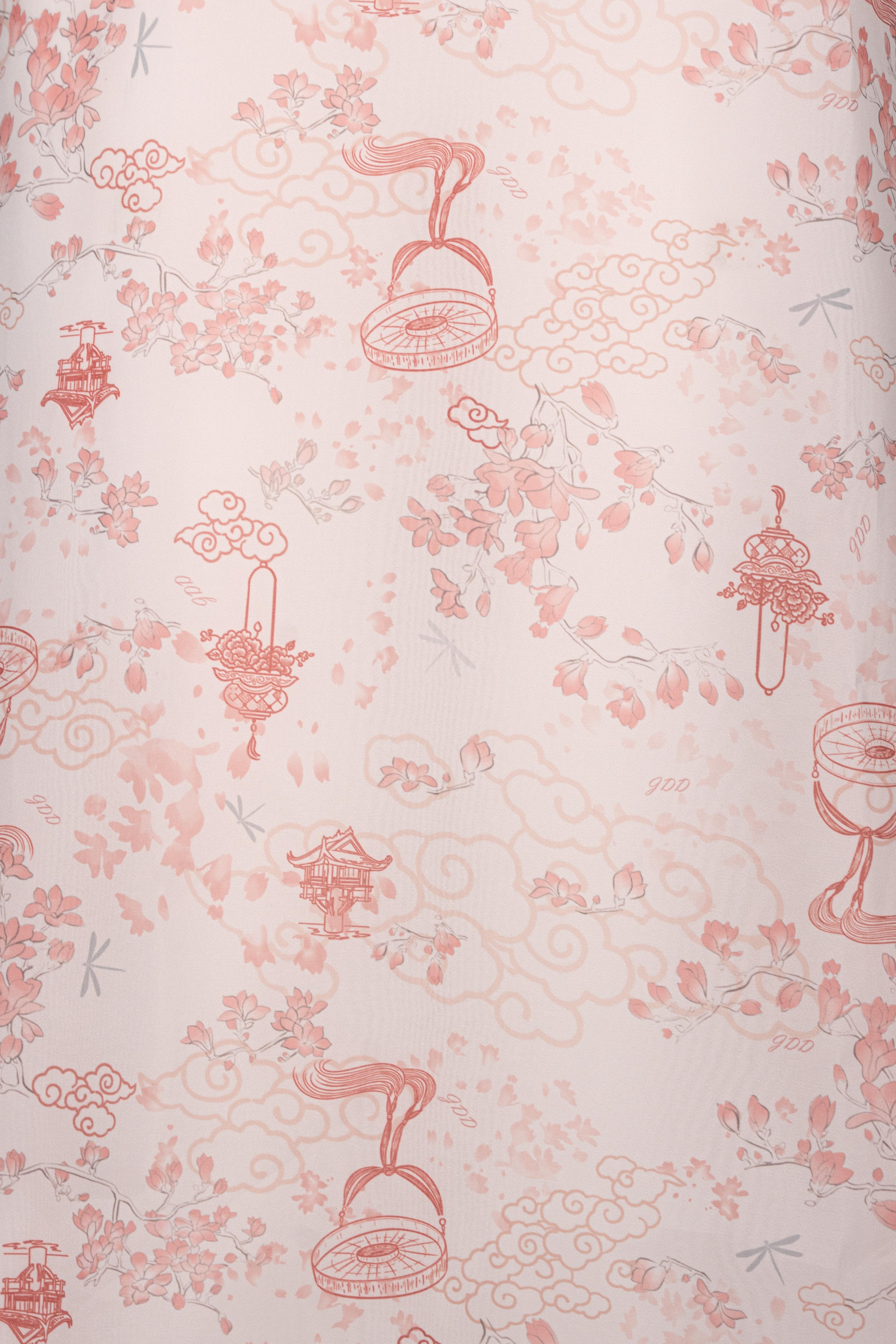 Họa tiết hoa in mờ trên nền tơ là điểm nhấn tinh tế, gợi hình ảnh cơn mưa rải nhẹ trên cánh đồng – vừa thực vừa mơ.