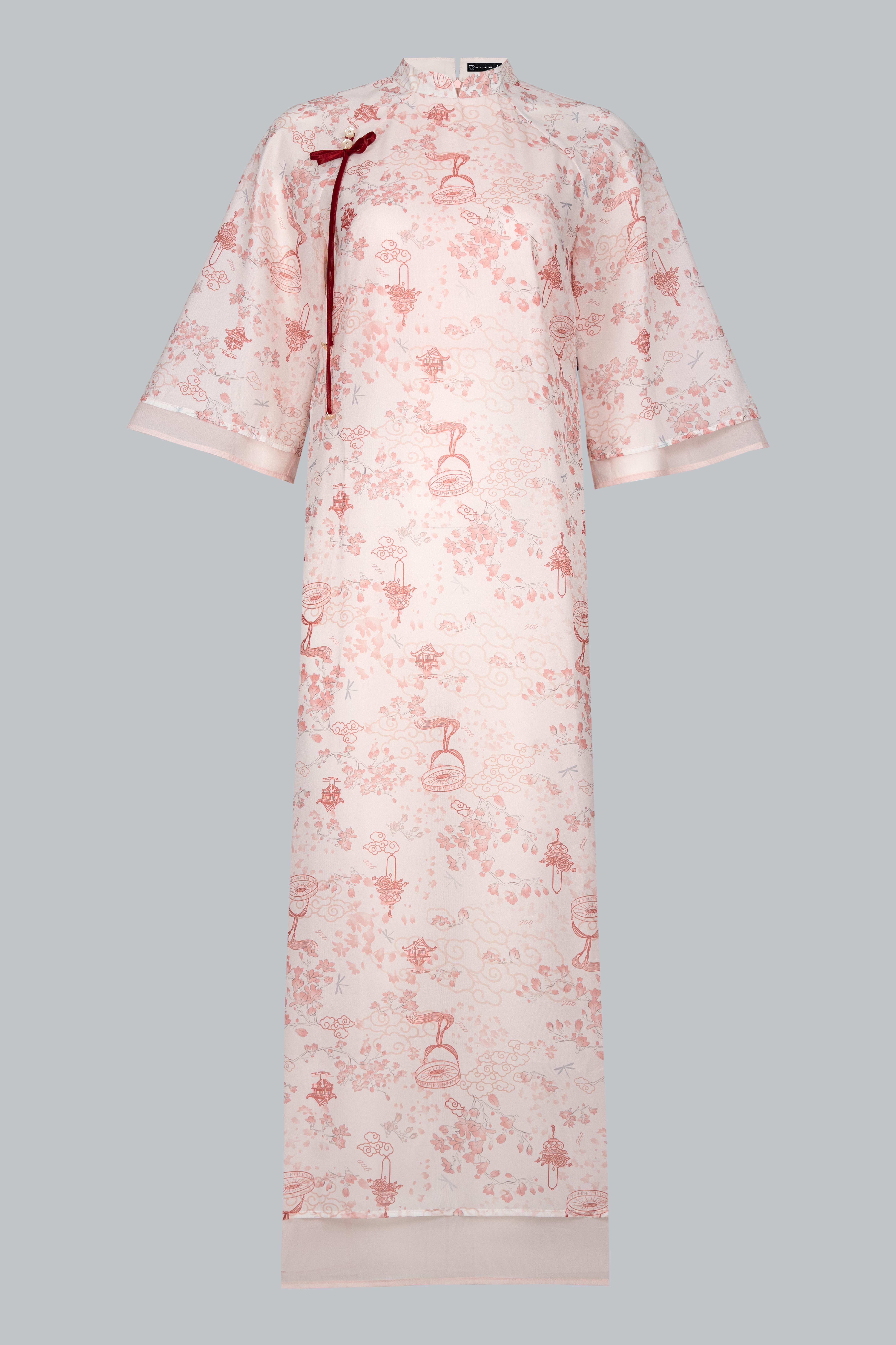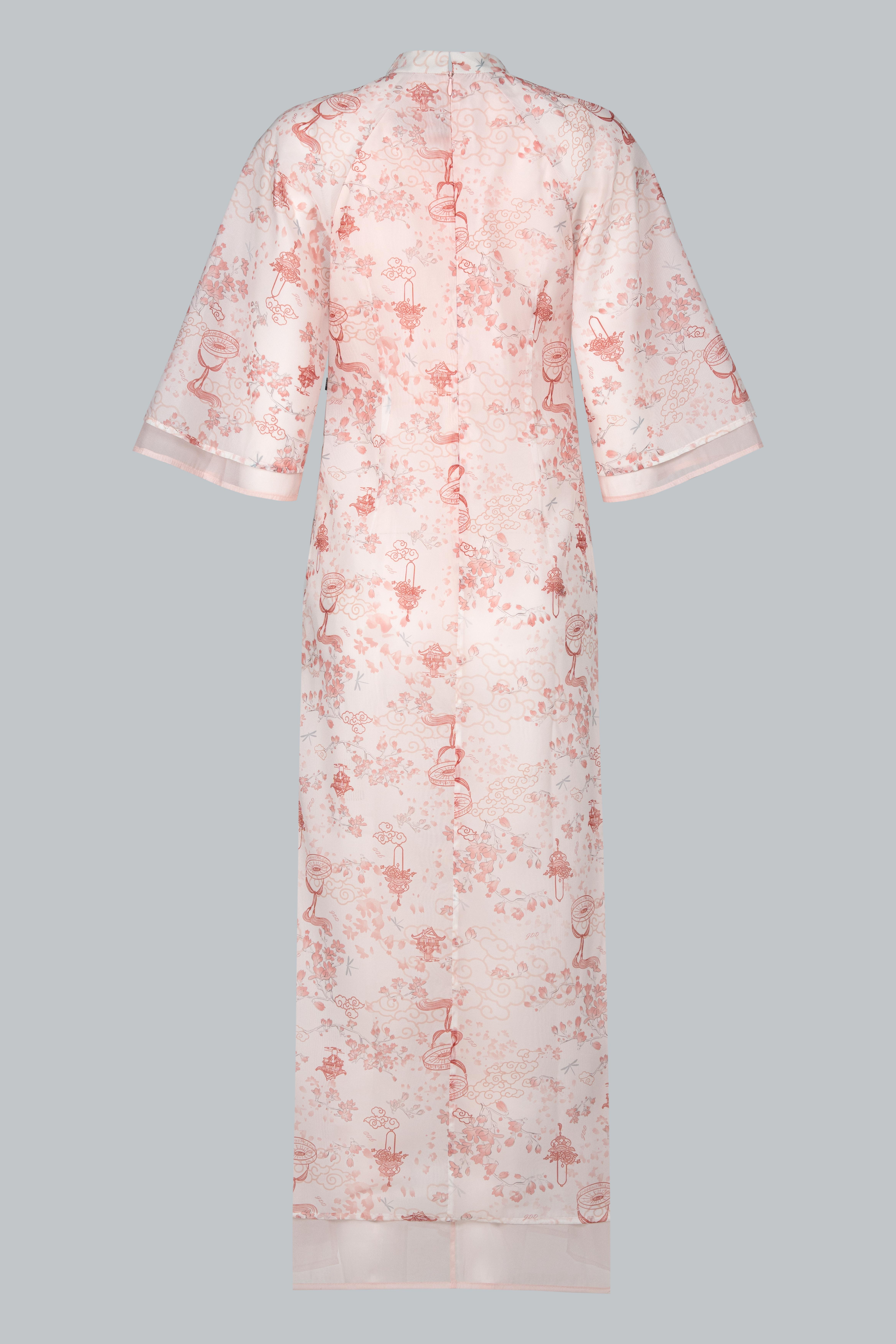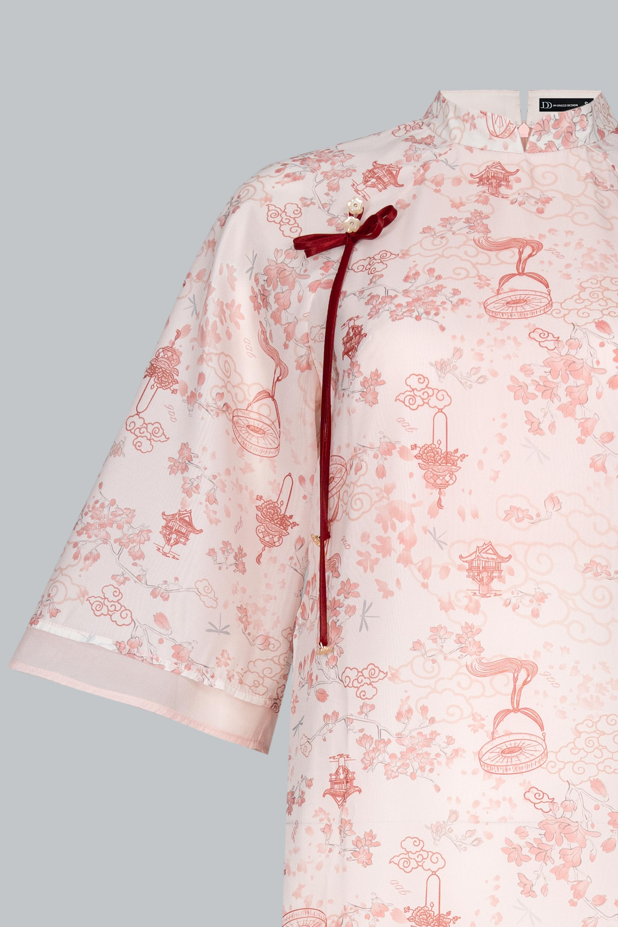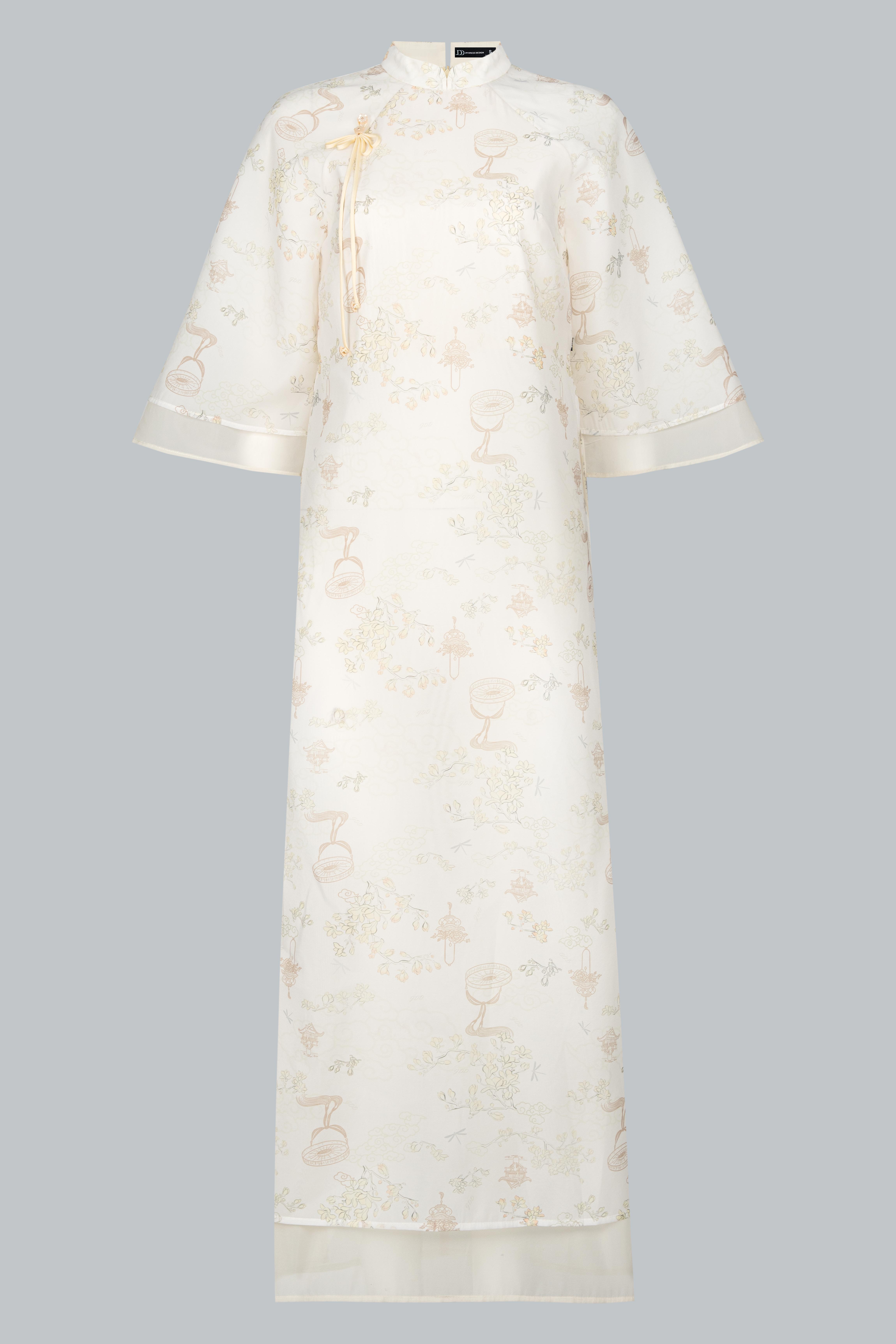 Họa tiết hoa in mờ trên nền tơ là điểm nhấn tinh tế, gợi hình ảnh cơn mưa rải nhẹ trên cánh đồng – vừa thực vừa mơ.