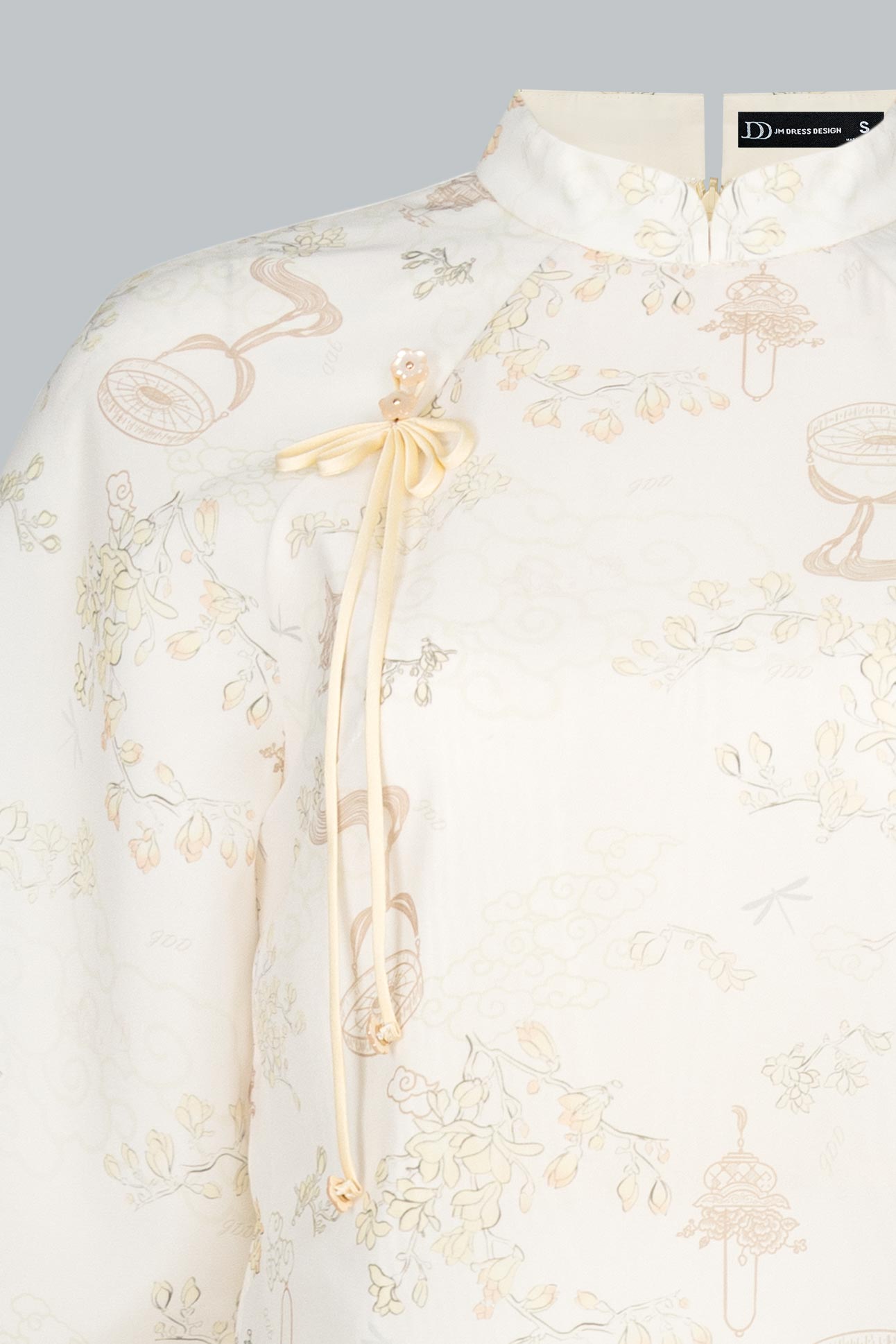 Áo được làm từ vải tơ thành phần chủ yếu poly cao cấp in họa tiết hoa chìm độc quyền, sắc be ánh vàng nâu phản chiếu ánh sáng tự nhiên theo từng chuyển động.