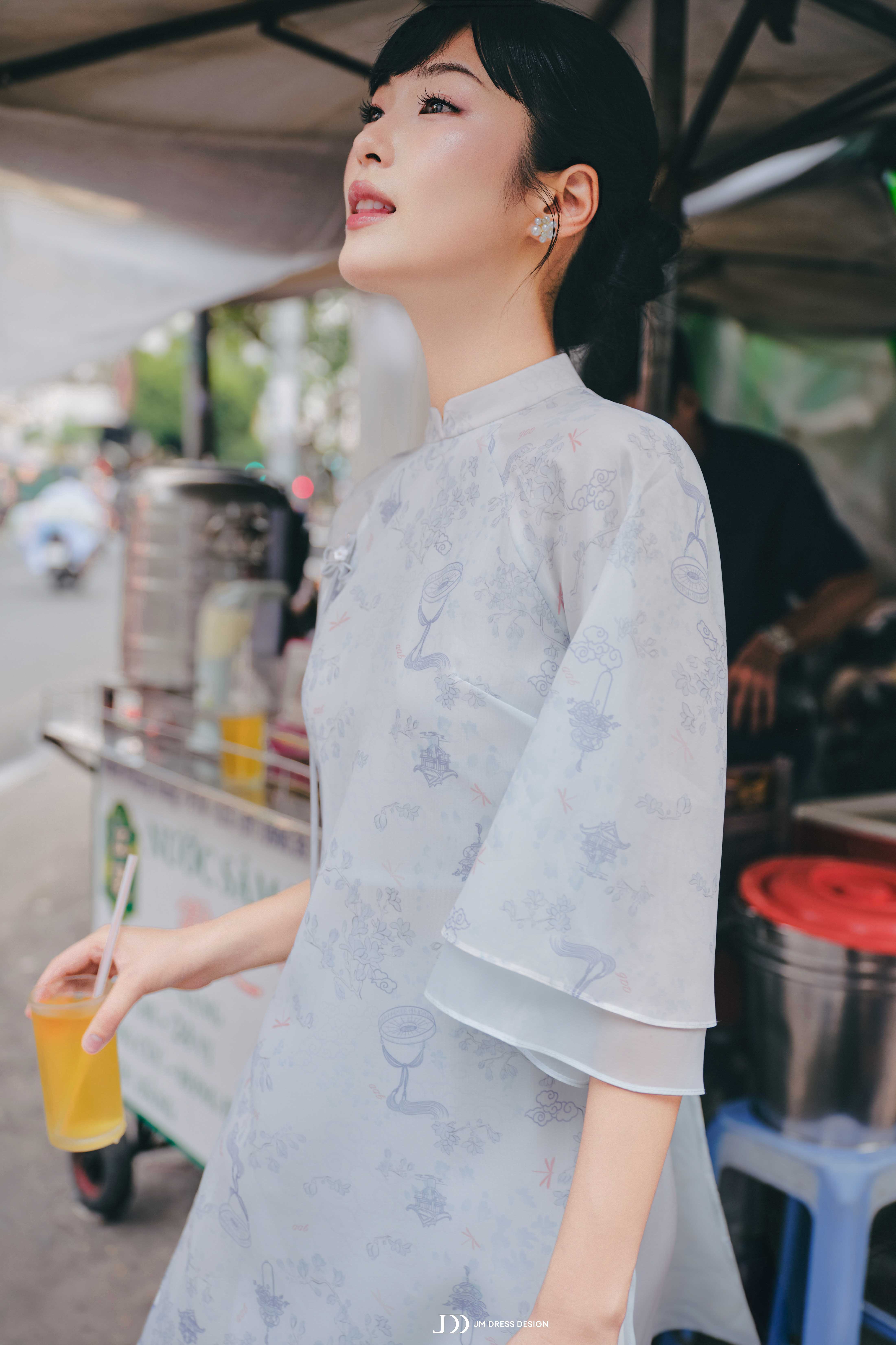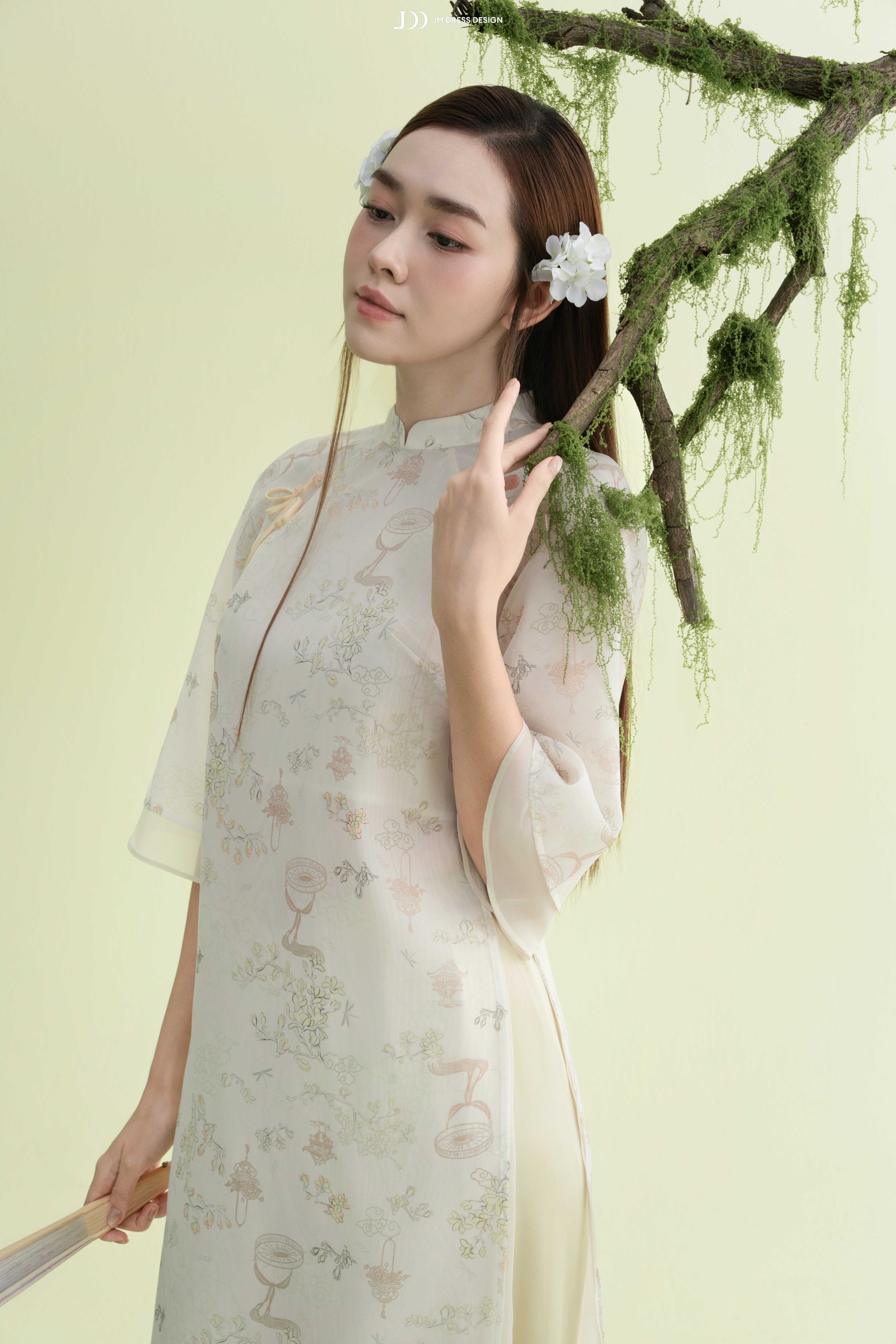 Một đôi khuyên tai nhỏ, tóc búi gọn hoặc xõa tự nhiên là đủ để tôn lên nét an nhiên của người mặc.