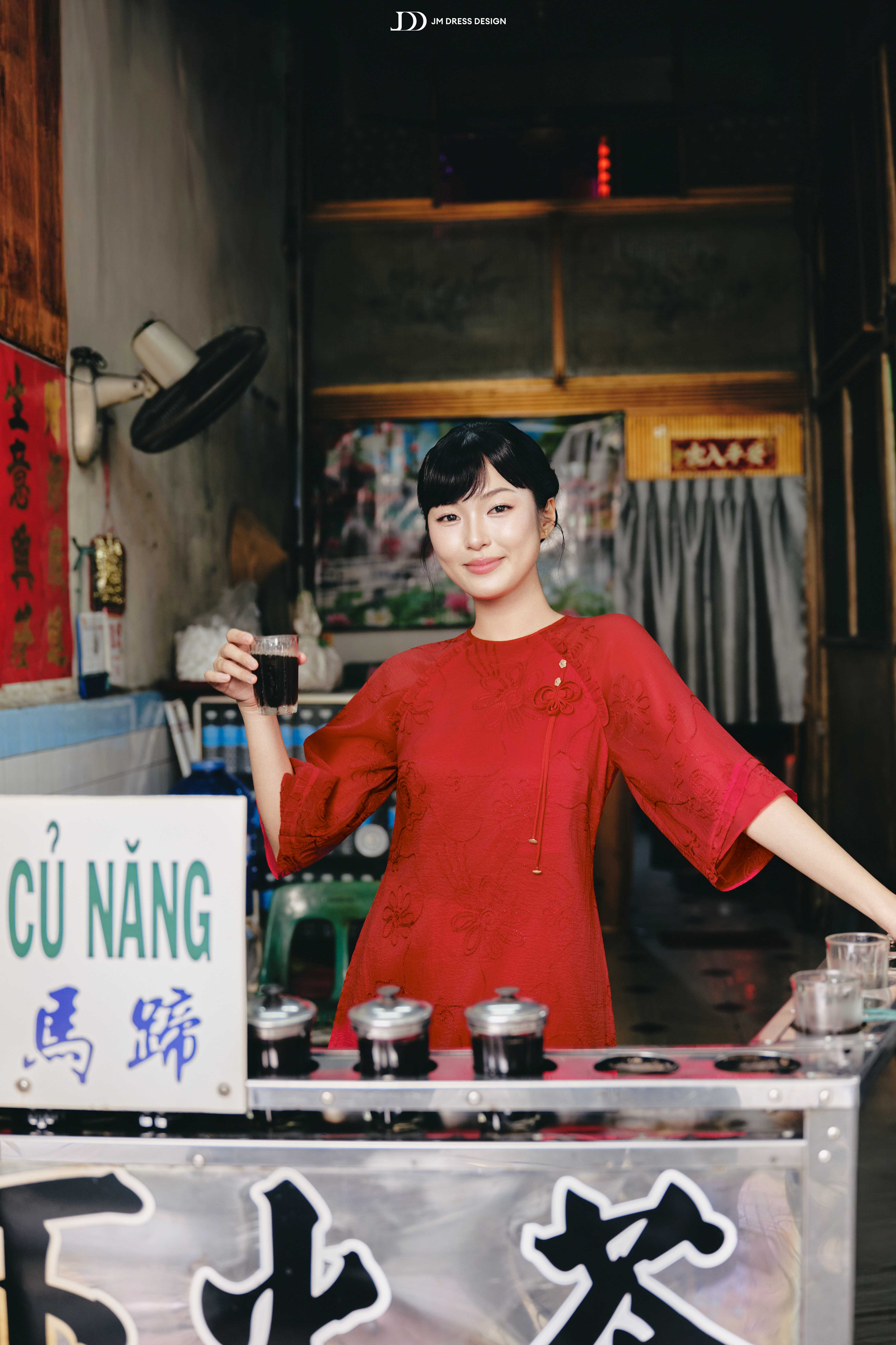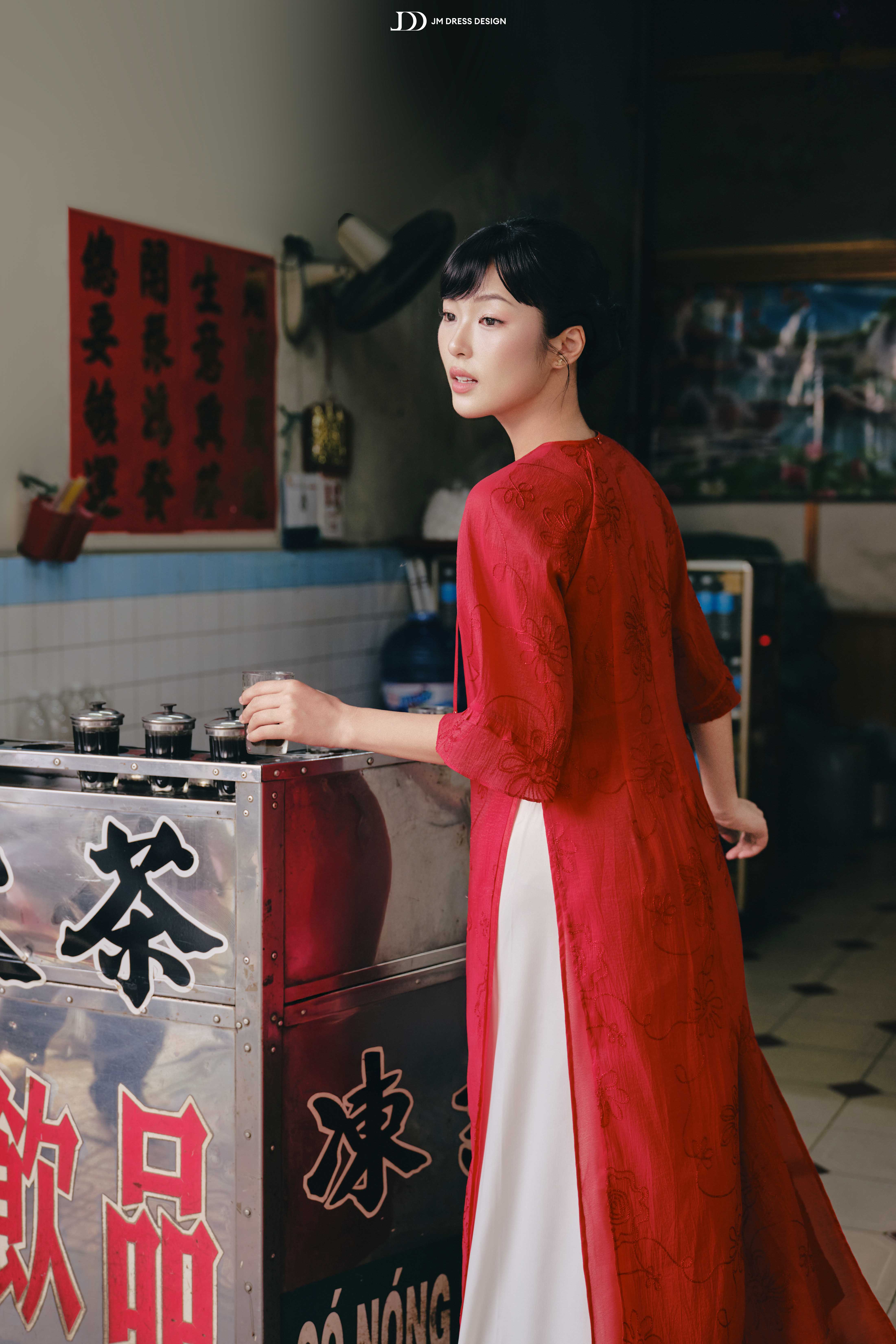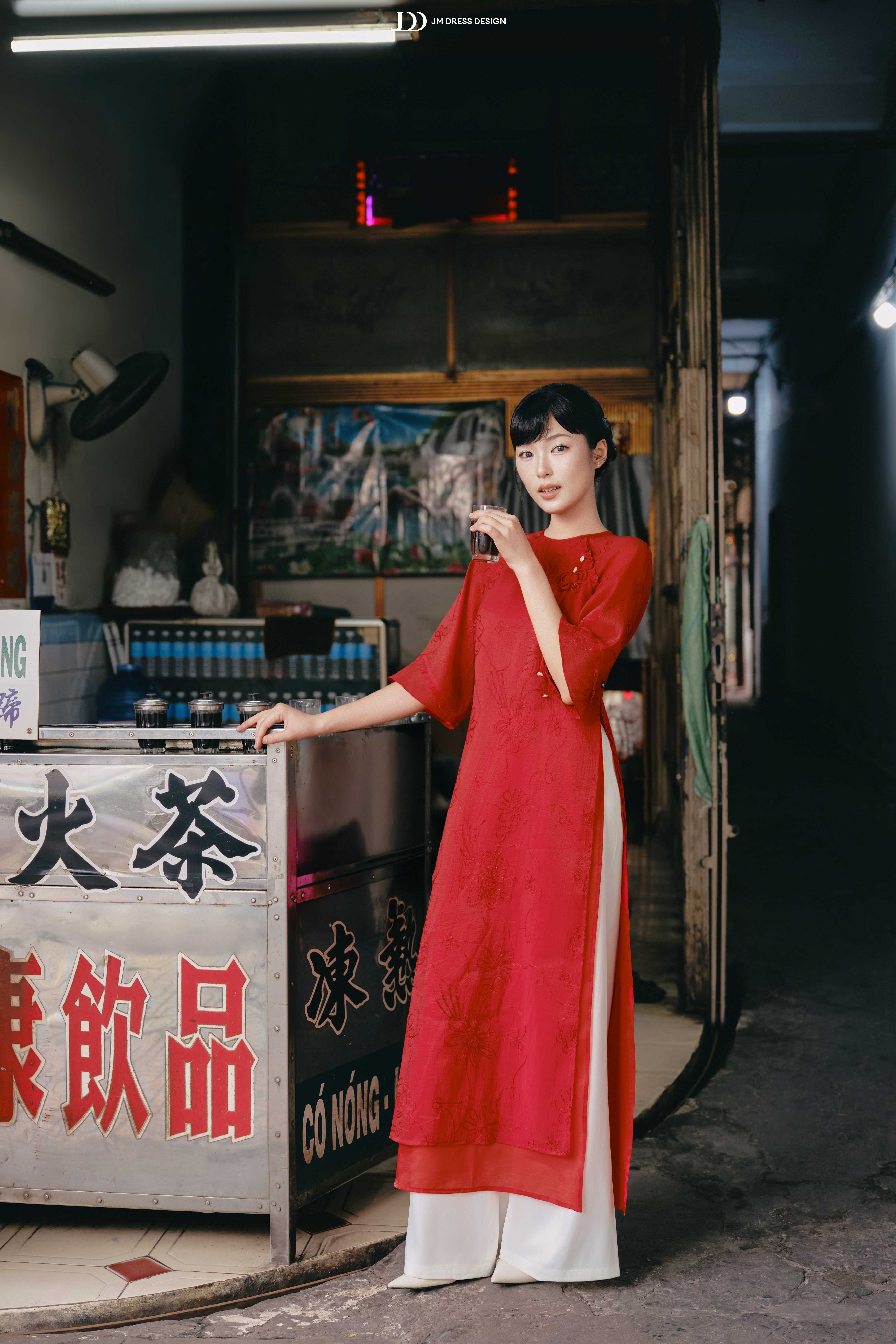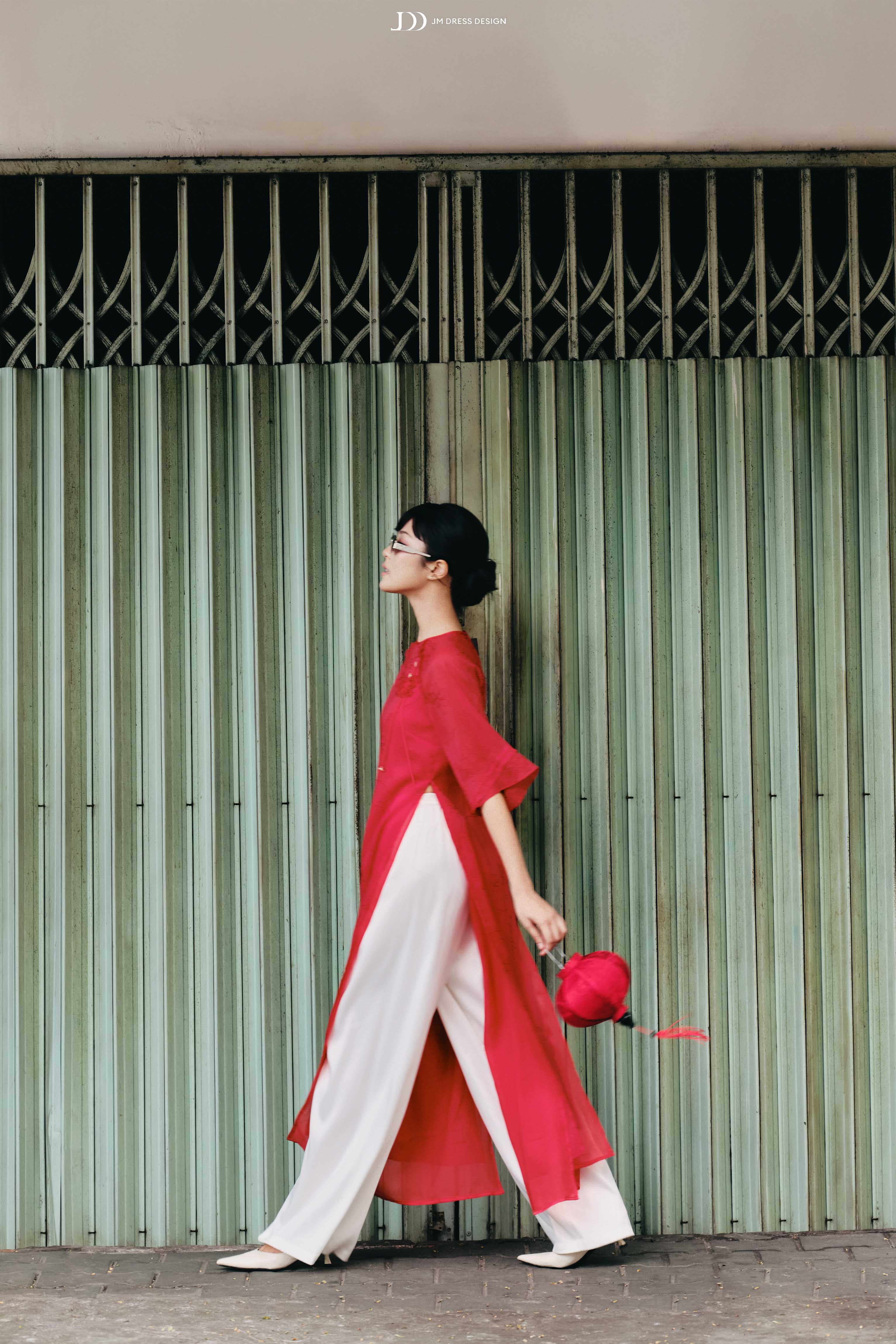 Phom ôm nhẹ phần thân trên, tà áo buông dài gần chạm mắt cá, giúp dáng hình thon gọn mà vẫn giữ được độ mềm mại đặc trưng.