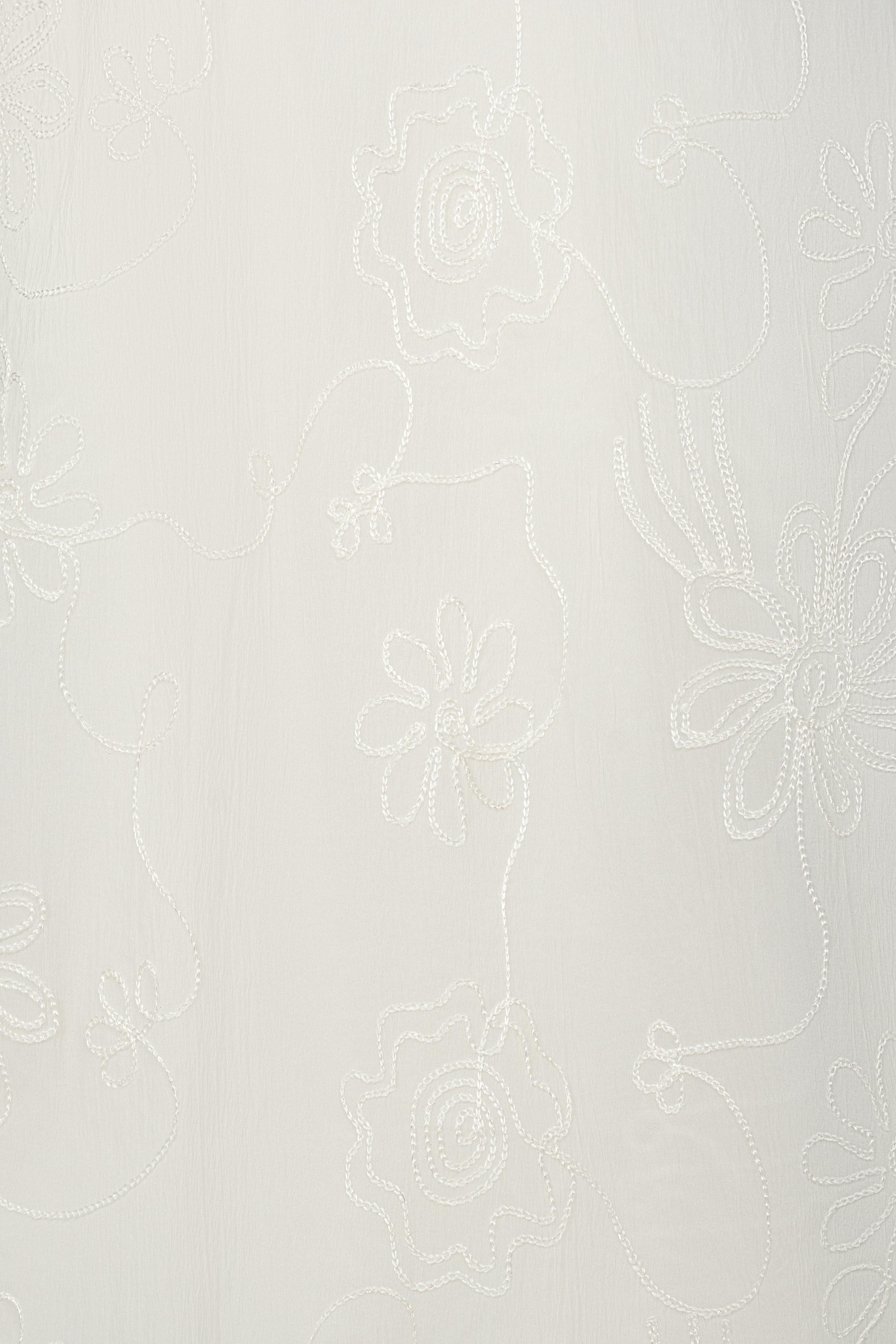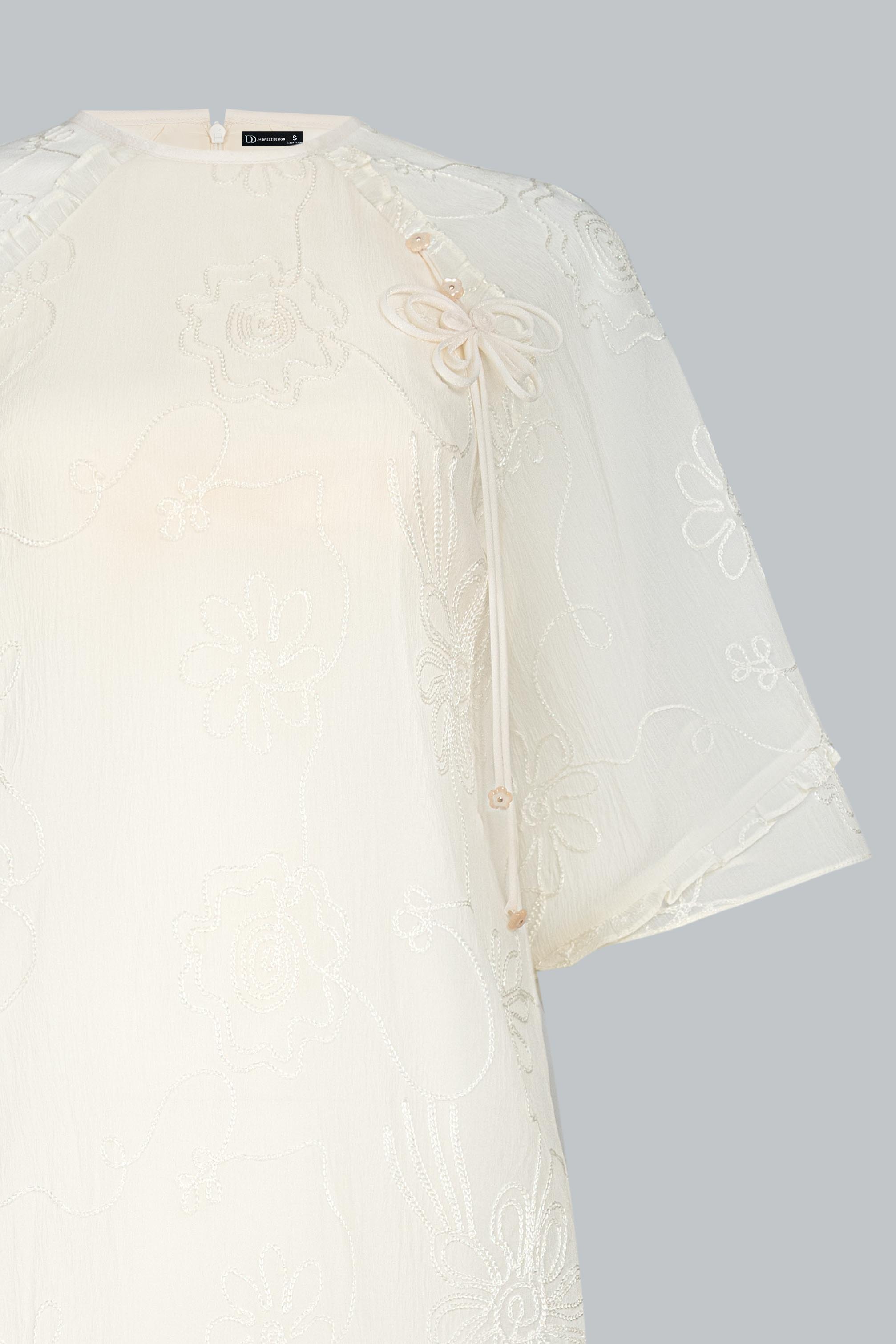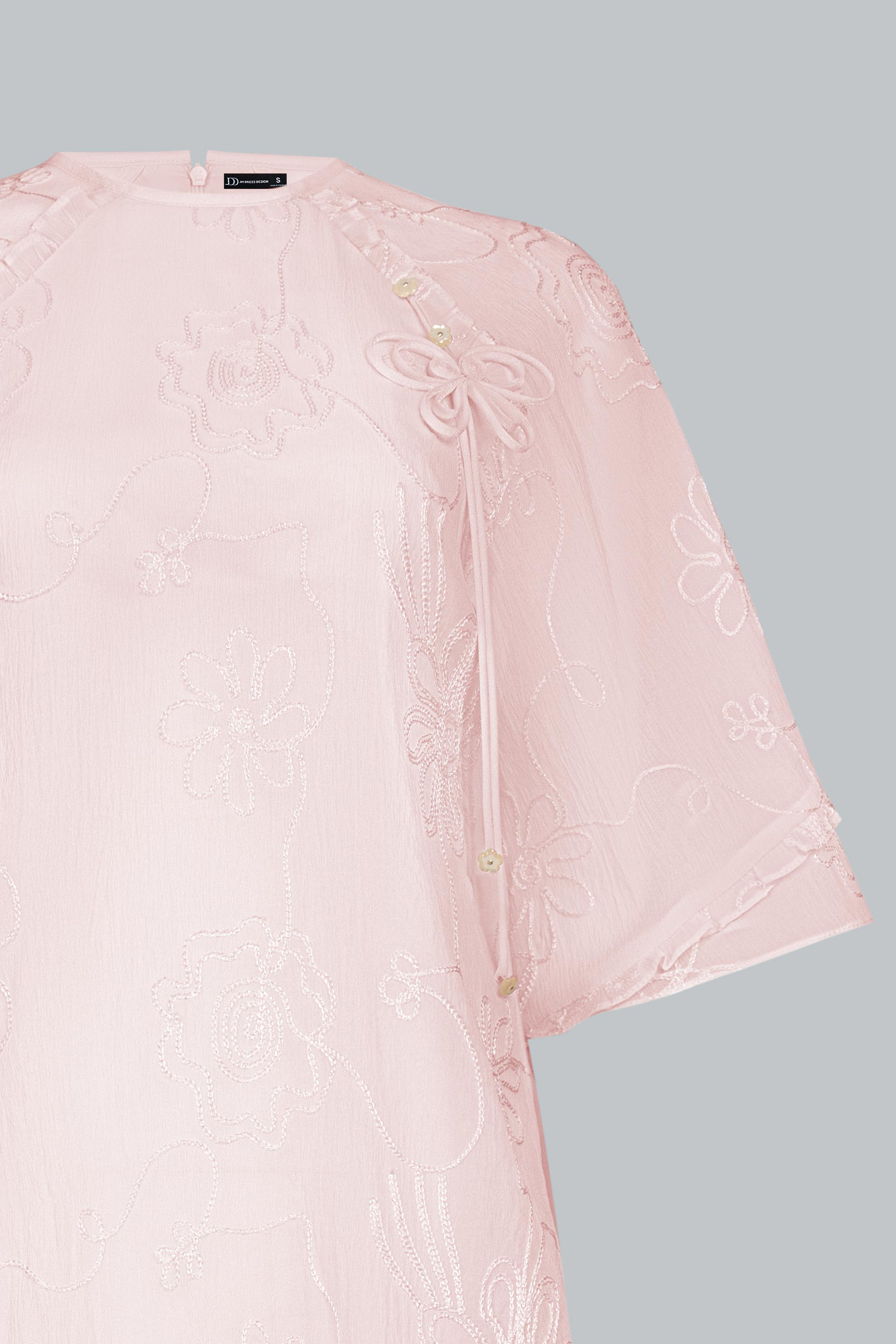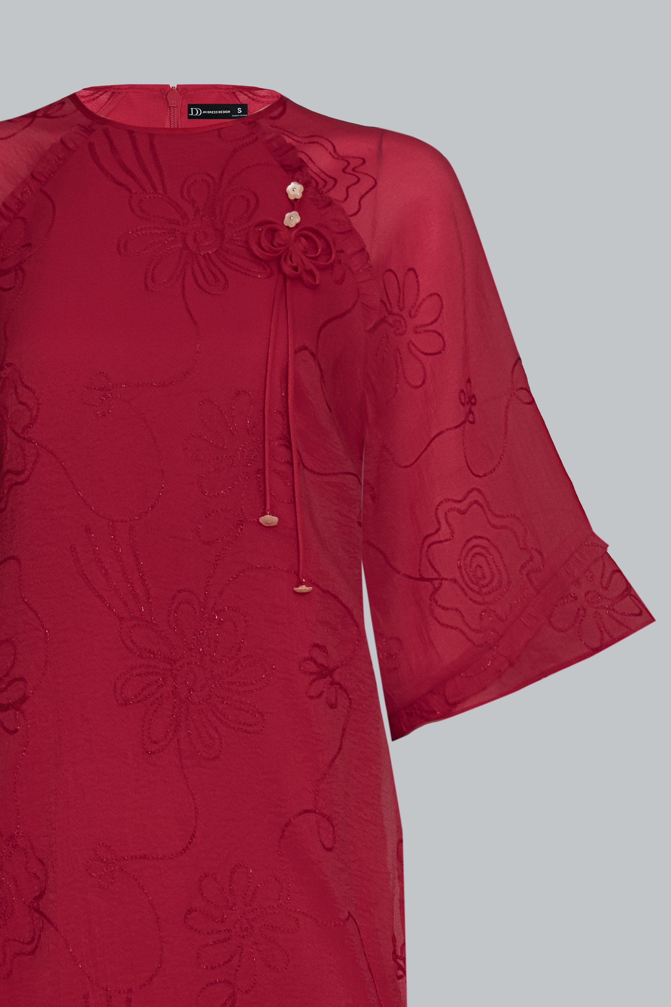 Sử dụng tơ thêu nổi đồng tông trên nền poly cao cấp, vải có độ mịn và độ rủ tự nhiên. Những đường thêu hoa ẩn hiện theo ánh sáng như hơi gió thoảng qua mặt nước – nhẹ nhàng, tinh tế, và đầy nữ tính.