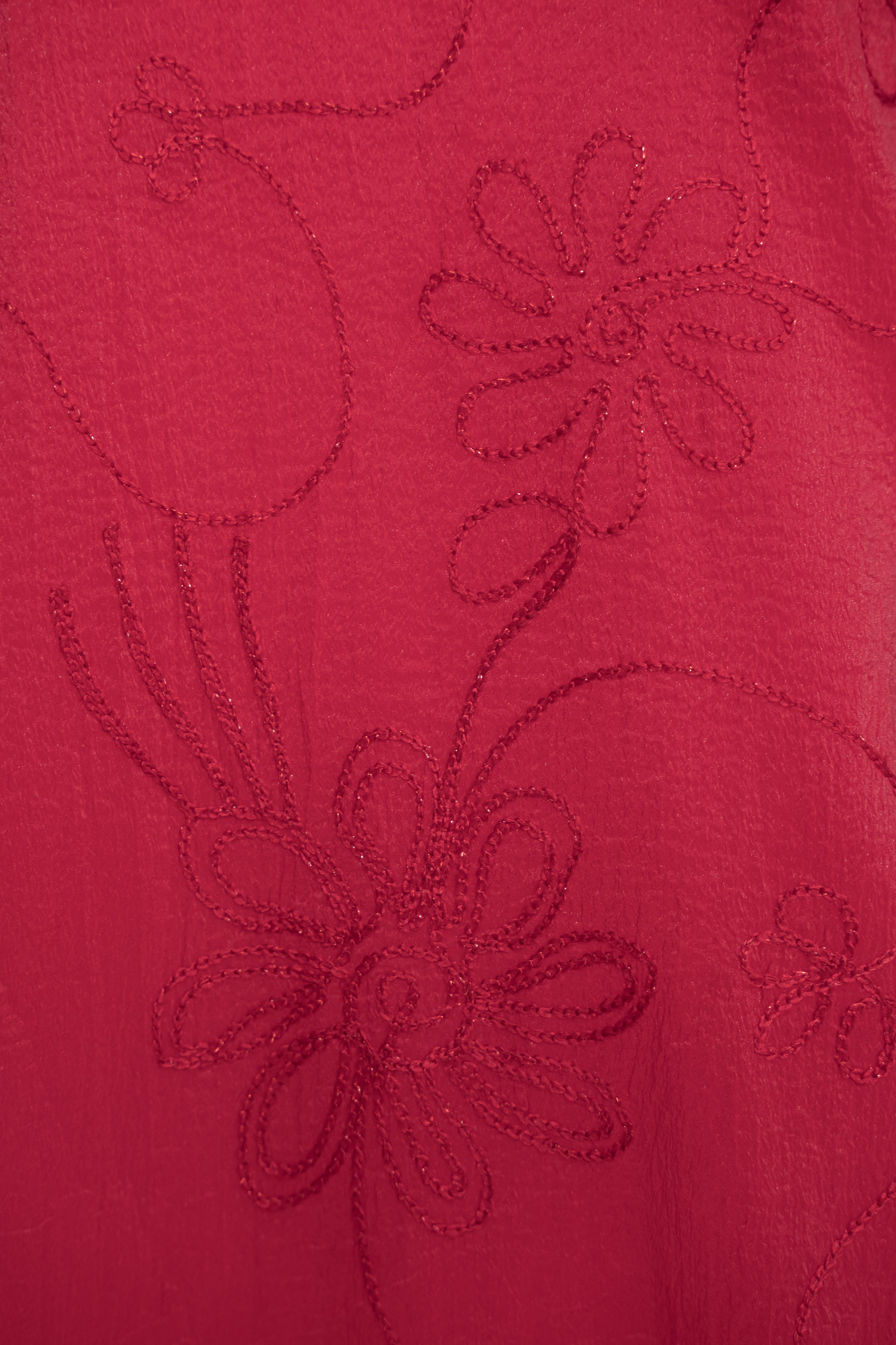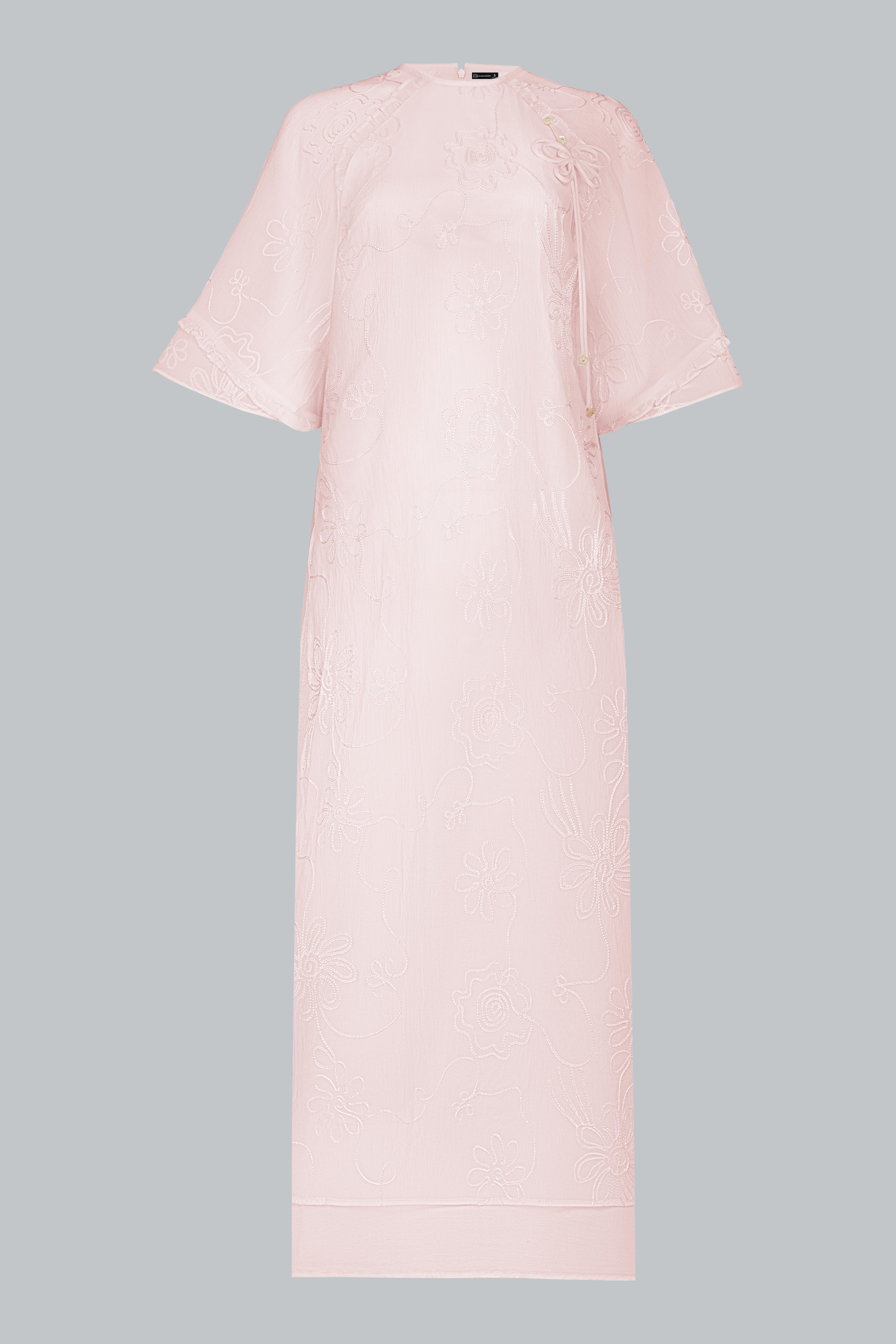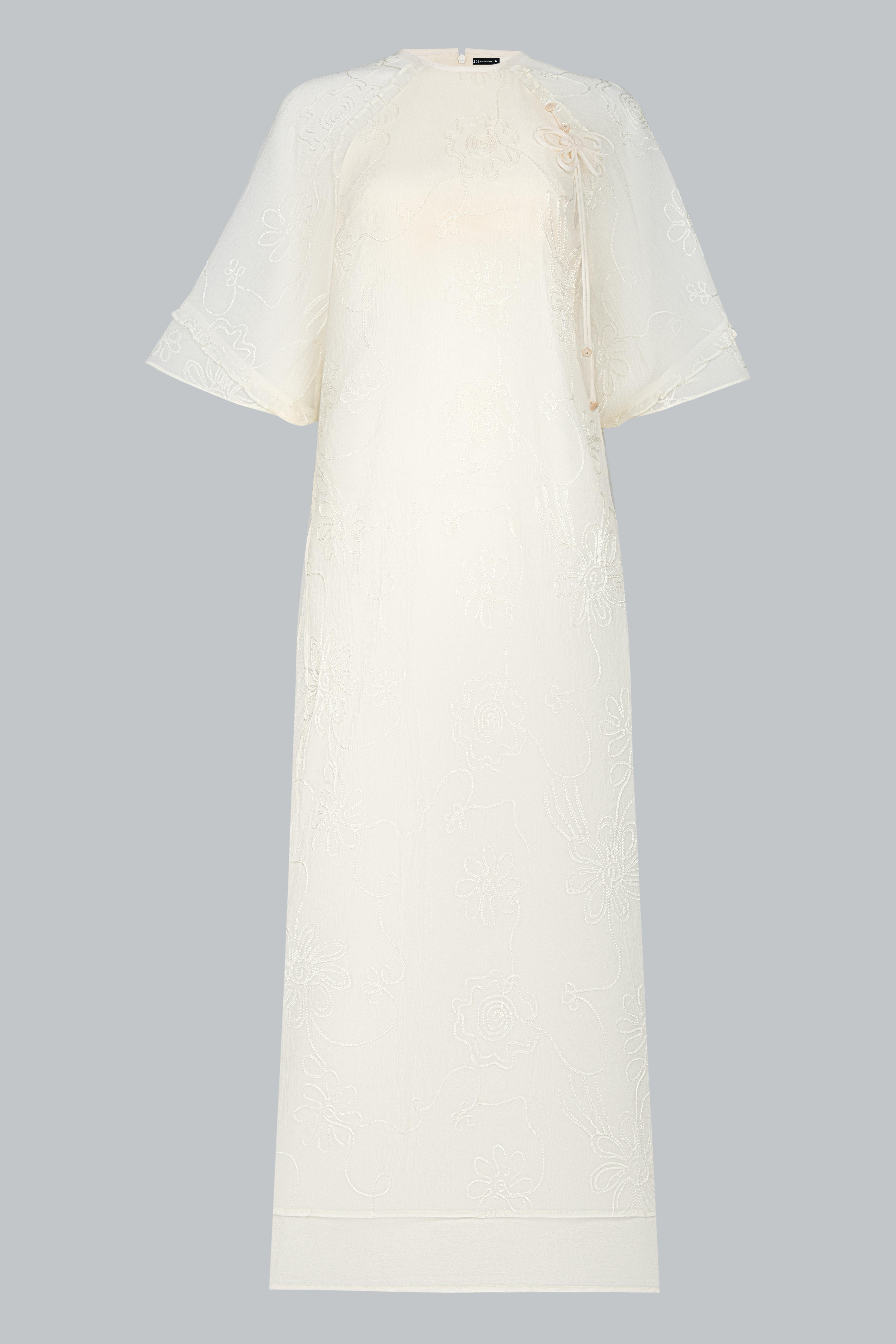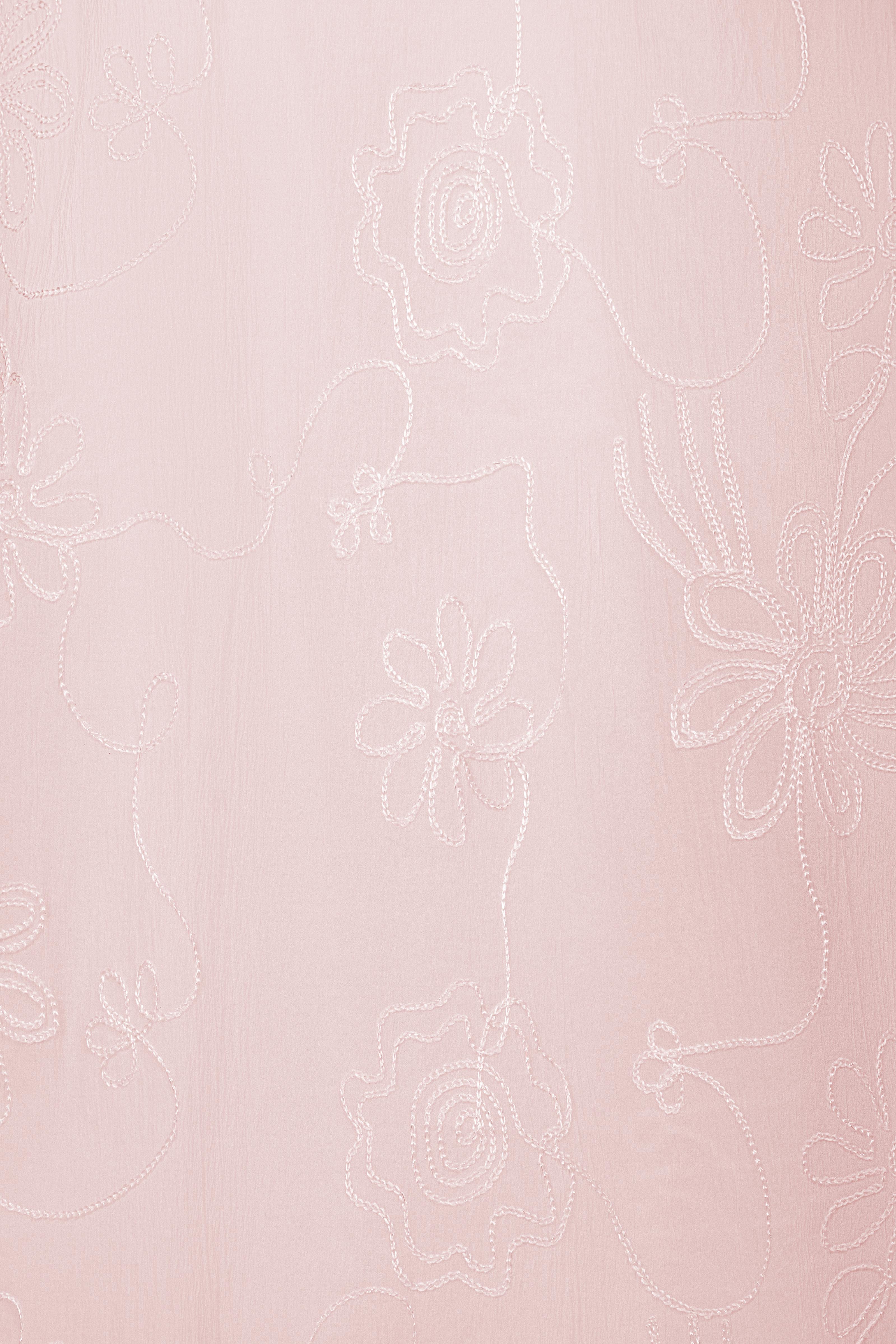 Sử dụng tơ thêu nổi đồng tông trên nền poly cao cấp, vải có độ mịn và độ rủ tự nhiên. Những đường thêu hoa ẩn hiện theo ánh sáng như hơi gió thoảng qua mặt nước – nhẹ nhàng, tinh tế, và đầy nữ tính.