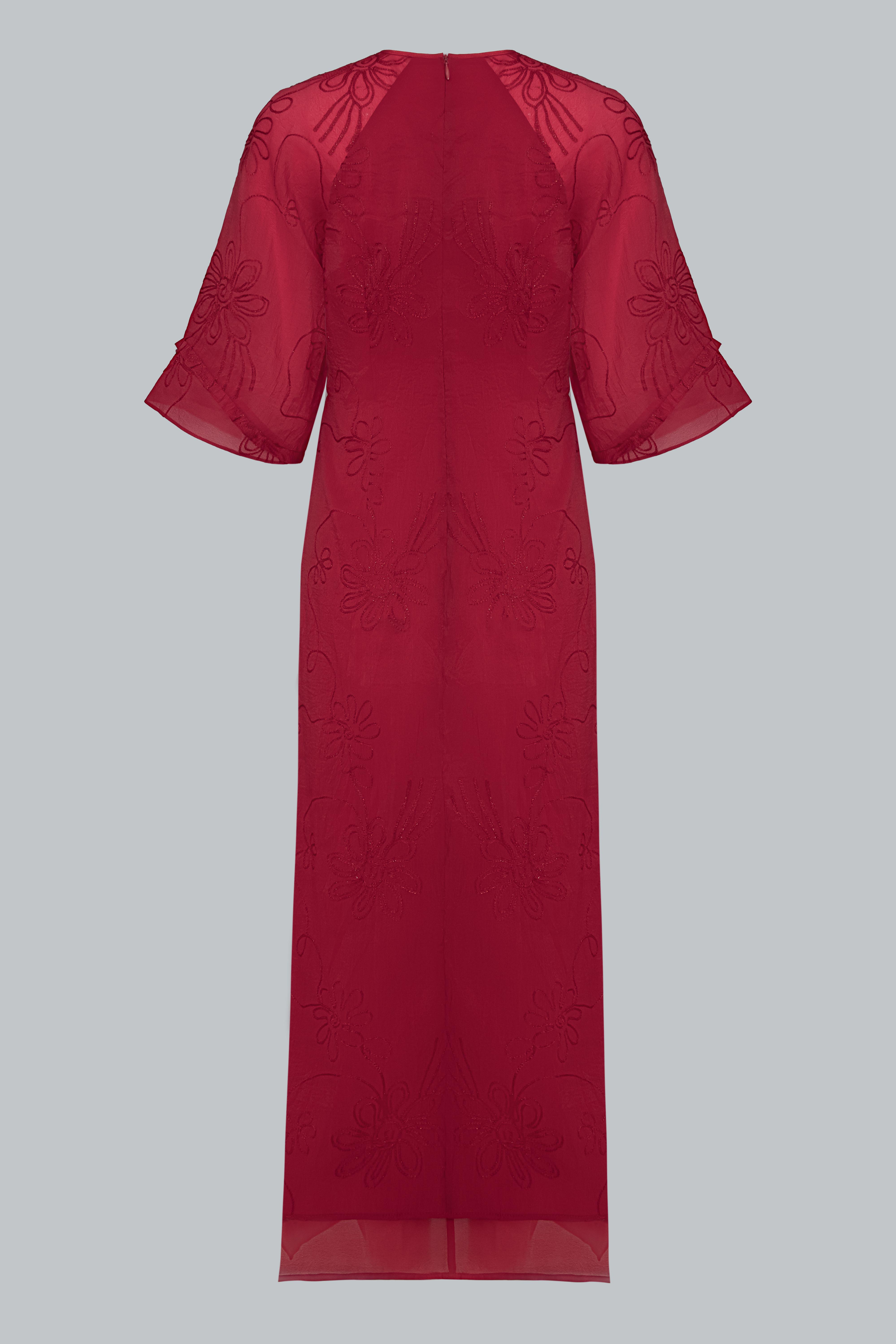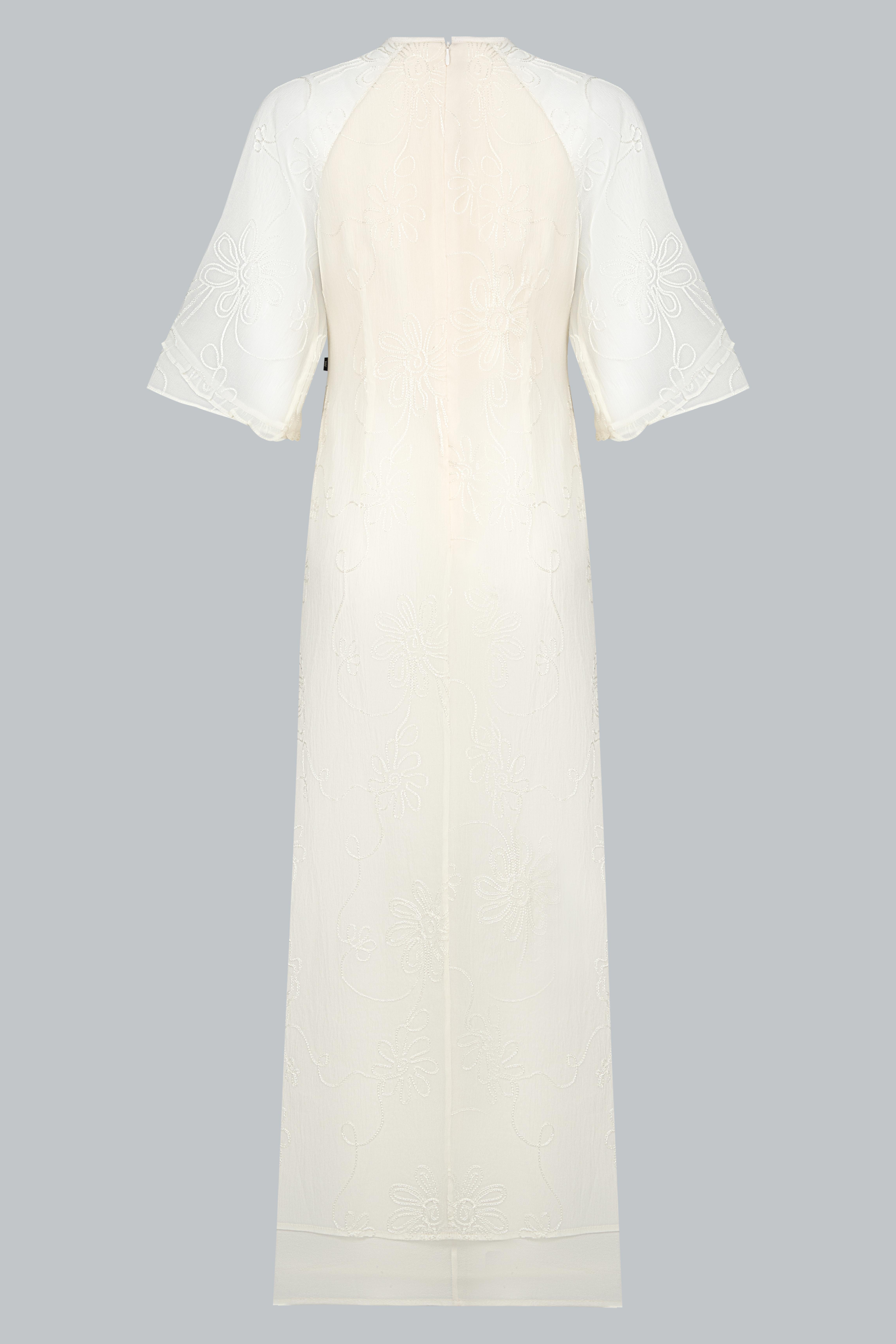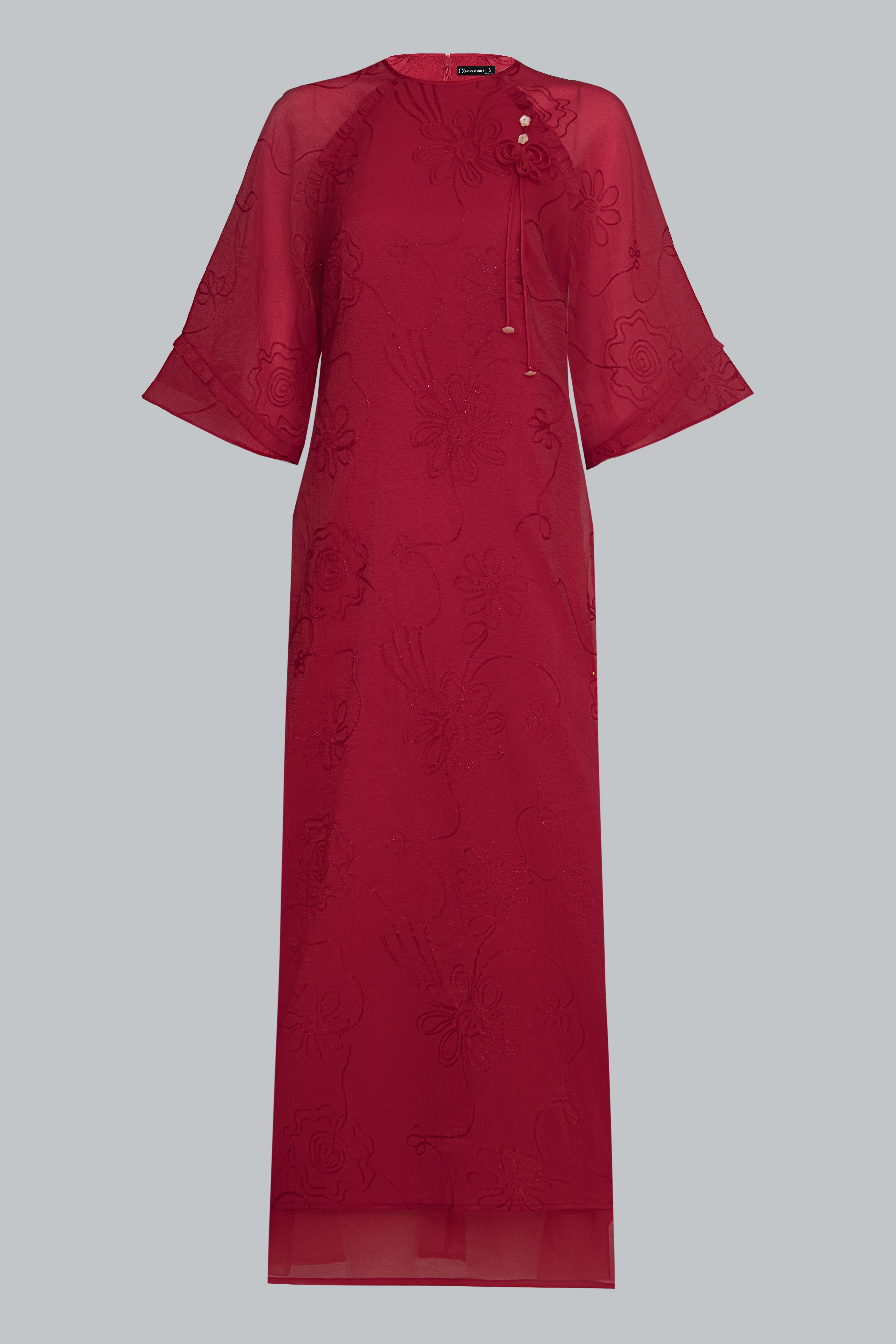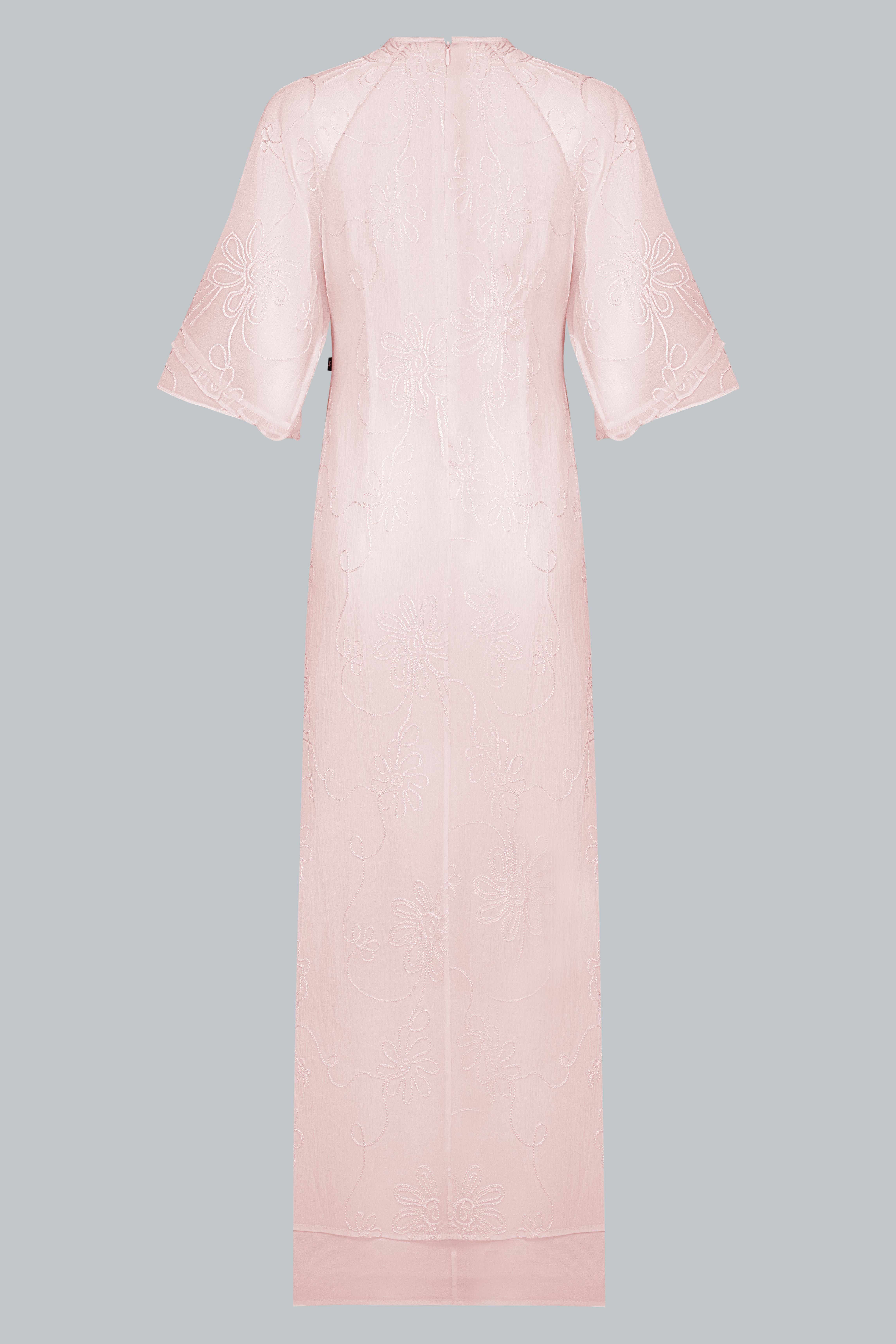 Sử dụng tơ thêu nổi đồng tông trên nền poly cao cấp, vải có độ mịn và độ rủ tự nhiên. Những đường thêu hoa ẩn hiện theo ánh sáng như hơi gió thoảng qua mặt nước – nhẹ nhàng, tinh tế, và đầy nữ tính.