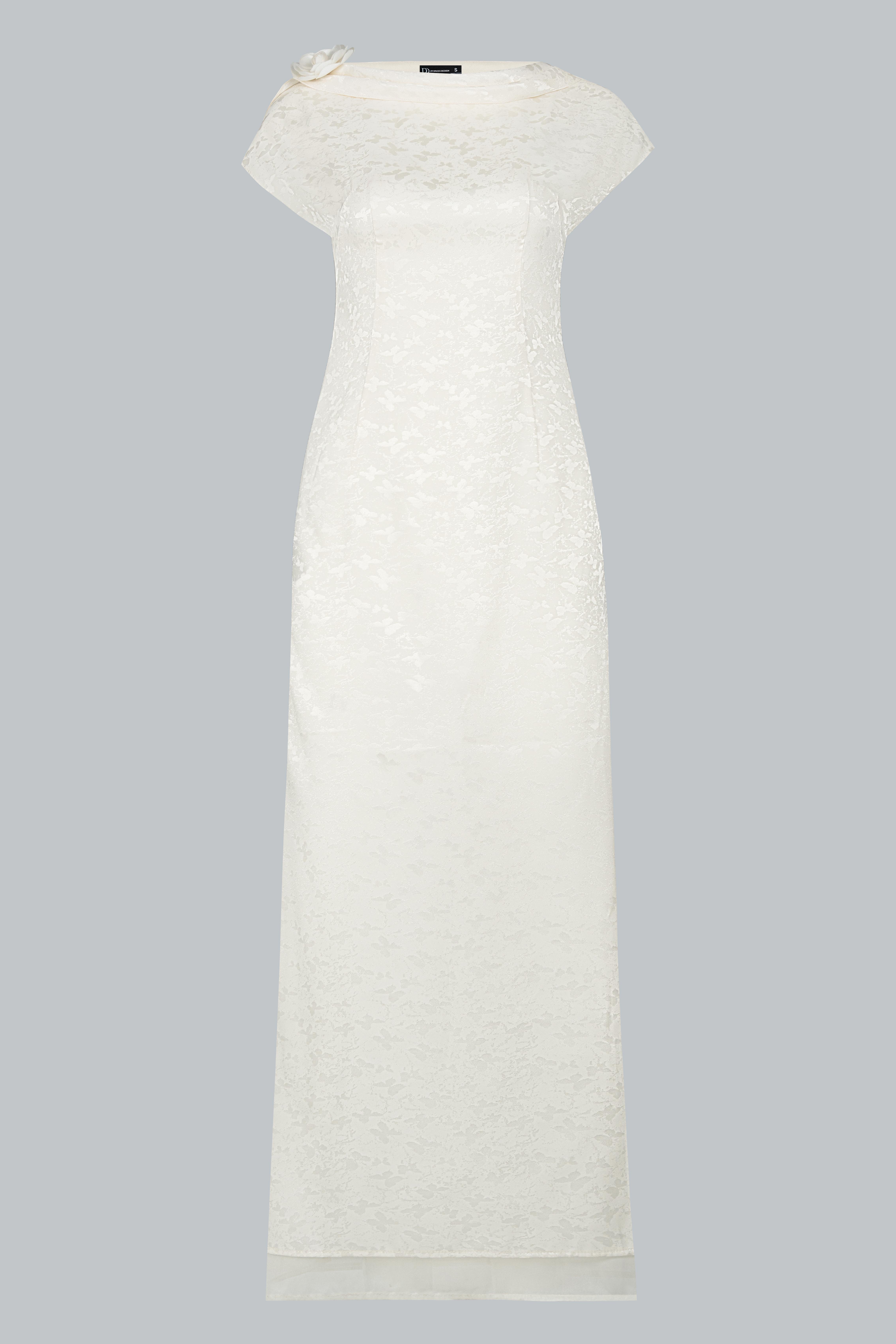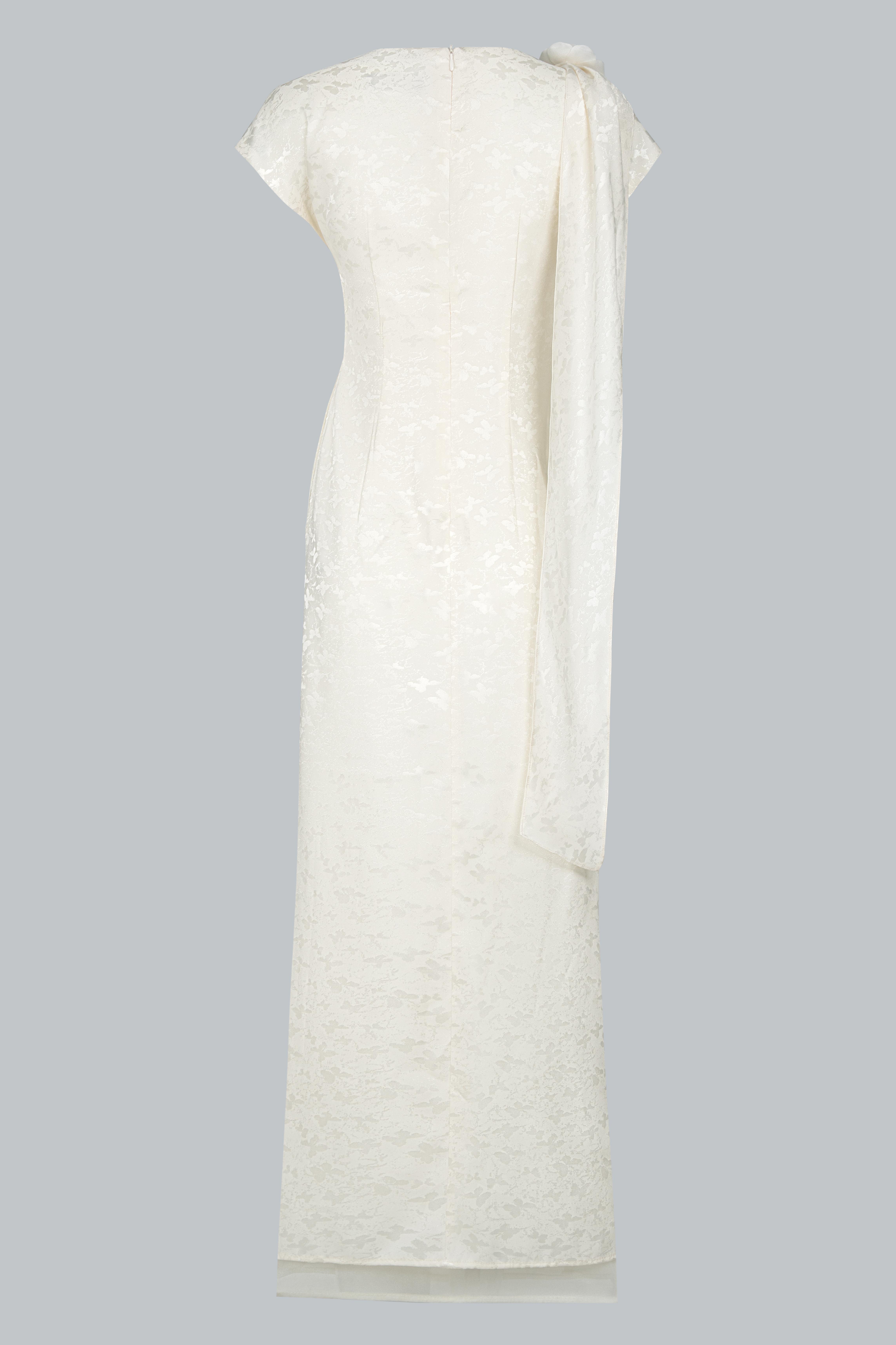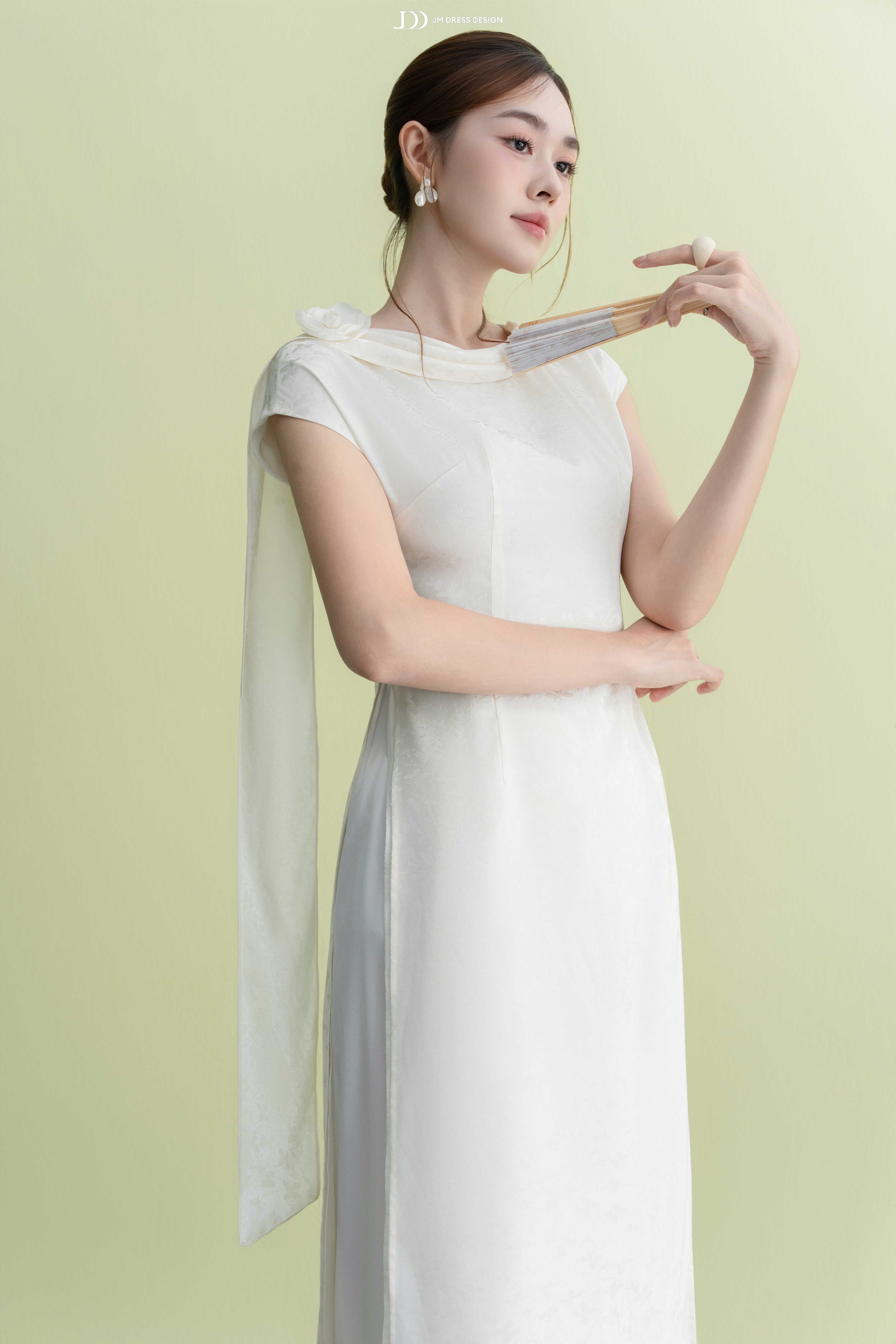 Tay liền vai tạo cảm giác liền mạch, mềm mại tự nhiên; phần dải khăn tơ thả lệch một bên vừa là điểm nhấn thị giác, vừa gợi liên tưởng đến làn gió mây vờn.