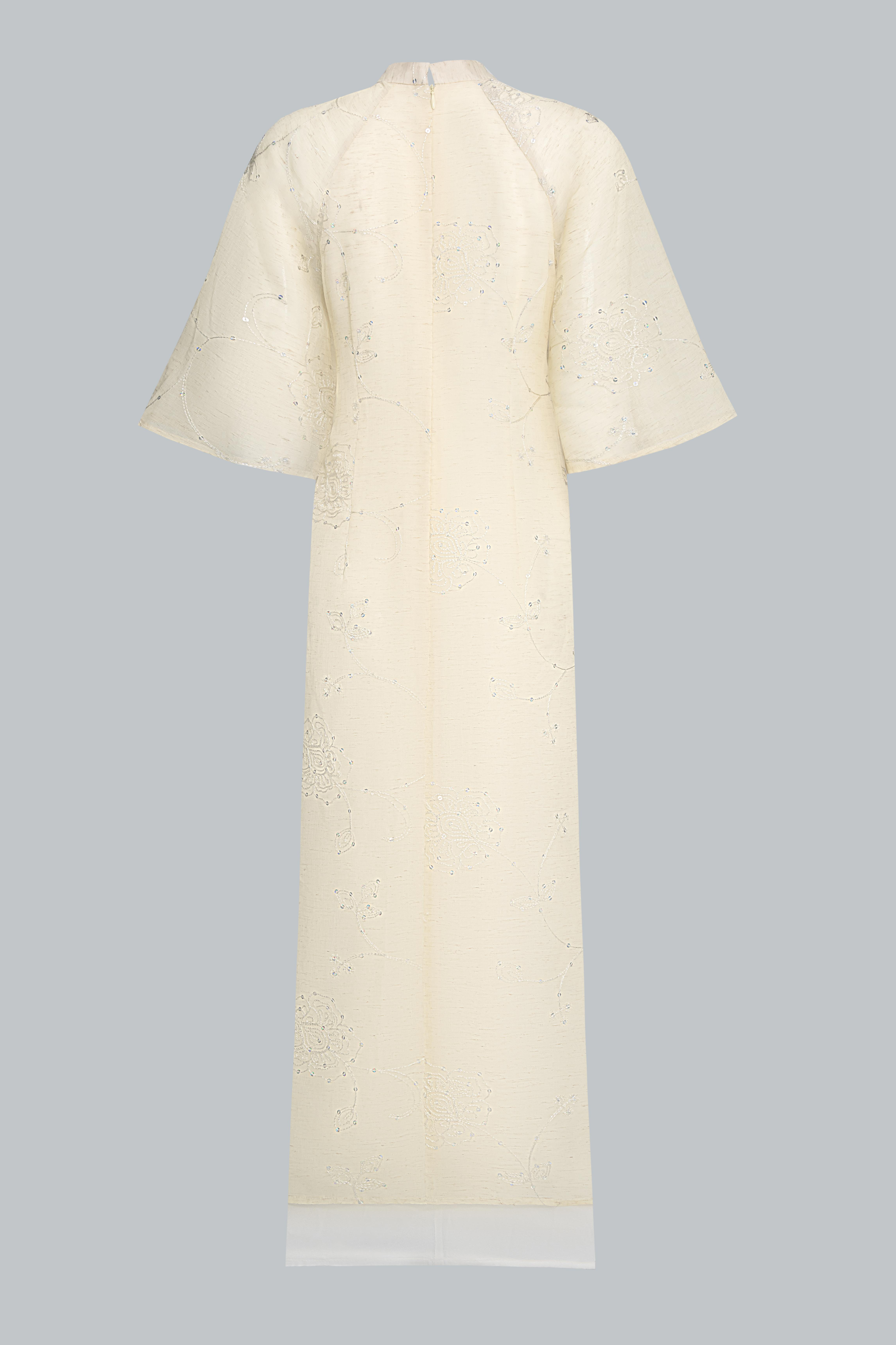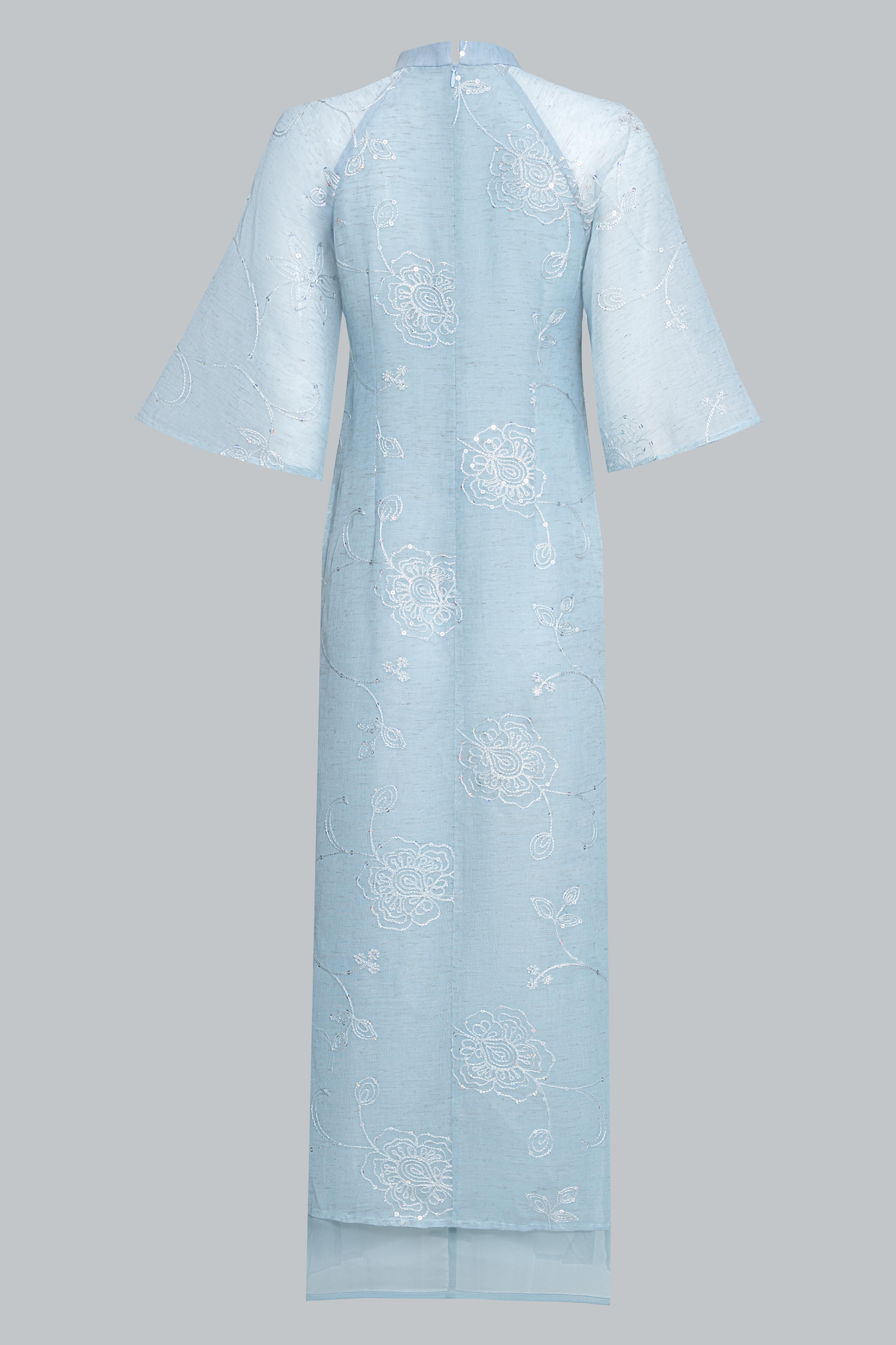 Tà áo buông dài chạm gần mắt cá, giữ nguyên nét truyền thống của áo dài Việt, đồng thời mang lại sự thướt tha, uyển chuyển khi di chuyển.