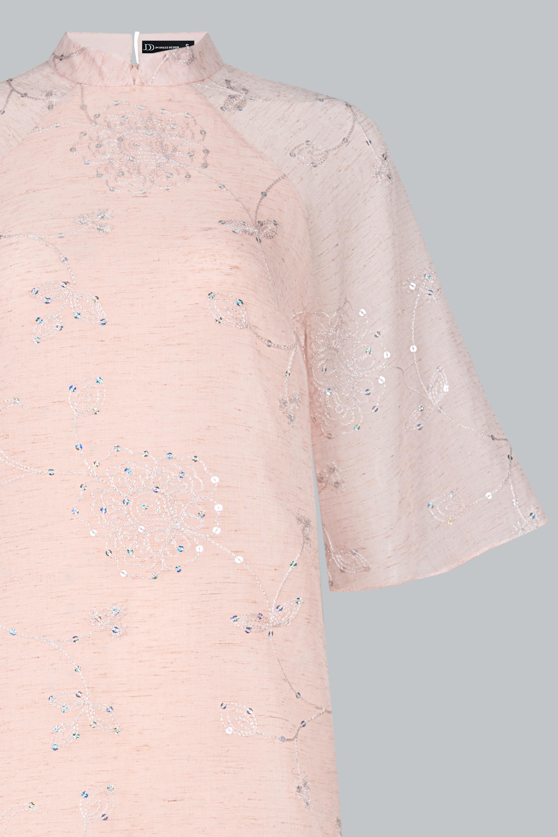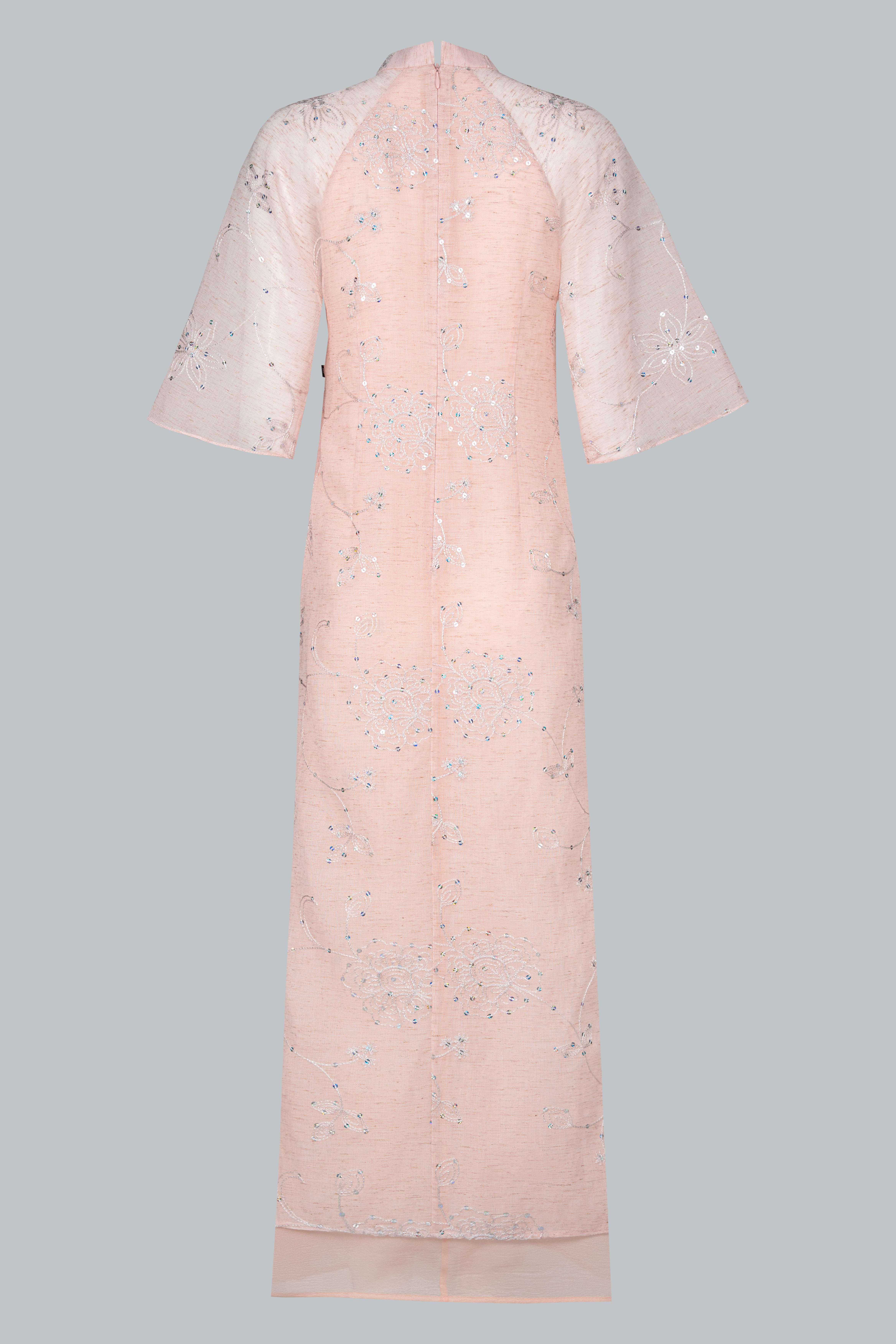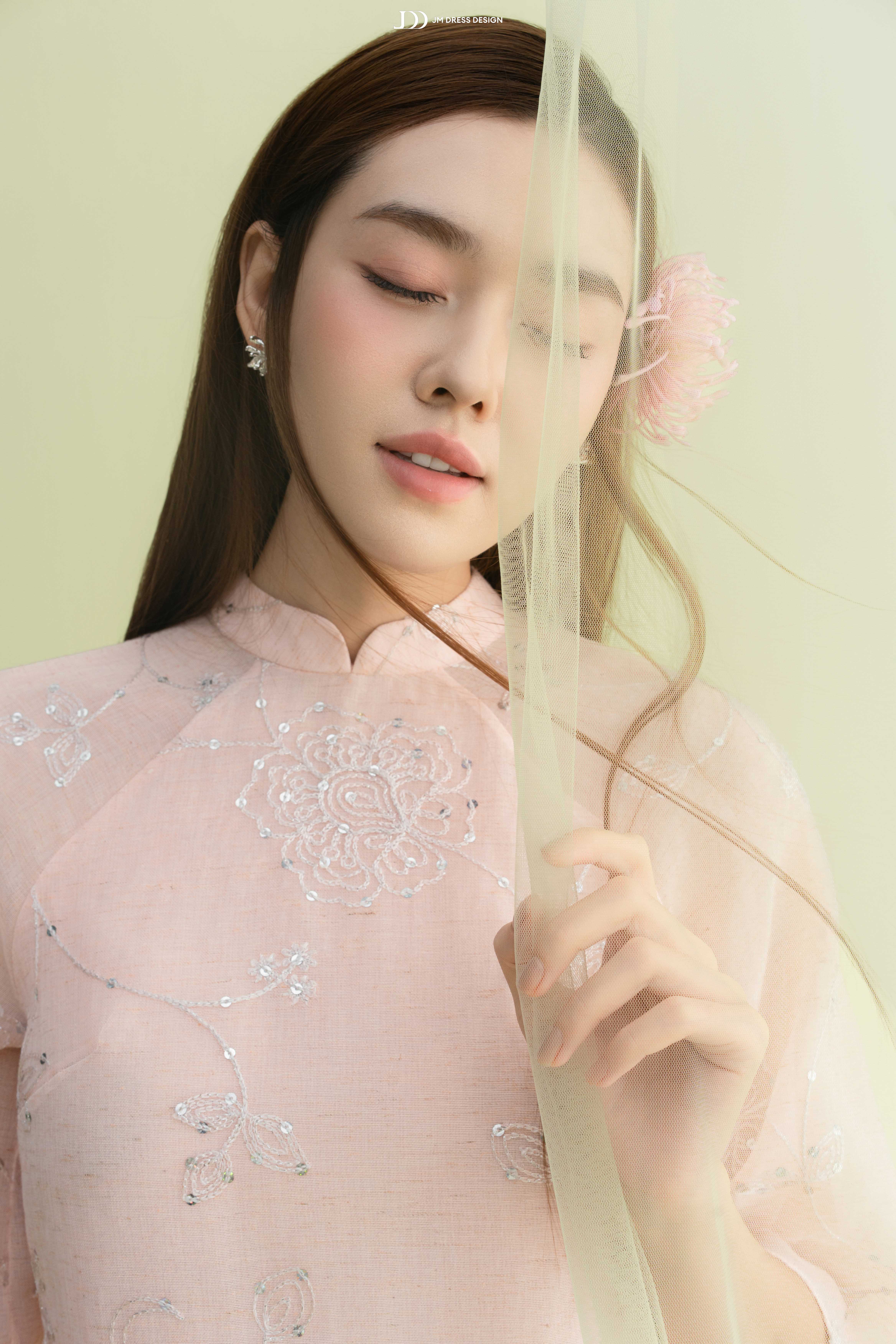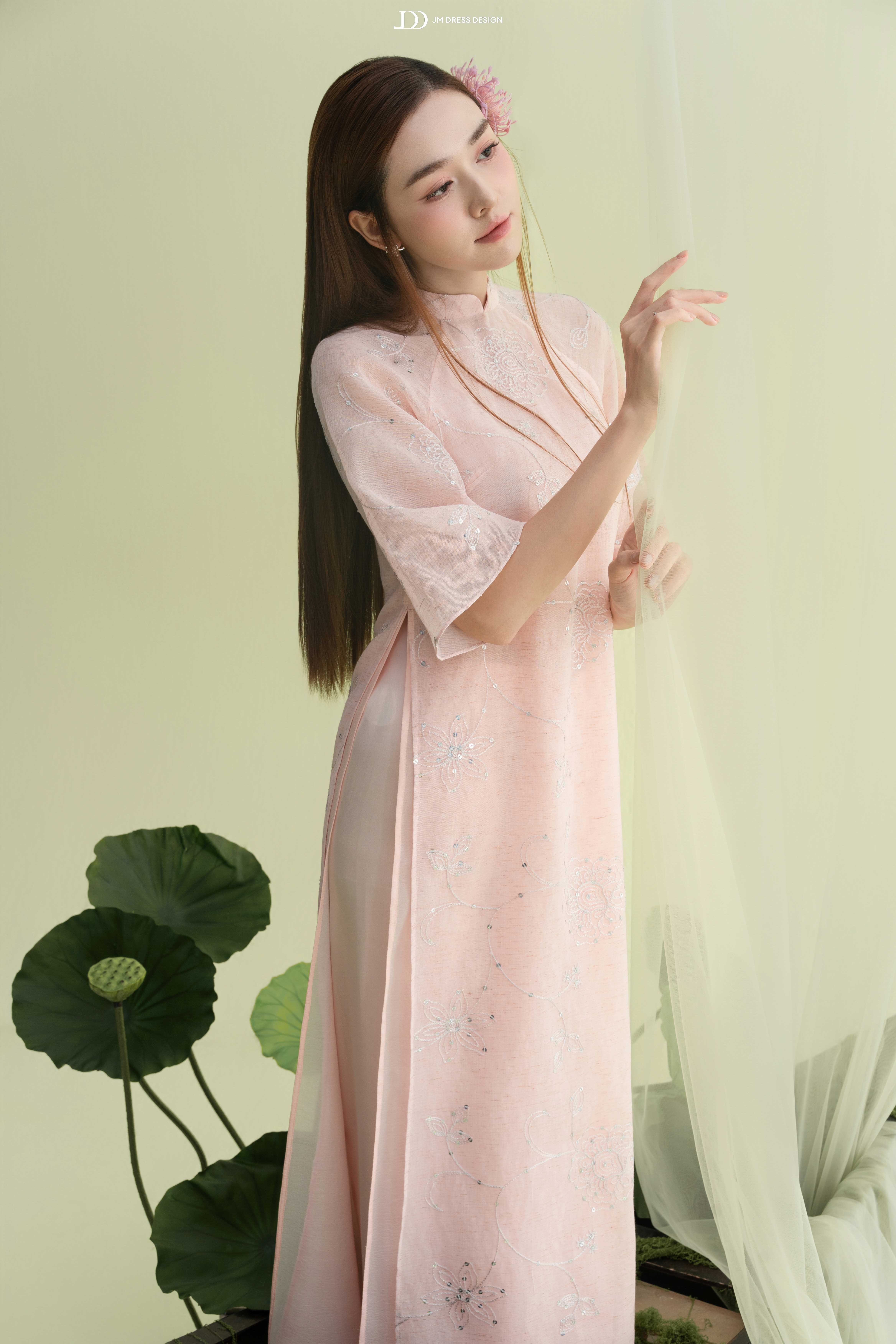 Áo được làm từ tơ mỏng thêu nổi họa tiết hoa đồng tông trên nền poly cao cấp, sắc hồng phấn pastel nhẹ như sương mai.