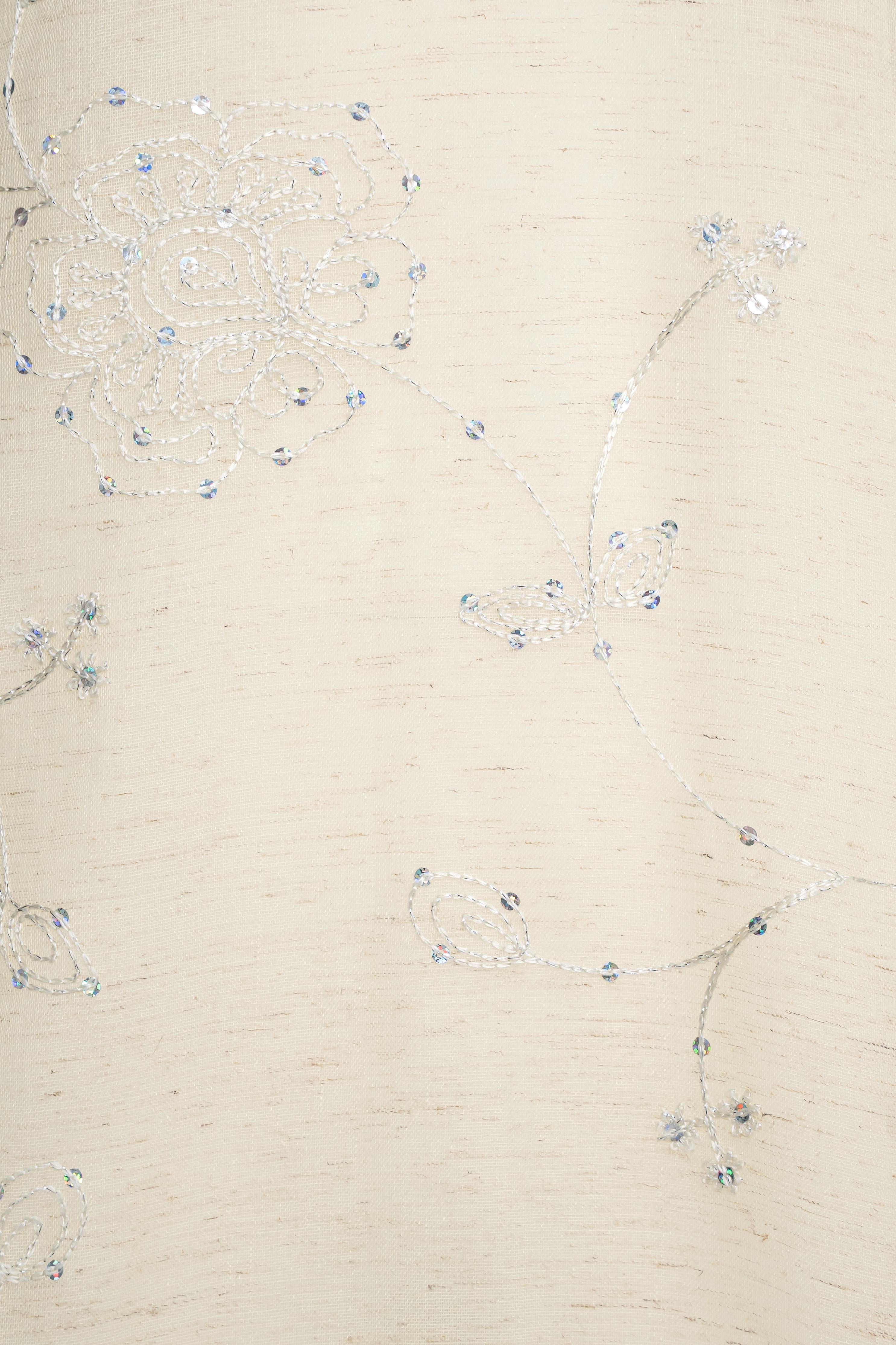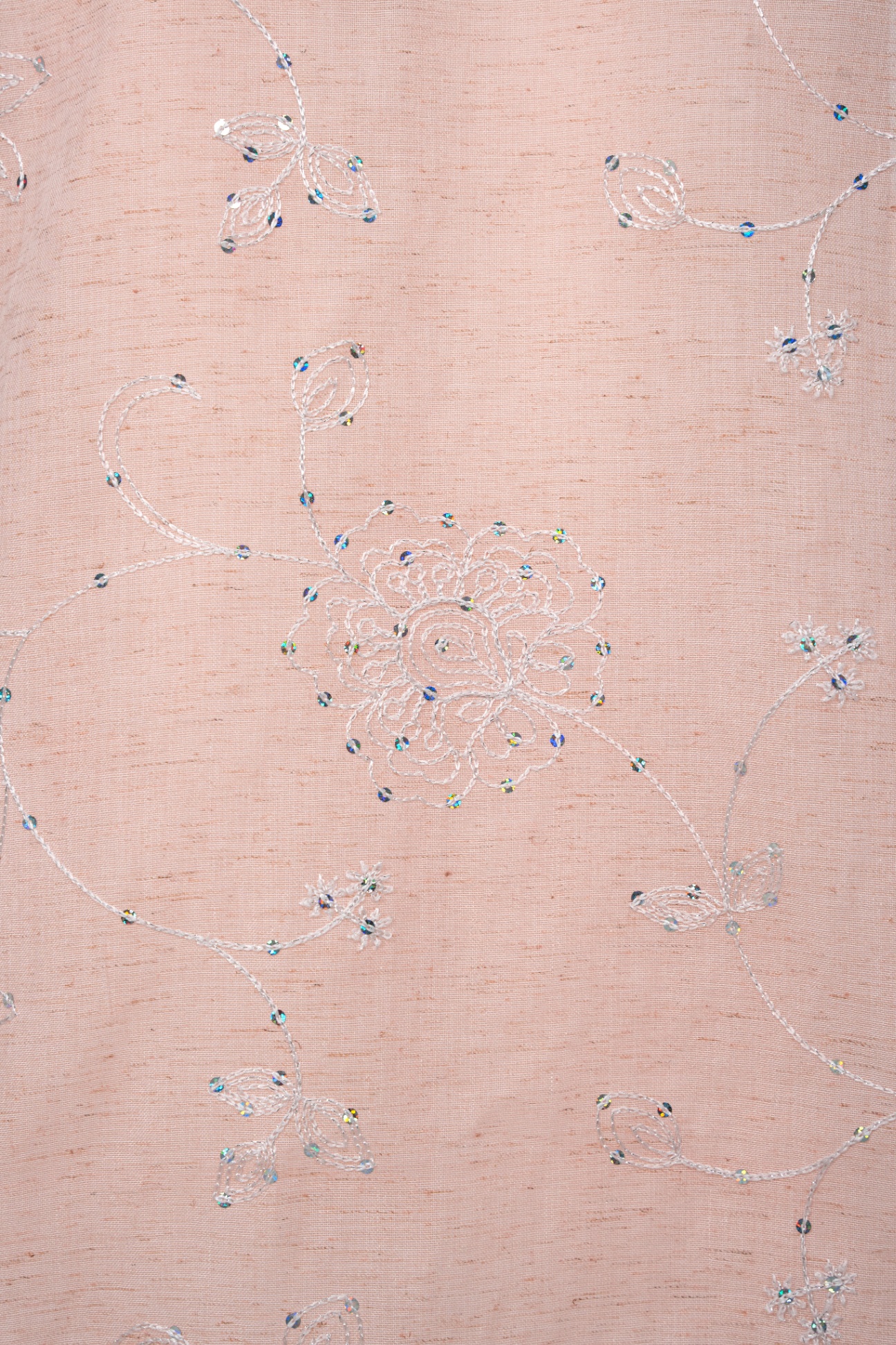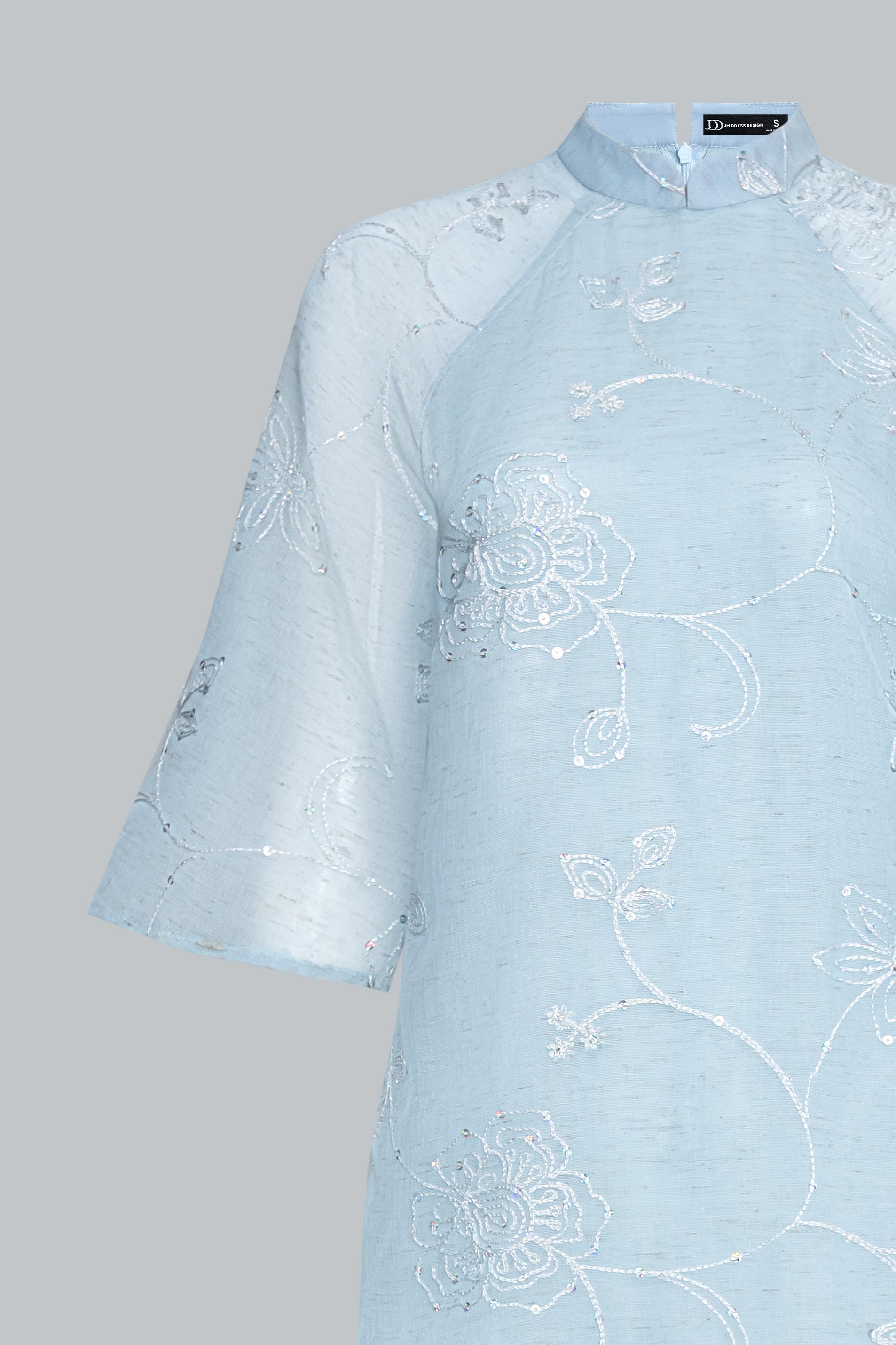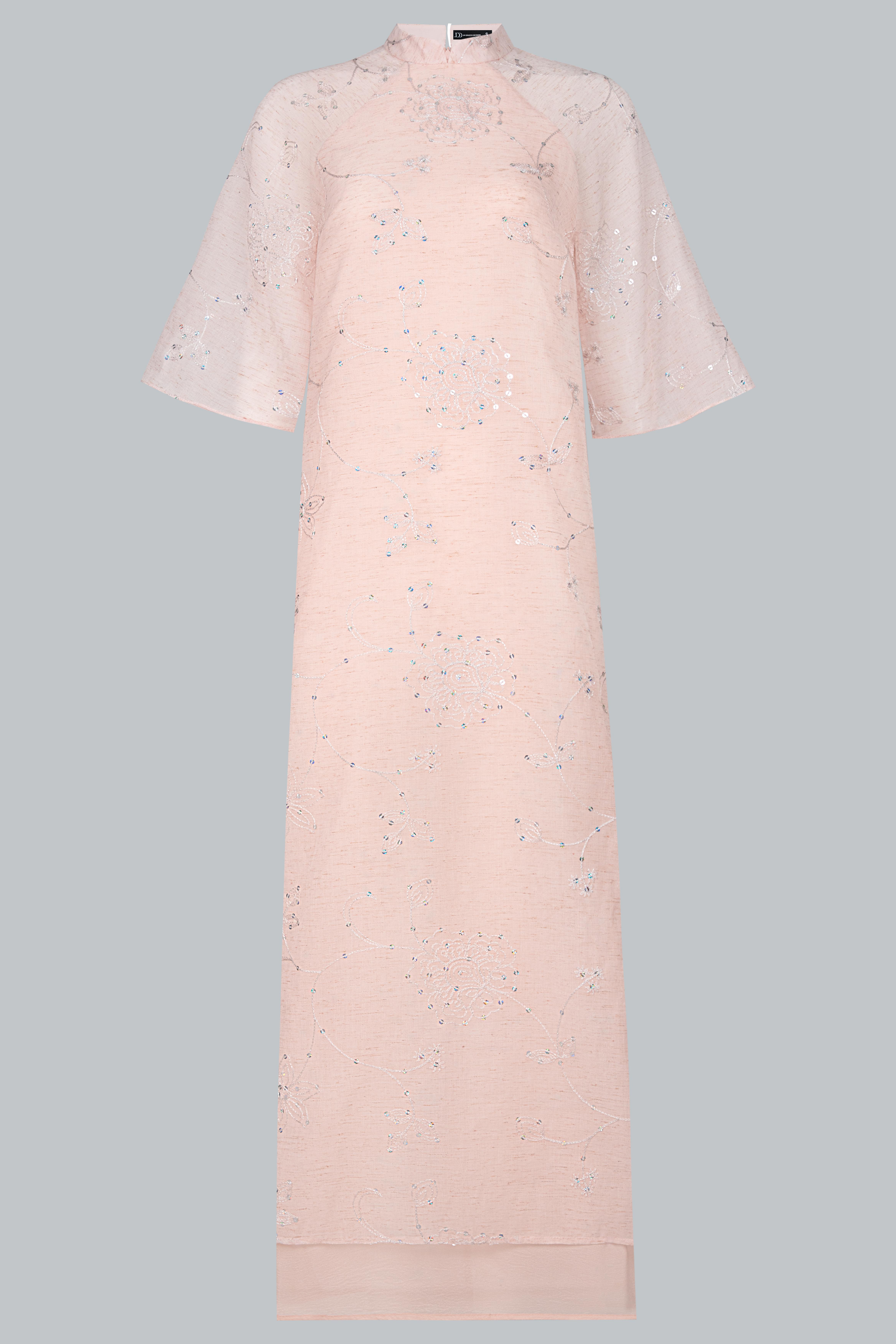 Áo được làm từ tơ mỏng thêu nổi họa tiết hoa đồng tông trên nền poly cao cấp, sắc hồng phấn pastel nhẹ như sương mai.