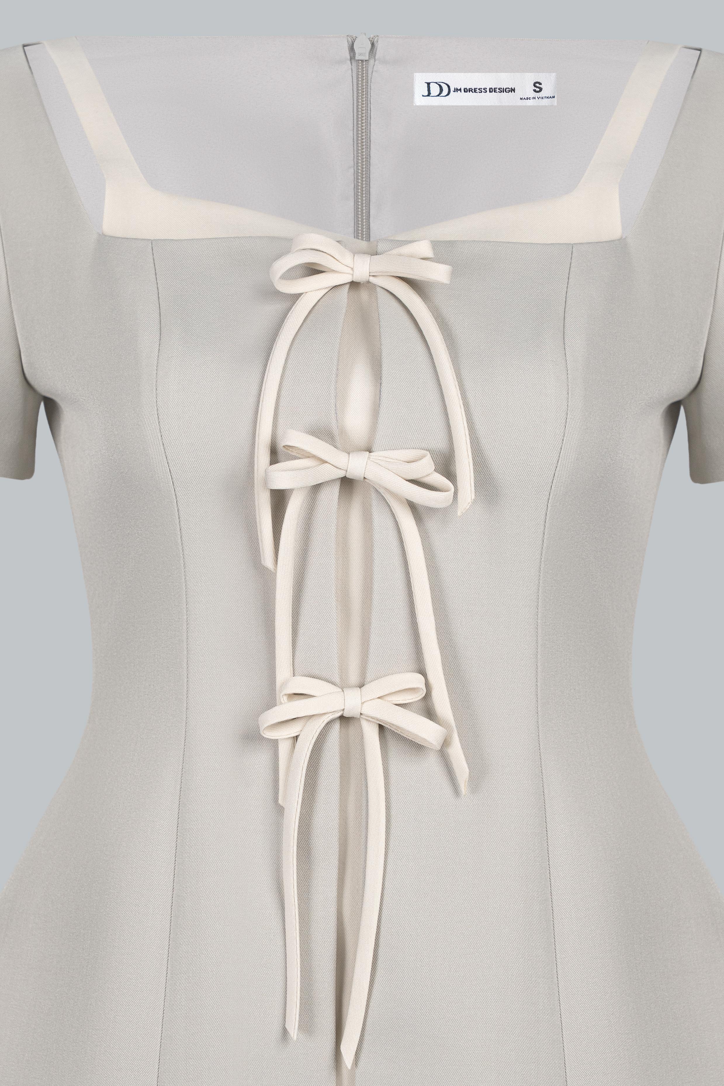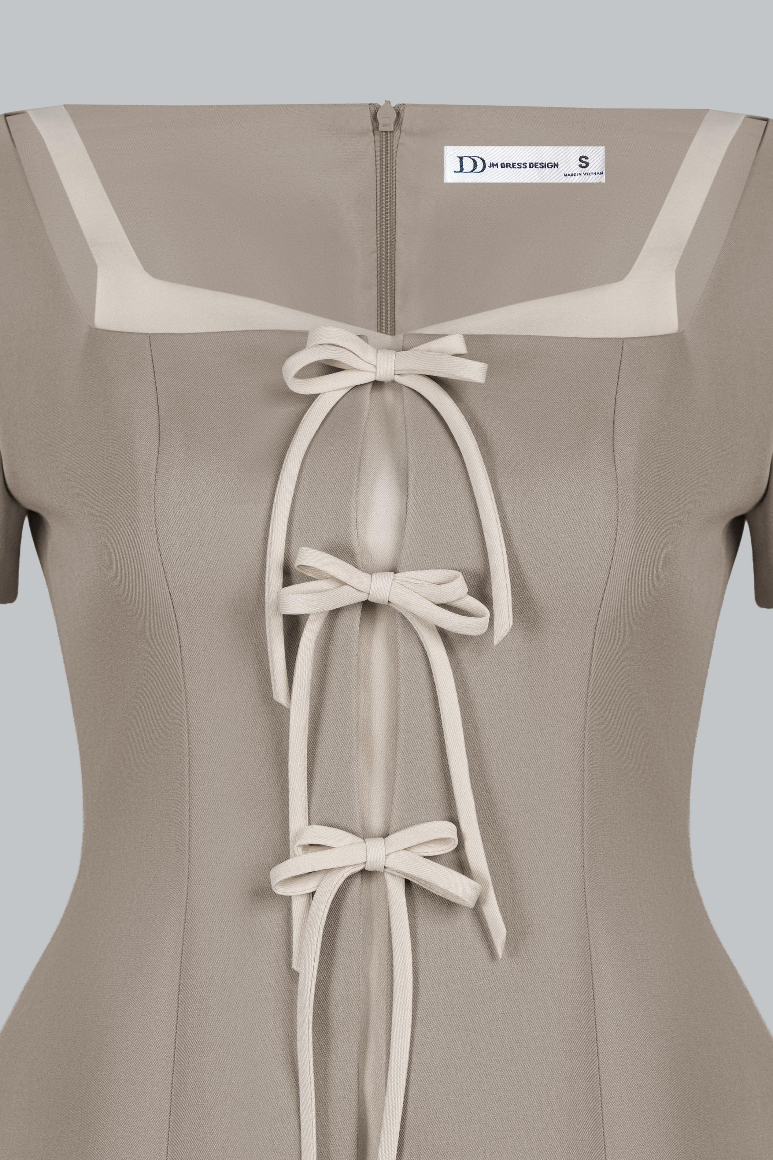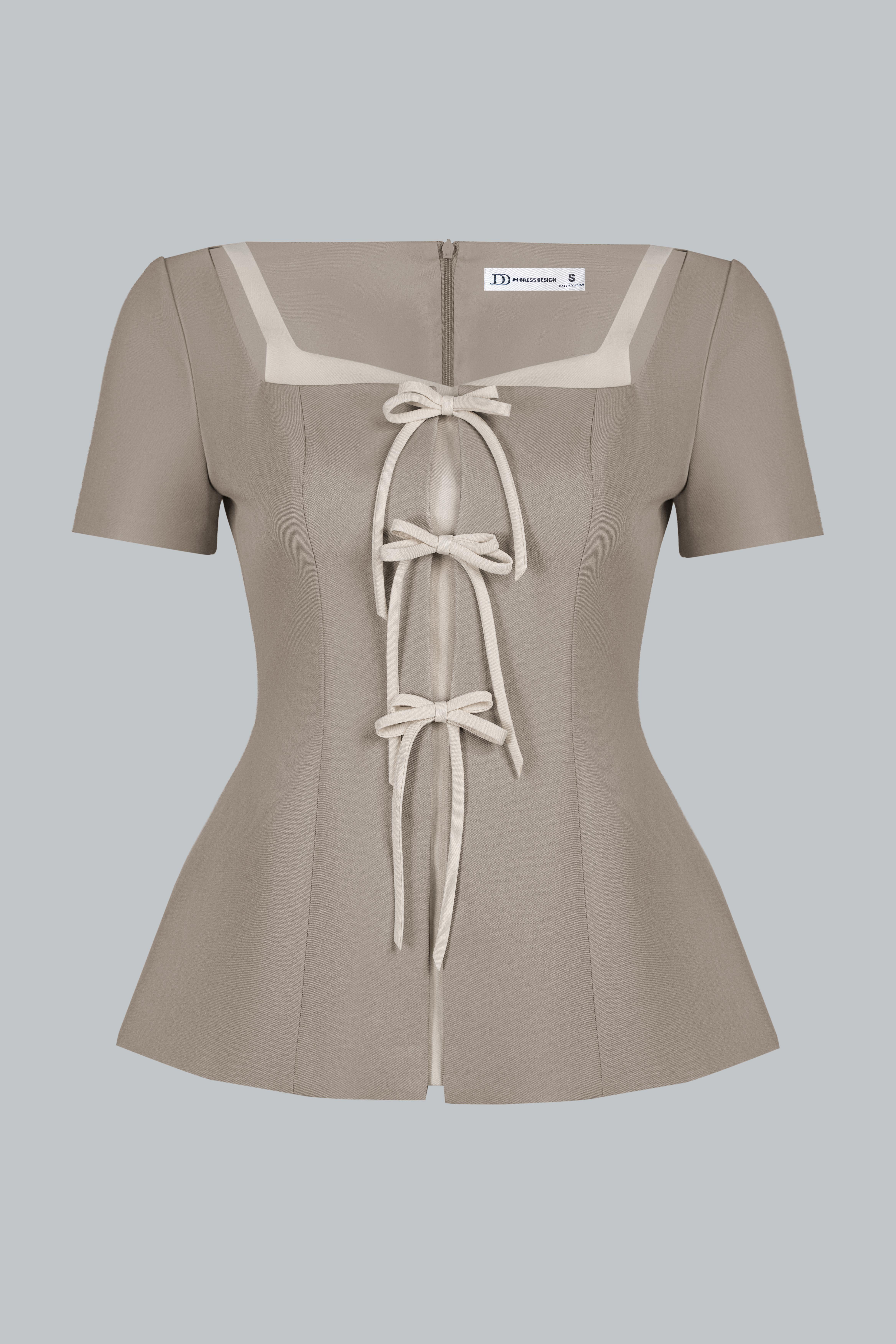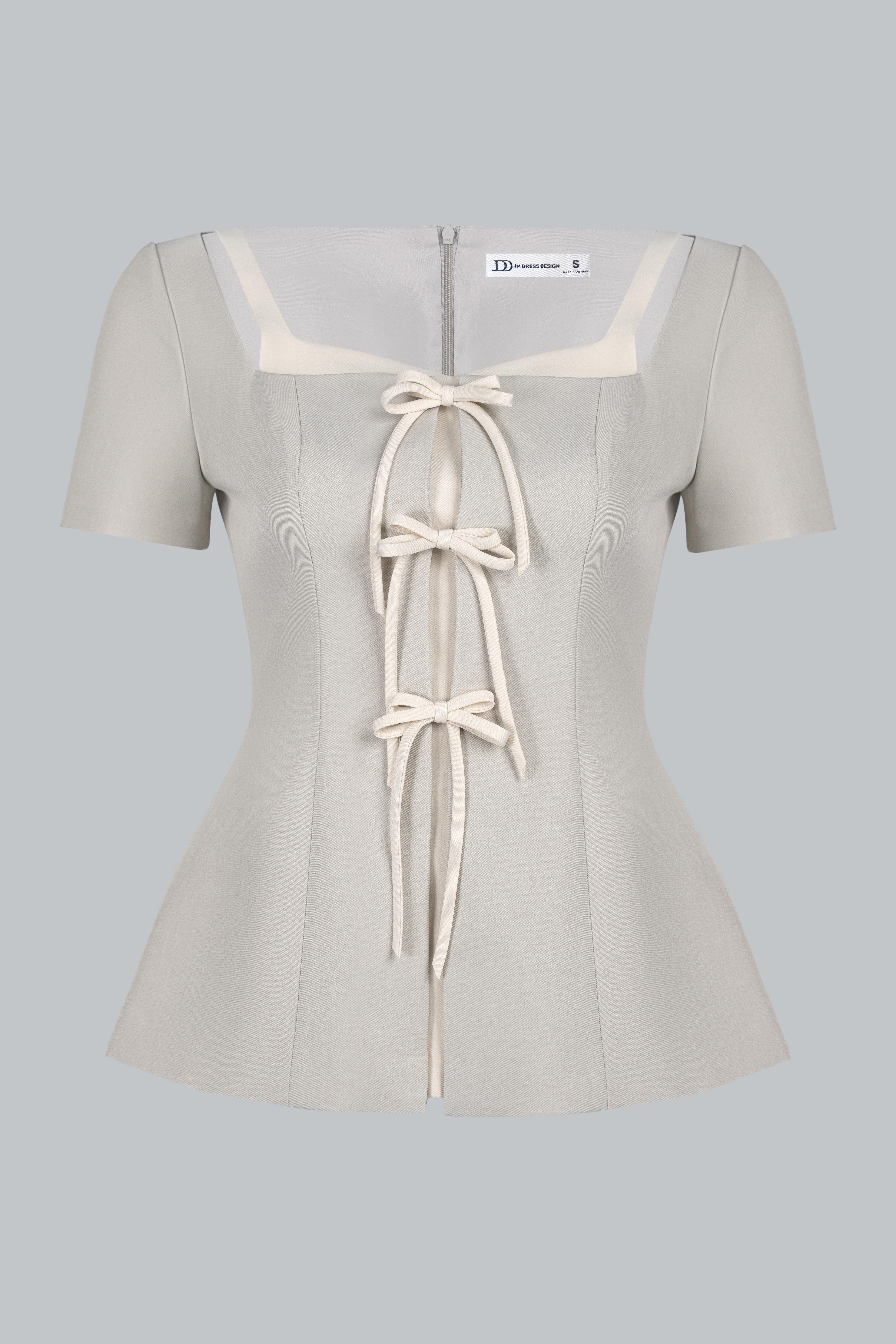Áo dáng ôm vừa, chiết eo rõ giúp tôn vòng eo và mang lại cảm giác gọn gàng, chỉn chu. Cổ vuông tạo cảm giác phần cổ và vai thanh thoát, mang lại nét nữ tính hiện đại và rất phù hợp với phong cách thanh lịch. Điểm nhấn chính nằm ở chi tiết layout 2 lớp phối màu, kết hợp dây thắt nơ trước ngực – vừa mang hơi hướng cổ điển, tiểu thư, vừa tạo sự đồng điệu tinh tế cho tổng thể thiết kế.