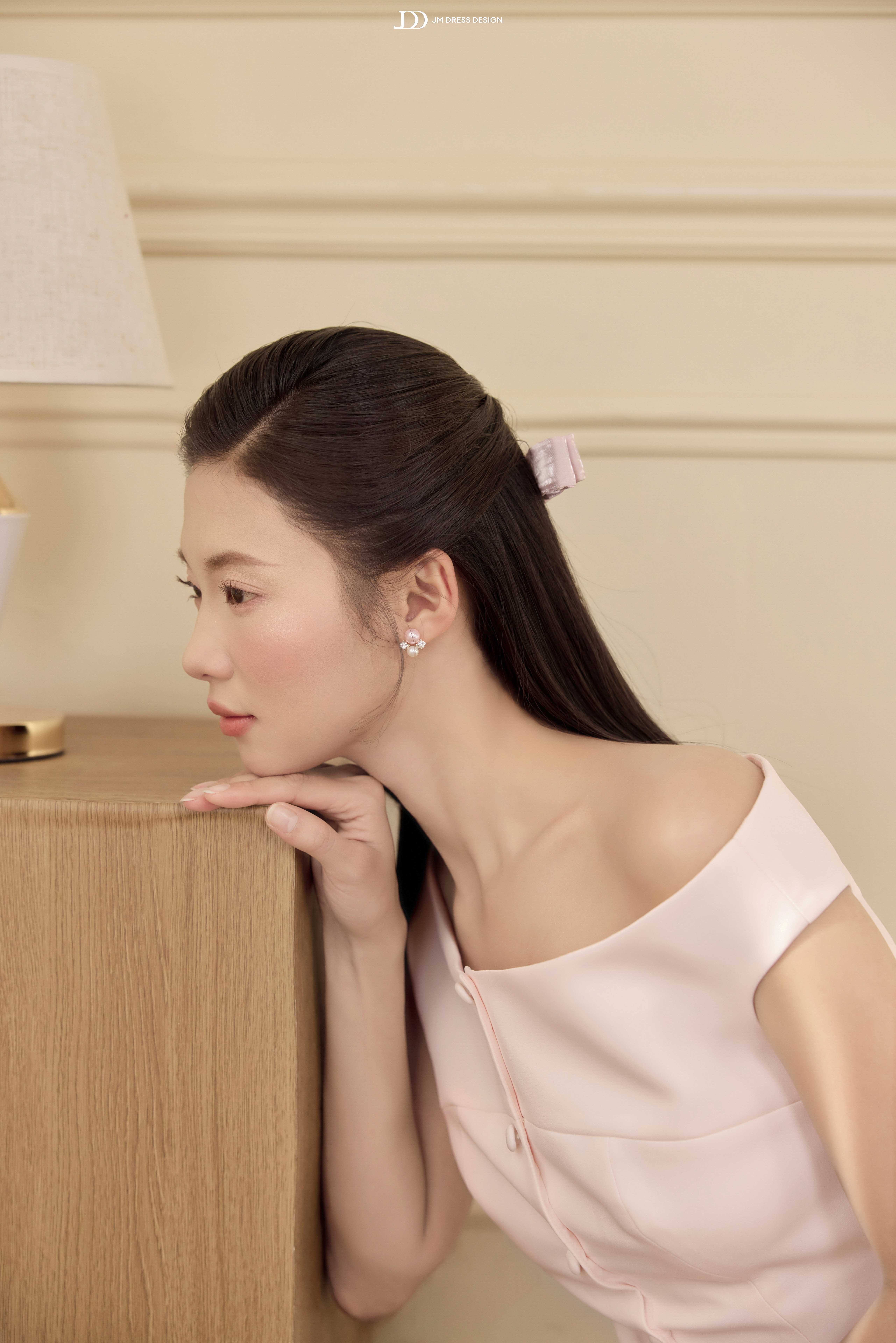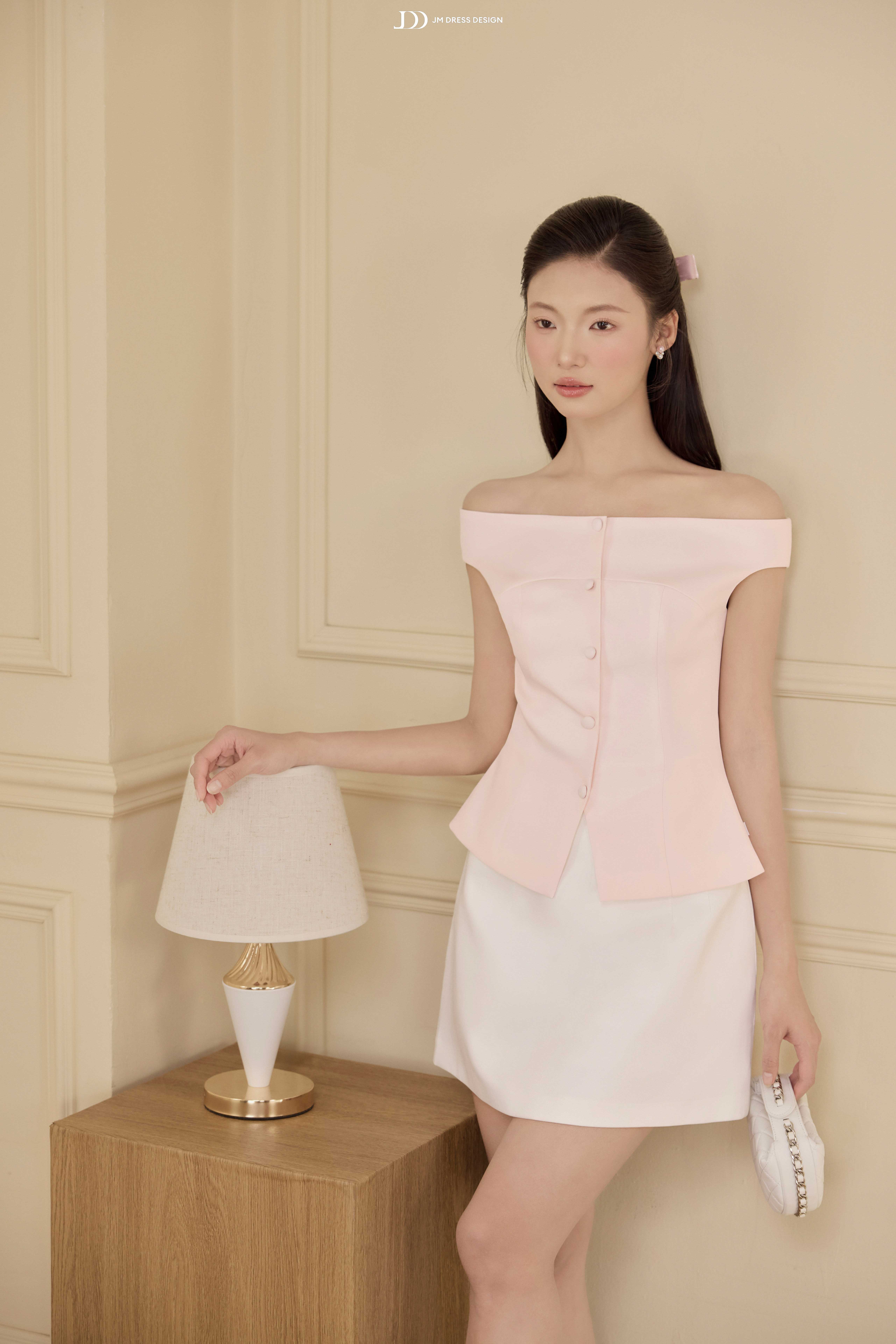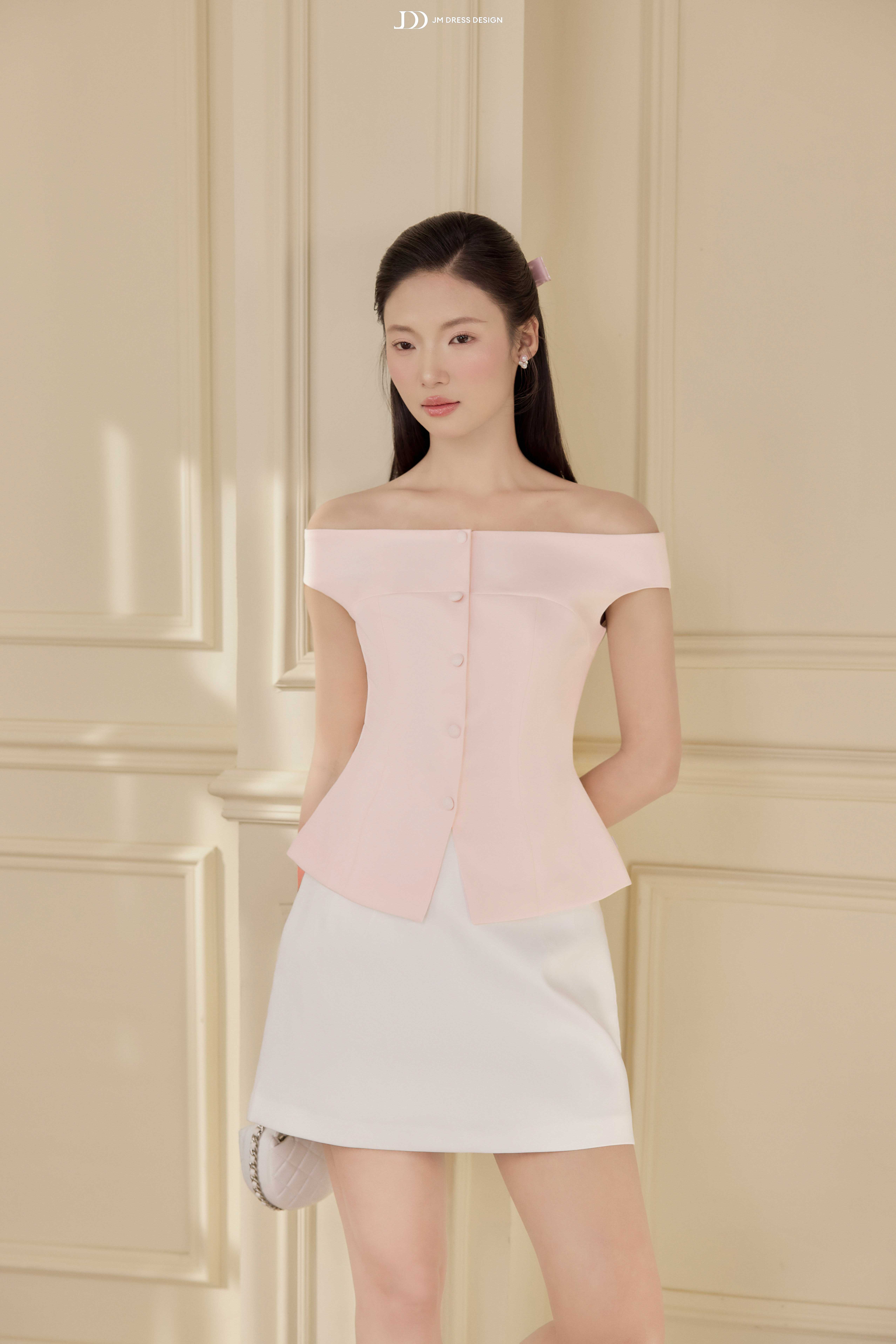 hẹ nhàng như một ký ức trong trẻo, thiết kế này mang đến hình ảnh người phụ nữ hiện đại với vẻ đẹp nữ tính được thể hiện một cách tinh tế và đầy kiểm soát. Sự mềm mại không đến từ phô trương, mà từ những đường nét vừa đủ để tôn lên phong thái thanh lịch và cảm giác an yên trong từng khoảnh khắc.