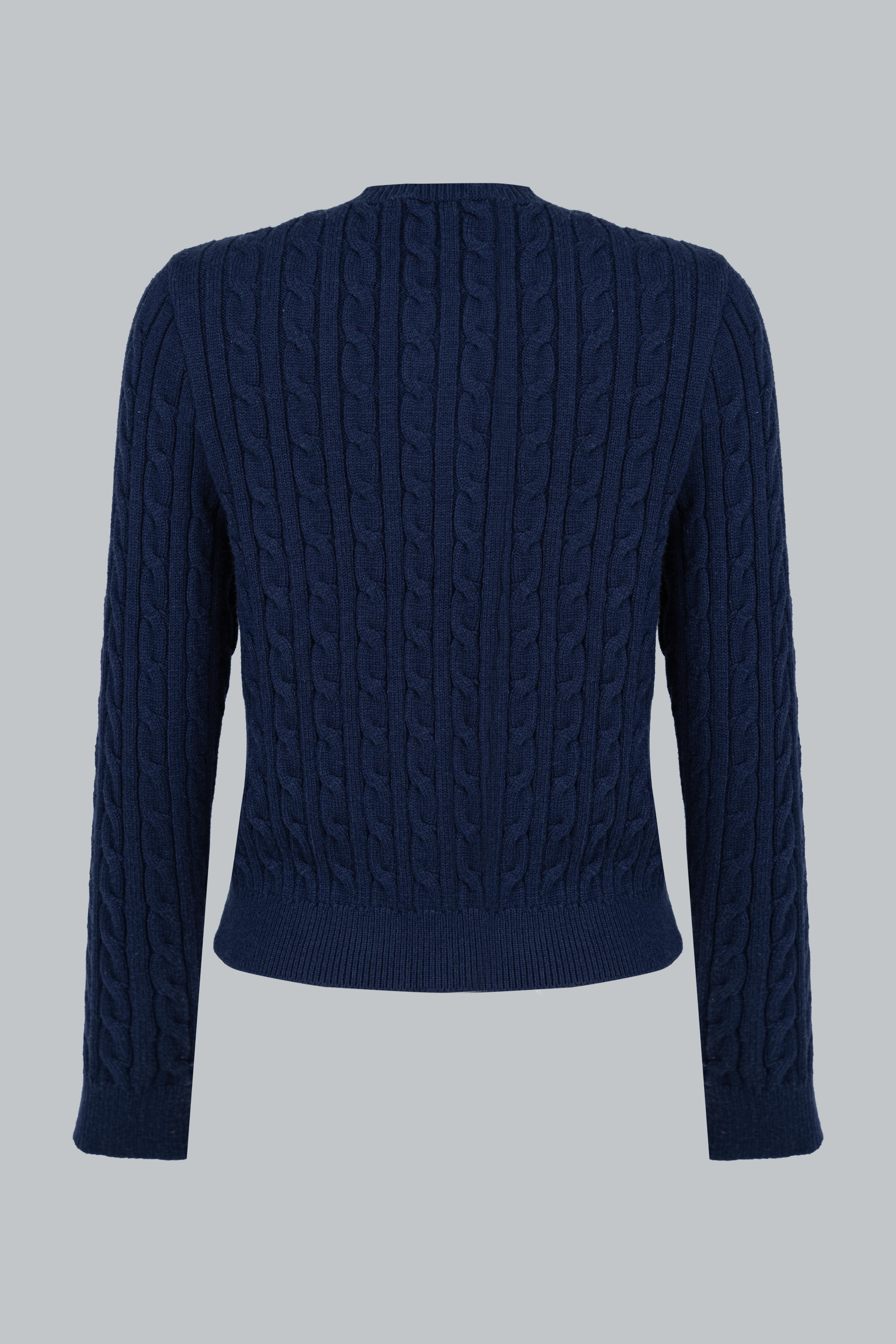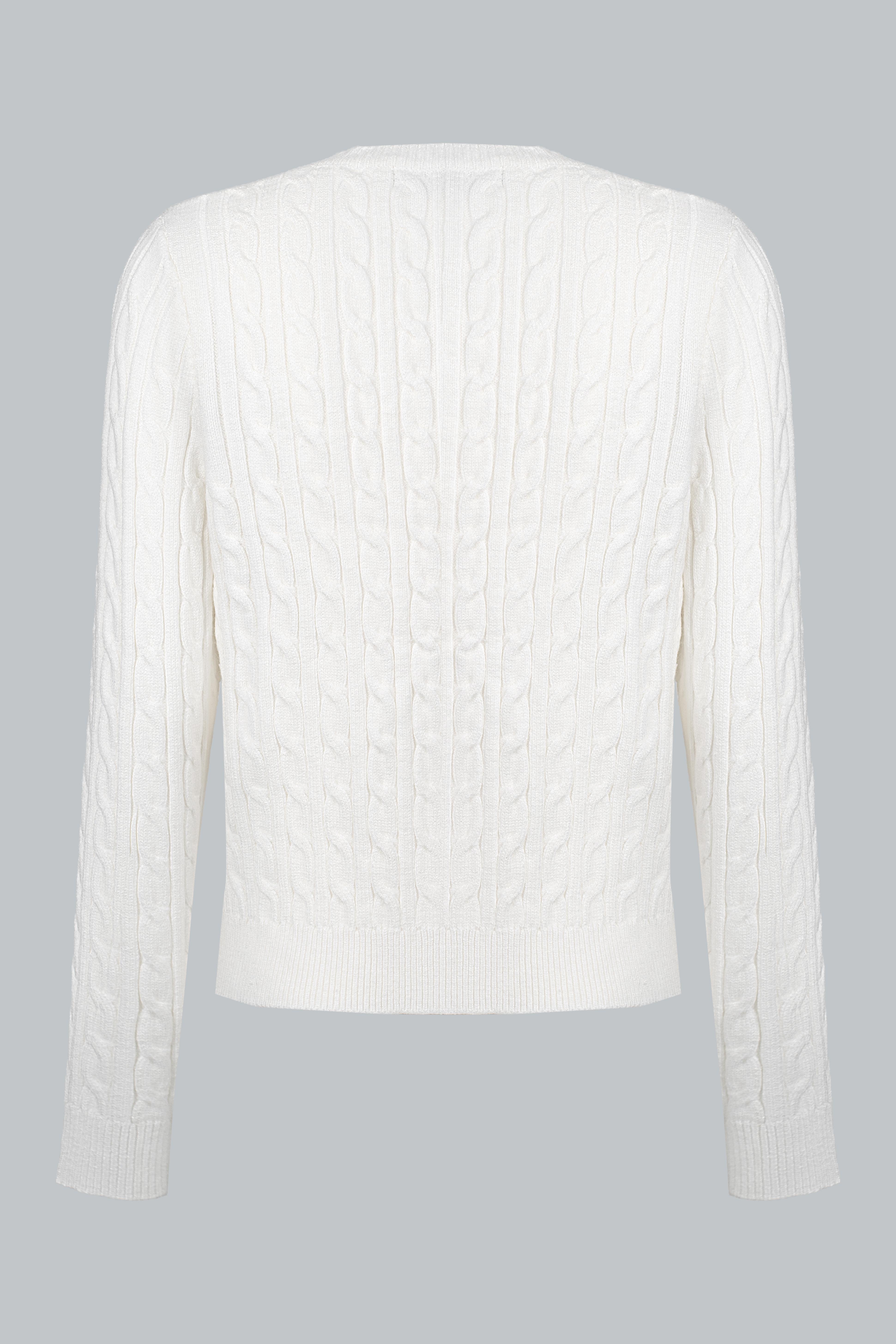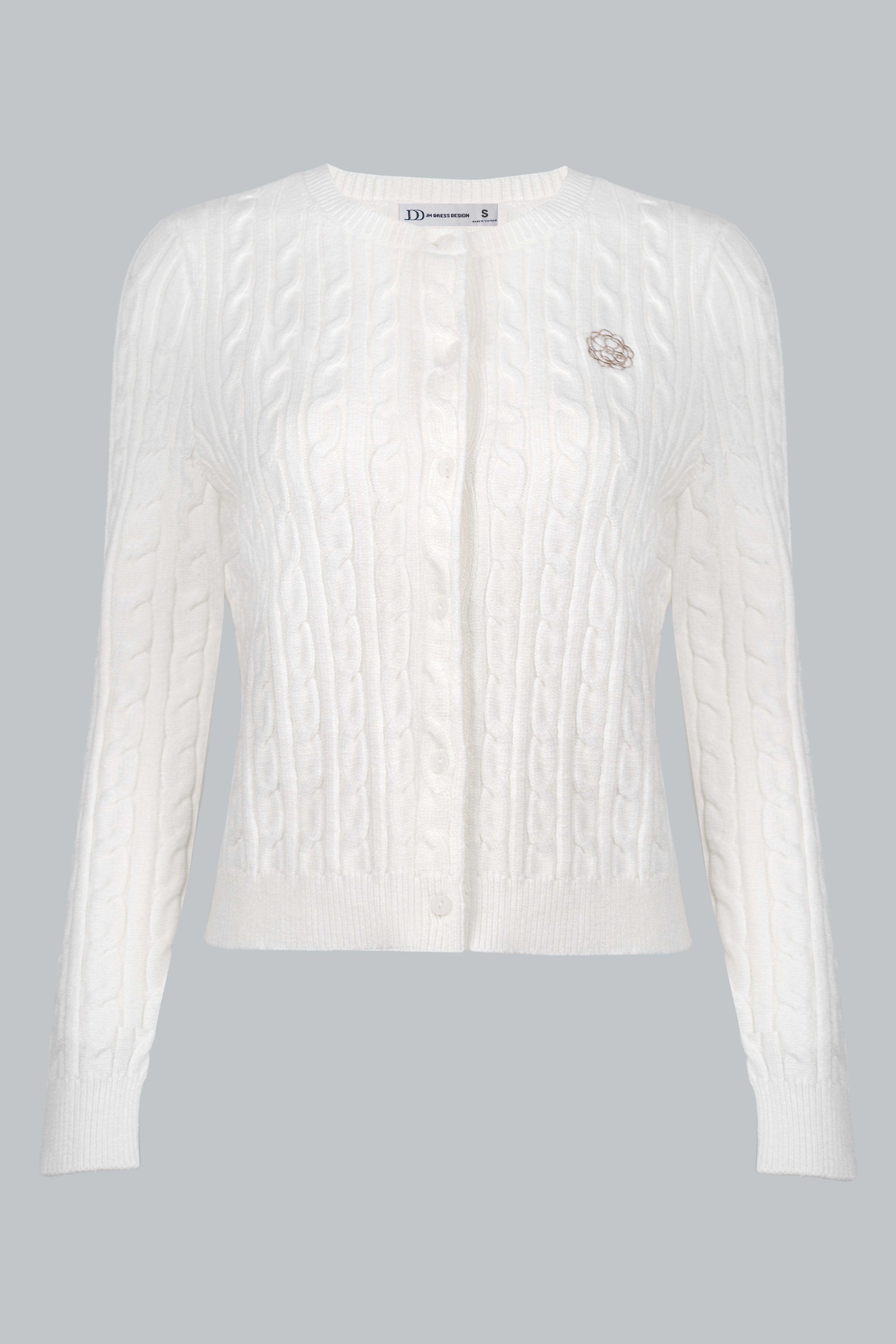 Chiếc cardigan được đan với họa tiết vặn thừng chạy dọc thân, tạo cảm giác nổi khối và sinh động.