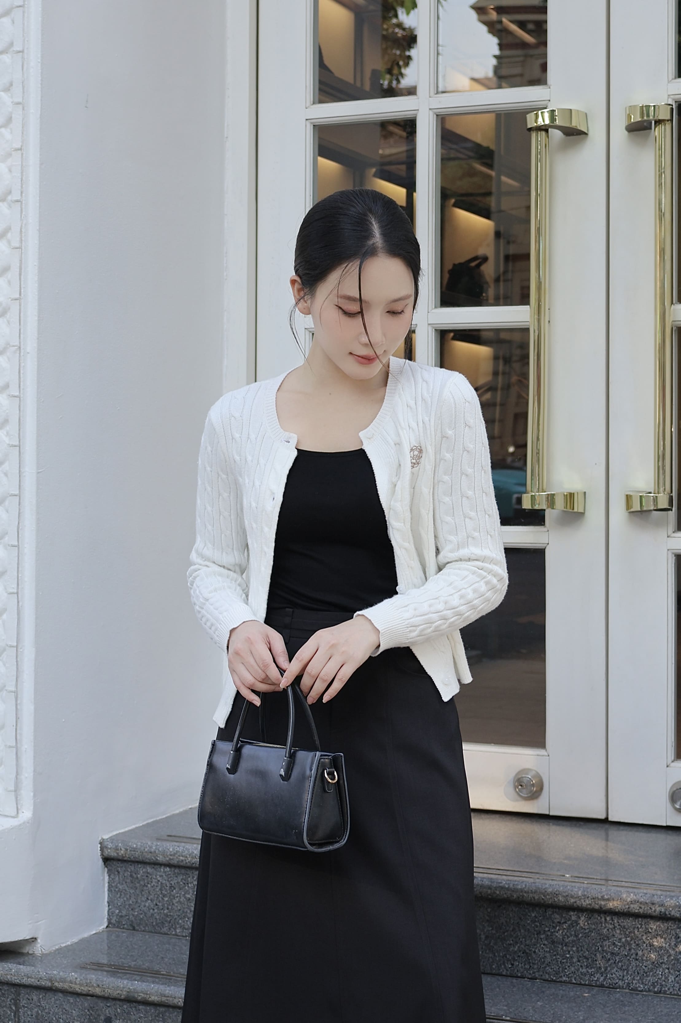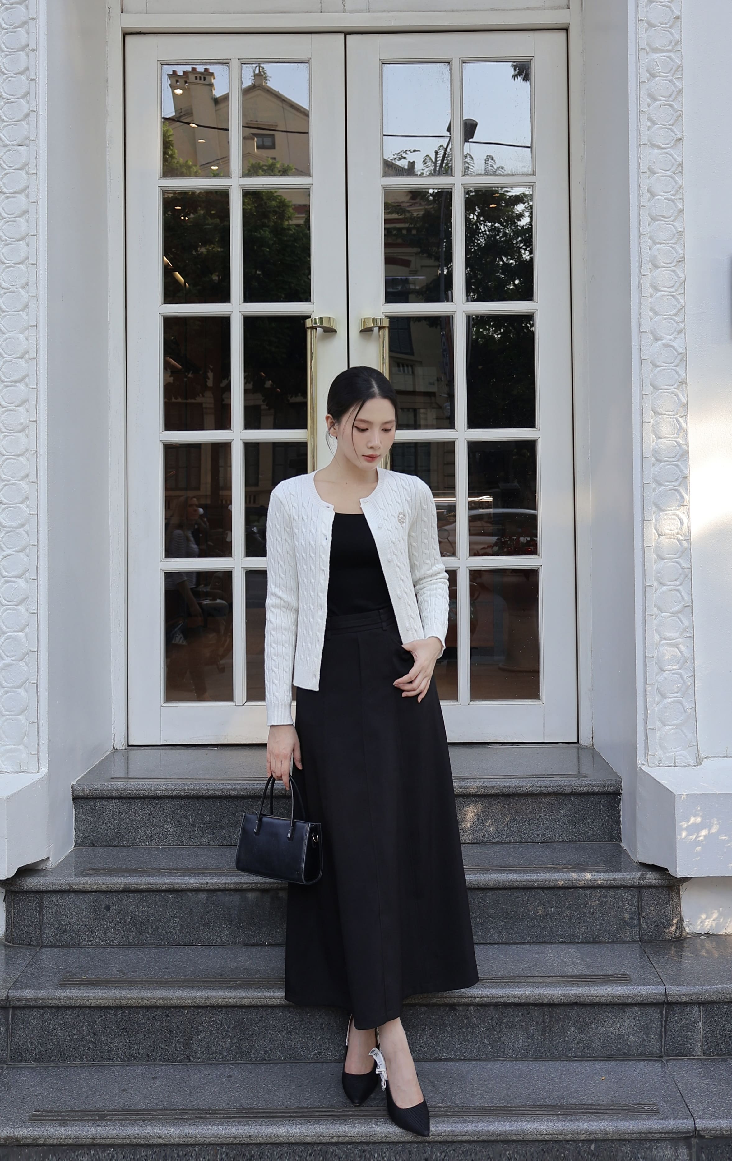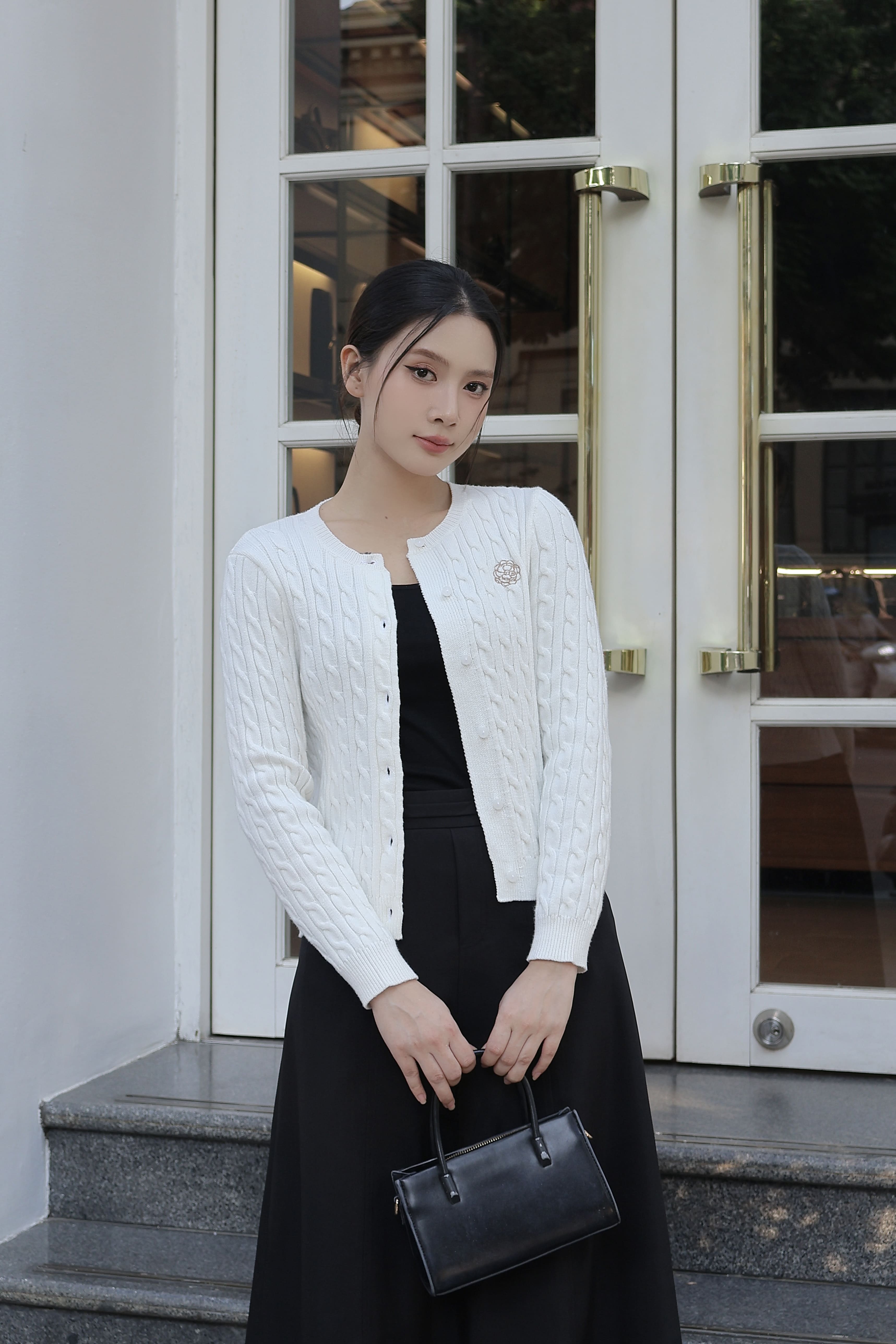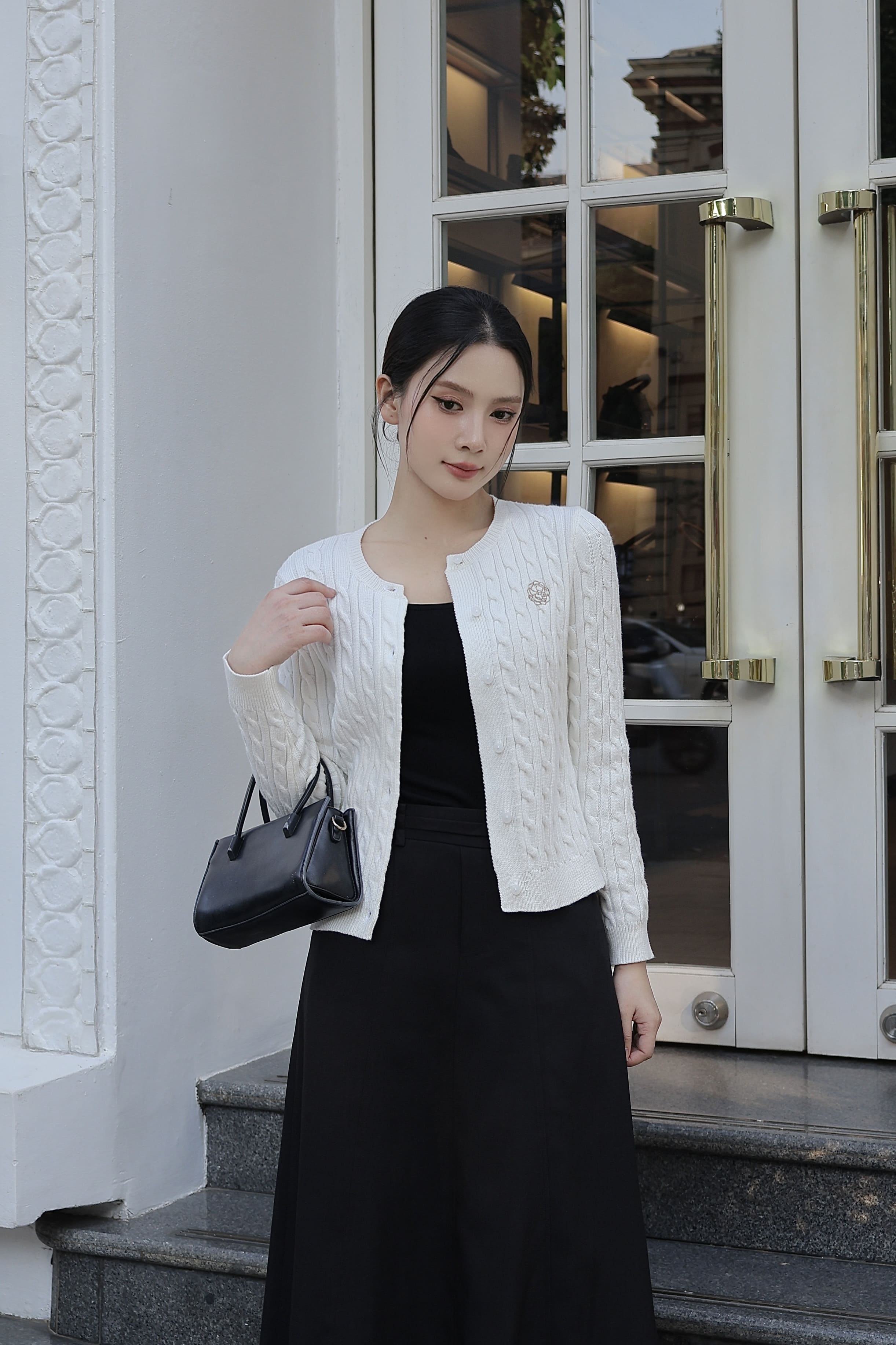 Chiếc cardigan dễ dàng kết hợp cùng áo cổ lọ, váy liền trơn, hoặc chân váy midi để tạo phong cách nhẹ nhàng, gần gũi. Nàng có thể khoác ngoài áo sơ mi trắng và quần suông, tạo vẻ năng động, tinh giản. Một đôi giày loafers hoặc sneakers trắng sẽ giúp tổng thể trở nên trẻ trung và tự nhiên.