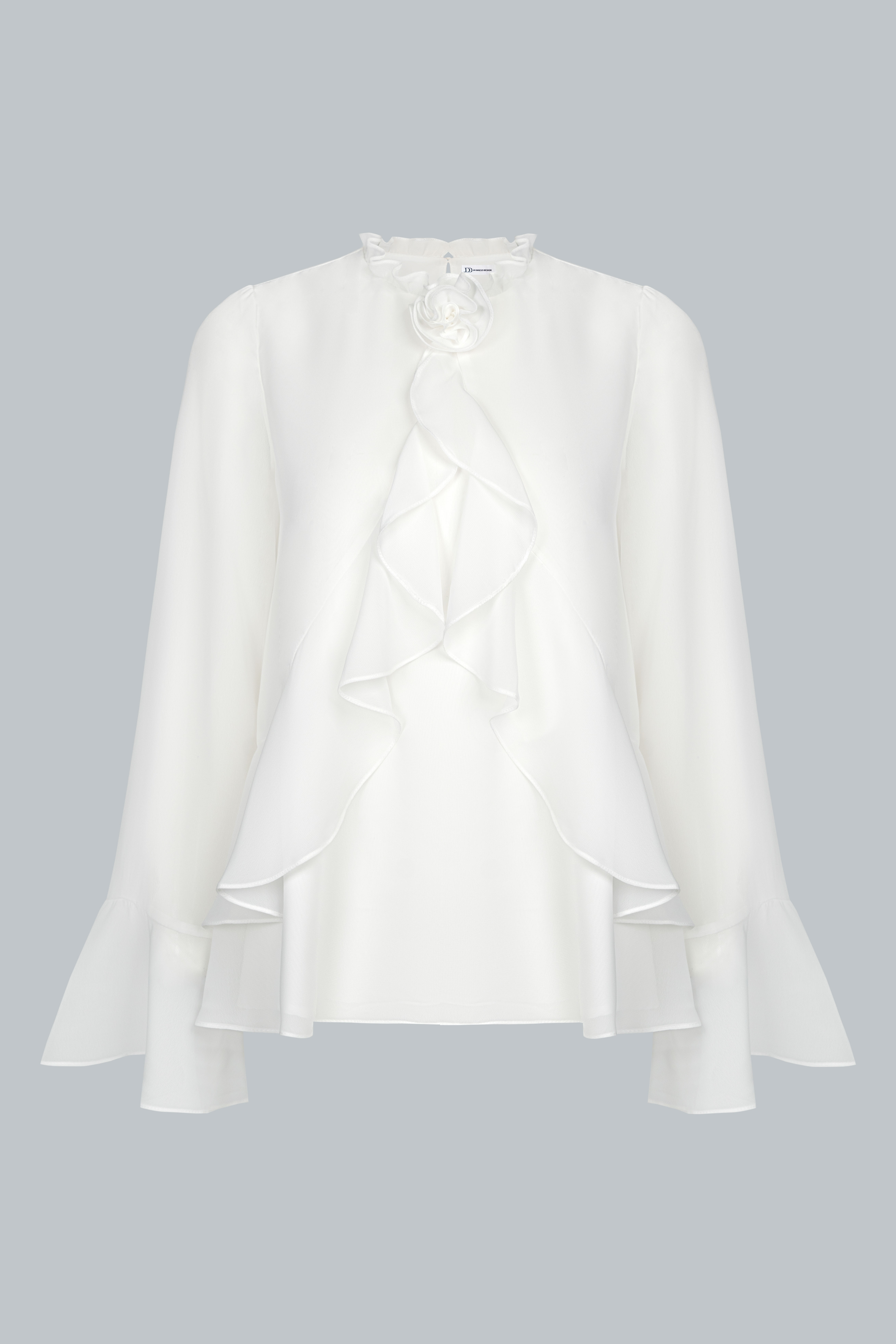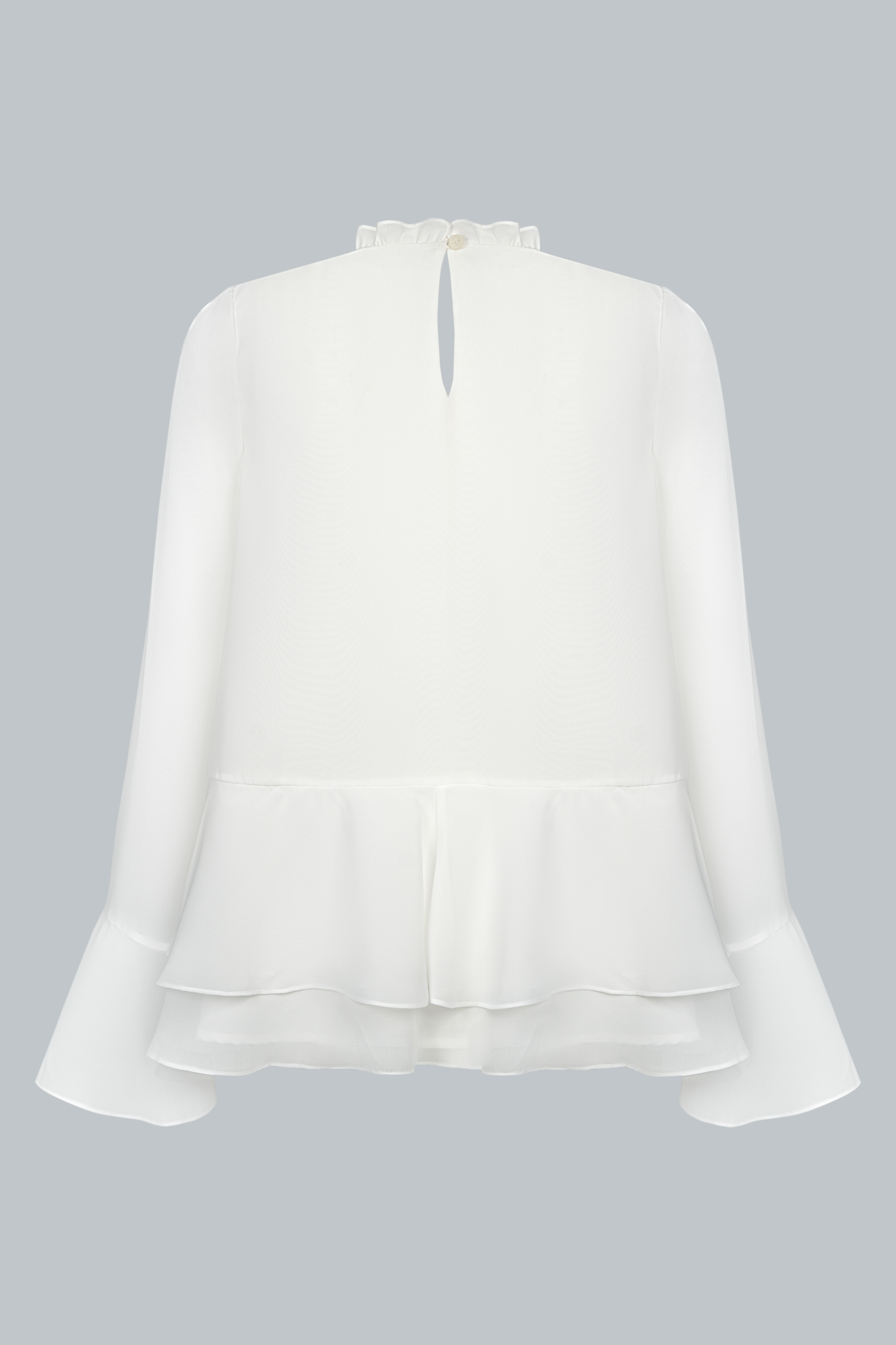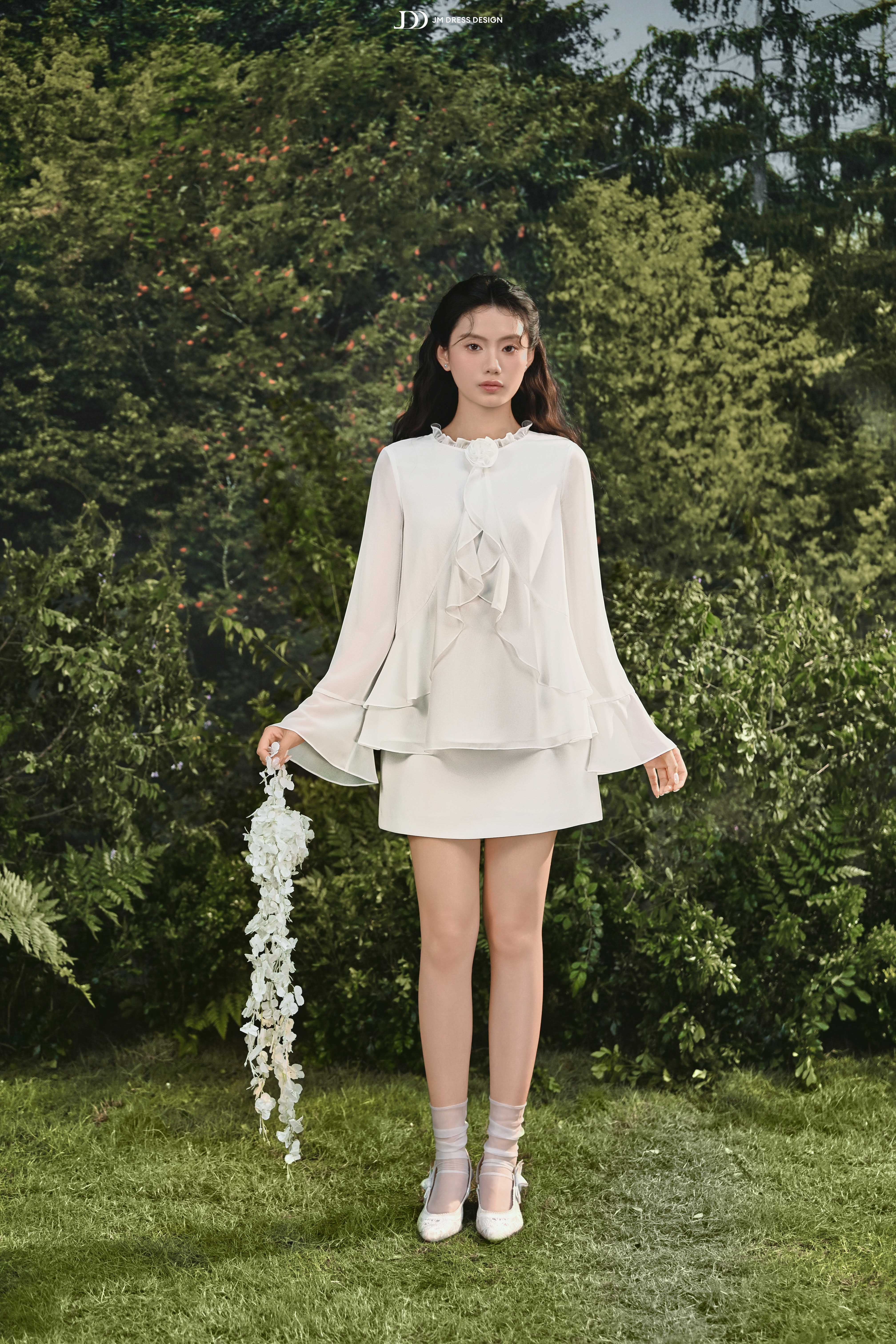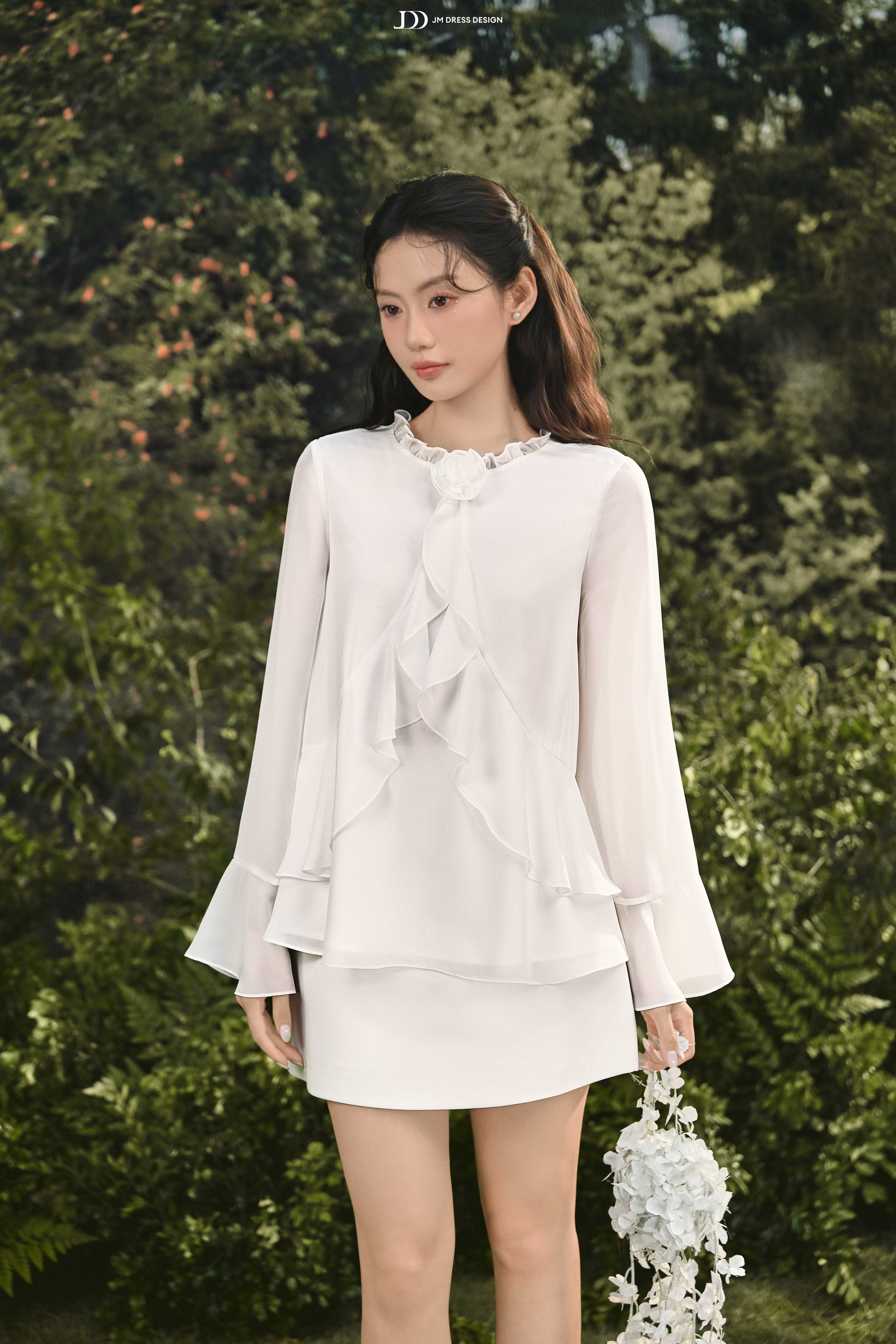 Tựa như một đám mây trắng mềm mại, mẫu áo này là hiện thân của vẻ đẹp nữ tính, lãng mạn và trong trẻo. Từng chi tiết bèo nhún, hoa vải 3D đều được chăm chút tỉ mỉ, tạo nên một tổng thể bay bổng, giúp người mặc toát lên nét duyên dáng, dịu dàng, trẻ trung nhưng vẫn rất trang trọng và thanh lịch.