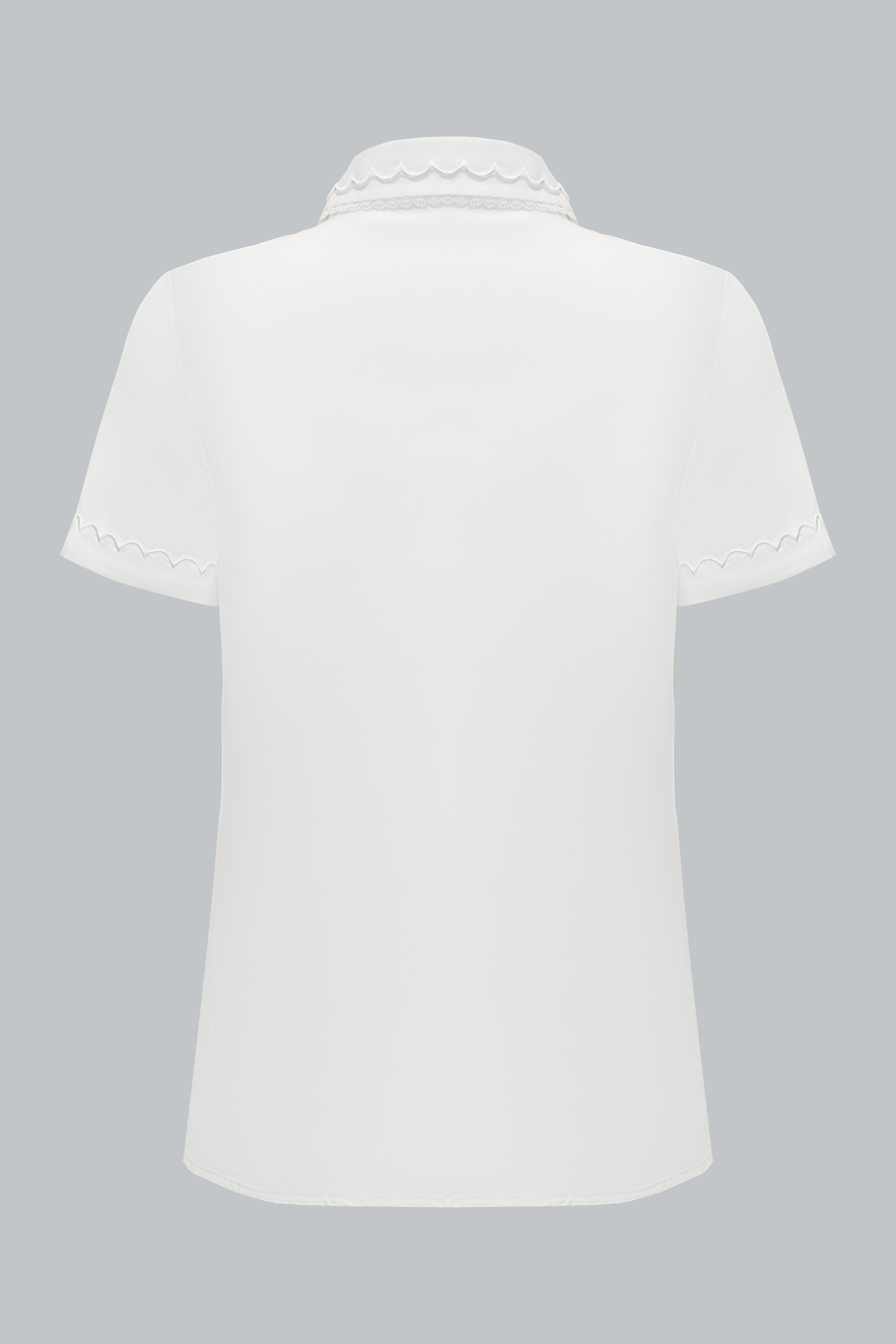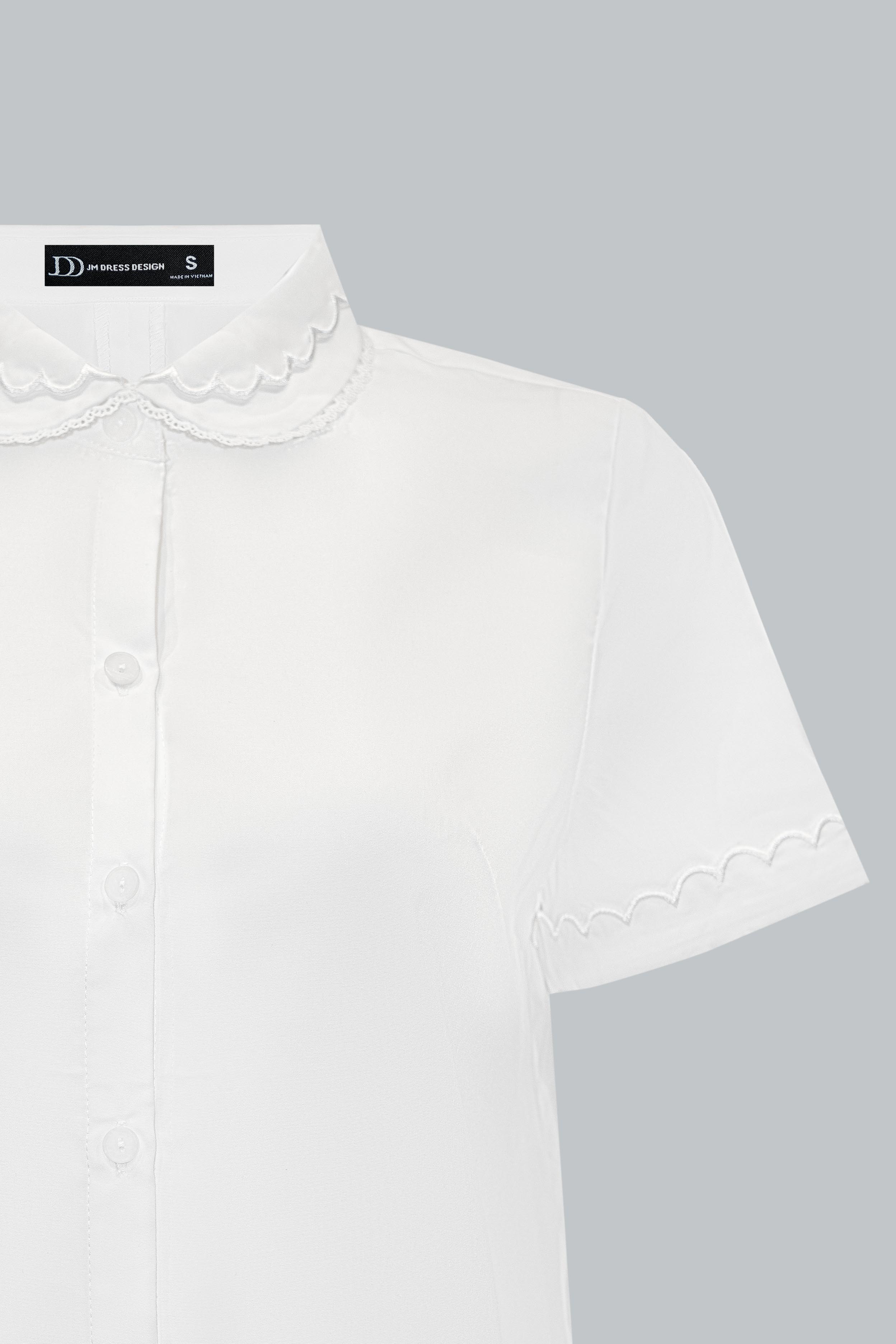 Phom dáng suông, vừa vặn thoải mái. Điểm nhấn nằm ở cổ 2 lá được bo viền lượn mềm mại, tạo sự nữ tính và khác biệt so với sơ mi truyền thống. Tay ngắn gọn gàng, viền tay cũng được xử lý lượn cùng tông, mang lại sự đồng bộ và duyên dáng. Hàng cúc đồng màu tối giản, dễ mặc và tinh tế trong từng chi tiết.
