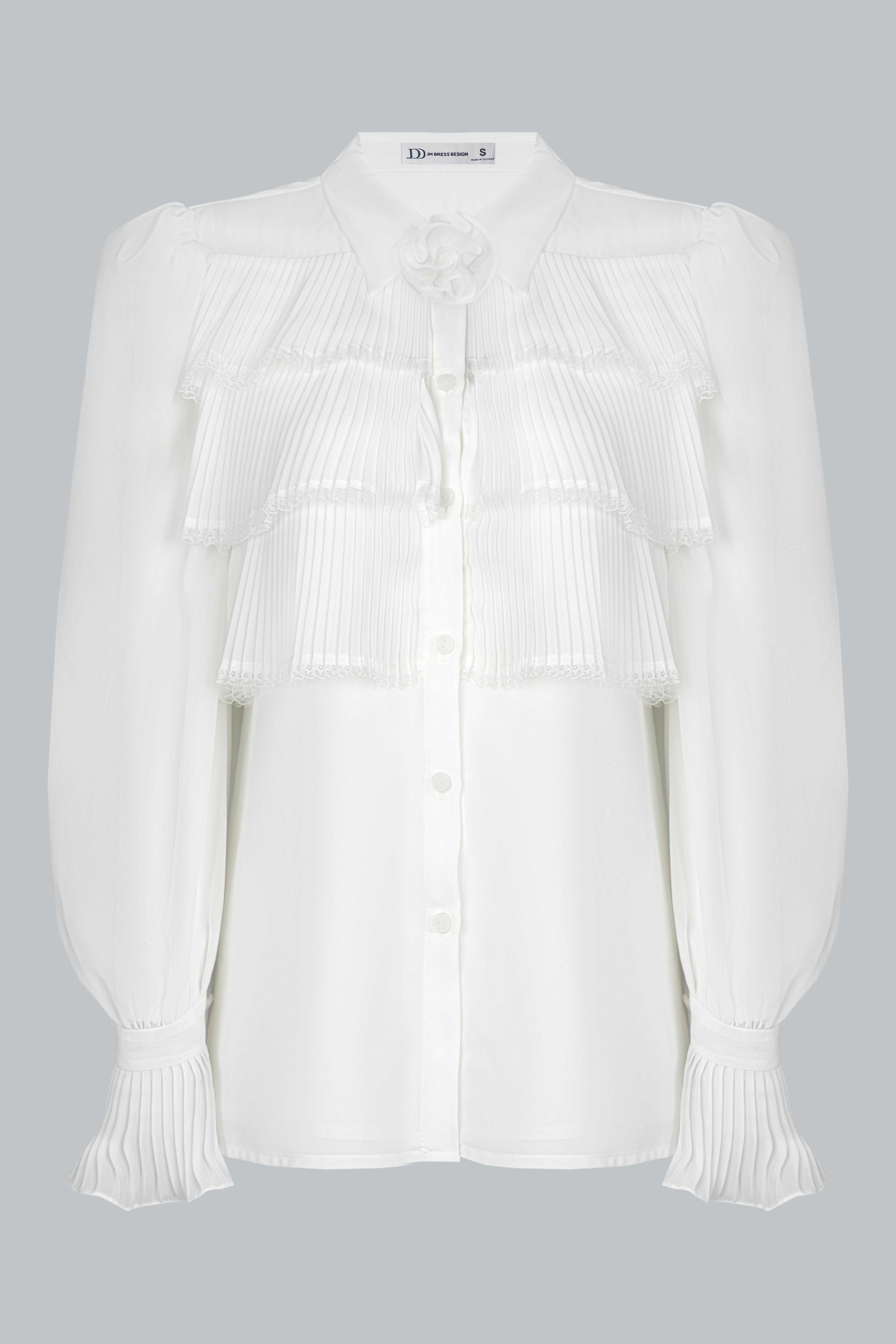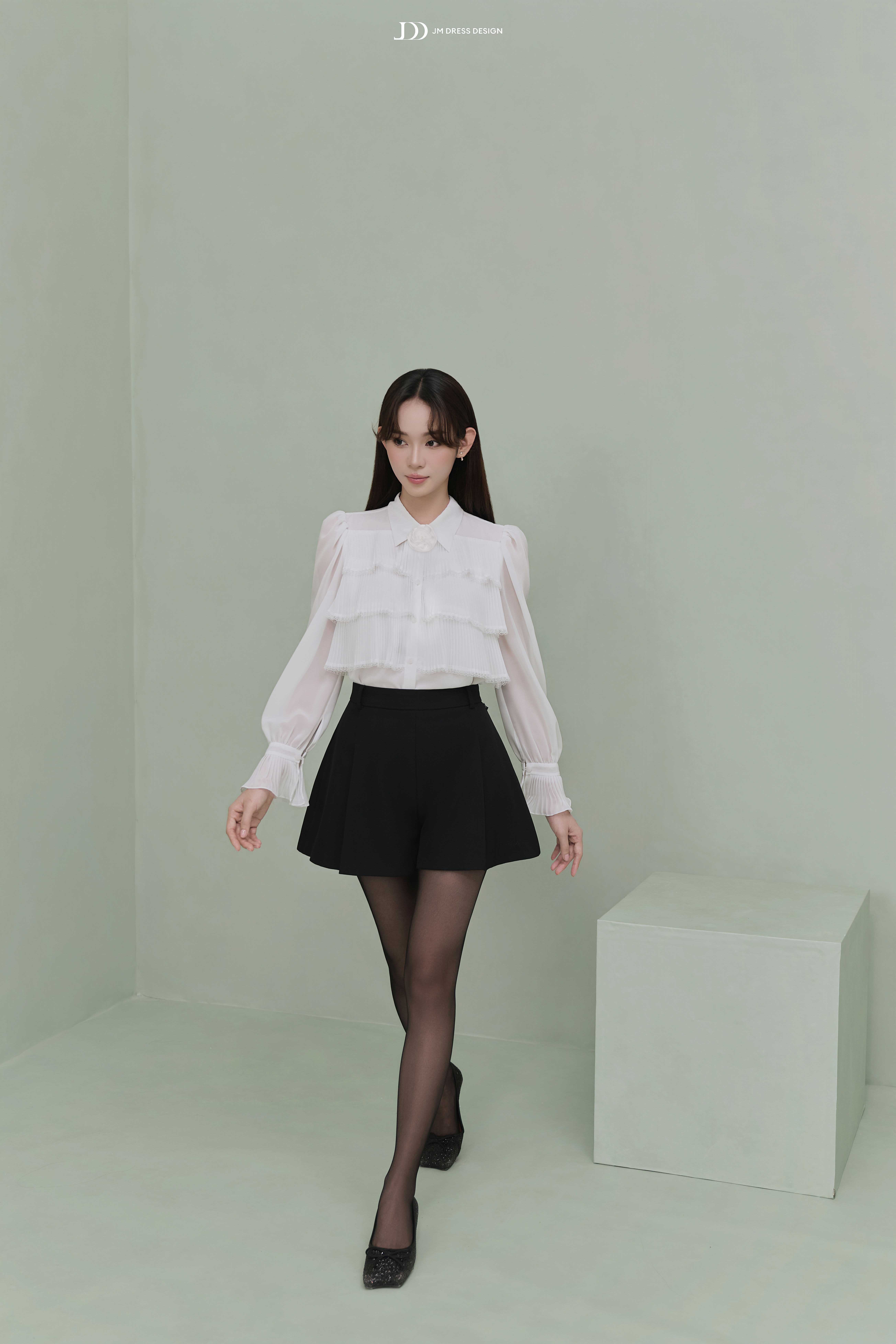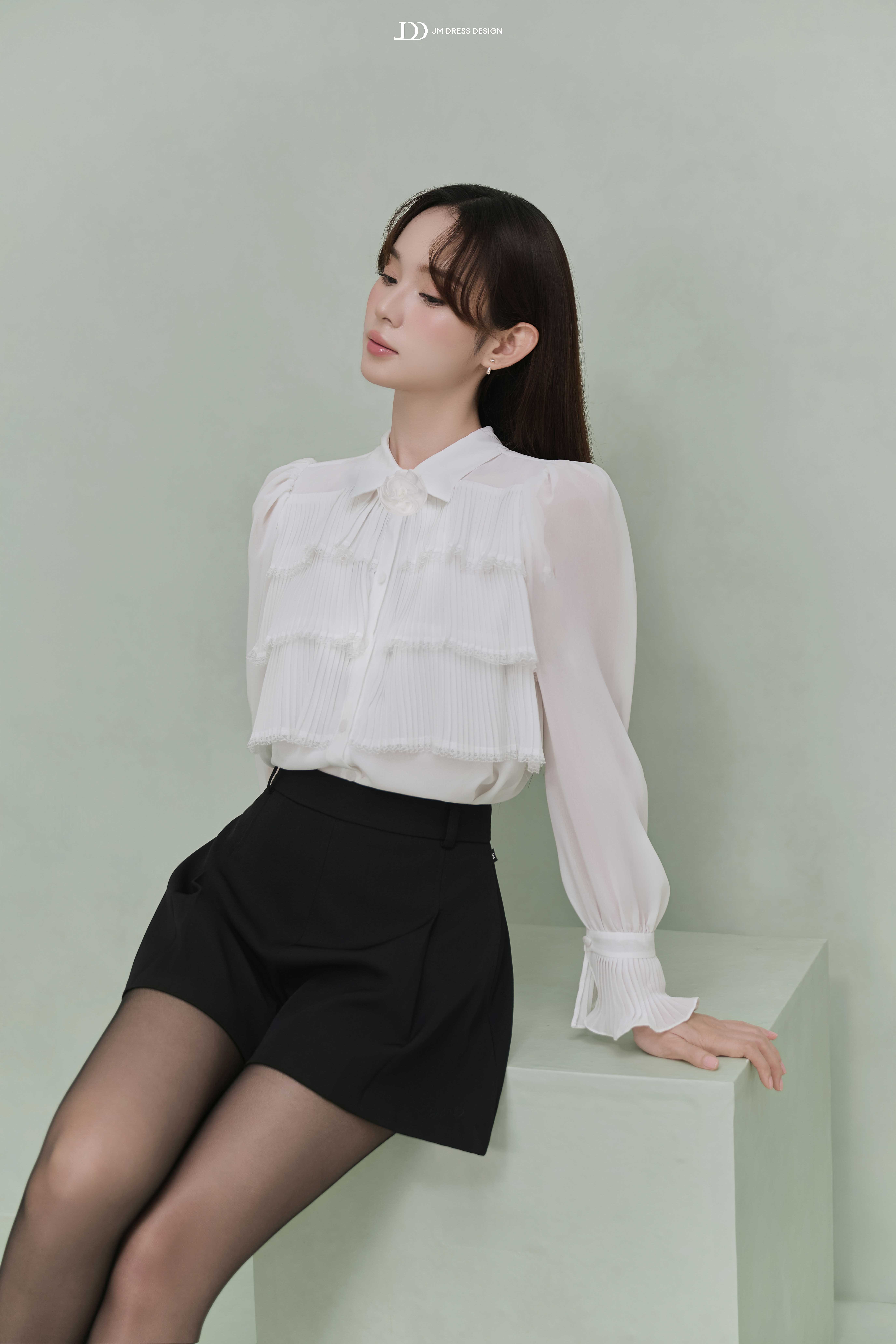 Áo blouse trắng form suông nhẹ, có độ rũ tự nhiên, mang đến cảm giác thoải mái nhưng vẫn giữ được vẻ chỉn chu. Phần tay dài phồng nhẹ bo viền bèo, phối cùng chi tiết bèo tầng trước ngực tạo nên vẻ tiểu thư cổ điển. Chiếc nơ đen nhỏ nơi cổ áo như một điểm nhấn mang hơi thở preppy, gợi liên tưởng đến những thiếu nữ Pháp thanh lịch và trí thức. Thiết kế không ôm sát, mà thả dáng mềm mại, khiến mỗi chuyển động đều nhẹ như một làn mây lướt qua.