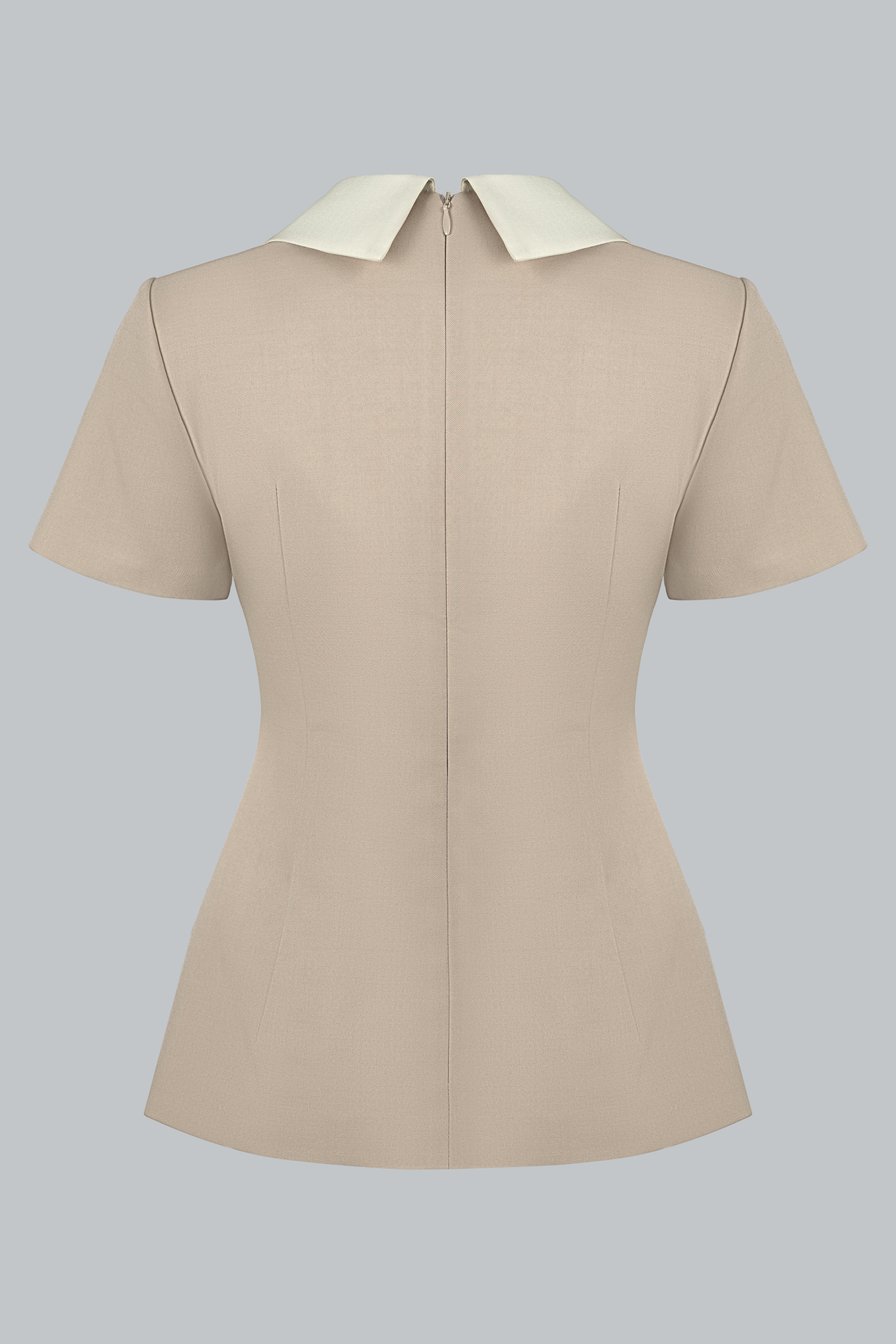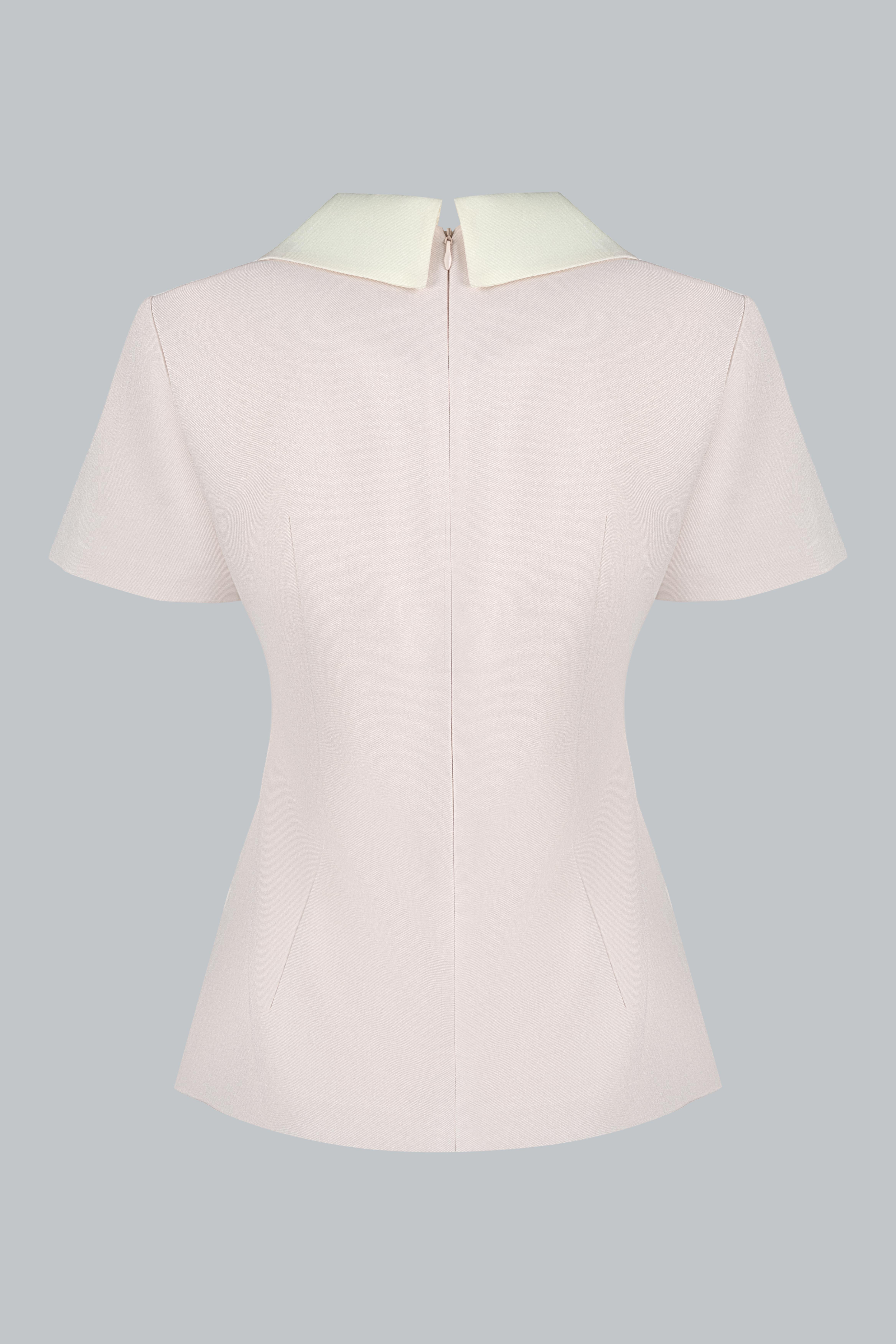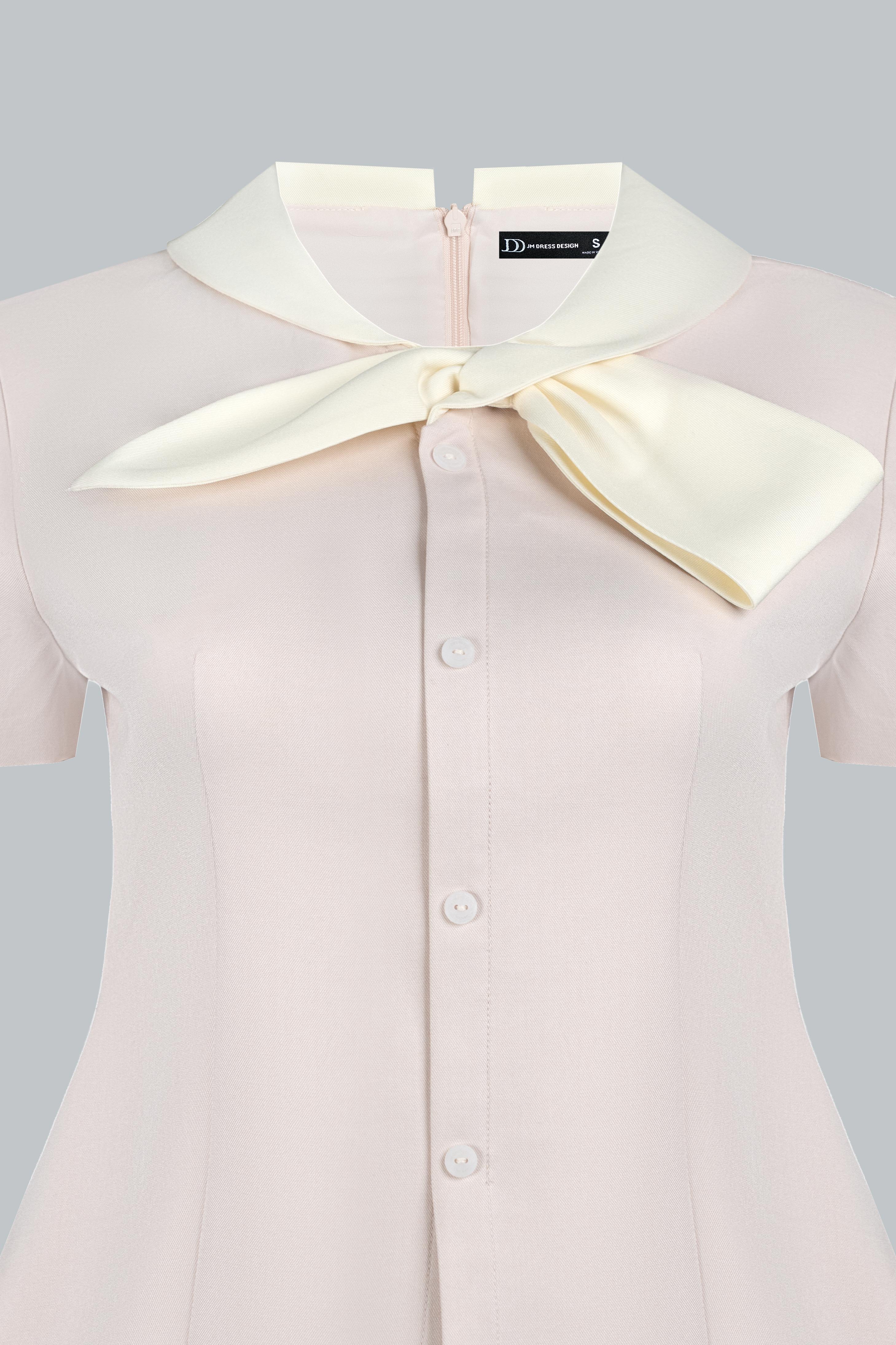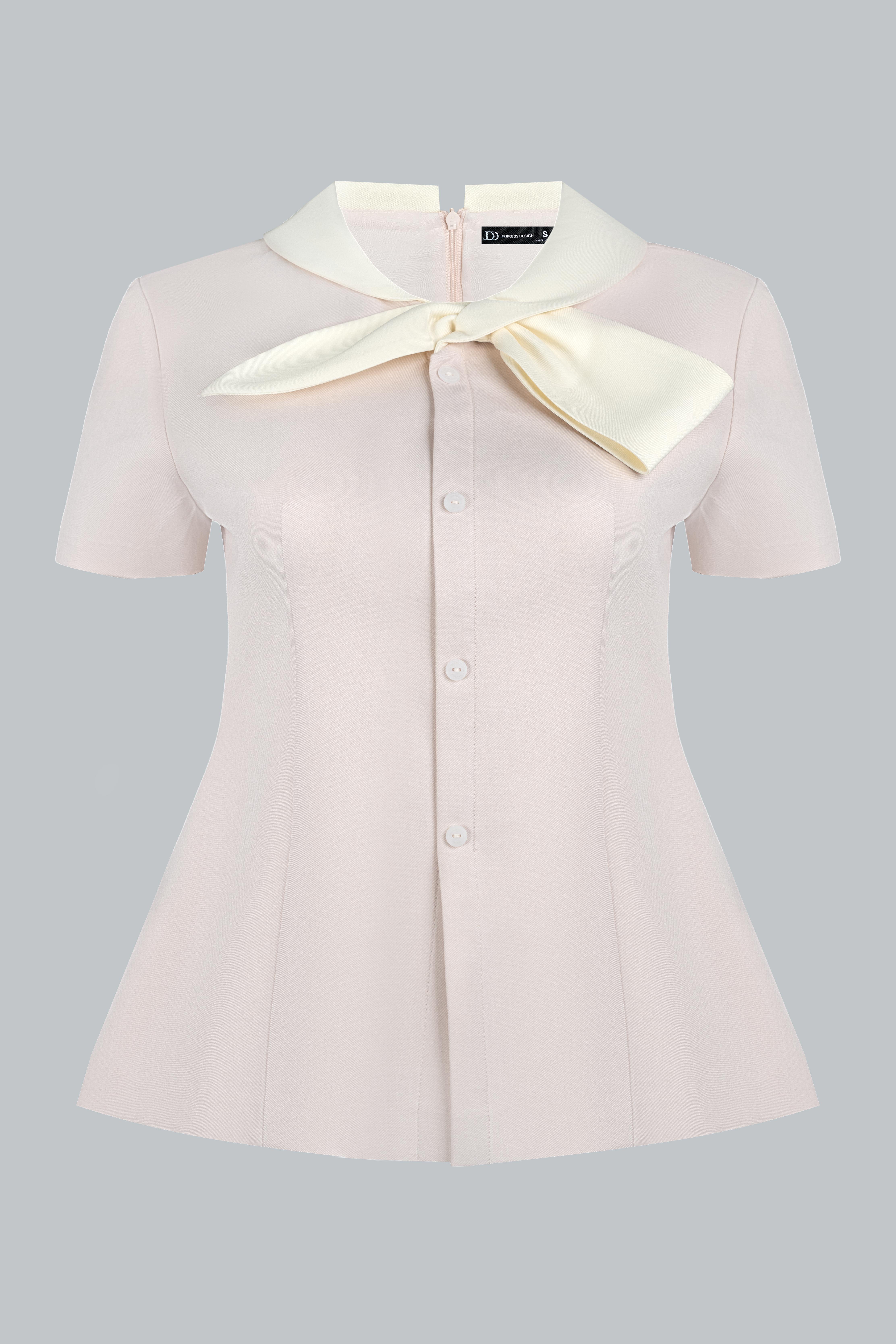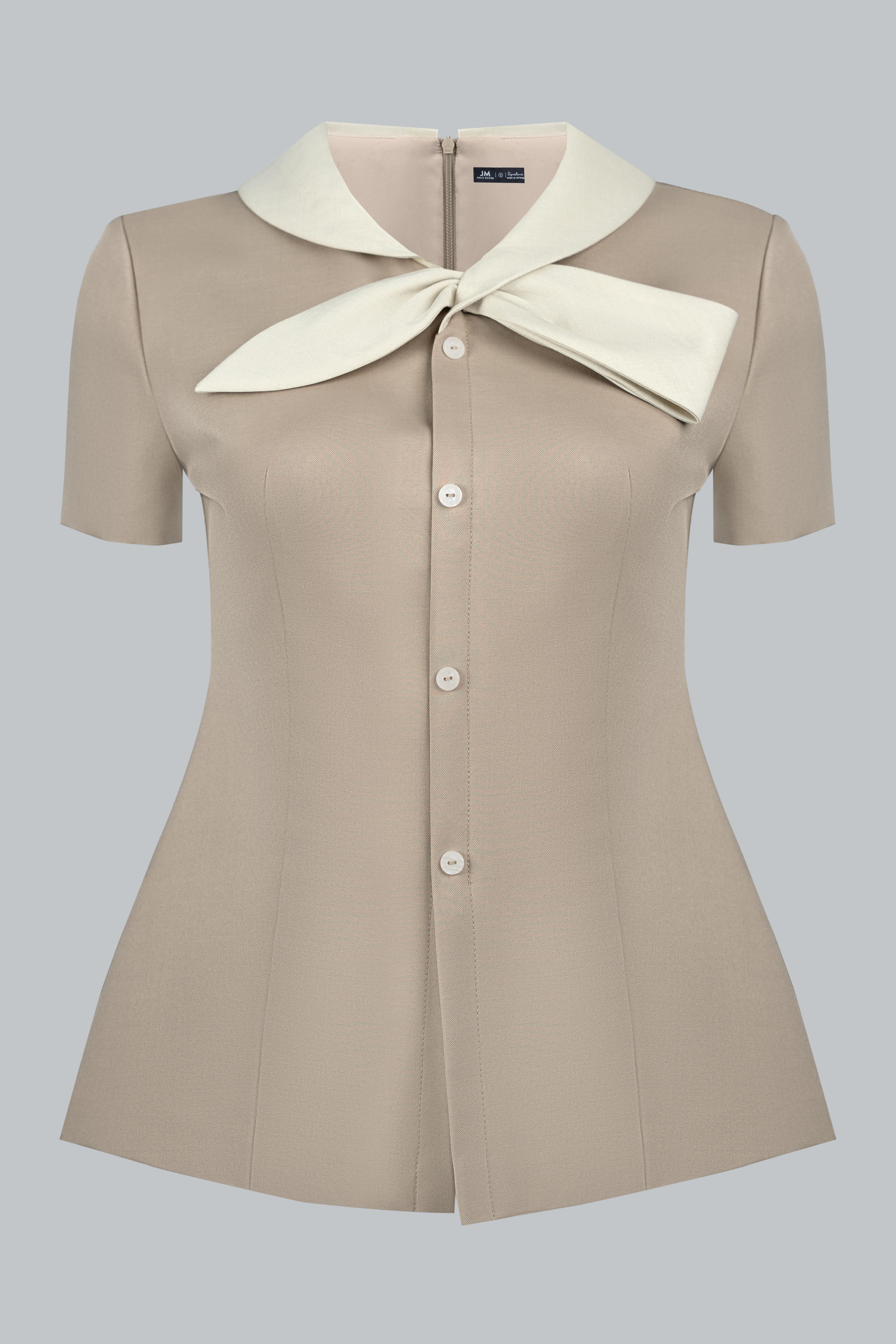 Áo dáng semi-fit ôm nhẹ phần thân trên, giúp tổng thể gọn gàng và tôn dáng. Điểm nhấn nằm ở chi tiết cổ sen kết hợp nơ bản lớn mang lại vẻ nữ tính và thanh lịch. Các đường cắt được xử lý tối giản để giữ tổng thể cân đối và dễ ứng dụng trong nhiều hoàn cảnh thường ngày.