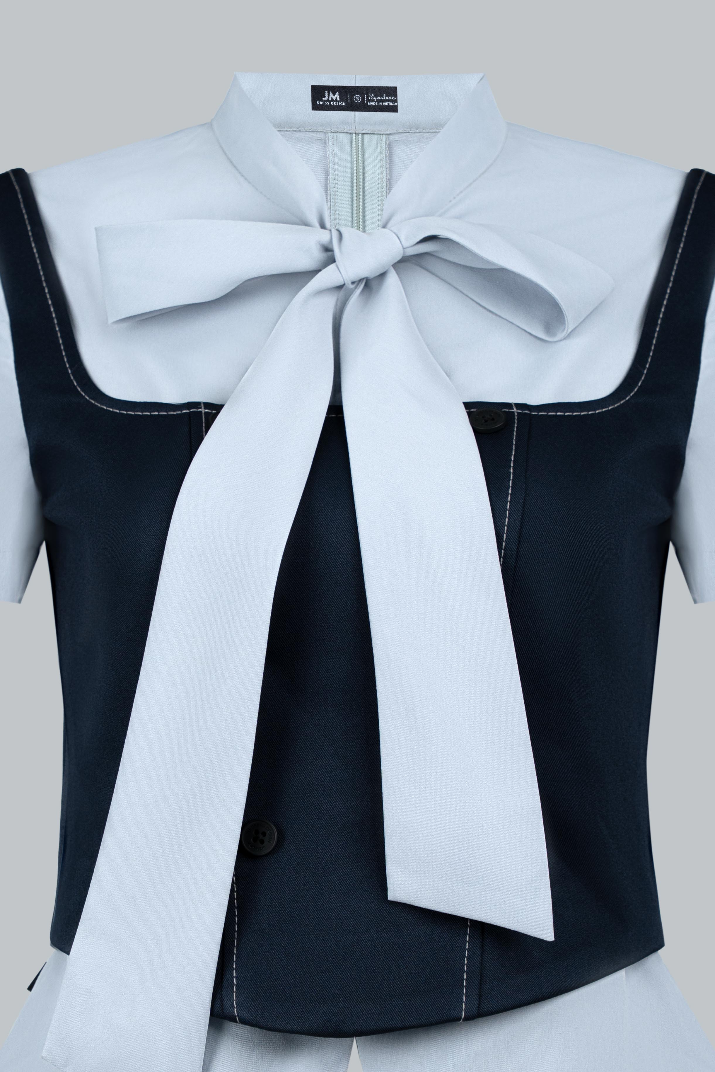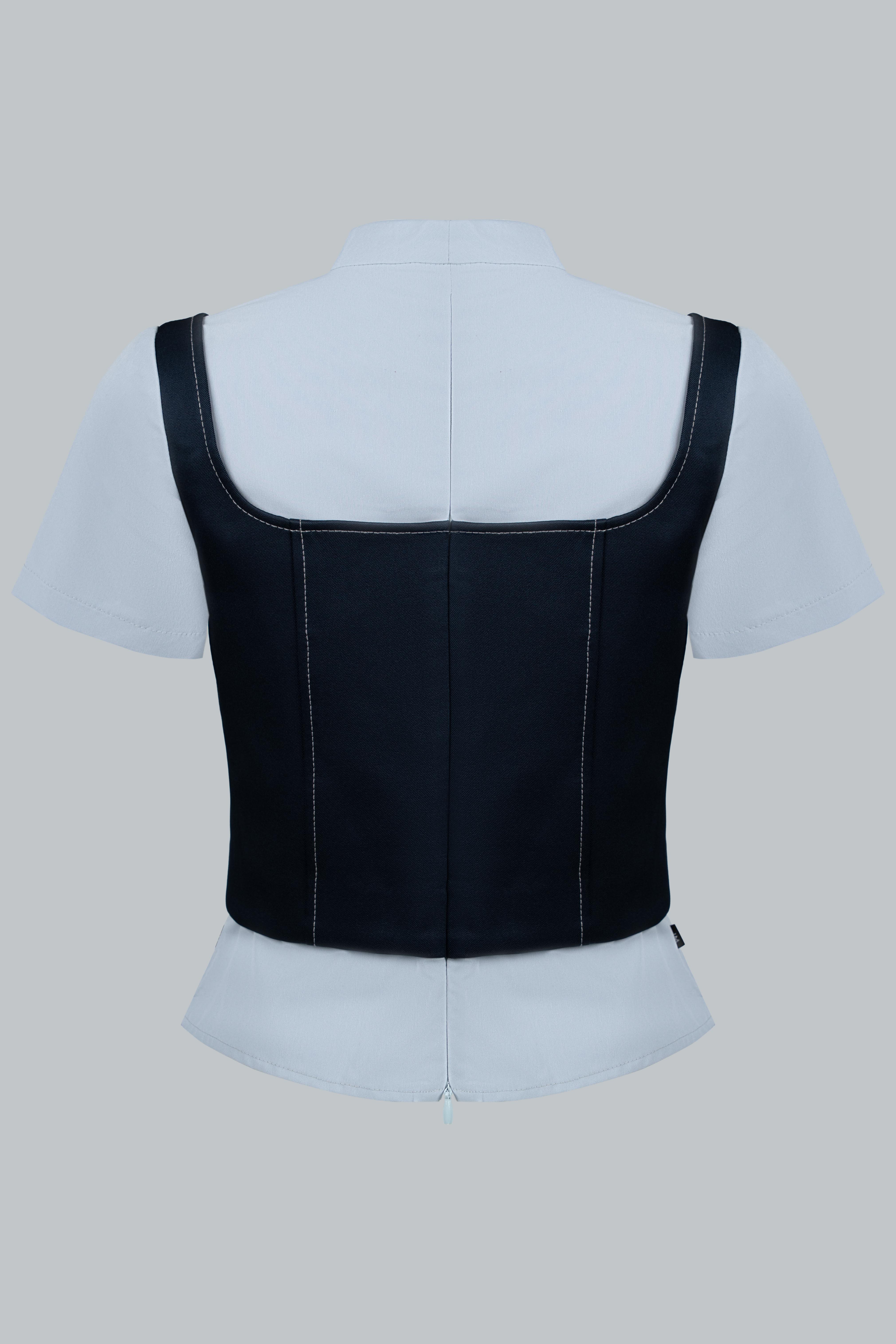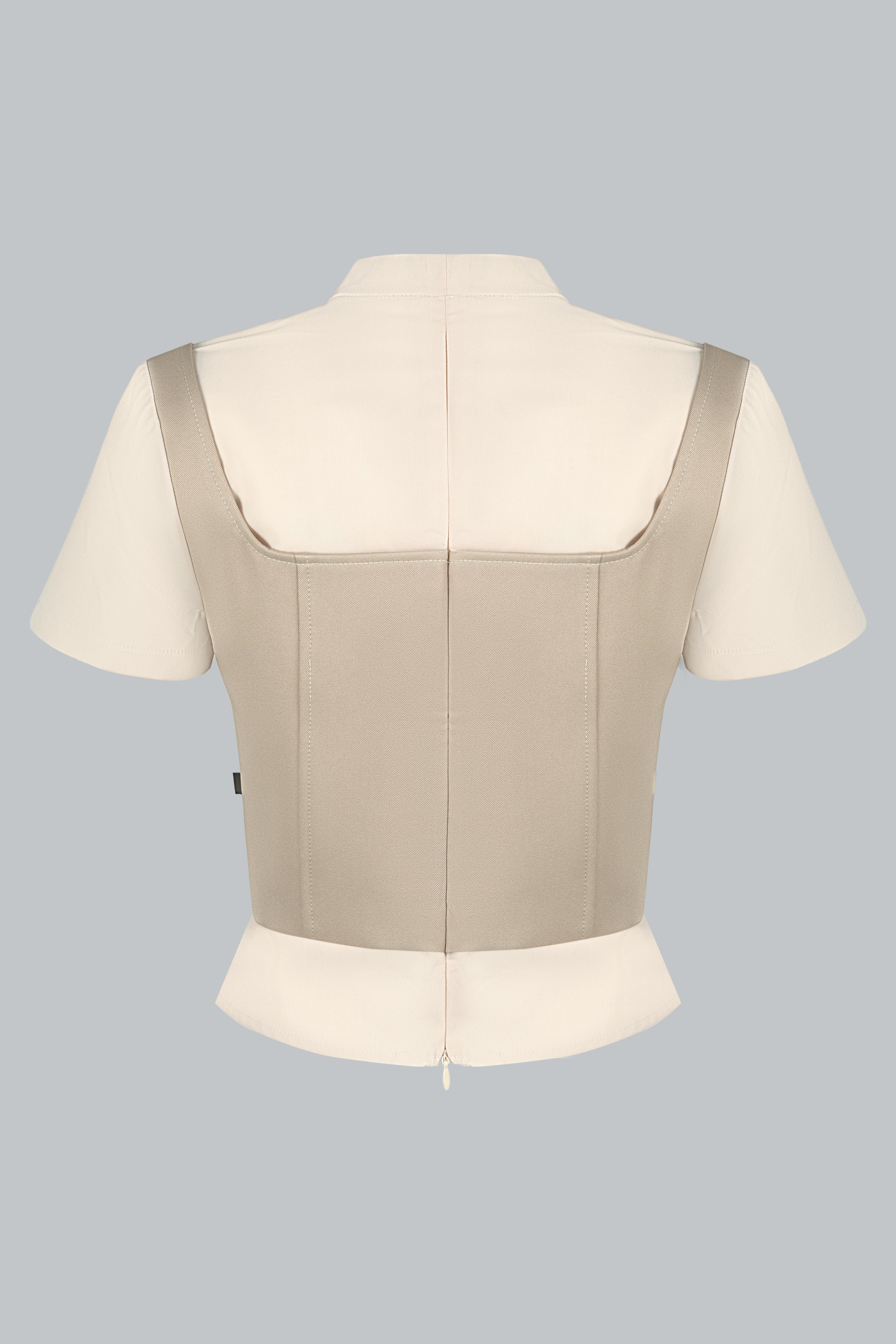 Áo được xử lý theo cấu trúc hai lớp với sơ mi poplin bên trong và lớp áo ngoài mang phom corset nhẹ. Phần corset được tiết chế để tạo hiệu ứng định hình vòng eo nhưng vẫn giữ sự thoải mái khi mặc.