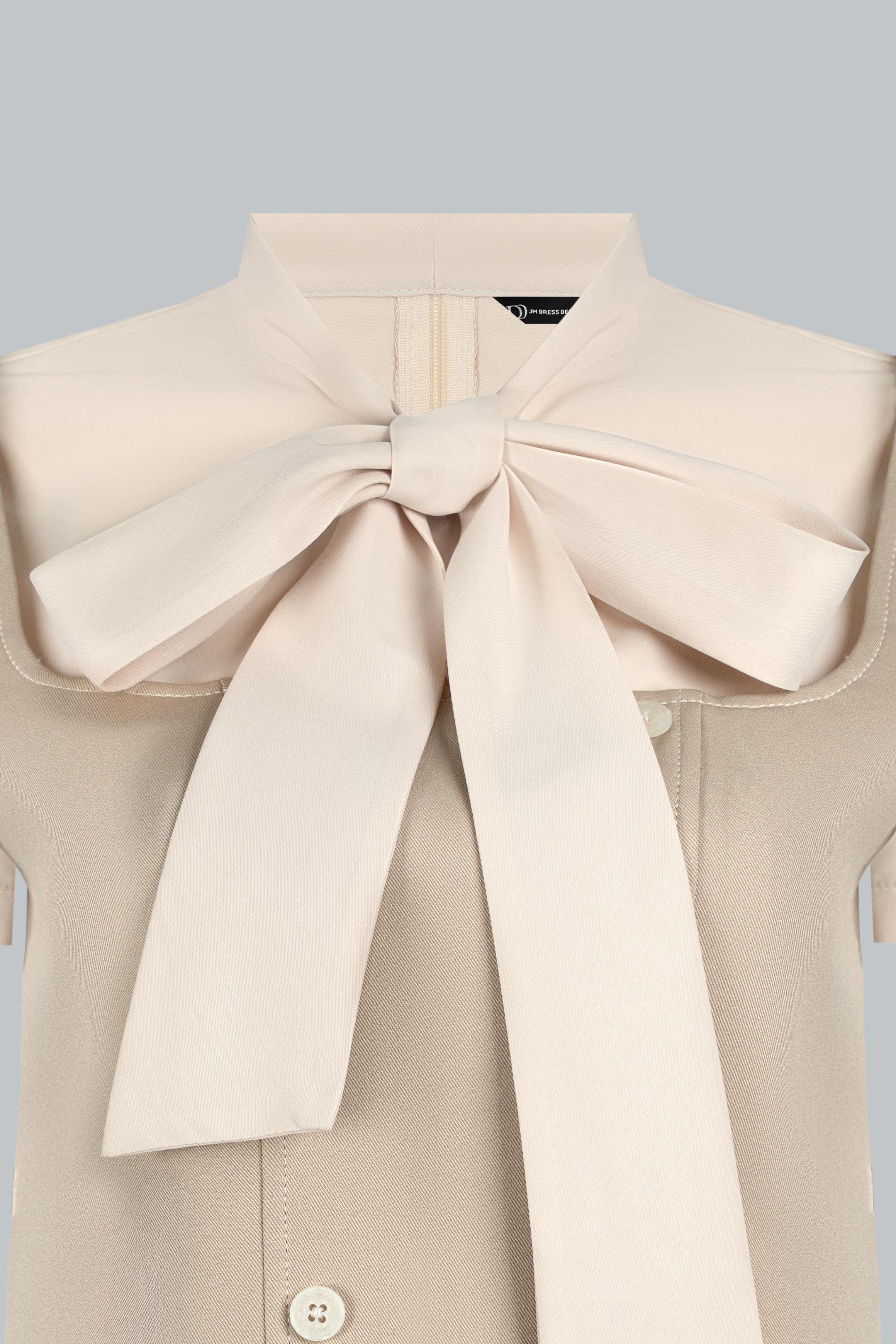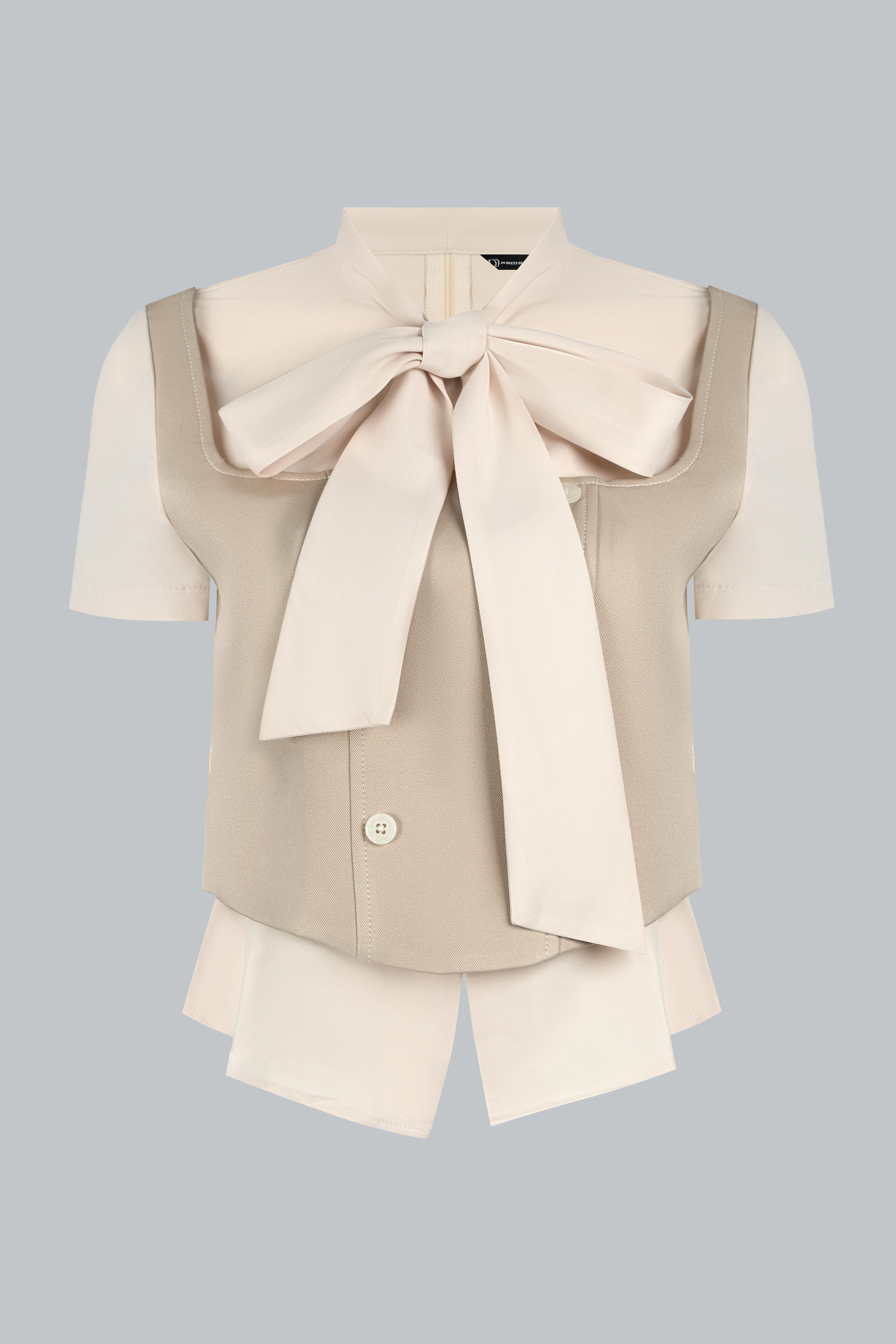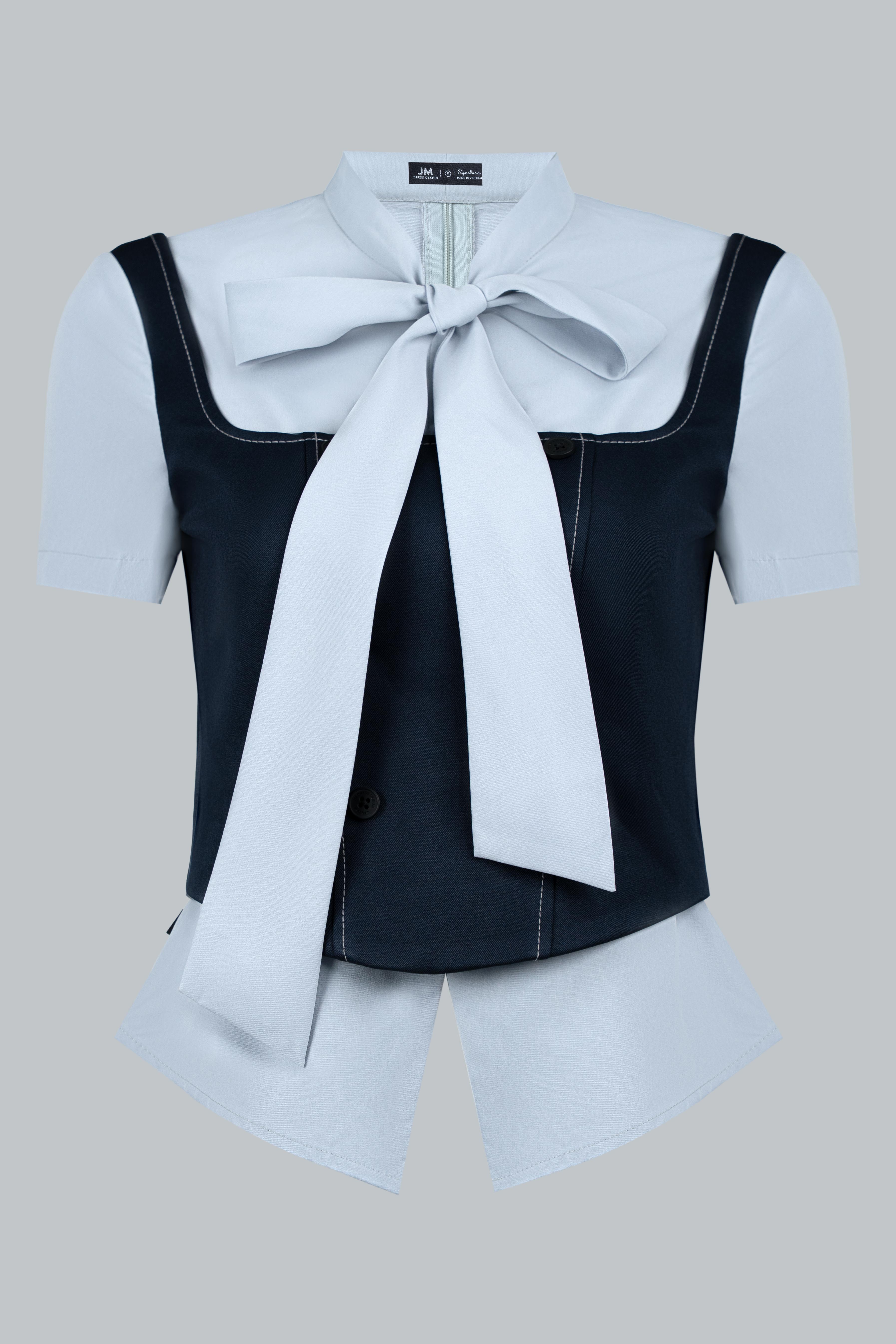 Áo được xử lý theo cấu trúc hai lớp với sơ mi poplin bên trong và lớp áo ngoài mang phom corset nhẹ. Phần corset được tiết chế để tạo hiệu ứng định hình vòng eo nhưng vẫn giữ sự thoải mái khi mặc.