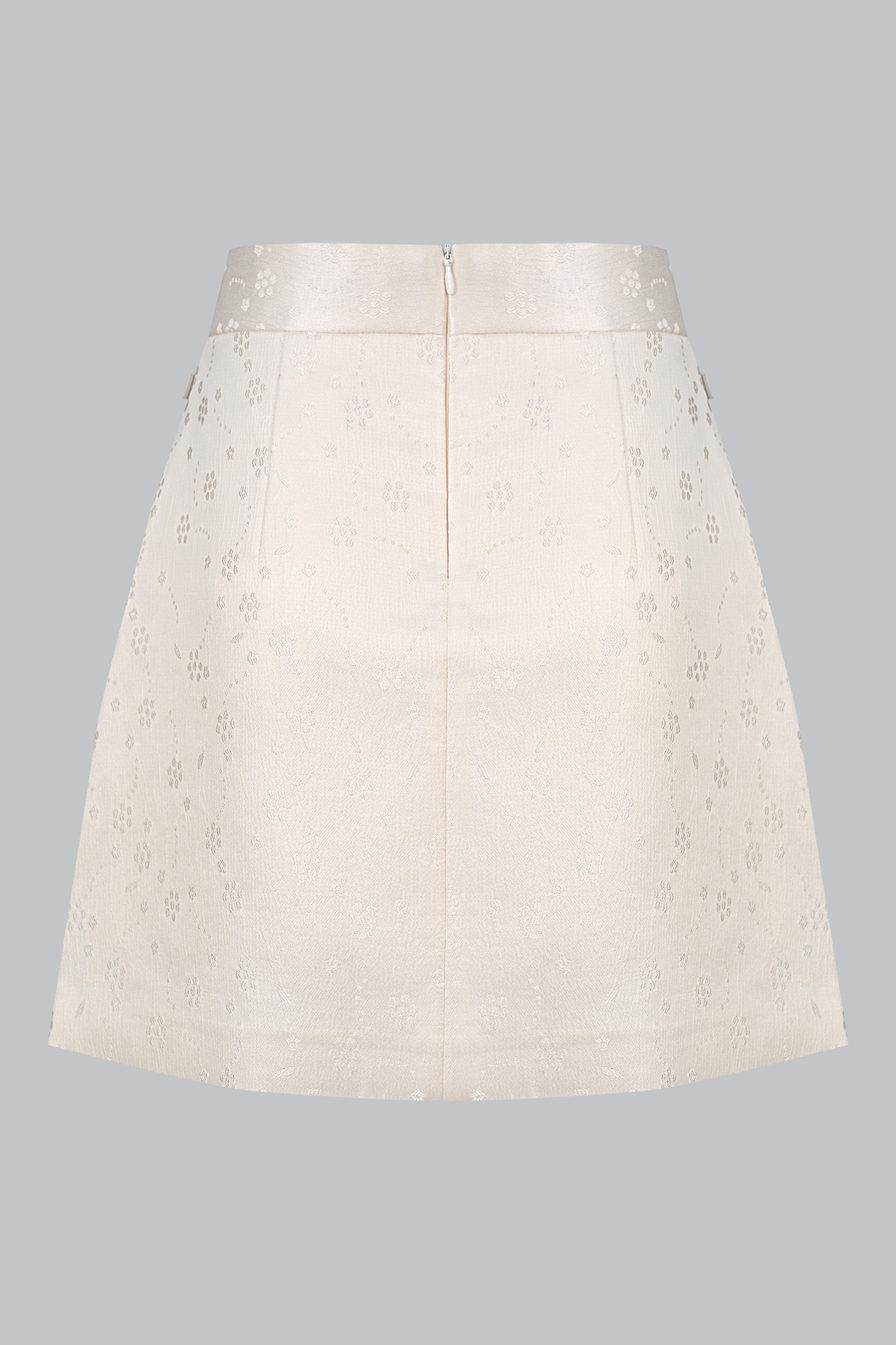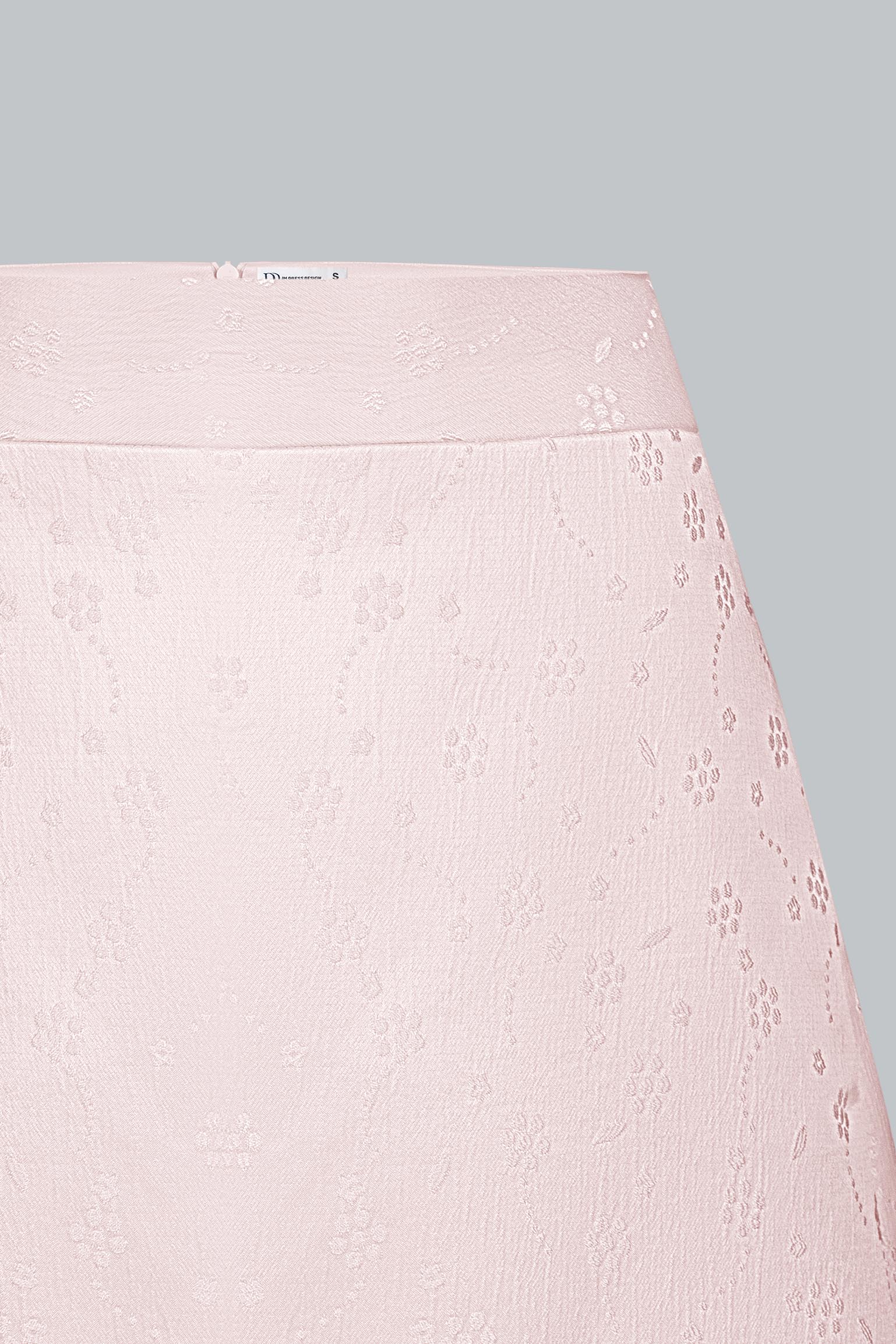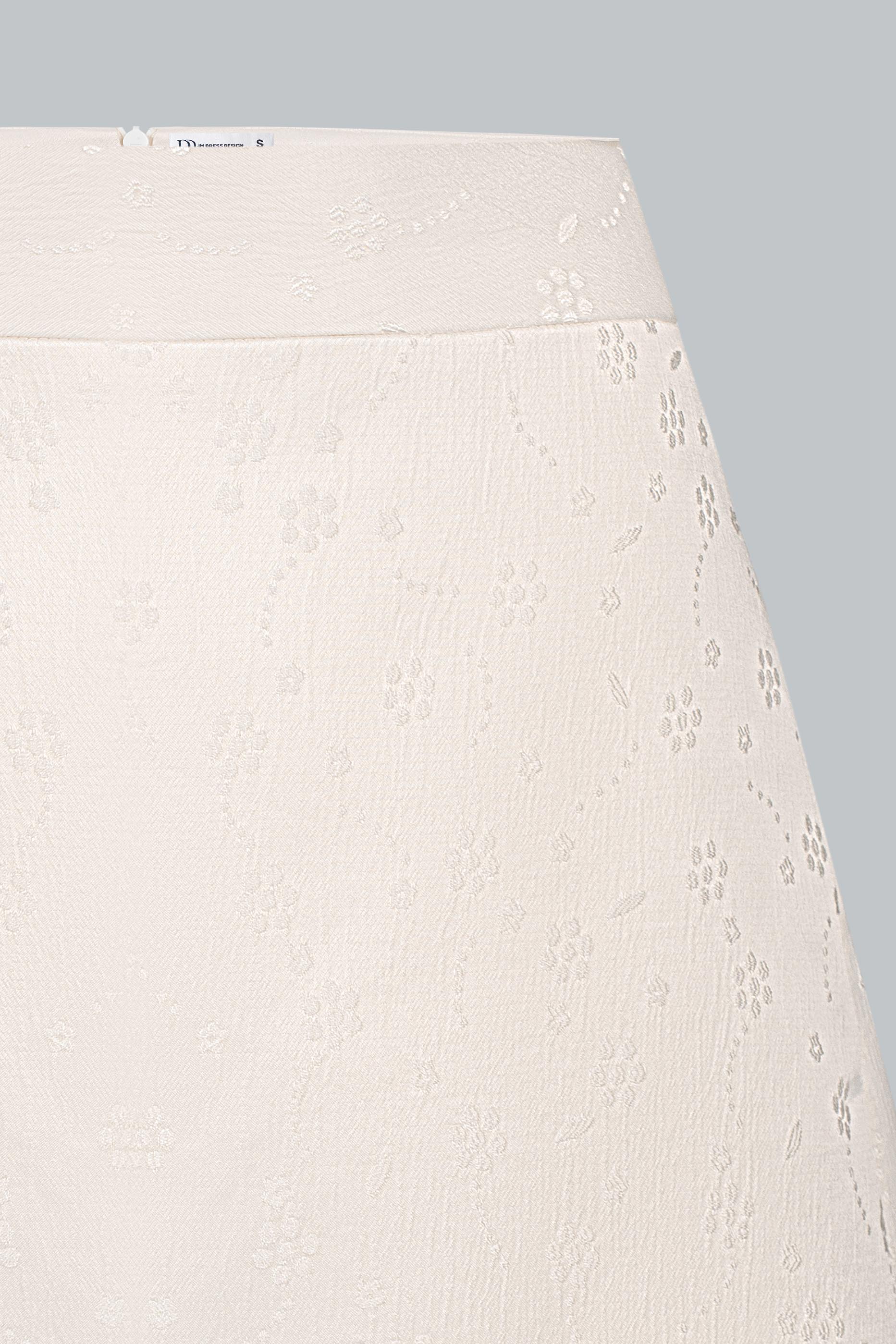 Vải gấm – thành phần chủ yếu là poly. Bề mặt gấm có ánh nhẹ và hoa văn chìm sang tinh tế, giúp chân váy giữ phom dáng chuẩn mà không cứng.
