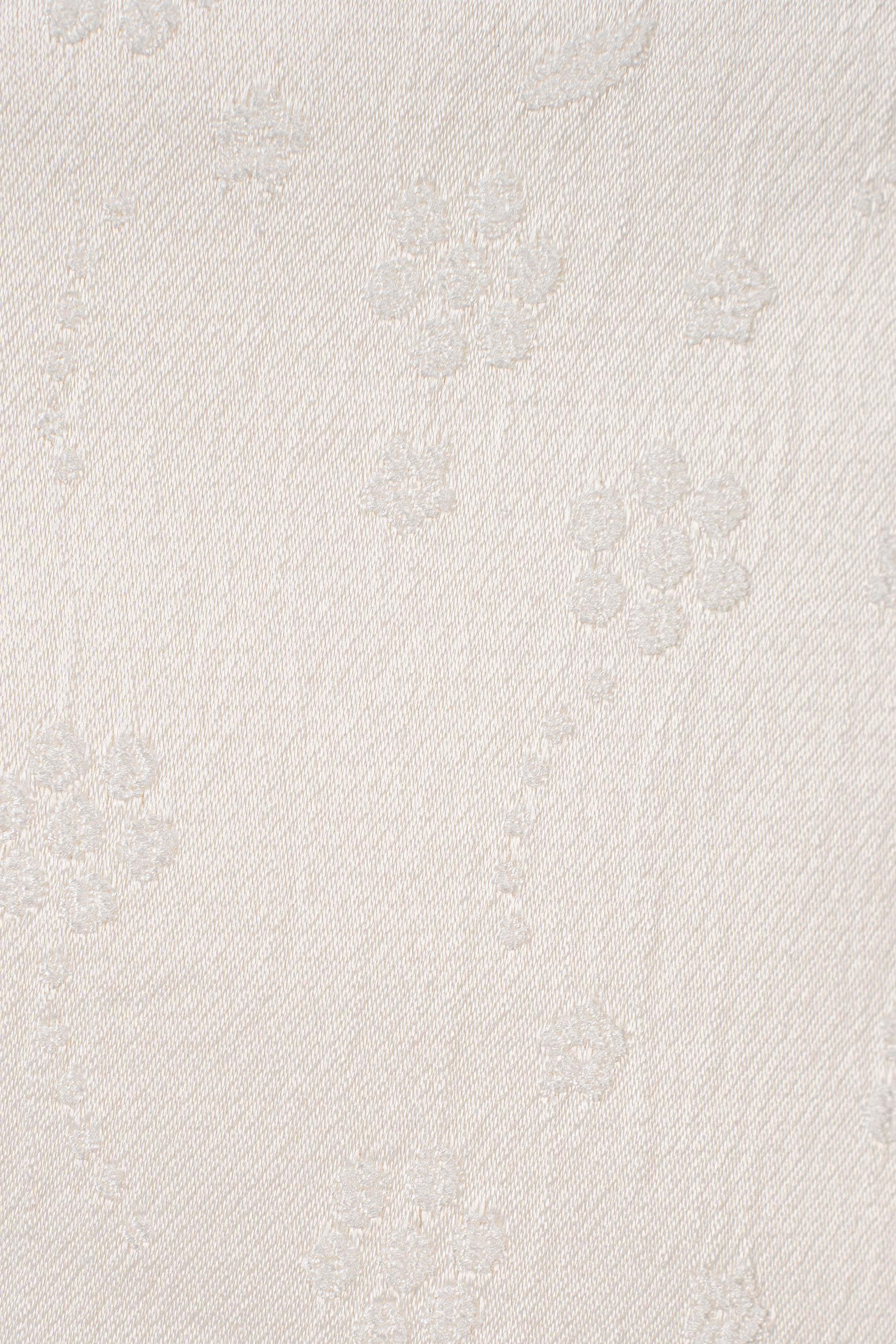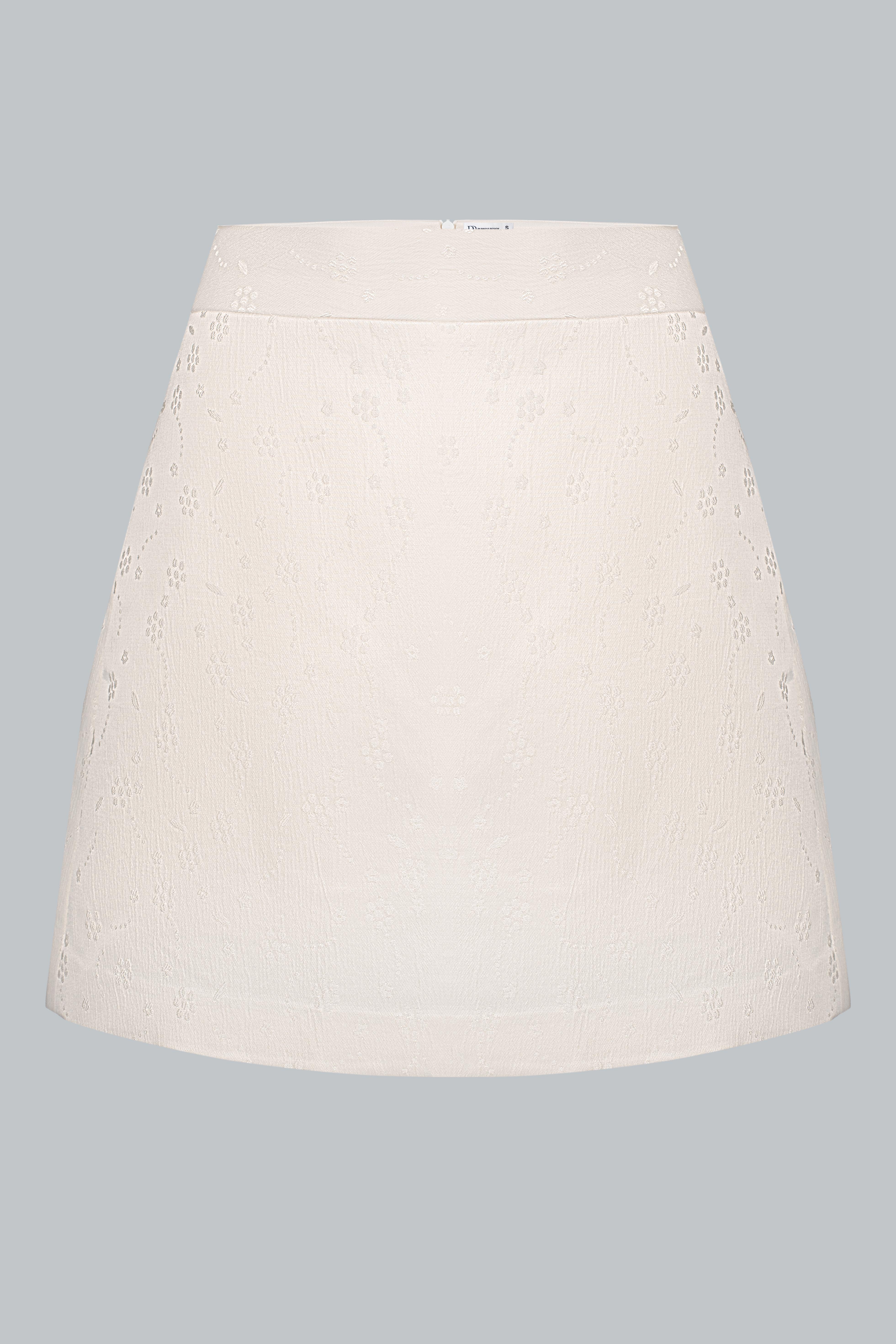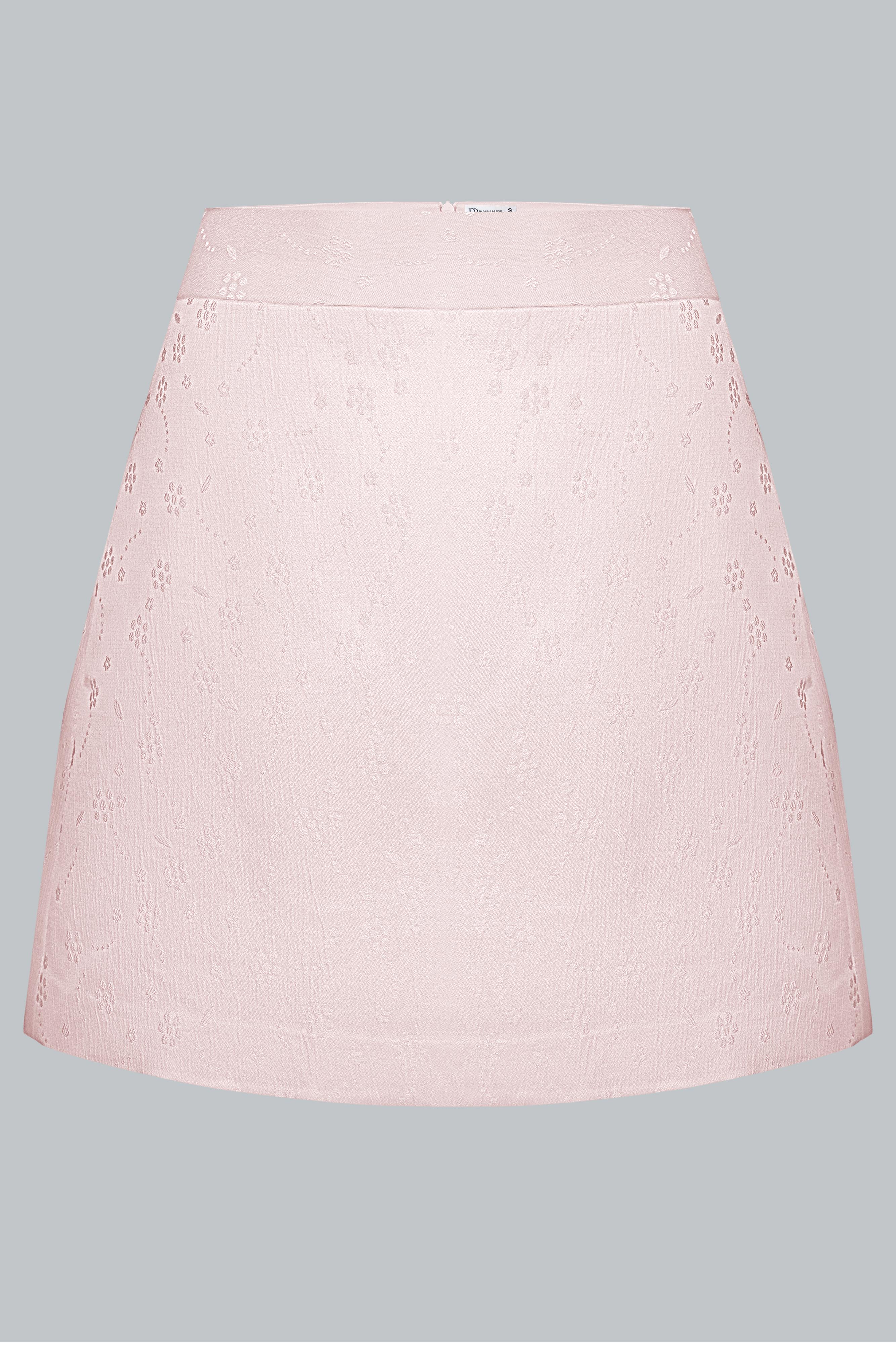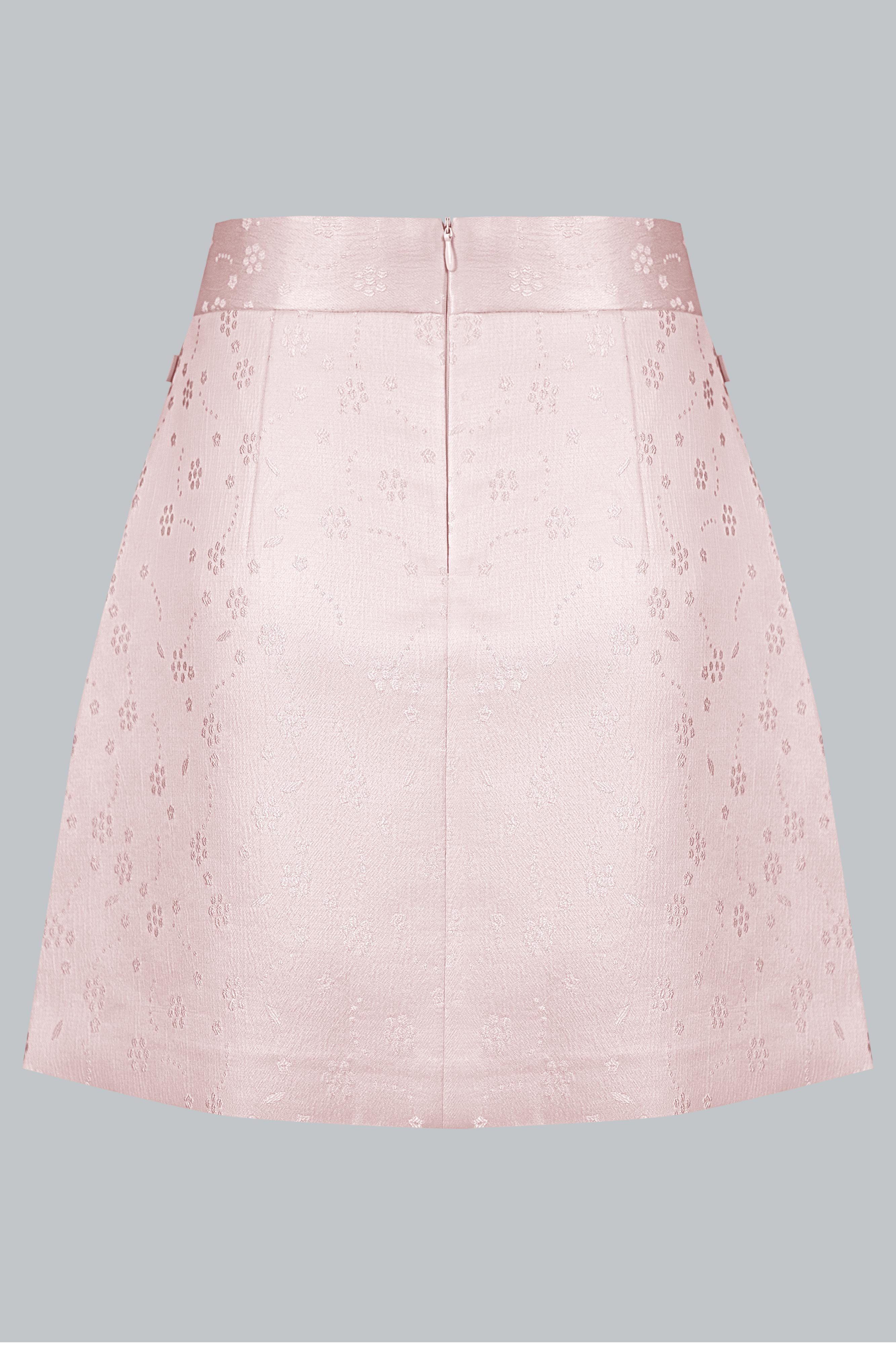 Vải gấm – thành phần chủ yếu là poly. Bề mặt gấm có ánh nhẹ và hoa văn chìm sang tinh tế, giúp chân váy giữ phom dáng chuẩn mà không cứng.