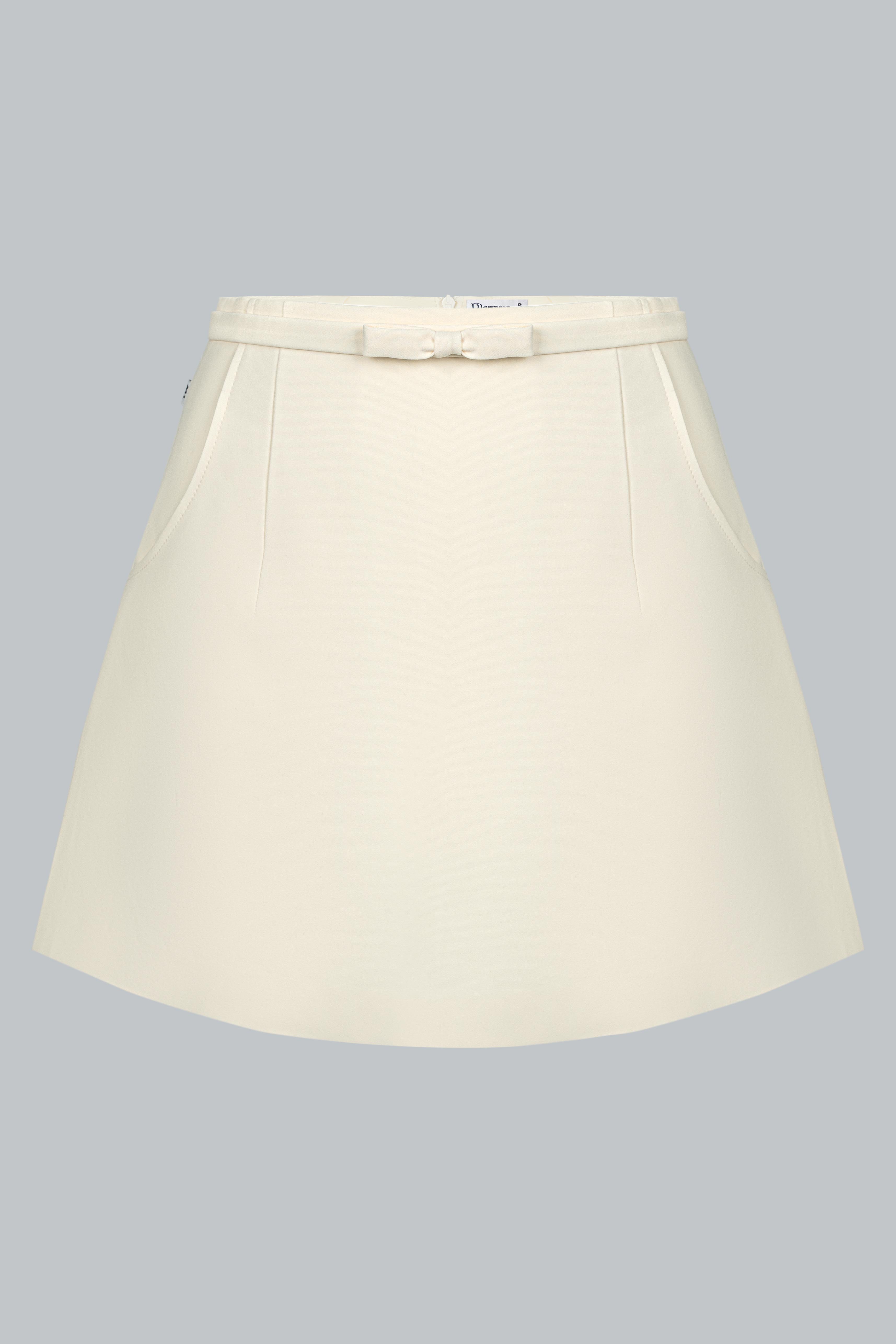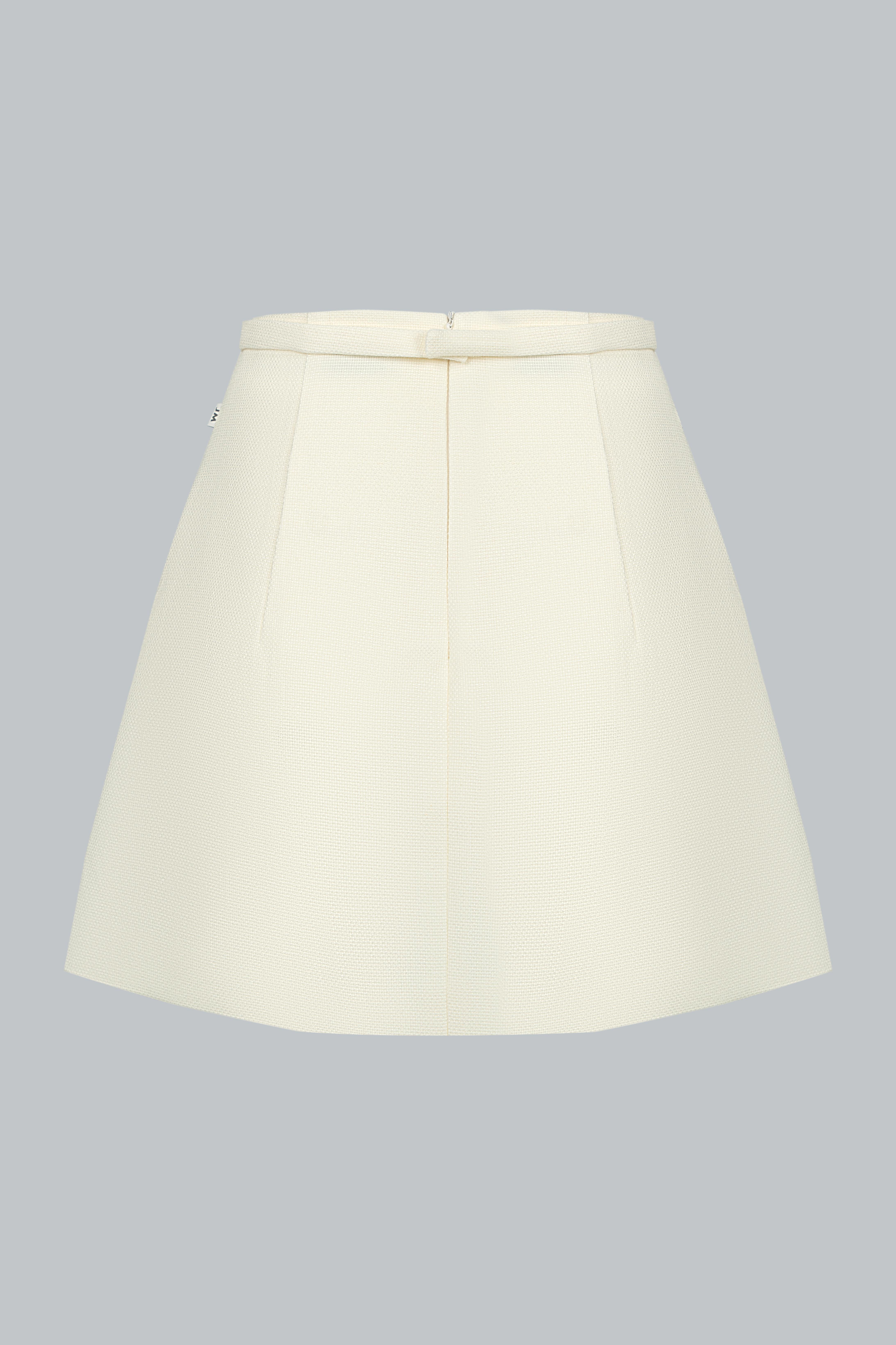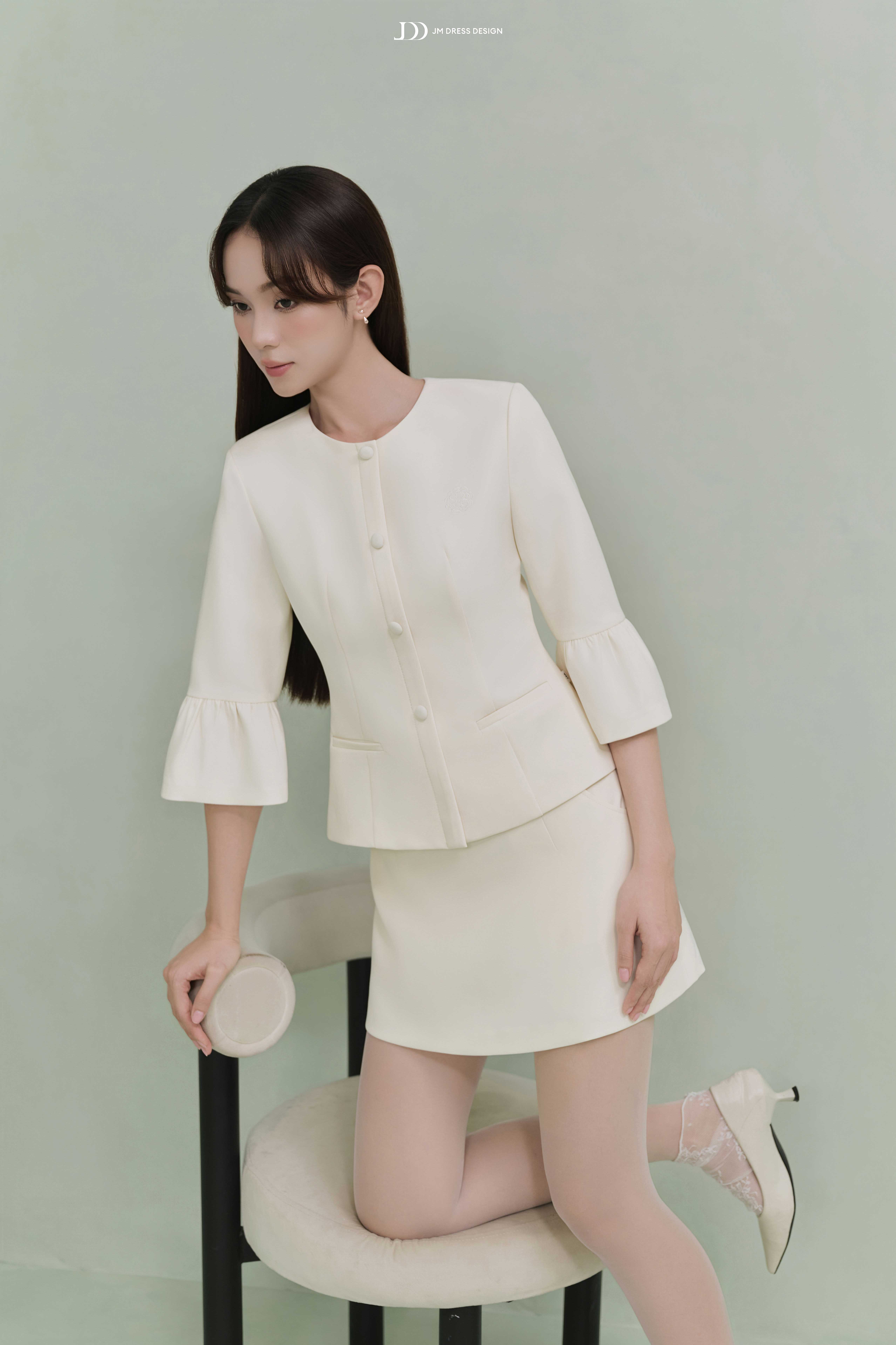 Dáng váy chữ A ngắn – độ dài vừa phải giúp tôn chân và tạo vẻ năng động, trẻ trung. Thiết kế tối giản, không chi tiết thừa – là lựa chọn lý tưởng để cân bằng với phần áo có điểm nhấn tay bo loe. Phom váy giữ đúng chuẩn gọn gàng, giúp tổng thể người mặc trở nên thanh thoát và chỉn chu, nhất là khi được diện như một set đồng bộ.