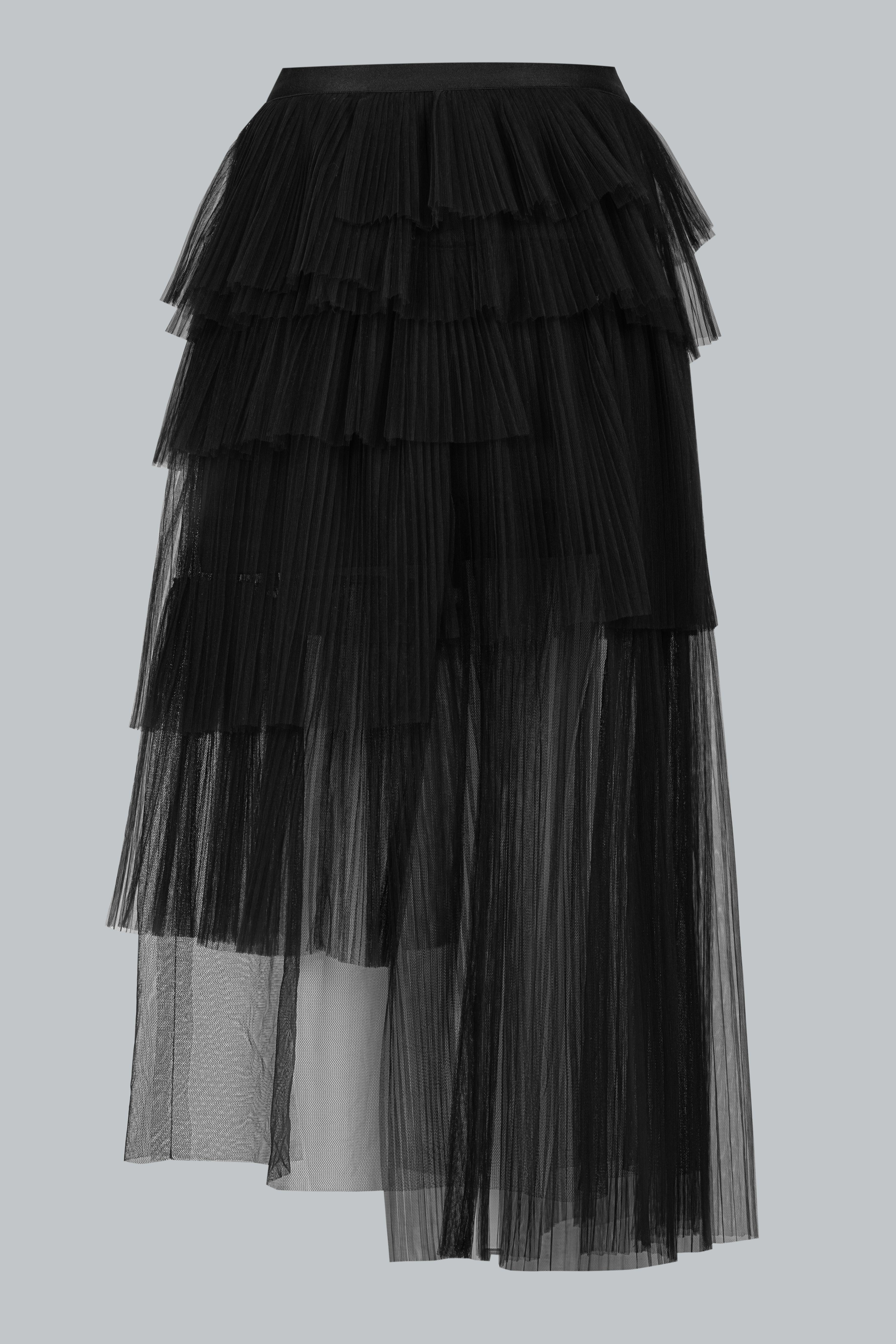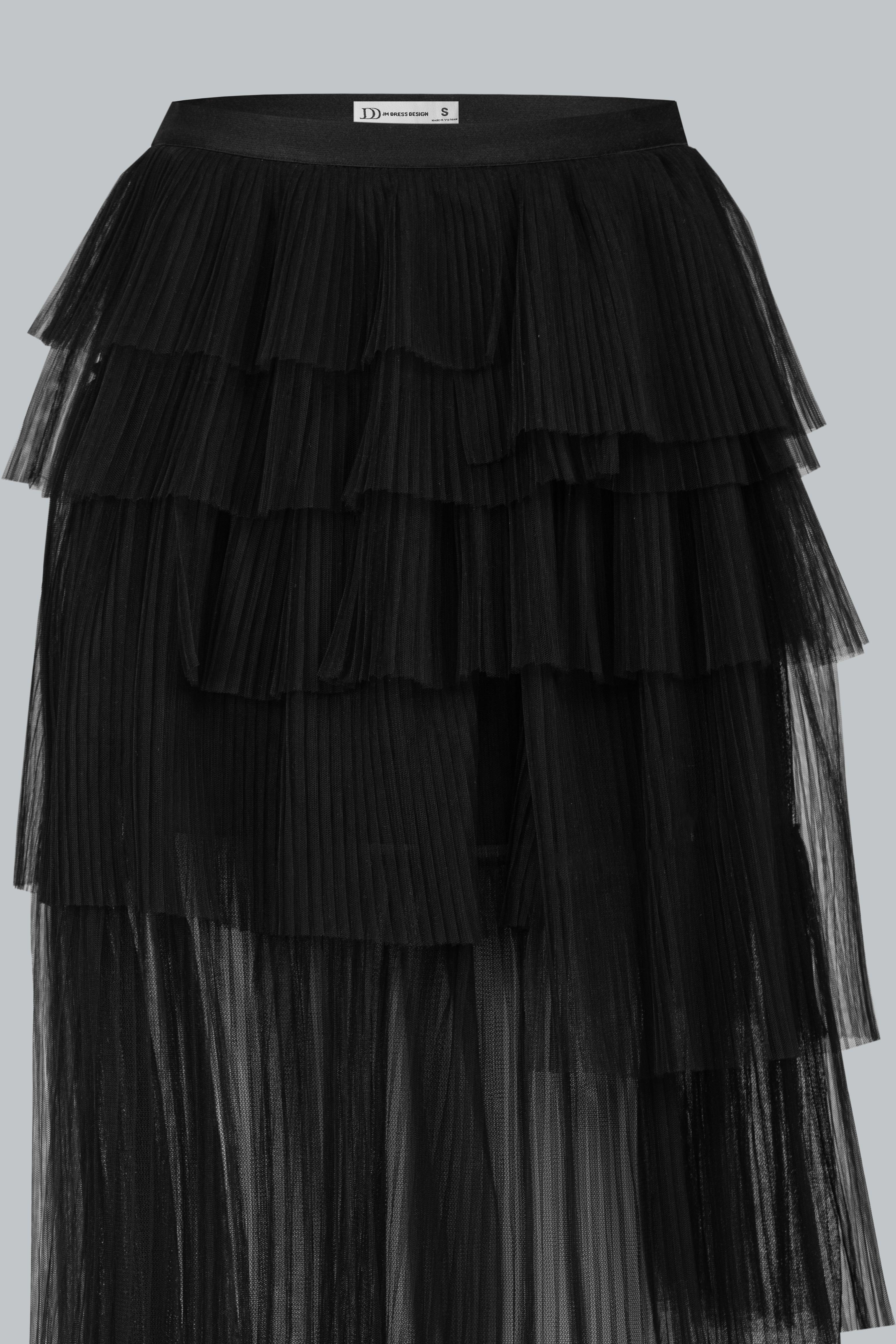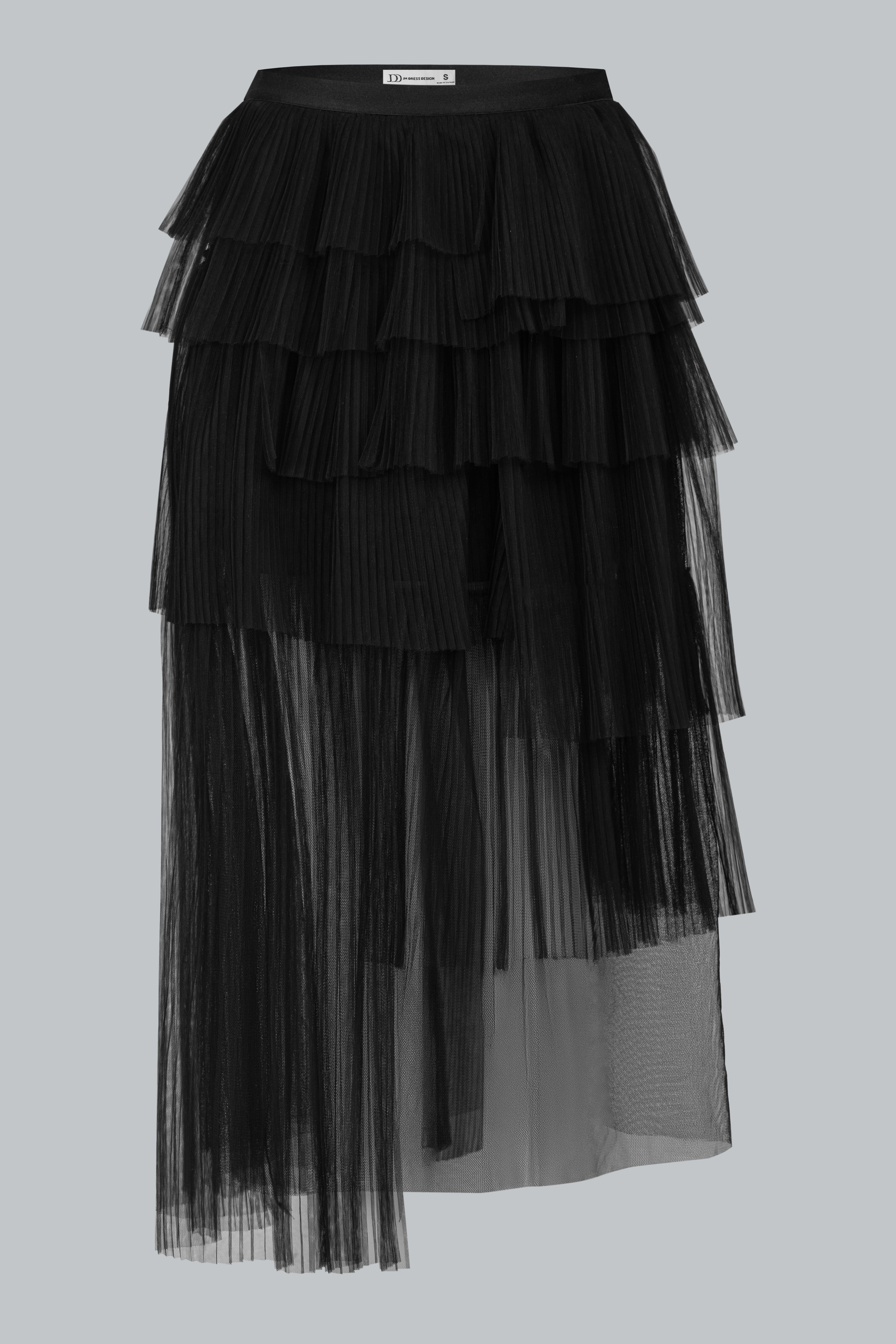 Lưới poly mỏng nhẹ, nhiều tầng lớp tạo độ phồng bồng bềnh. Sự bất đối xứng trong cách xử lý lớp vải mang đến vẻ ngoài thanh lịch pha chút cổ điển, khác biệt hoàn toàn so với những chân váy thông thường. Lớp lót mềm mại bên trong giúp nàng thoải mái vận động.