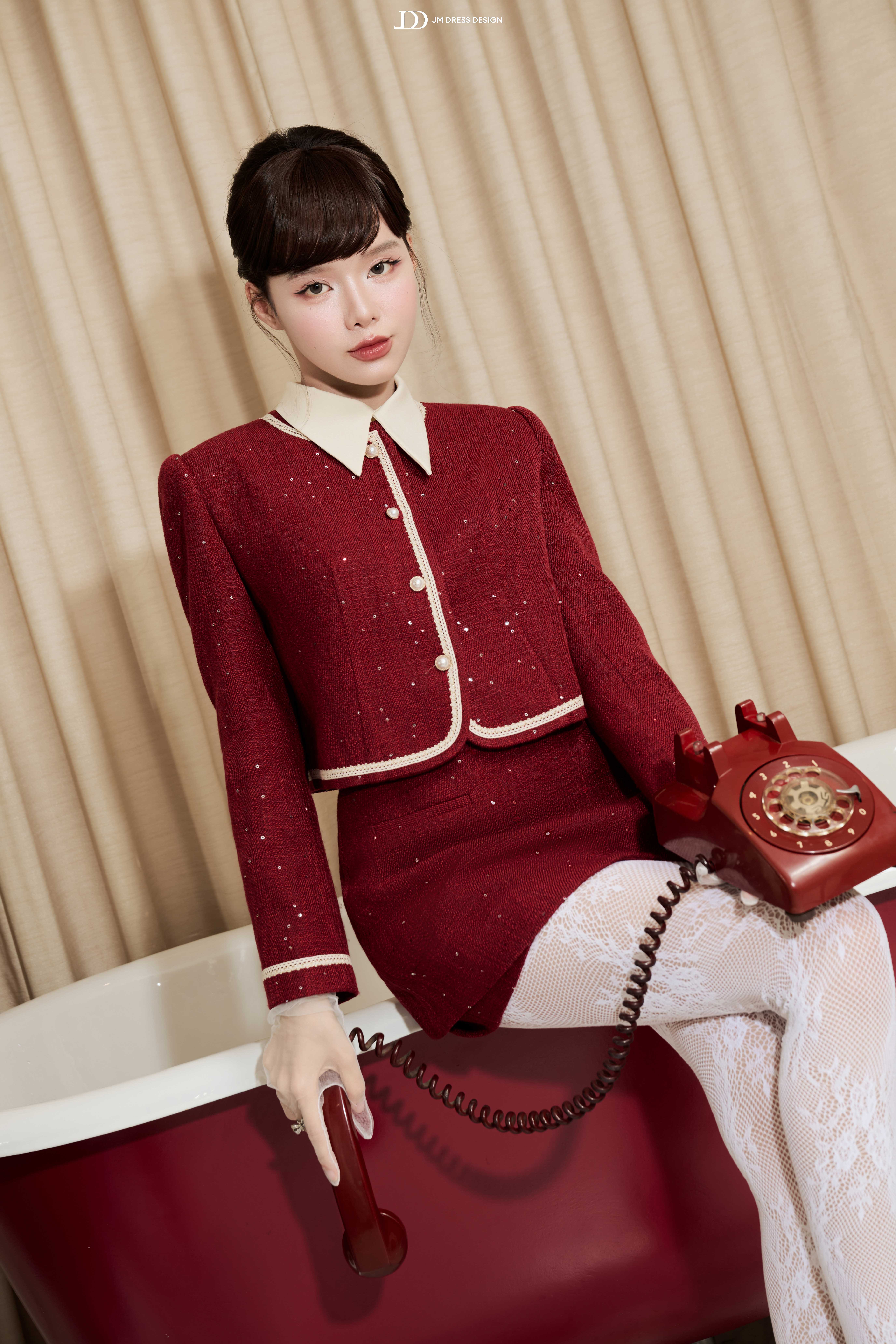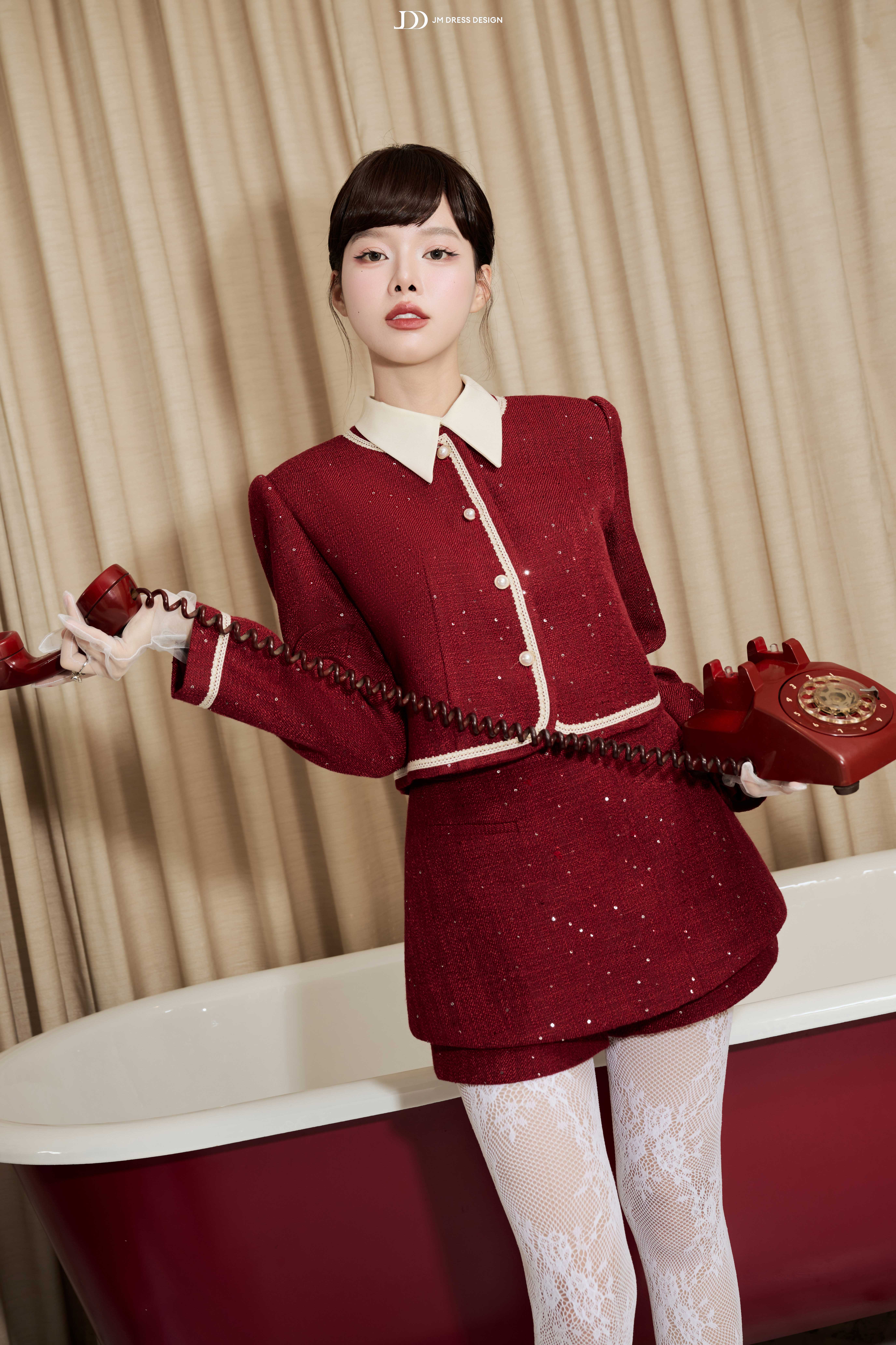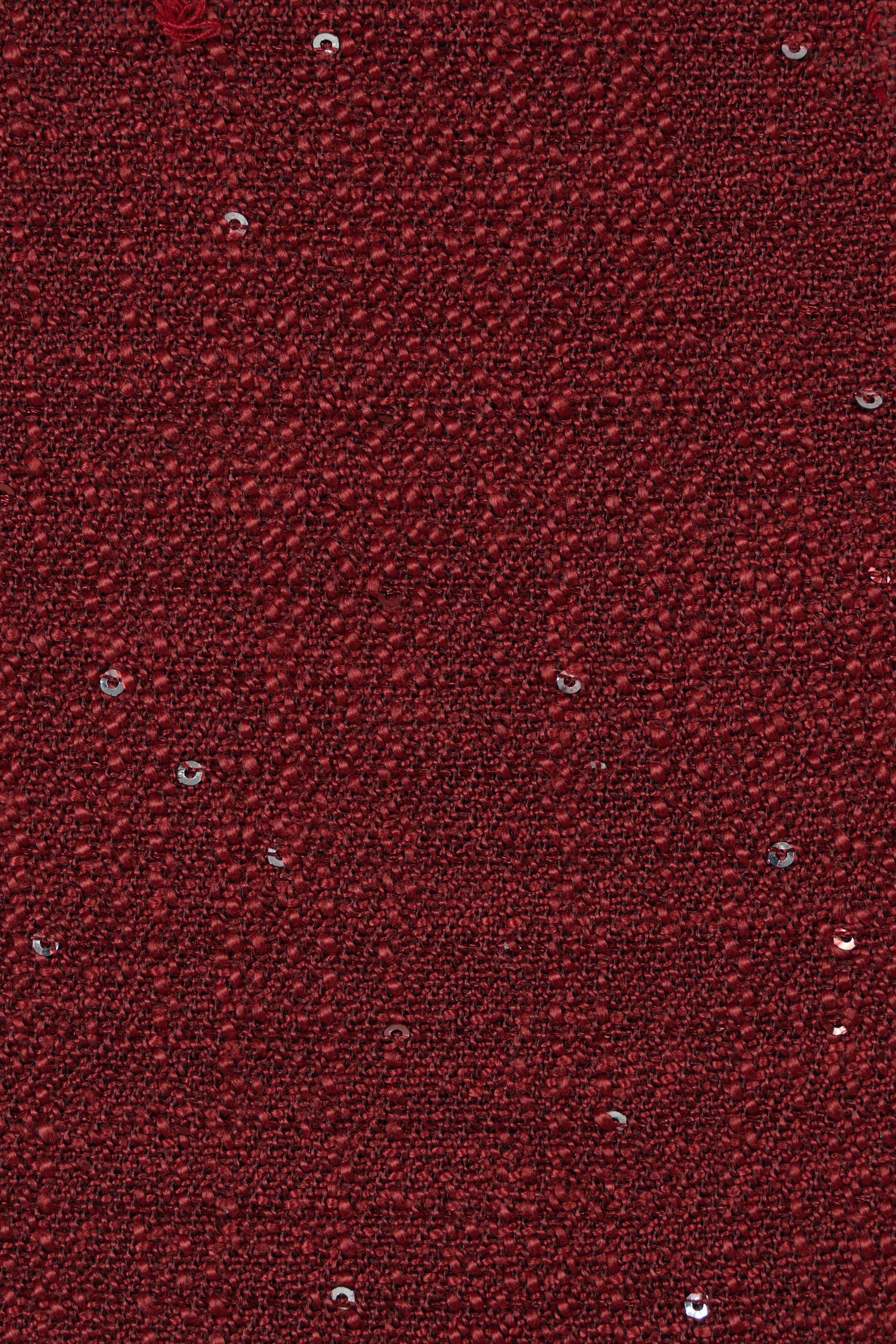Tweed dệt ánh kim mang sắc đỏ trầm, kết hợp lớp lót mịn màng giúp nàng tự tin vận động. Chất liệu giữ phom tốt, tạo độ đứng vừa phải để váy luôn chuẩn dáng, ngay cả khi nàng di chuyển trong những buổi tiệc dài.