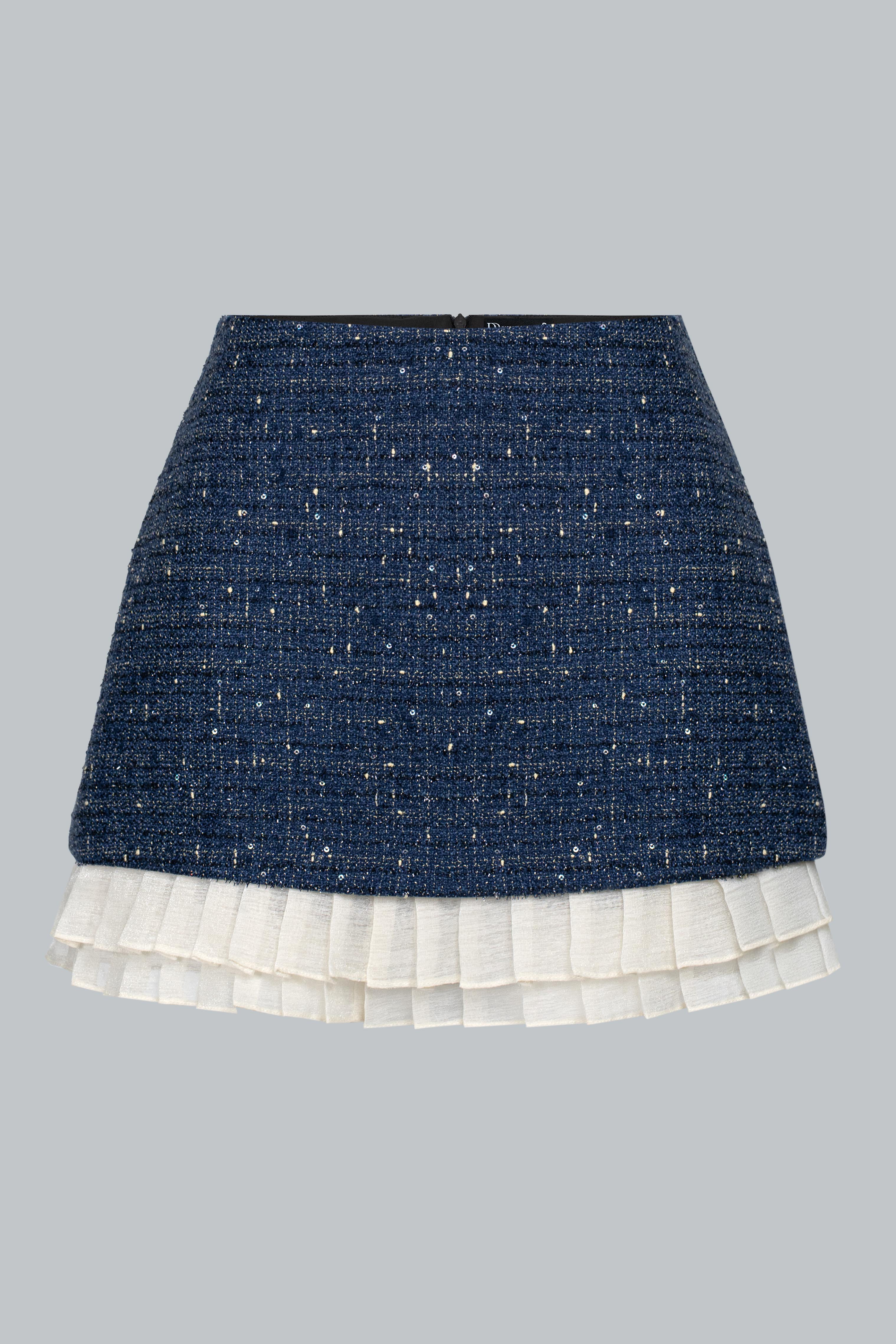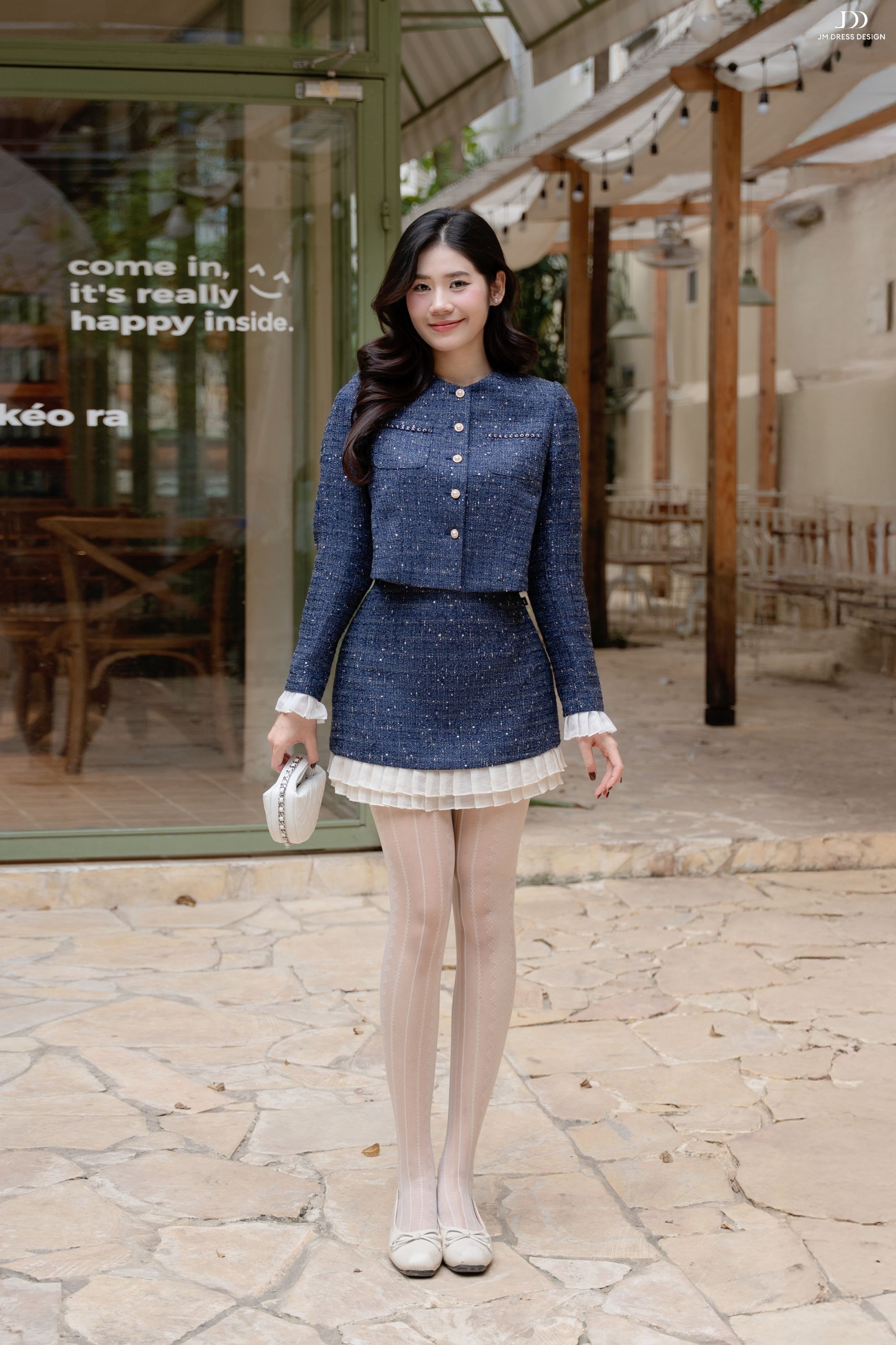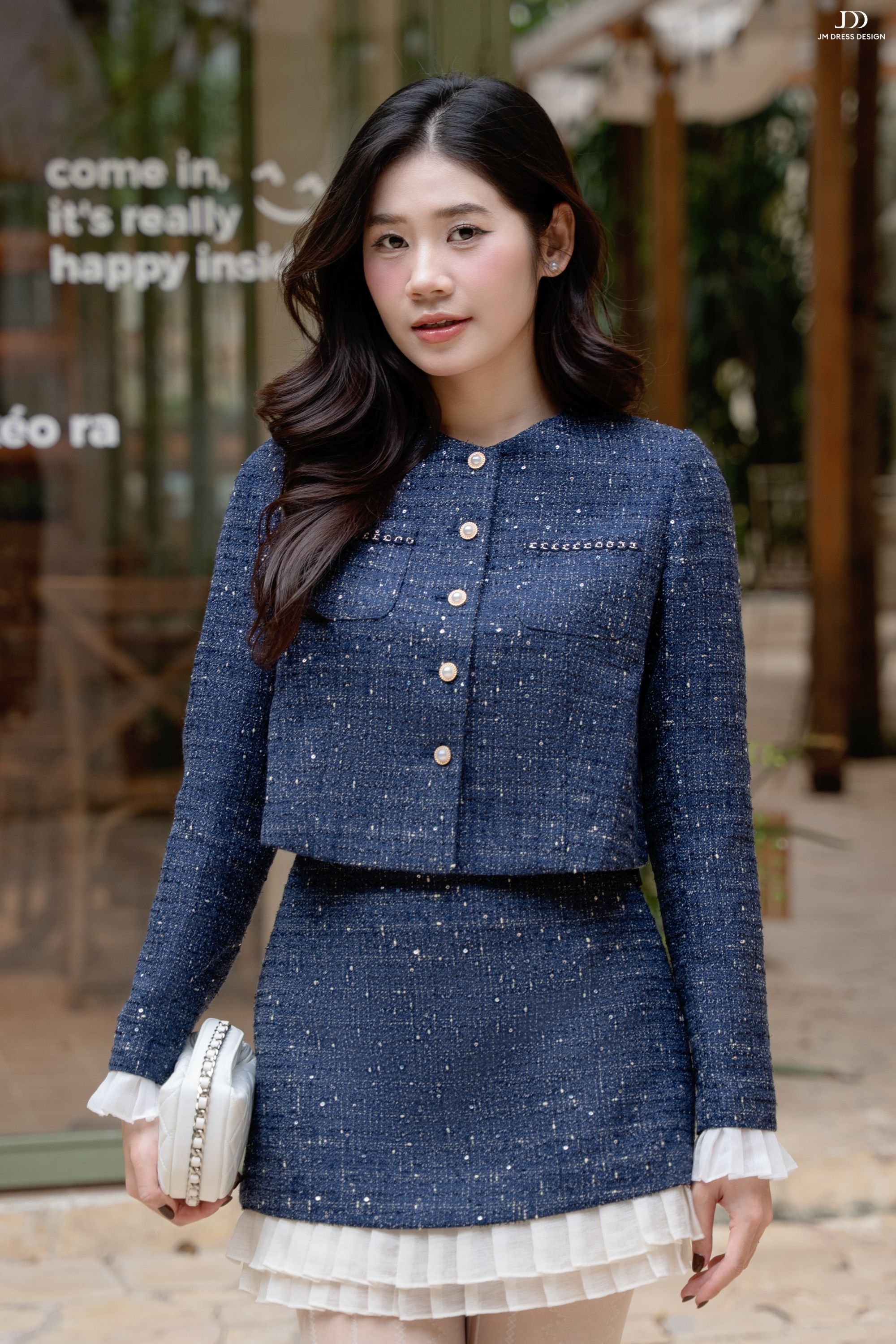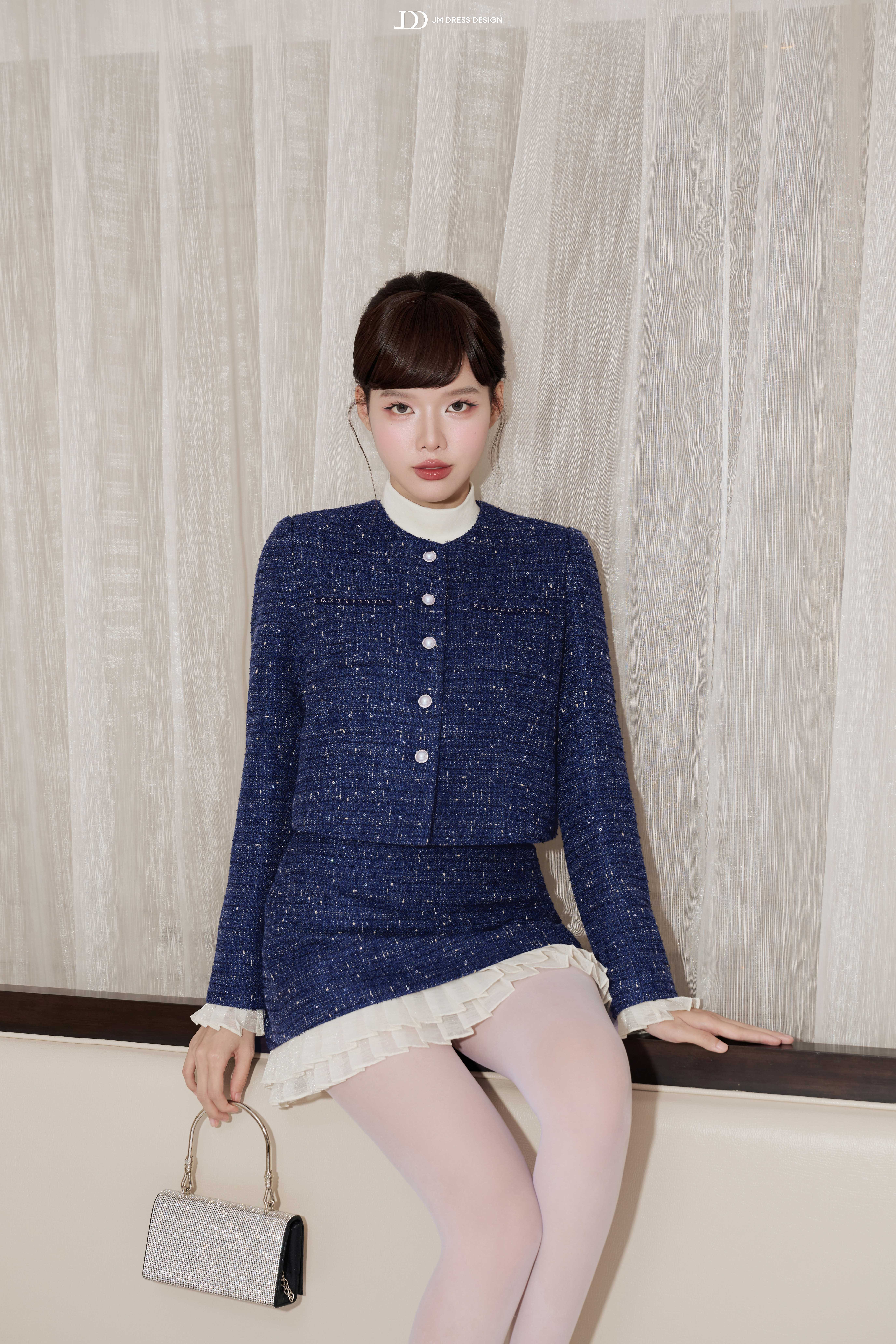 Tweed ánh kim giữ phom ổn định, trong khi phần viền bèo trắng bằng poly mềm nhẹ tạo sự uyển chuyển cho từng bước đi. Kết hợp cùng lớp lót bên trong giúp nàng thoải mái di chuyển suốt ngày dài.