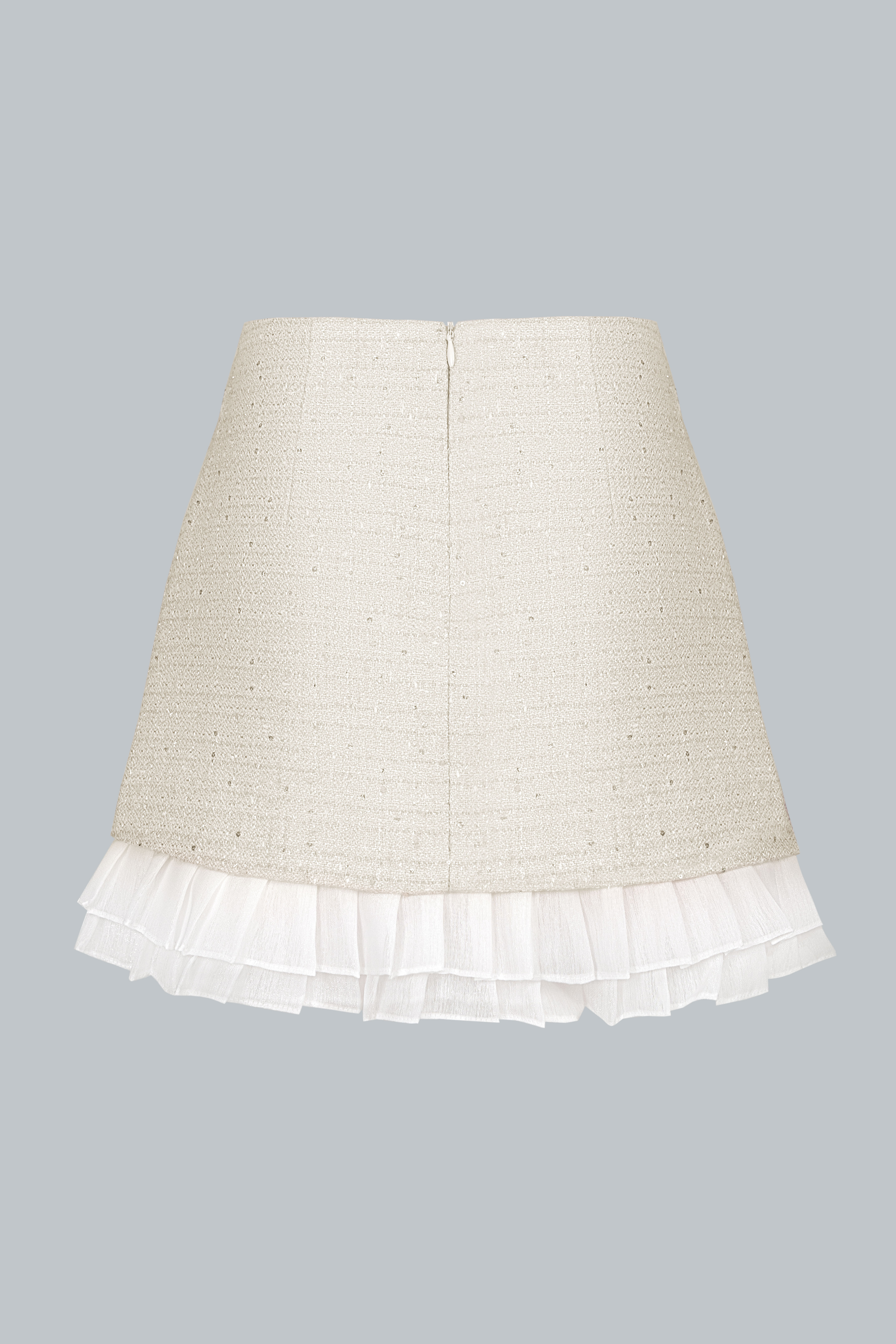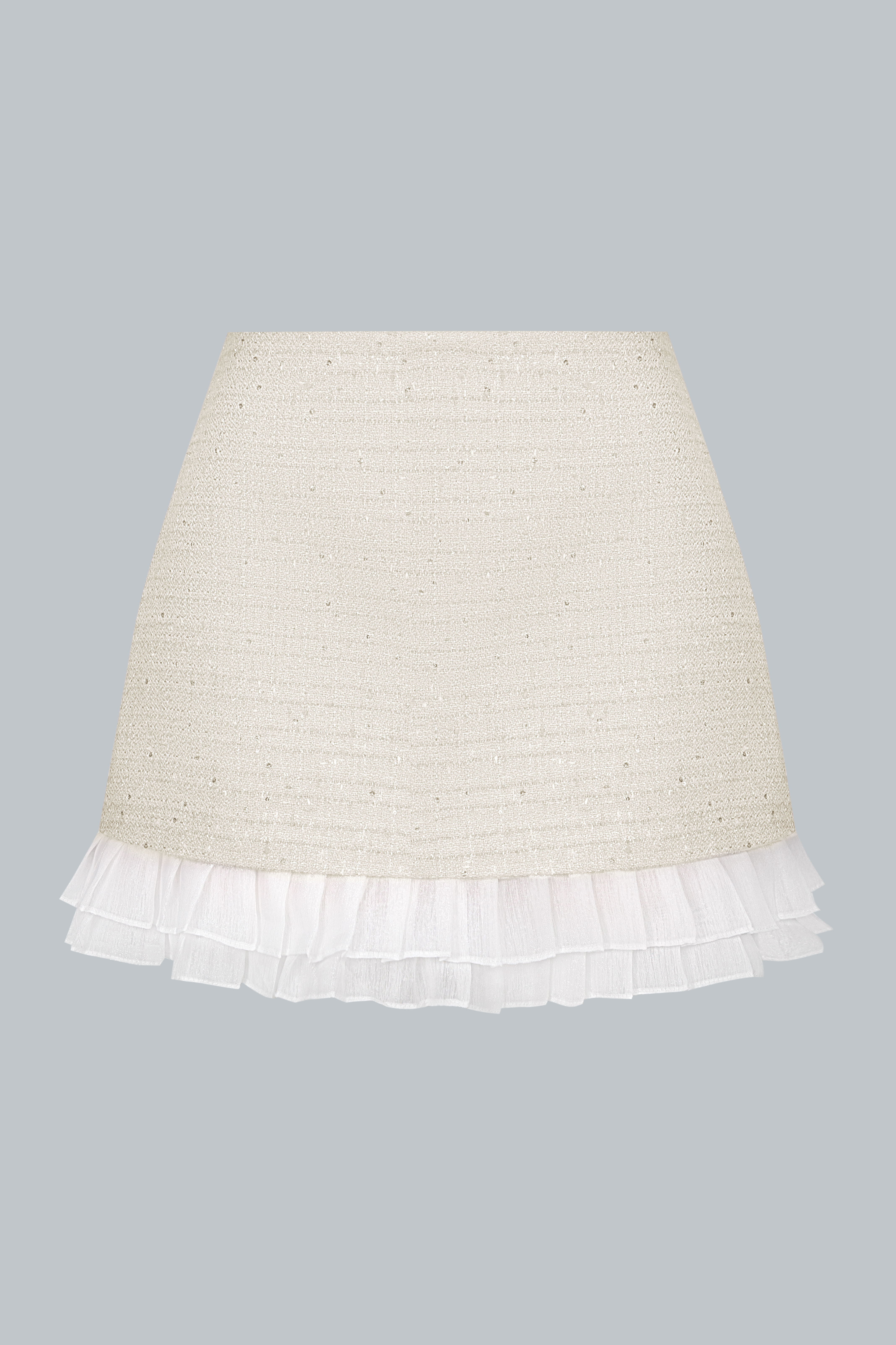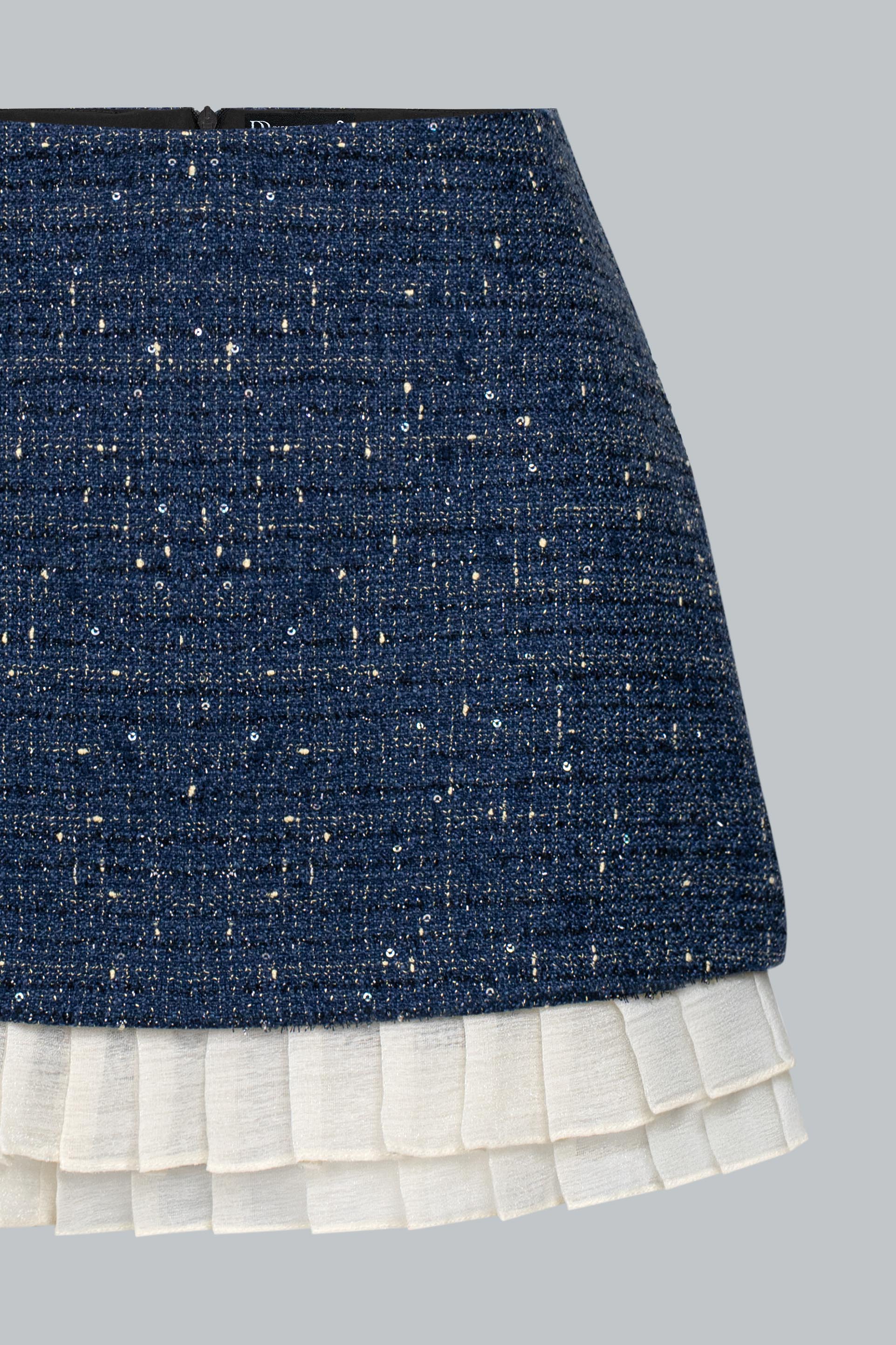 Tweed ánh kim giữ phom ổn định, trong khi phần viền bèo trắng bằng poly mềm nhẹ tạo sự uyển chuyển cho từng bước đi. Kết hợp cùng lớp lót bên trong giúp nàng thoải mái di chuyển suốt ngày dài.