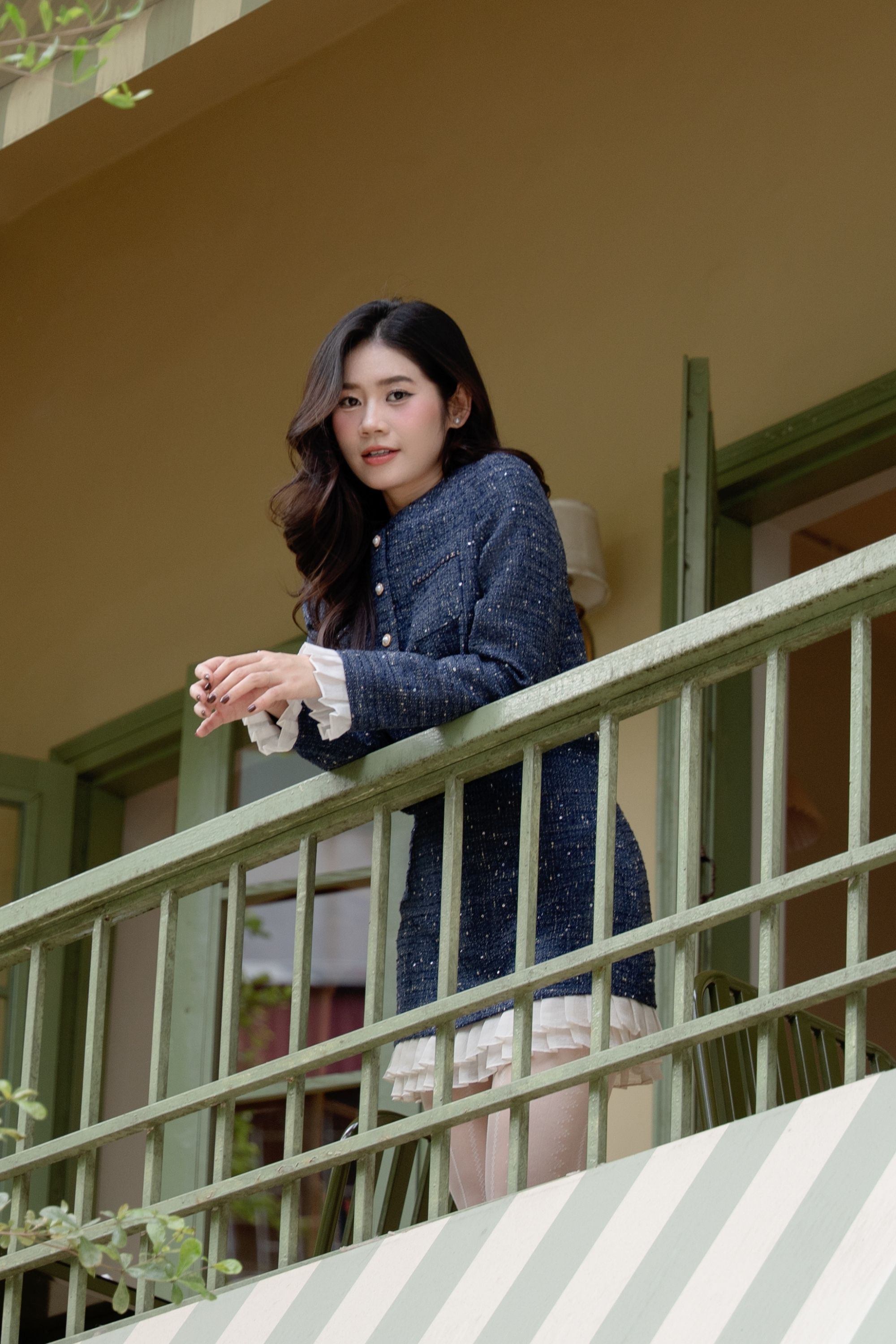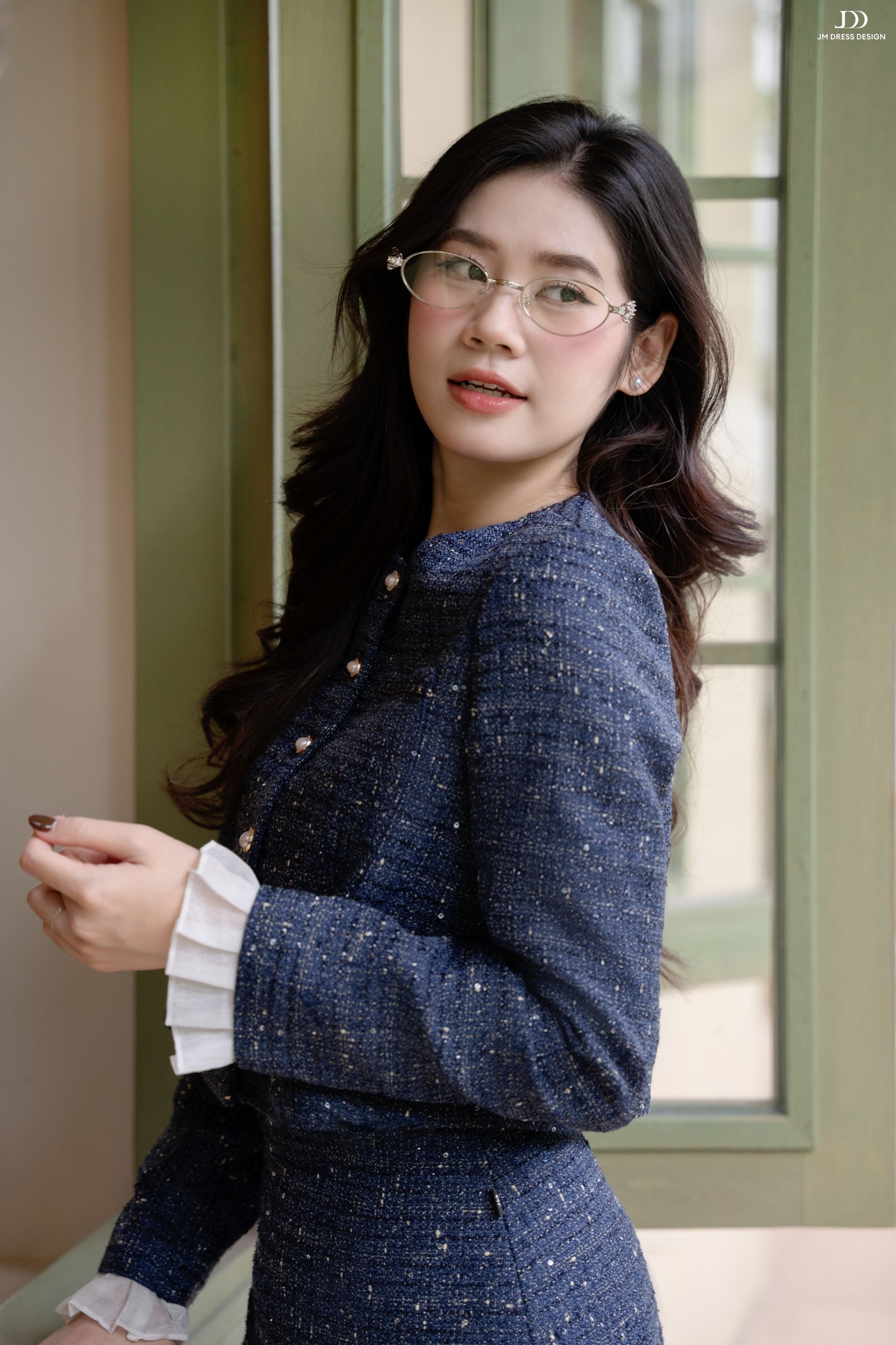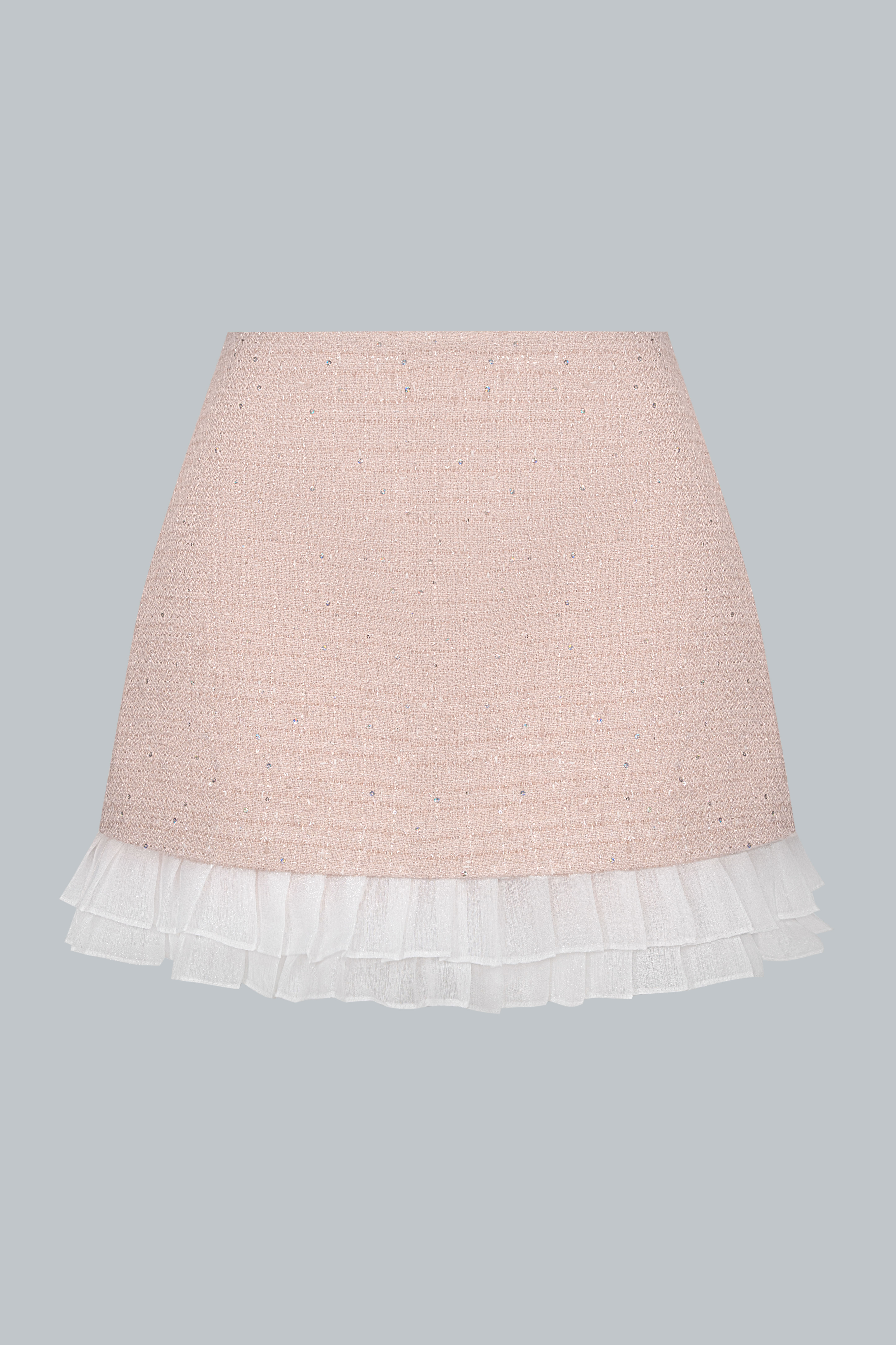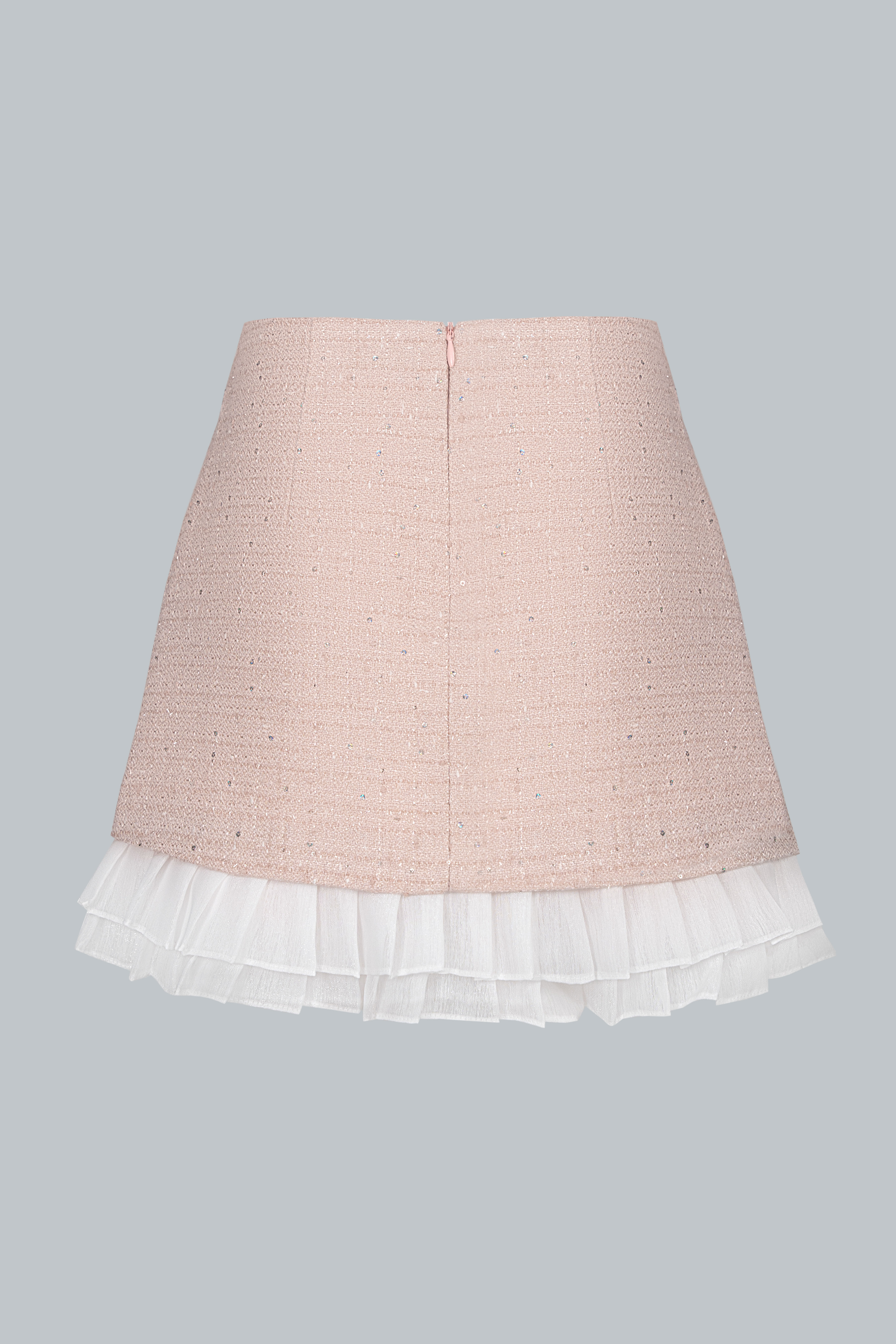 Tweed ánh kim giữ phom ổn định, trong khi phần viền bèo trắng bằng poly mềm nhẹ tạo sự uyển chuyển cho từng bước đi. Kết hợp cùng lớp lót bên trong giúp nàng thoải mái di chuyển suốt ngày dài.