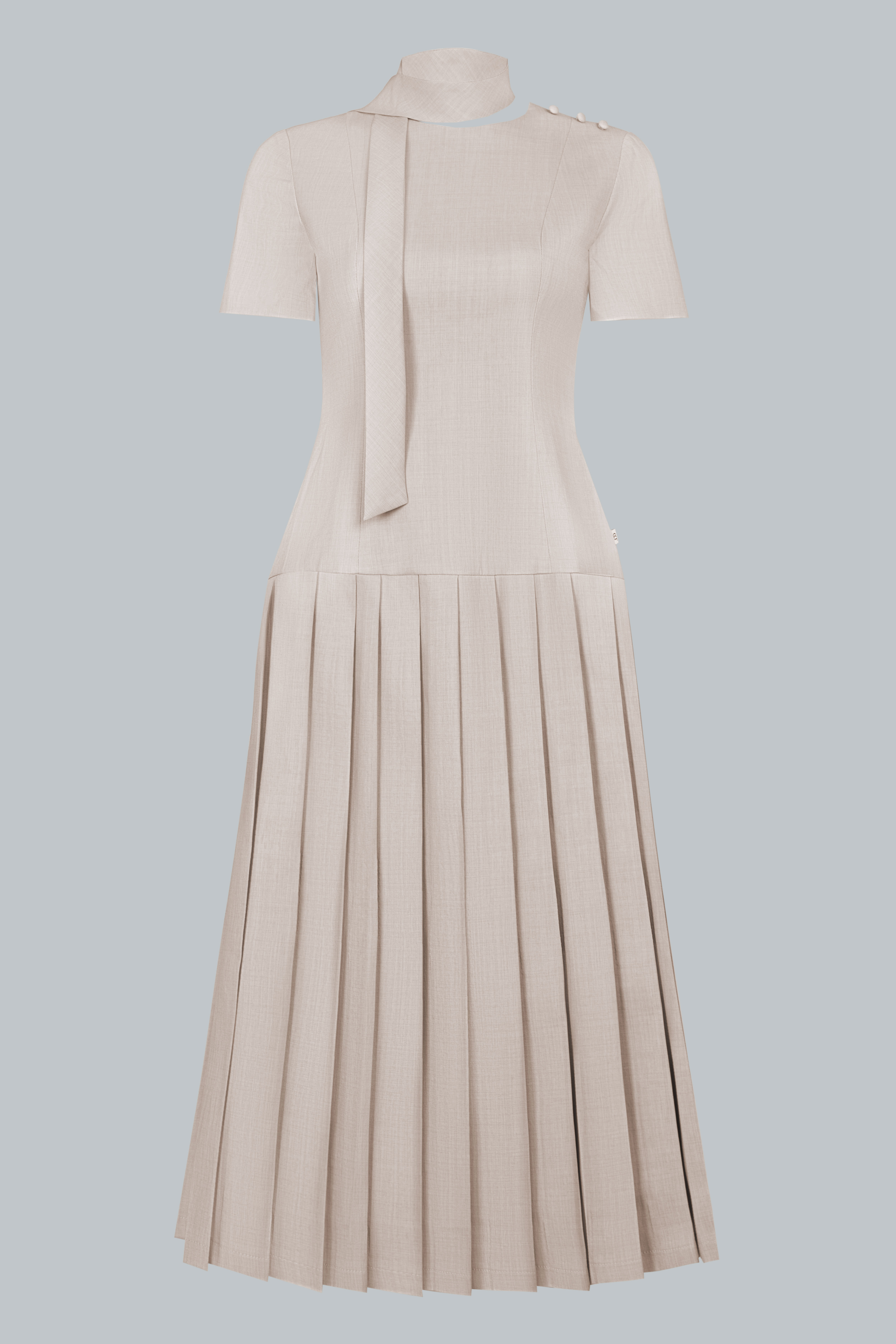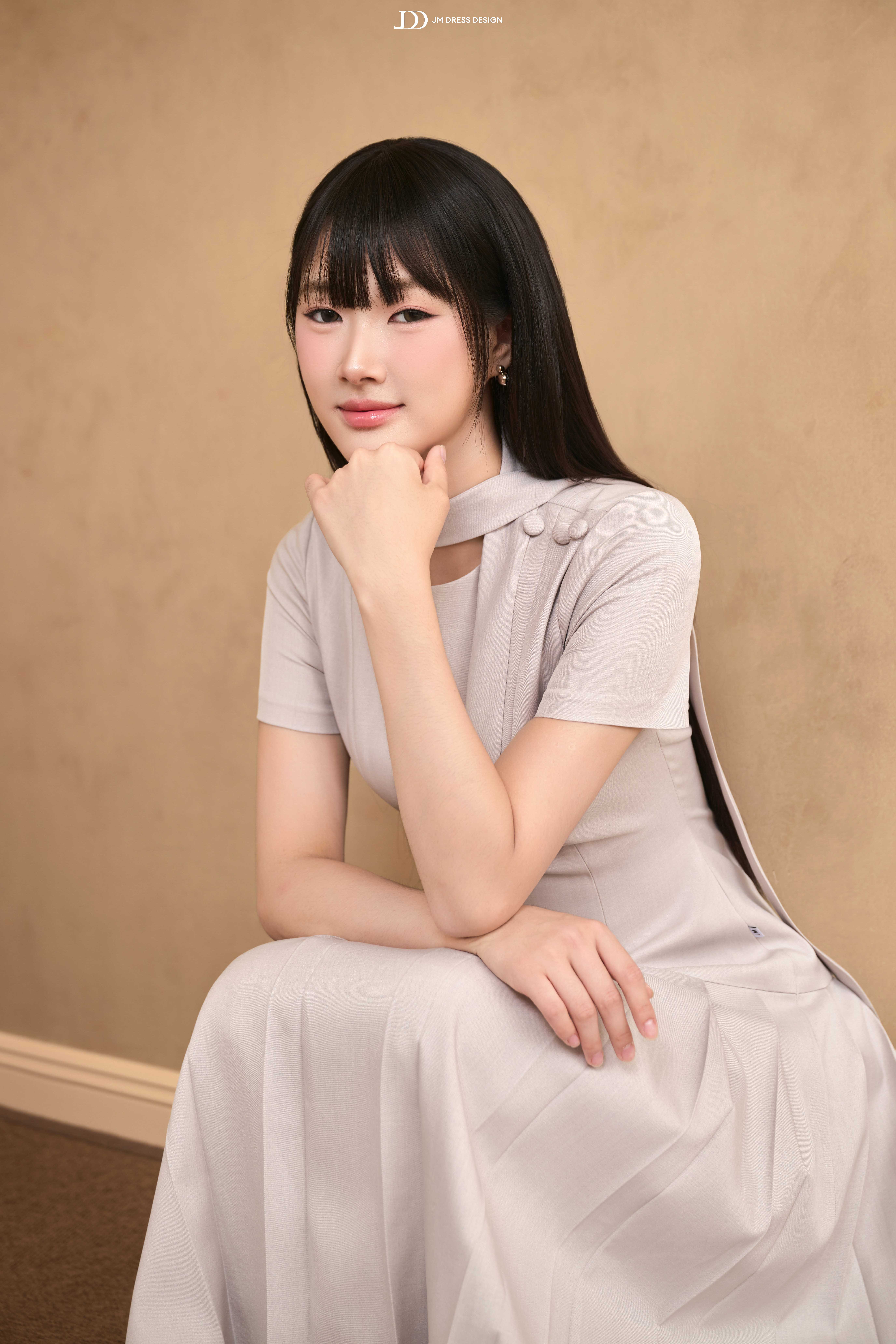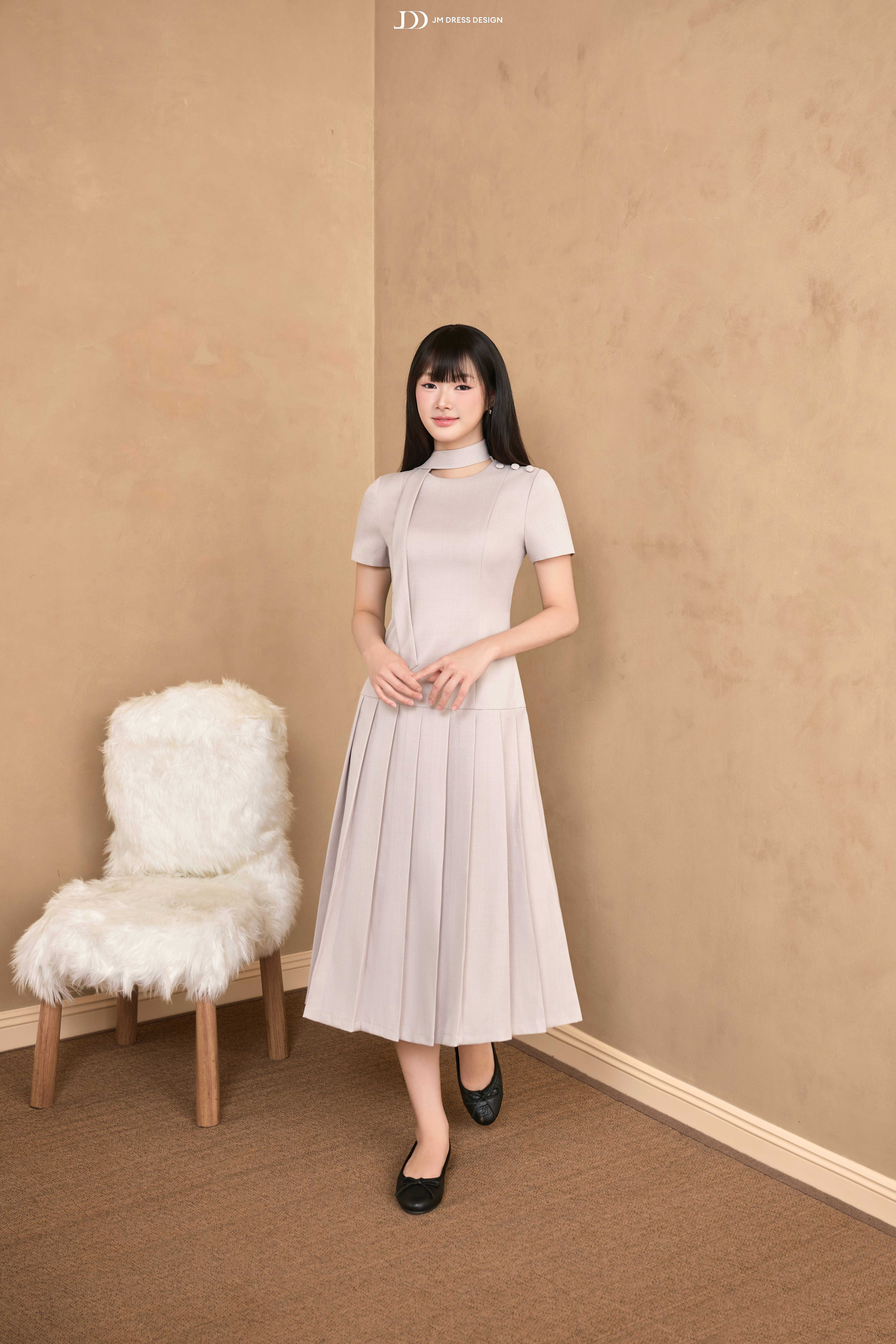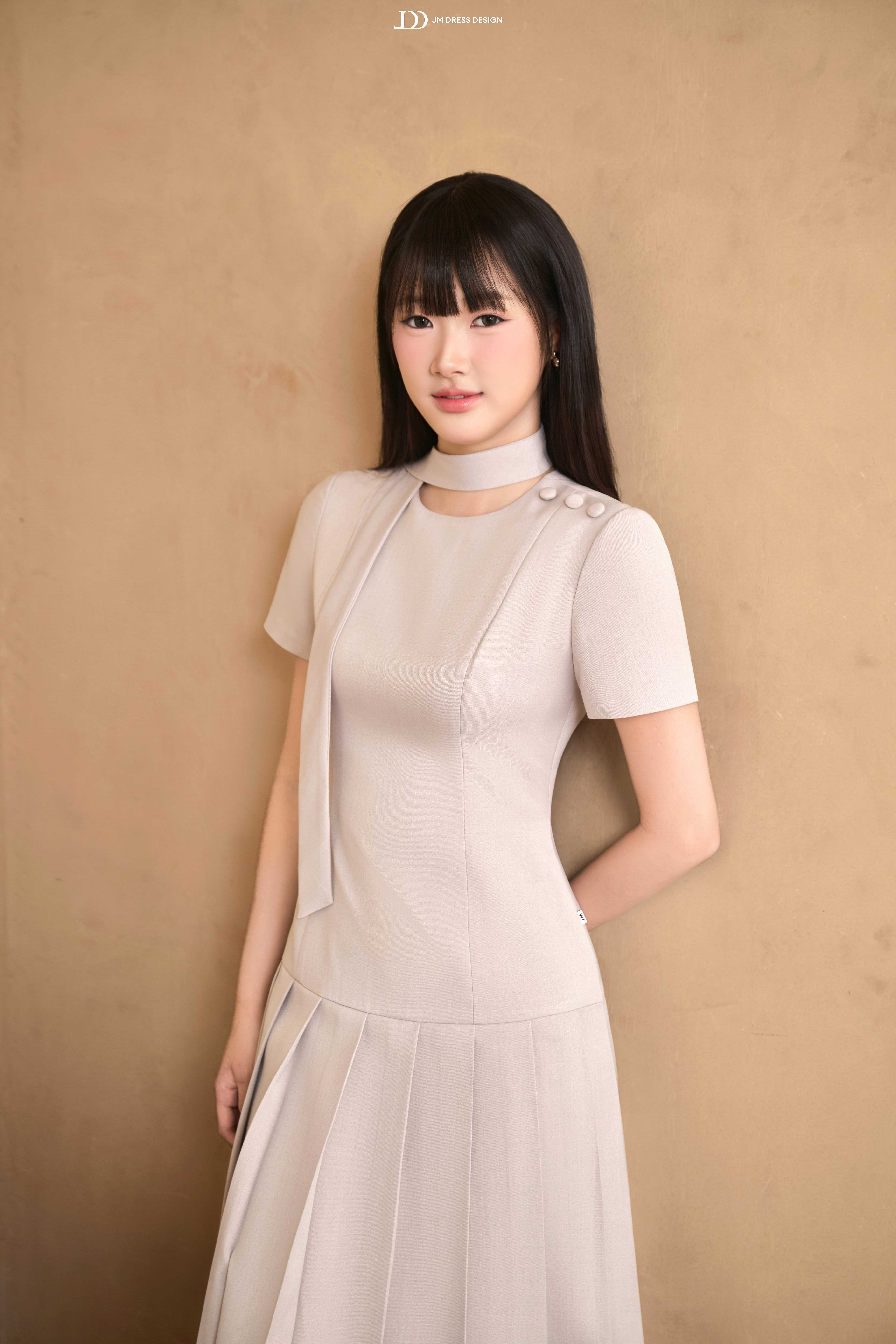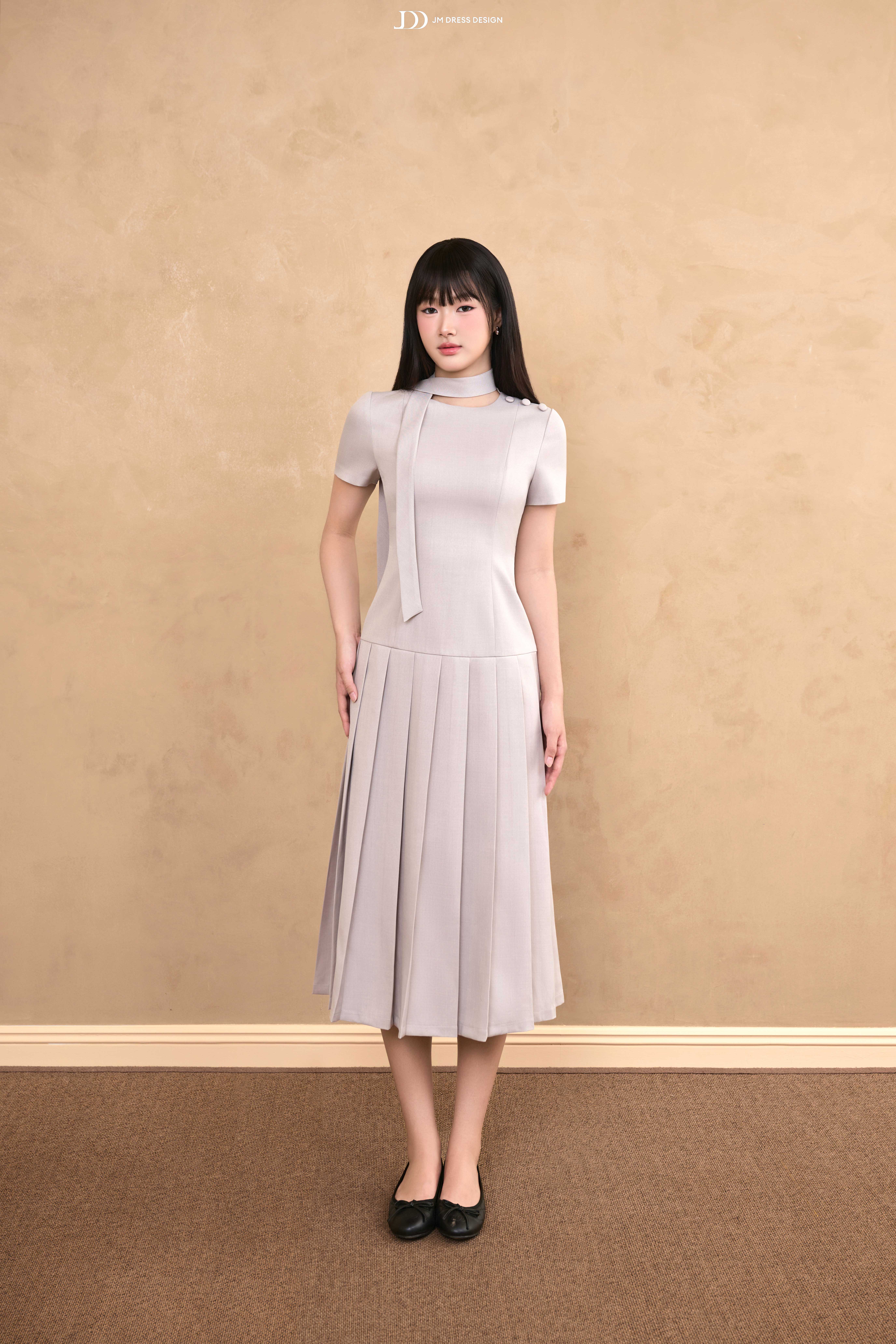 Dáng midi ngang bắp chân mang lại sự kín đáo, thanh lịch. Phần thân trên ôm nhẹ, tay ngắn cân đối, cổ tròn phối dải nơ buộc lệch một bên tạo điểm nhấn duyên dáng. Vai áo nhấn bằng nút bọc nhỏ, tỉ mỉ và tinh tế. Chân váy xếp ly bản lớn trải đều, tạo độ xòe mềm mại, uyển chuyển trong từng chuyển động.
