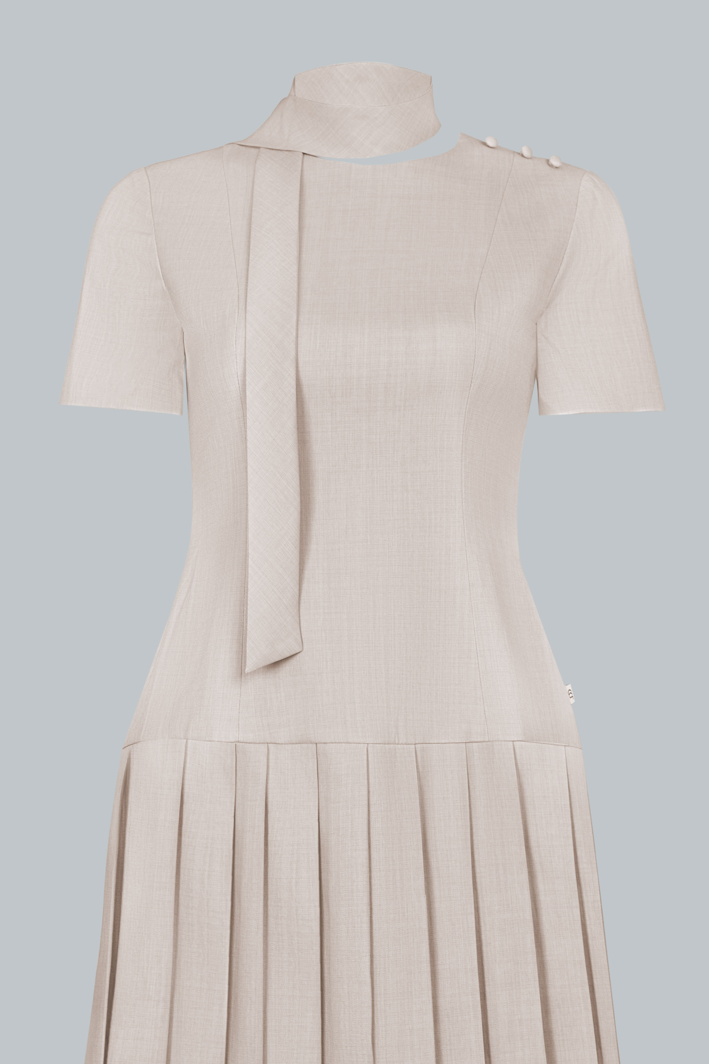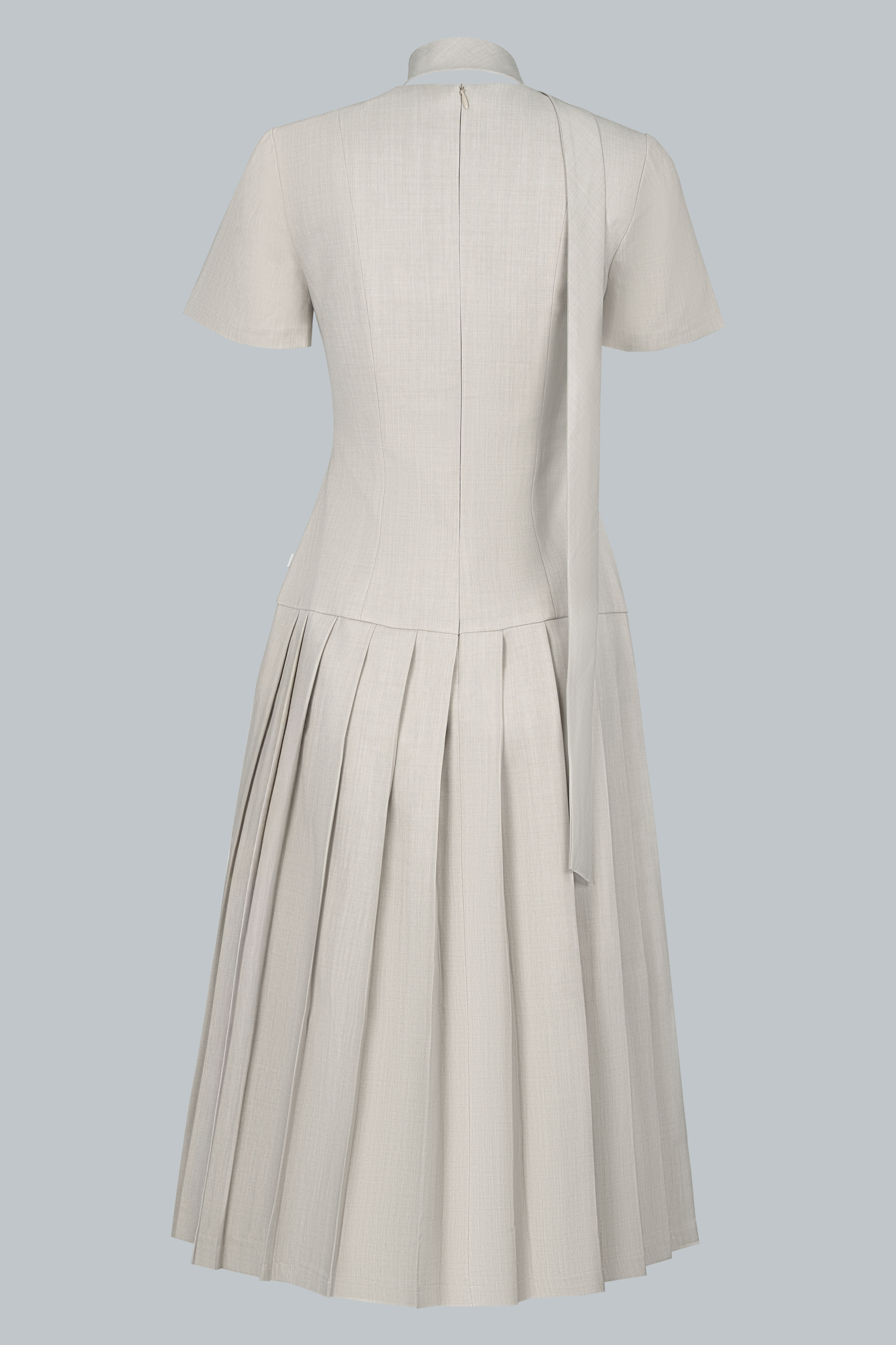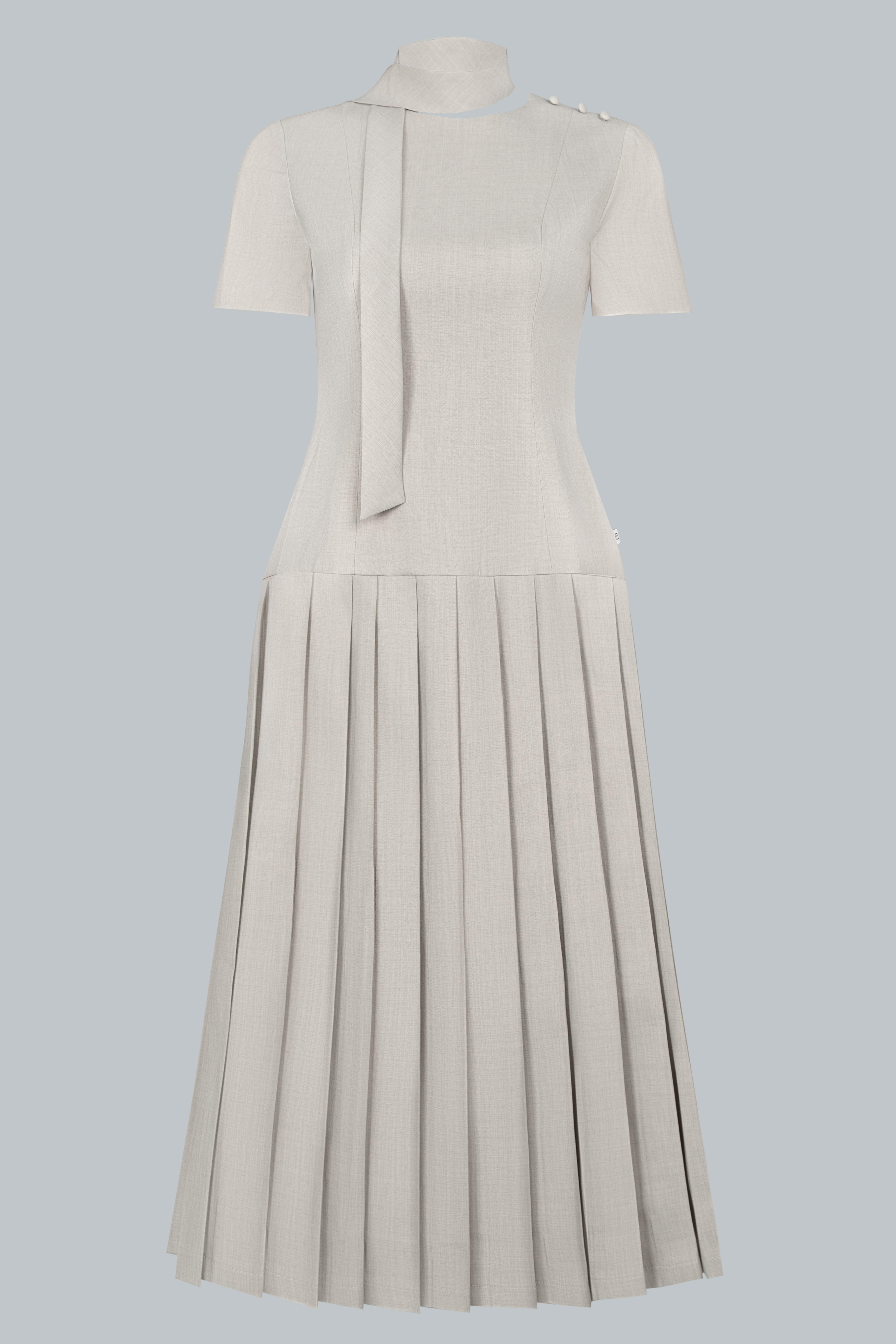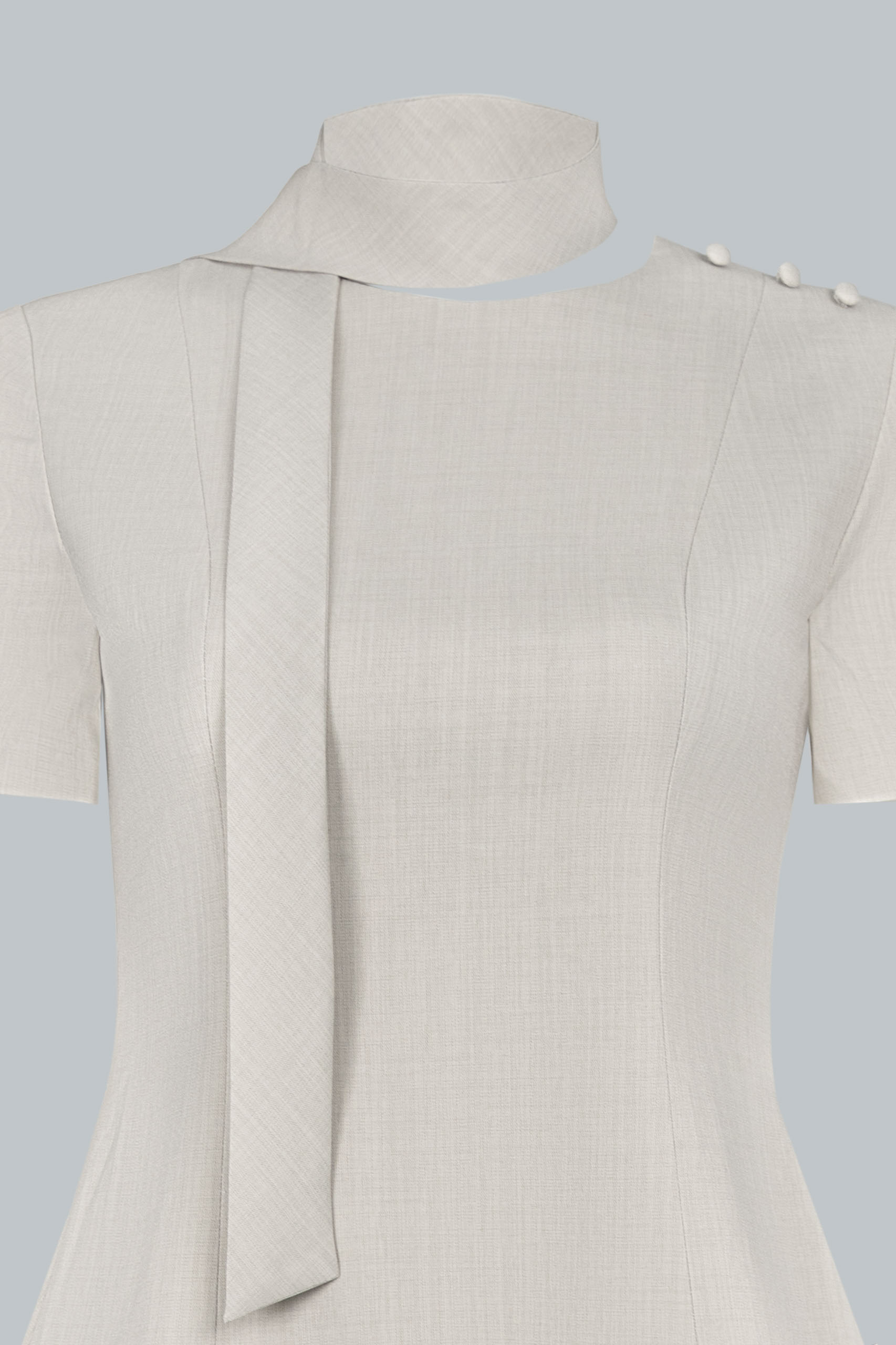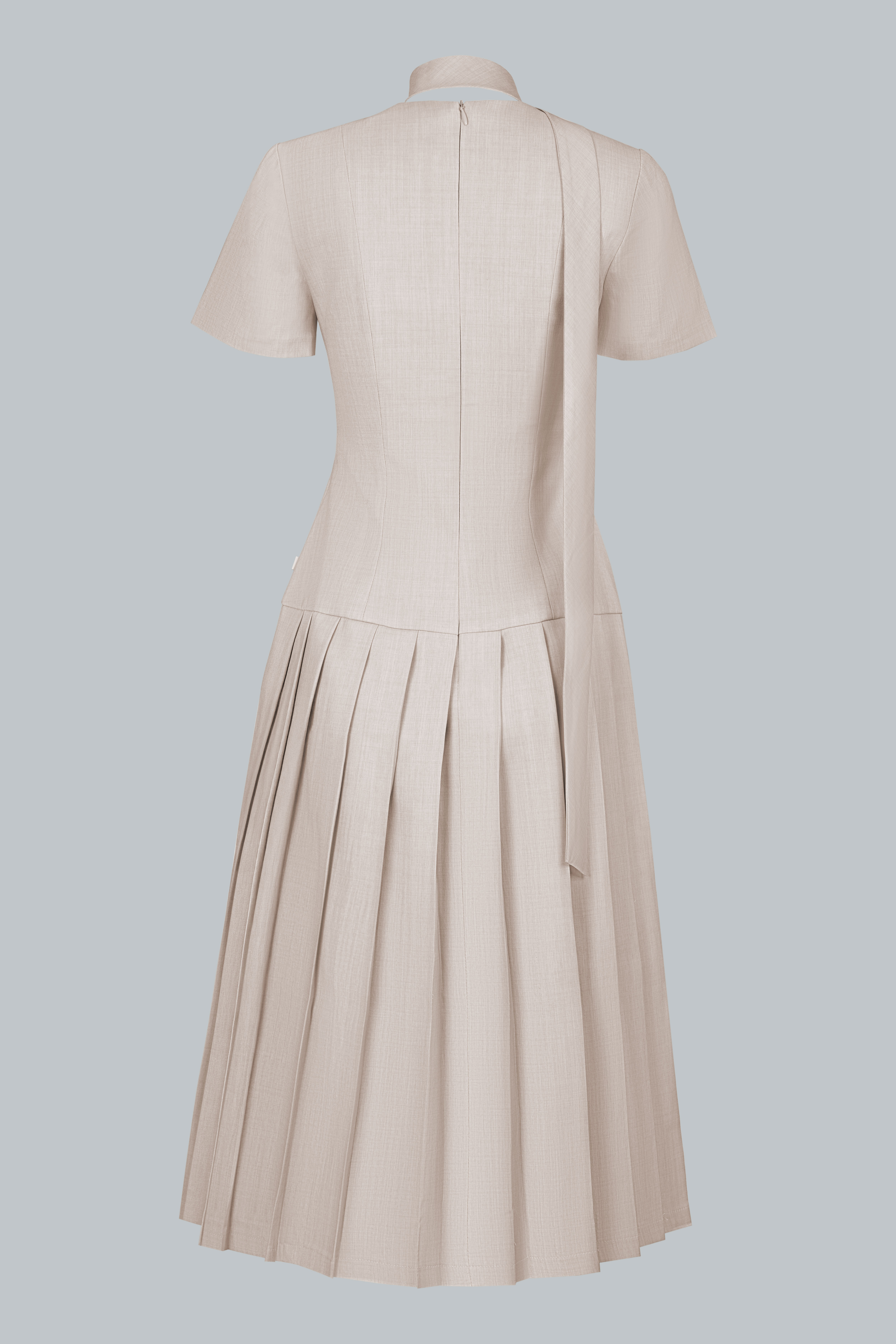 Dáng midi ngang bắp chân mang lại sự kín đáo, thanh lịch. Phần thân trên ôm nhẹ, tay ngắn cân đối, cổ tròn phối dải nơ buộc lệch một bên tạo điểm nhấn duyên dáng. Vai áo nhấn bằng nút bọc nhỏ, tỉ mỉ và tinh tế. Chân váy xếp ly bản lớn trải đều, tạo độ xòe mềm mại, uyển chuyển trong từng chuyển động.