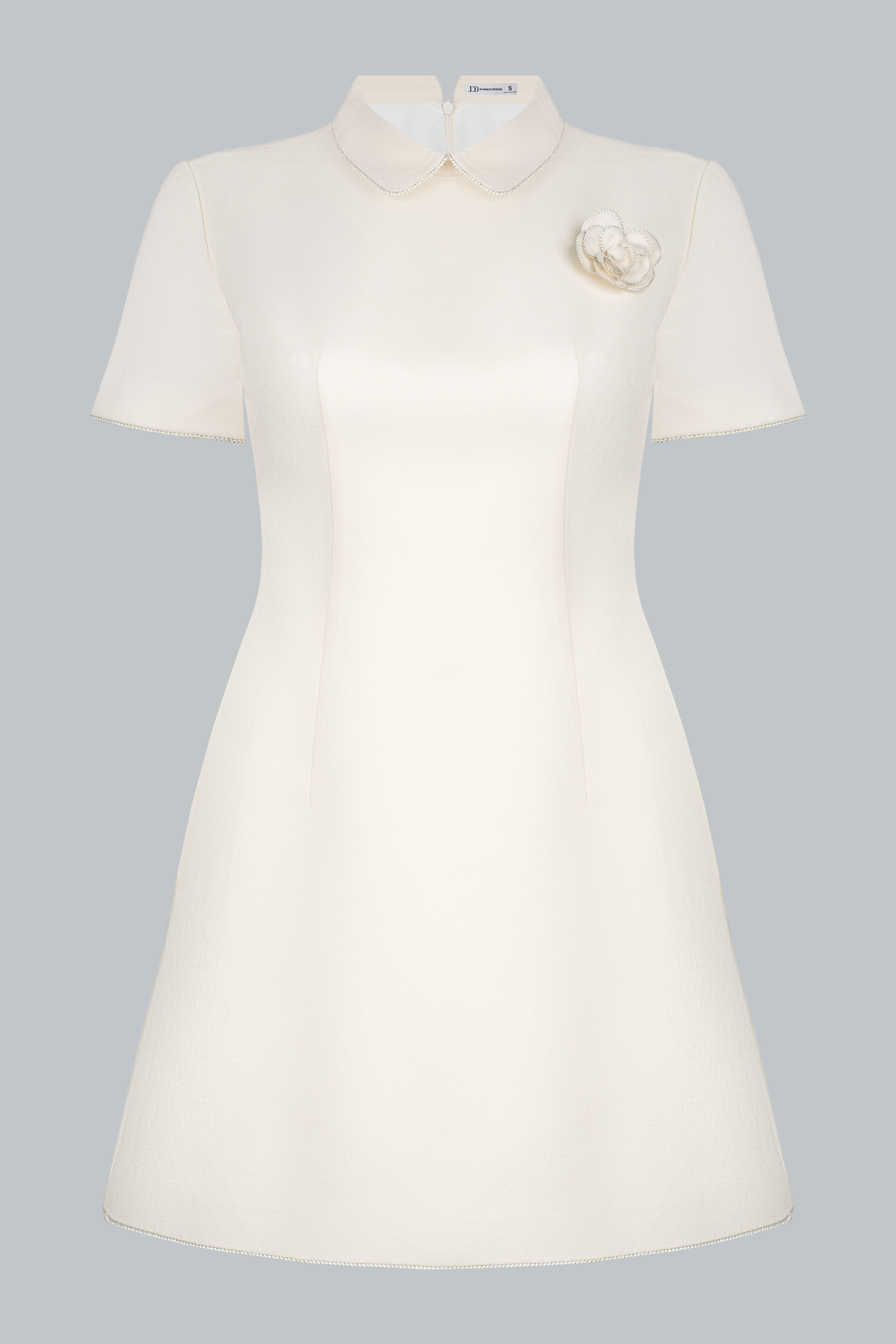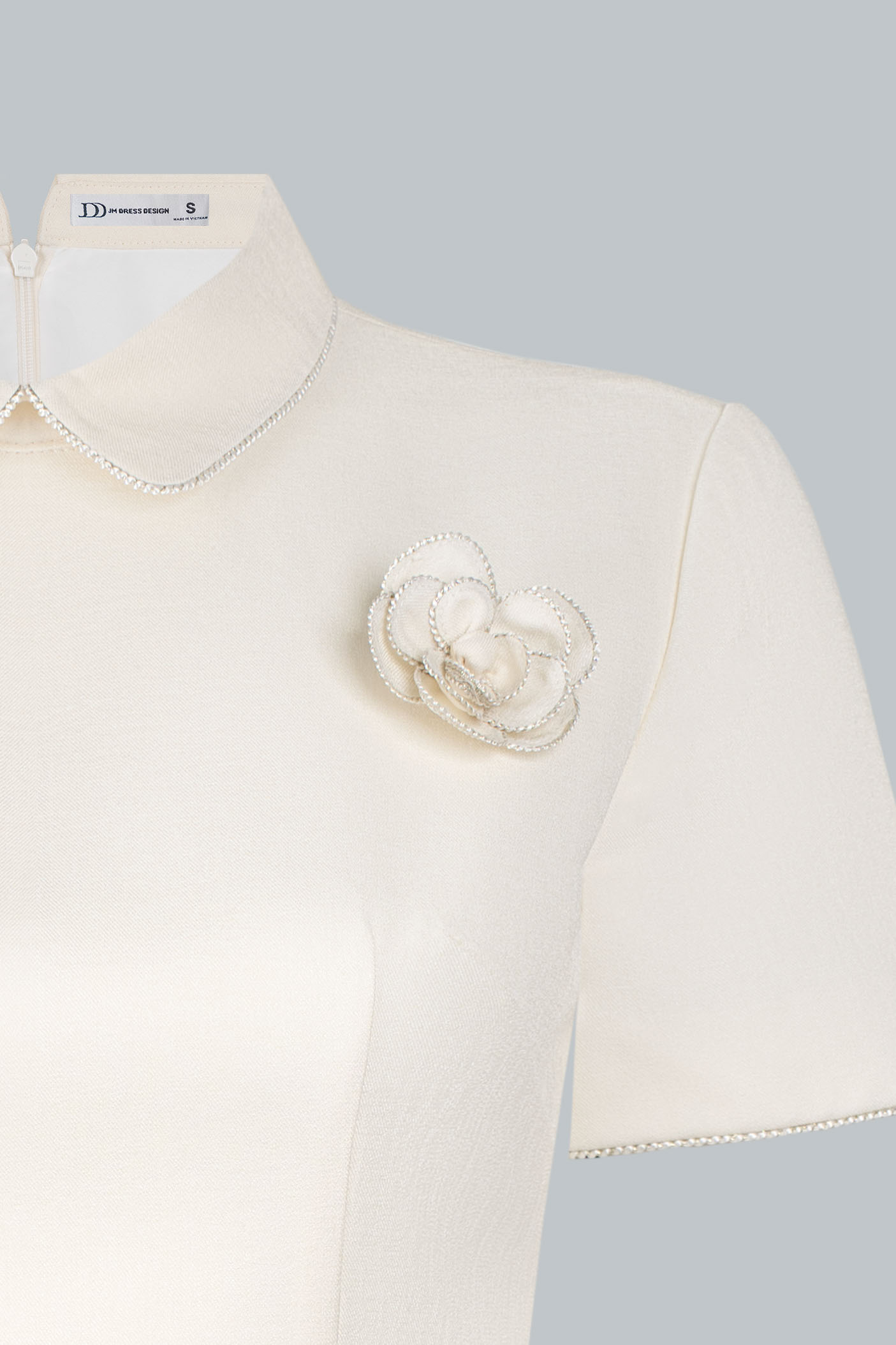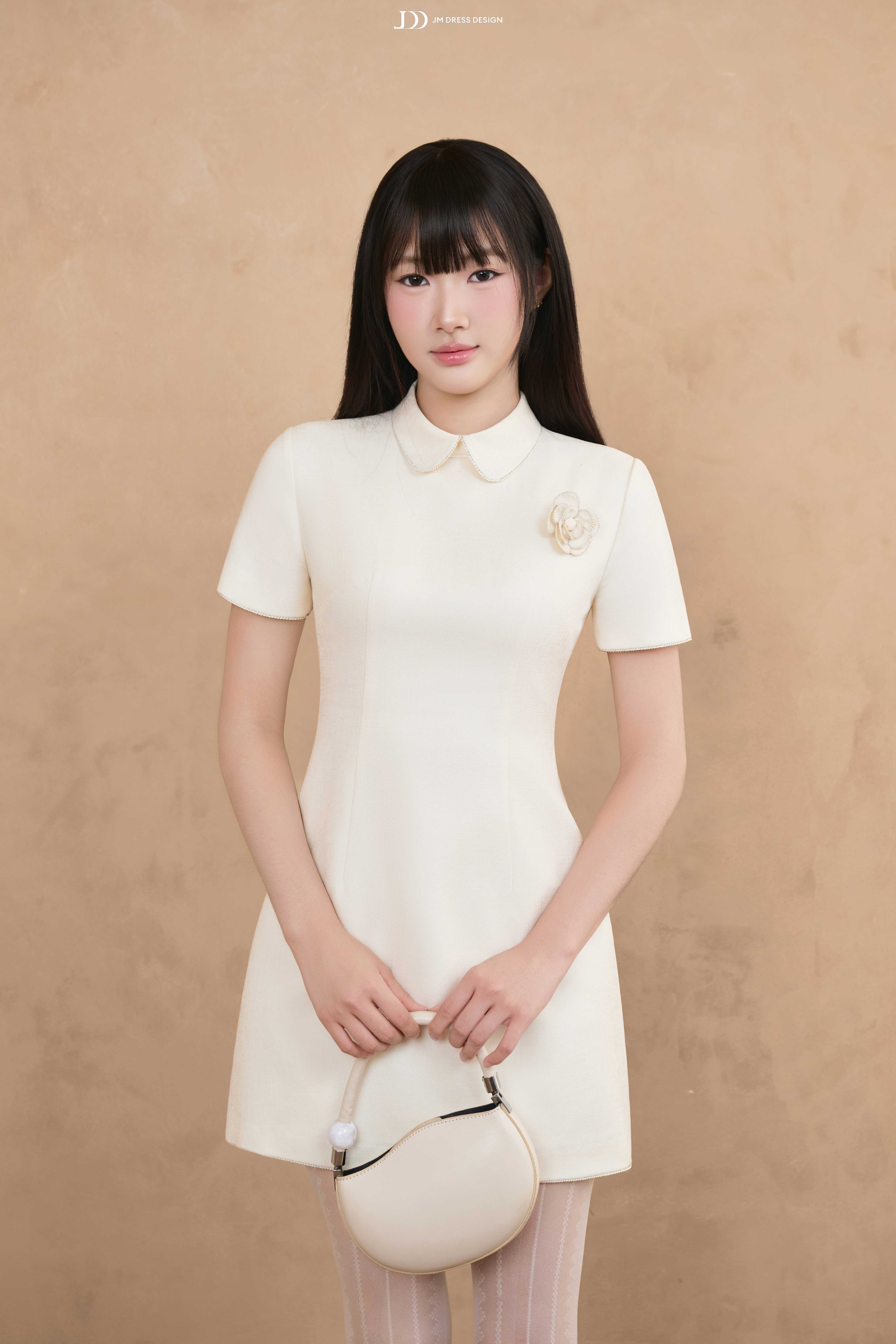 Đầm mini trên gối, form ôm vừa tôn đường cong mềm mại nhưng vẫn giữ sự kín đáo. Cổ sen bo nhẹ viền ren tinh tế, kết hợp tay ngắn tạo vẻ thanh thoát. Ngực áo điểm nhấn hoa cài 3D cùng tông, mang lại sự duyên dáng ngọt ngào. Gam trắng kem ngọc trai làm sáng gương mặt, gợi cảm giác sang trọng và trong trẻo.